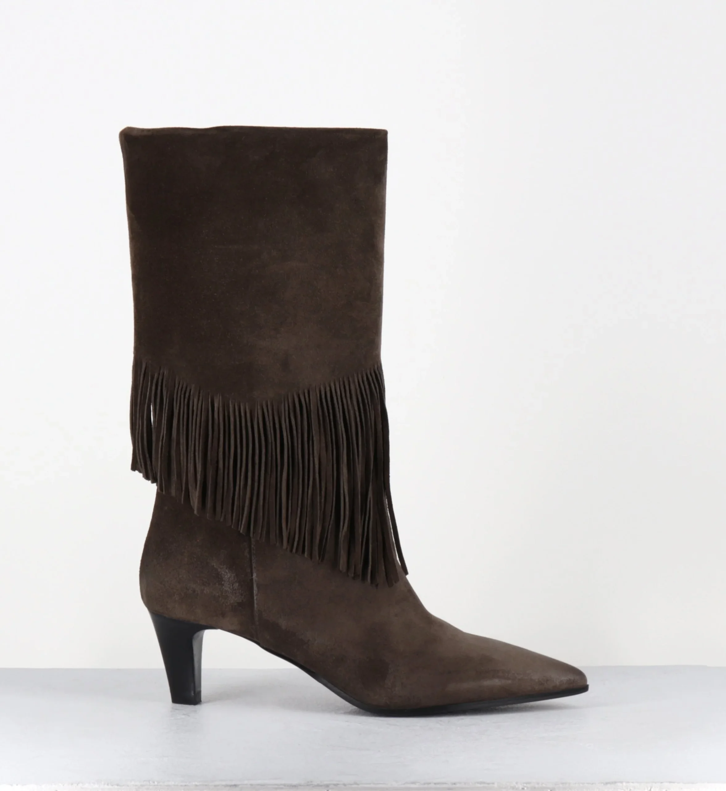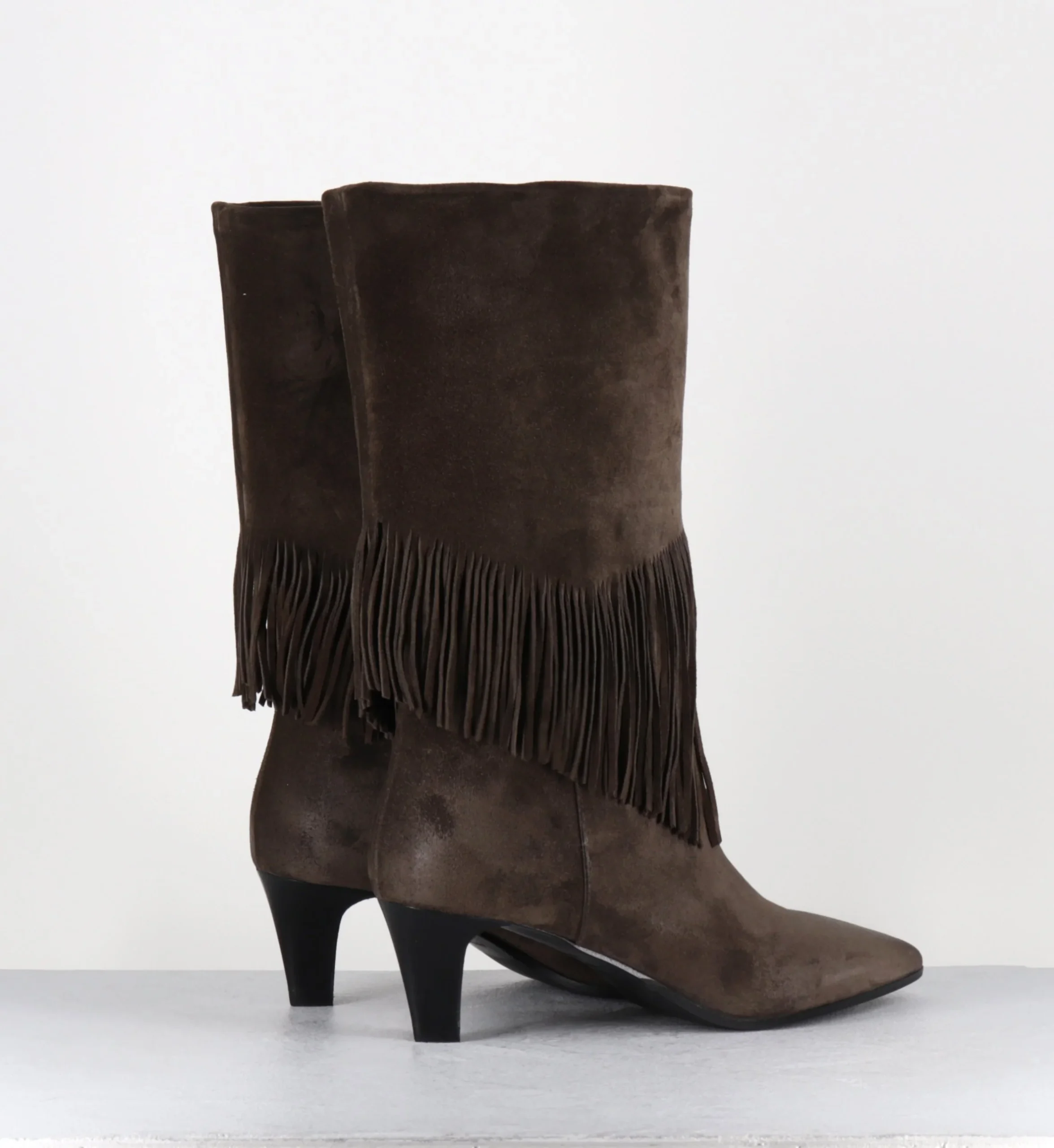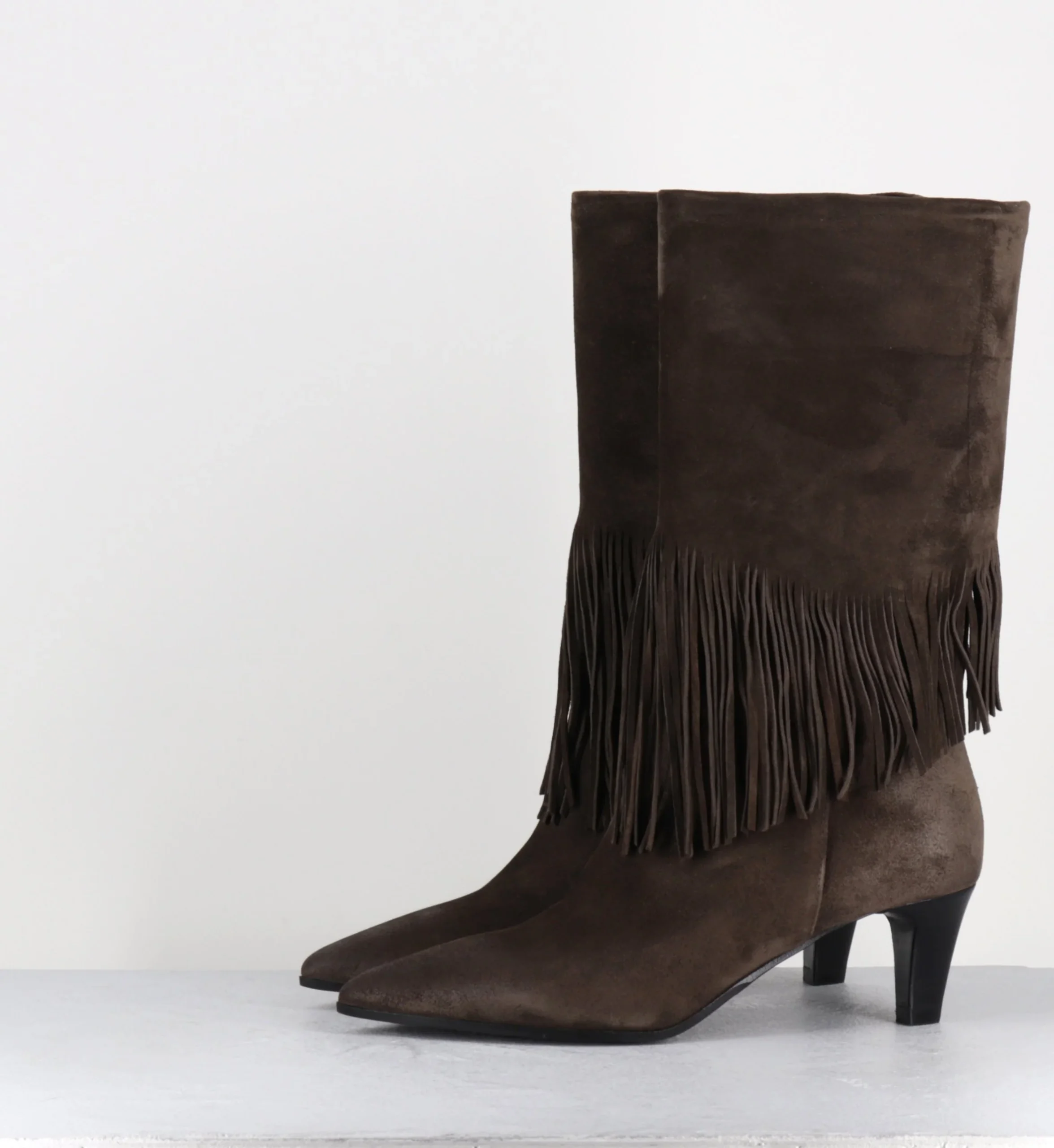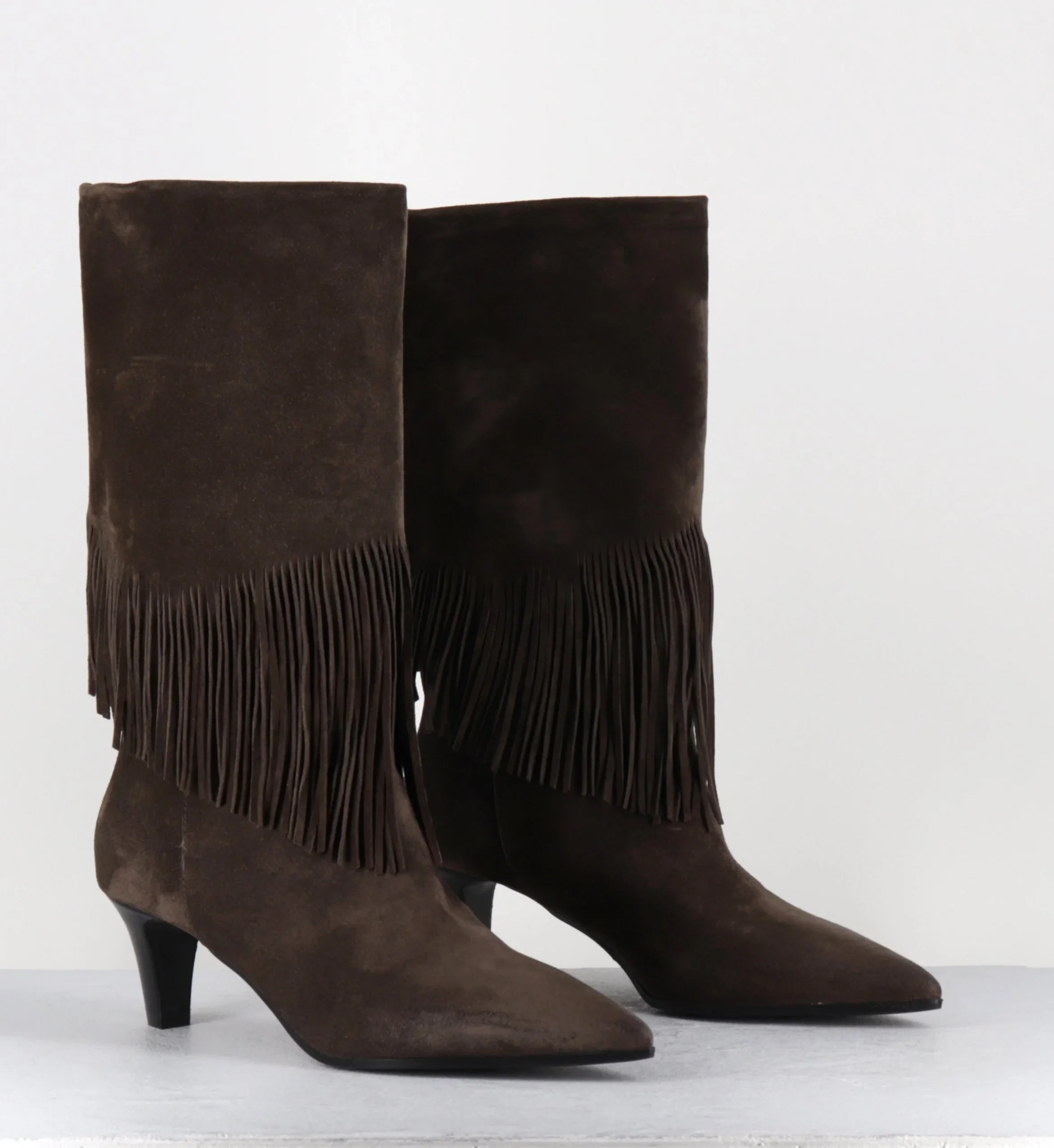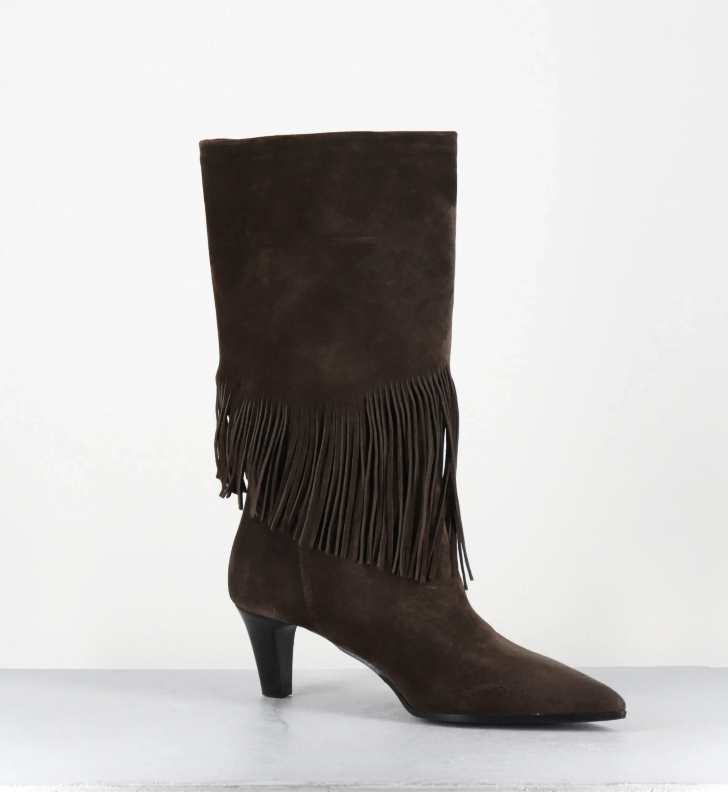 Boots en daim marron à franges, bout pointu soft, montées sur un petit talon confortable