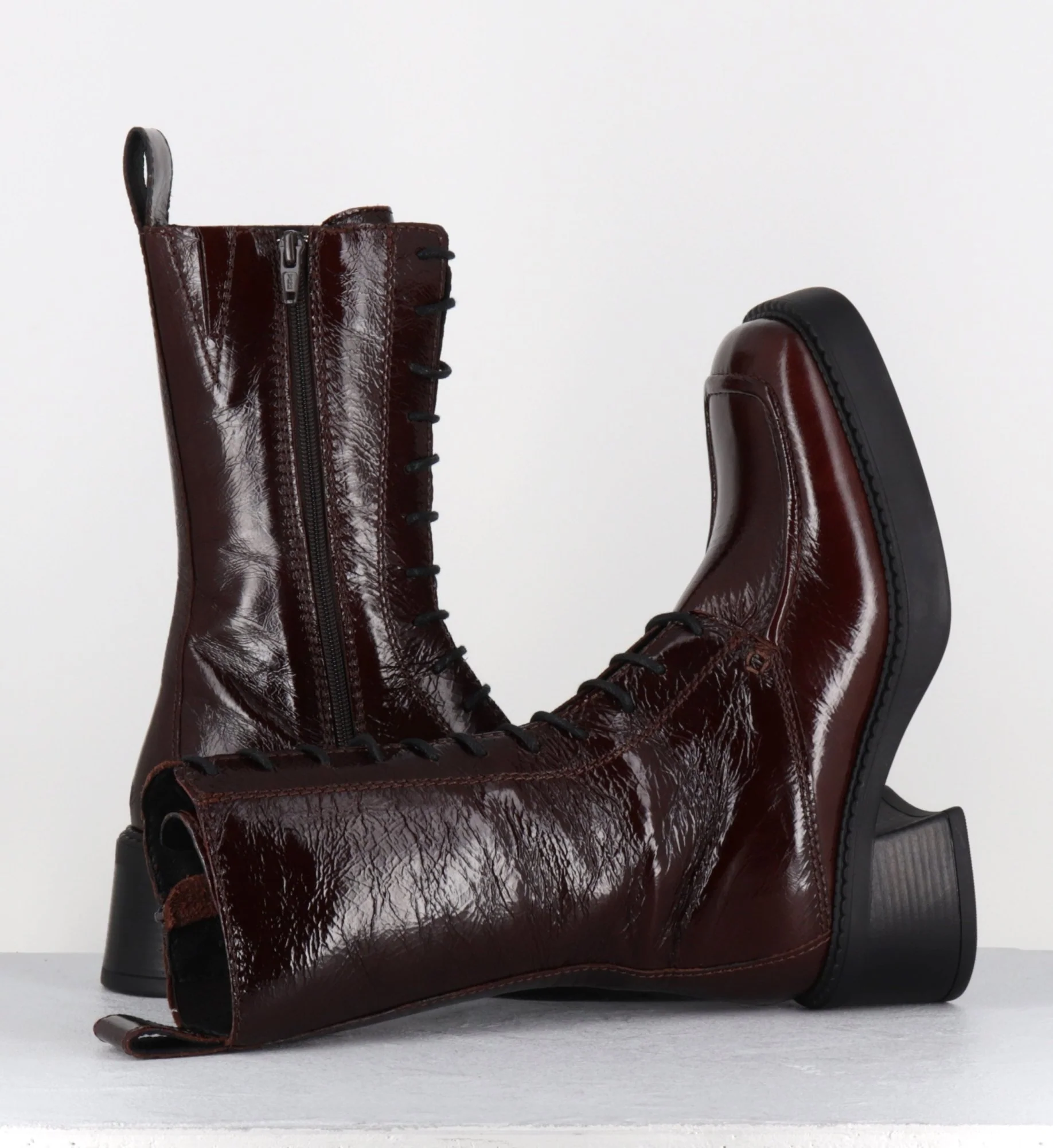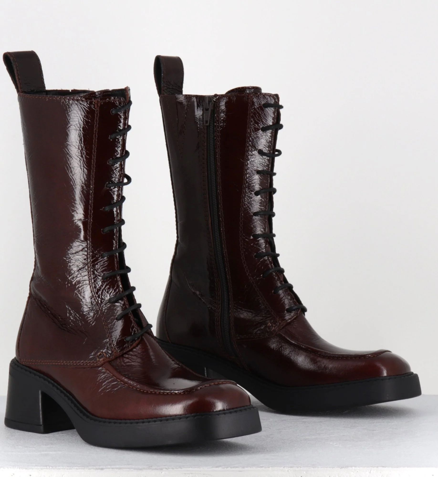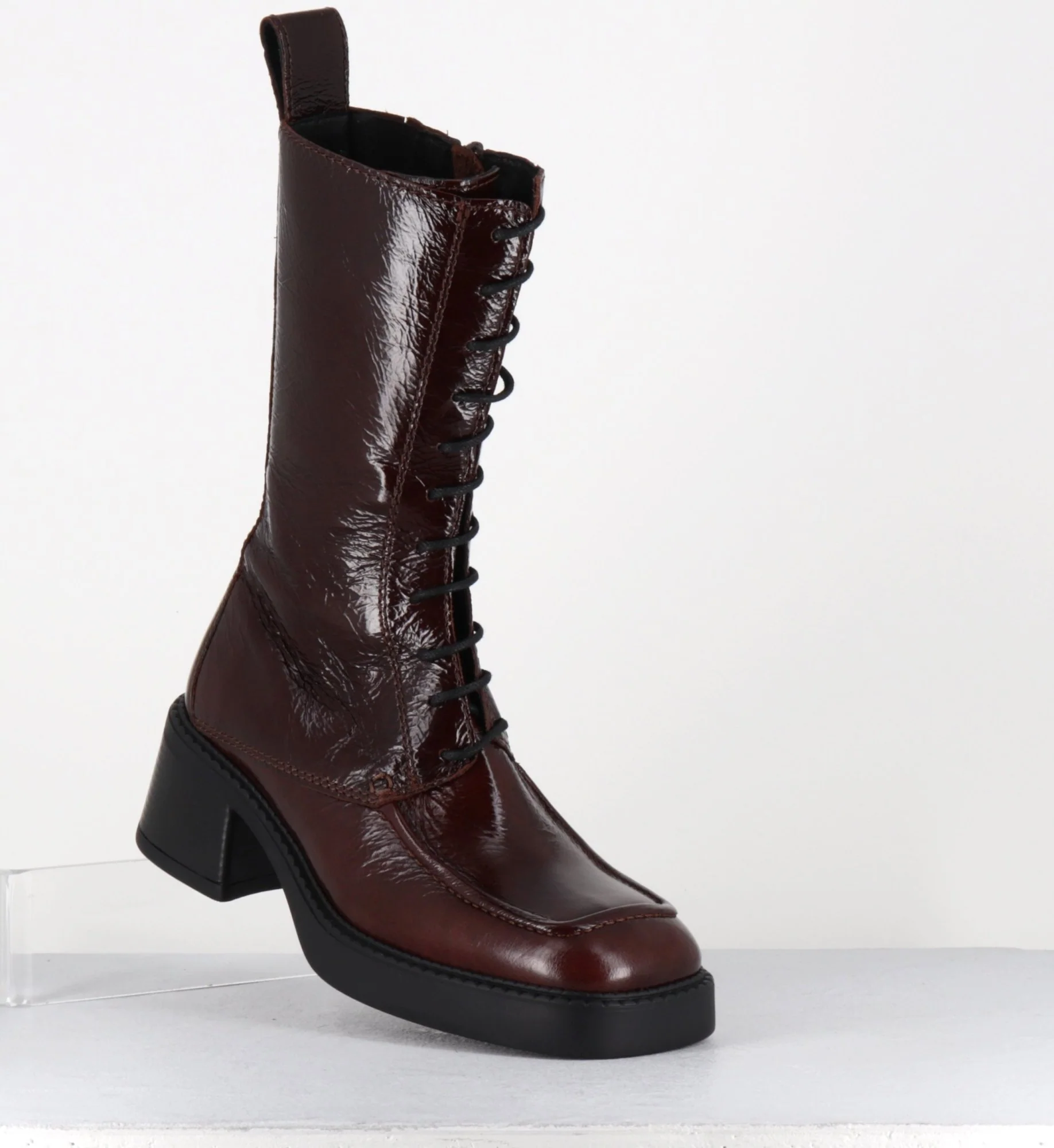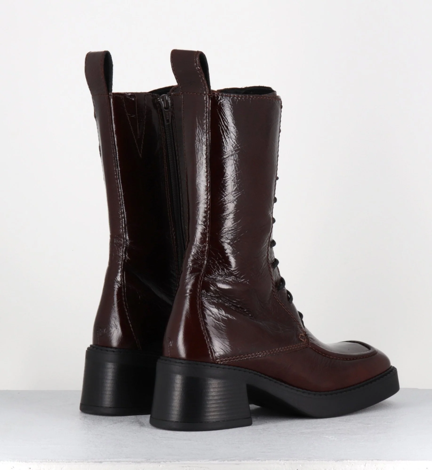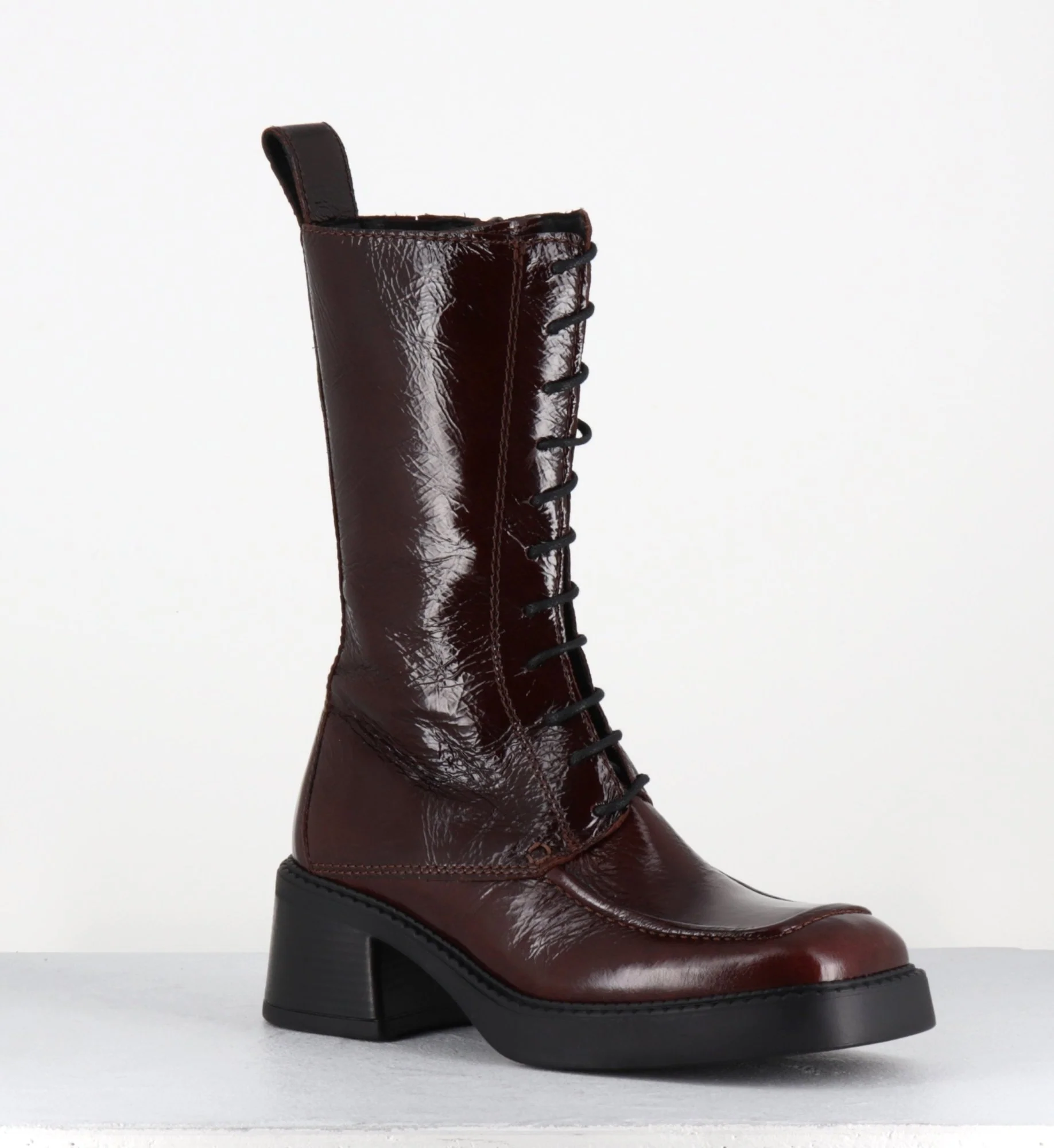 Boots à lacets bout carré en cuir naplak marron – AGUSTINA DARK BROWN BOOTS