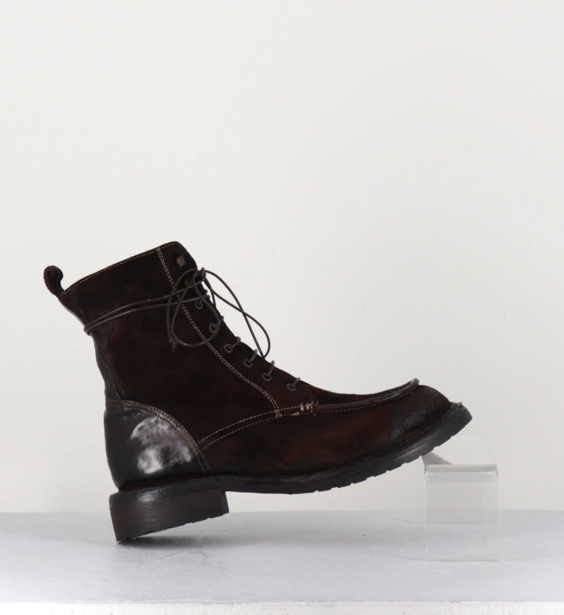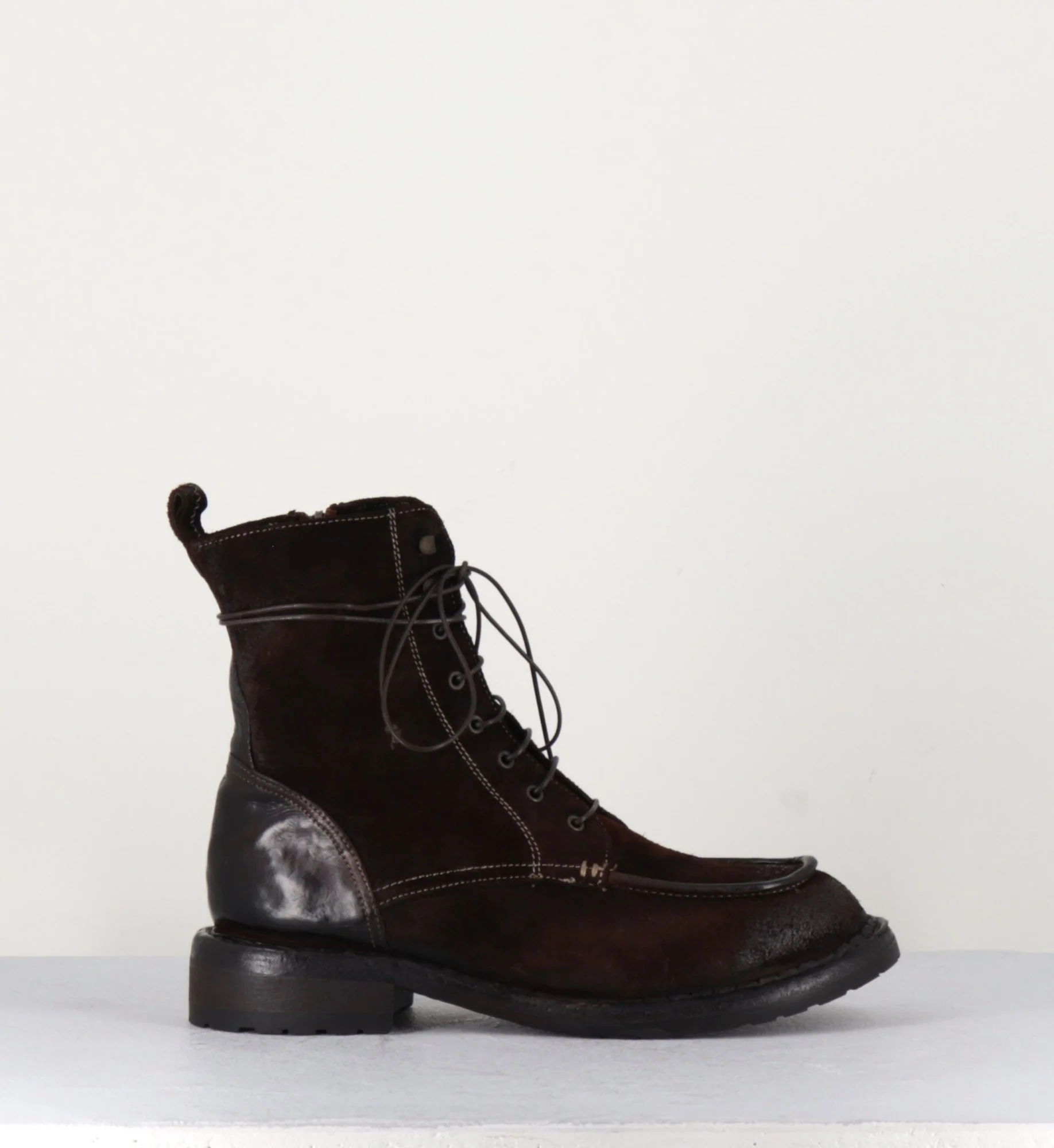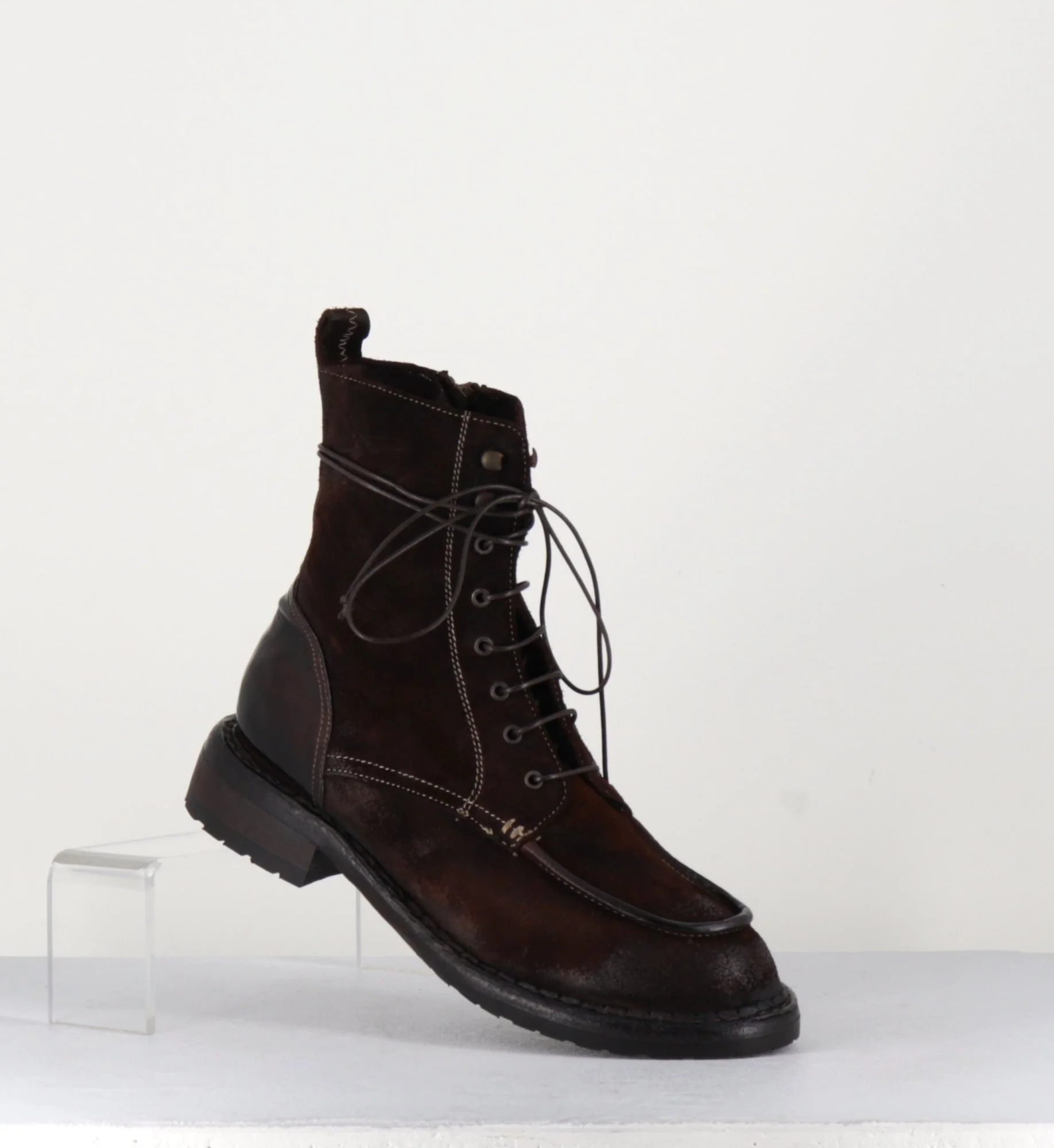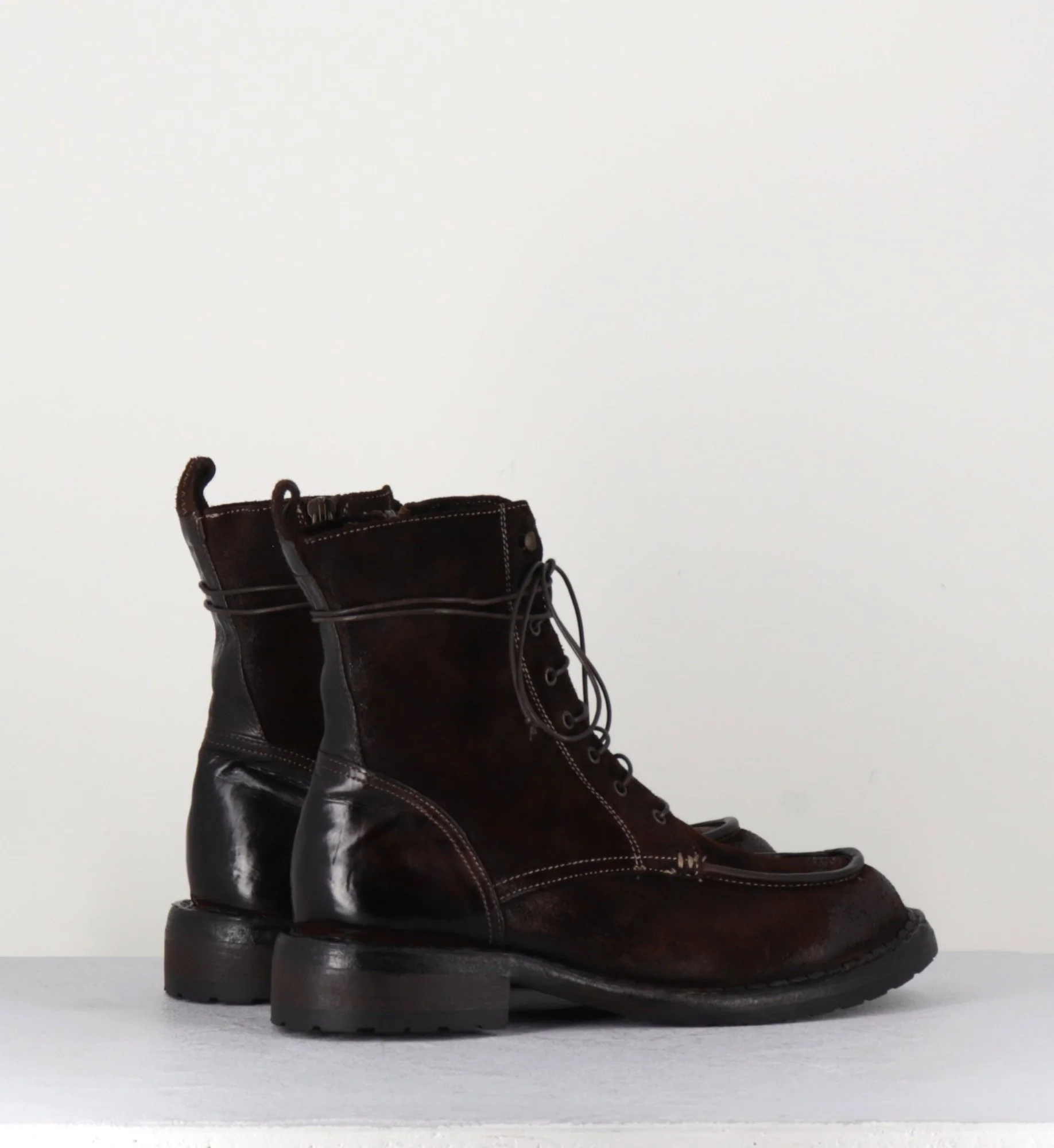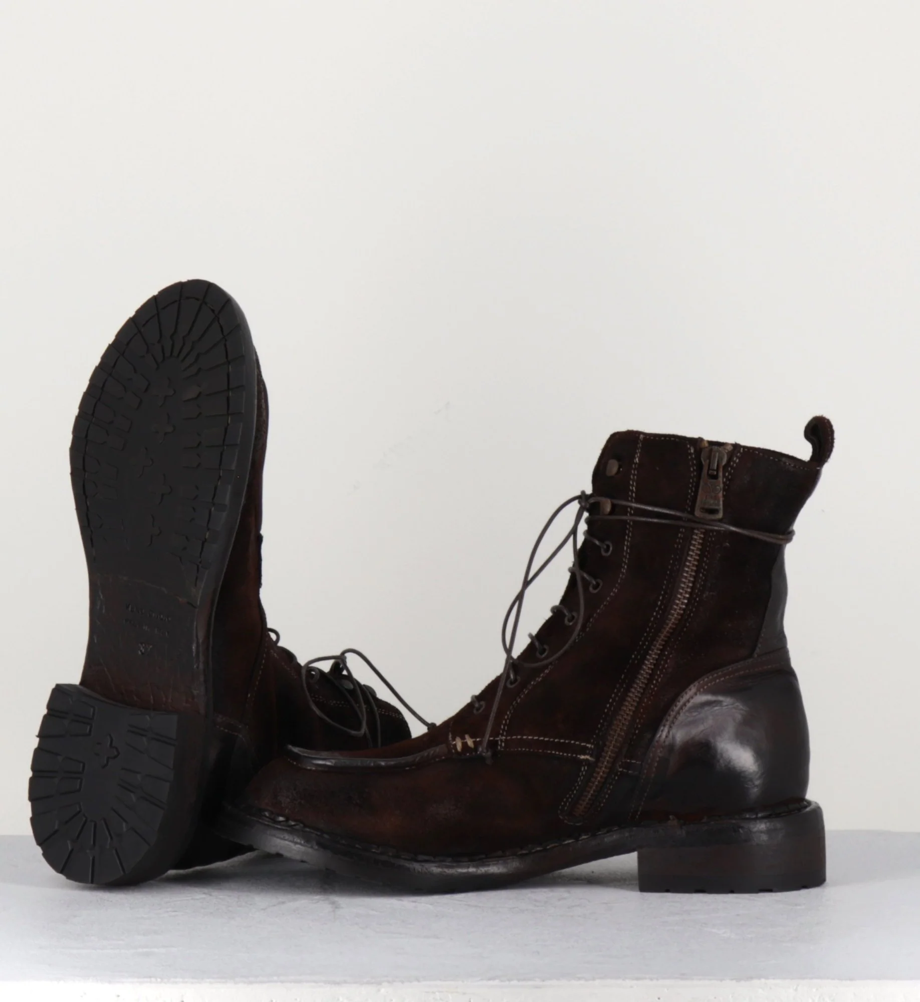 Boots à lacets & surpiqures brogue esprit 90s en daim patiné avec traitement artisanal « tinto in capo » pour un effet vieilli couleur brun-carmin, zip intérieur, montées sur une semelle souple cousue main.