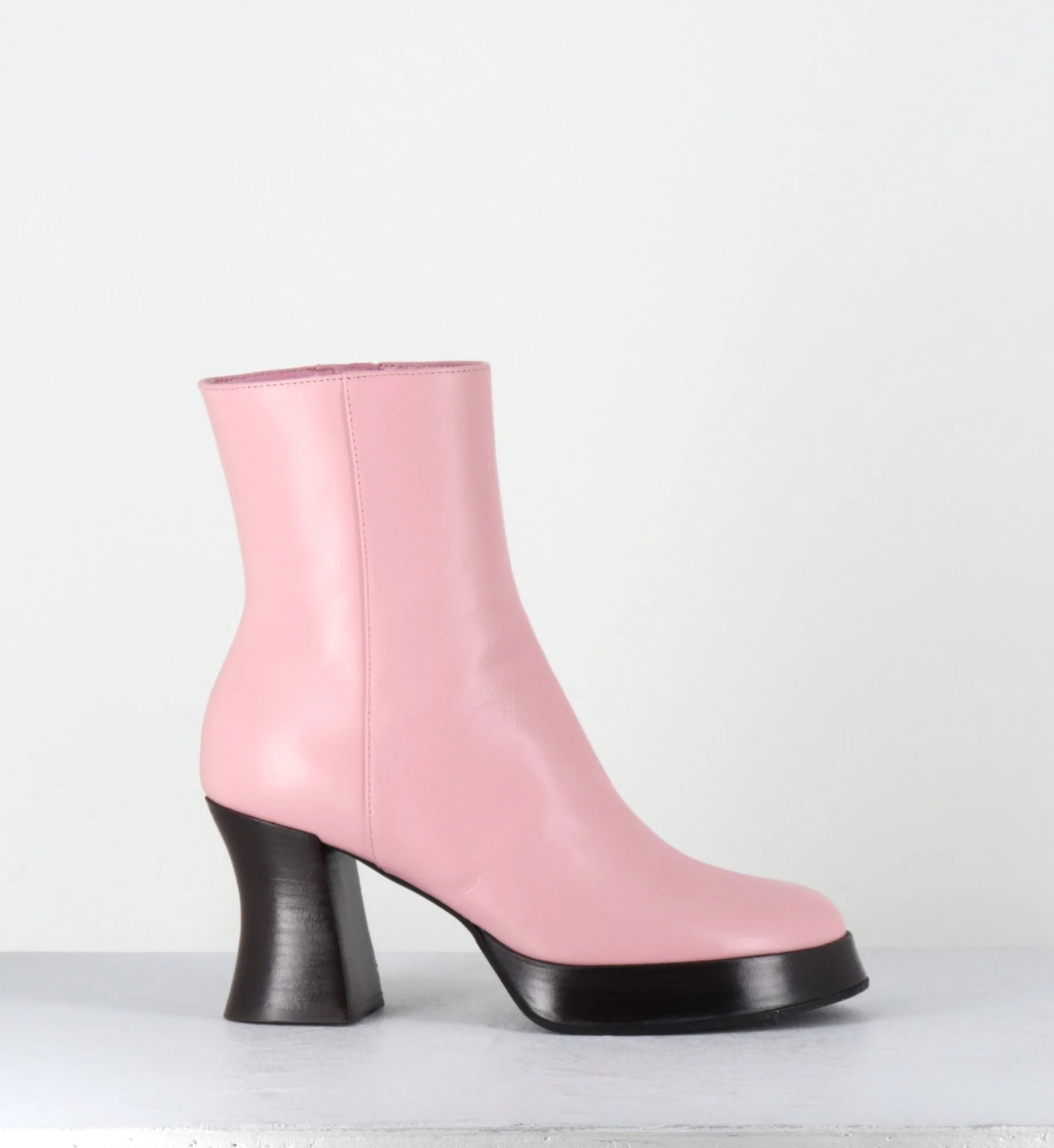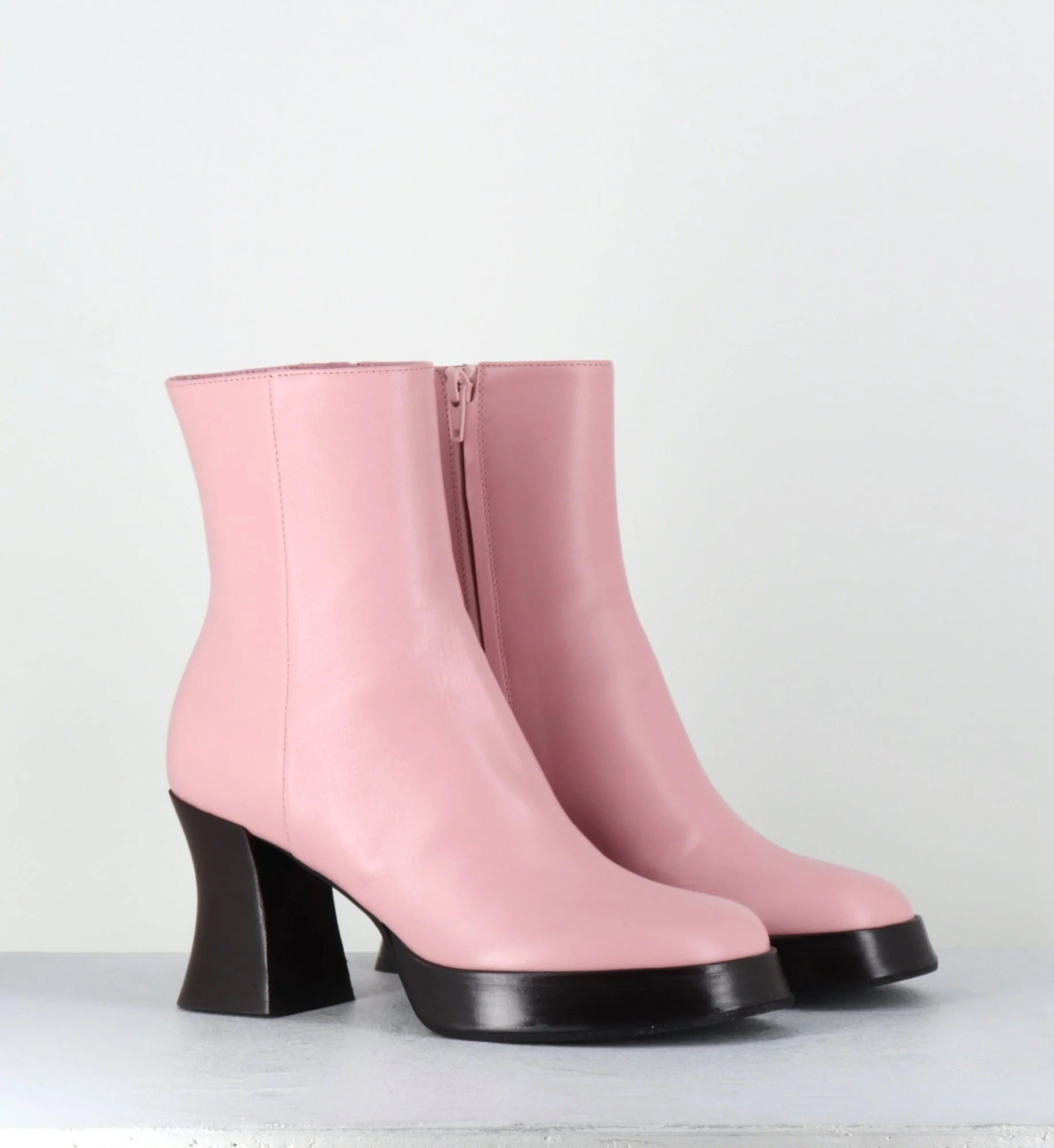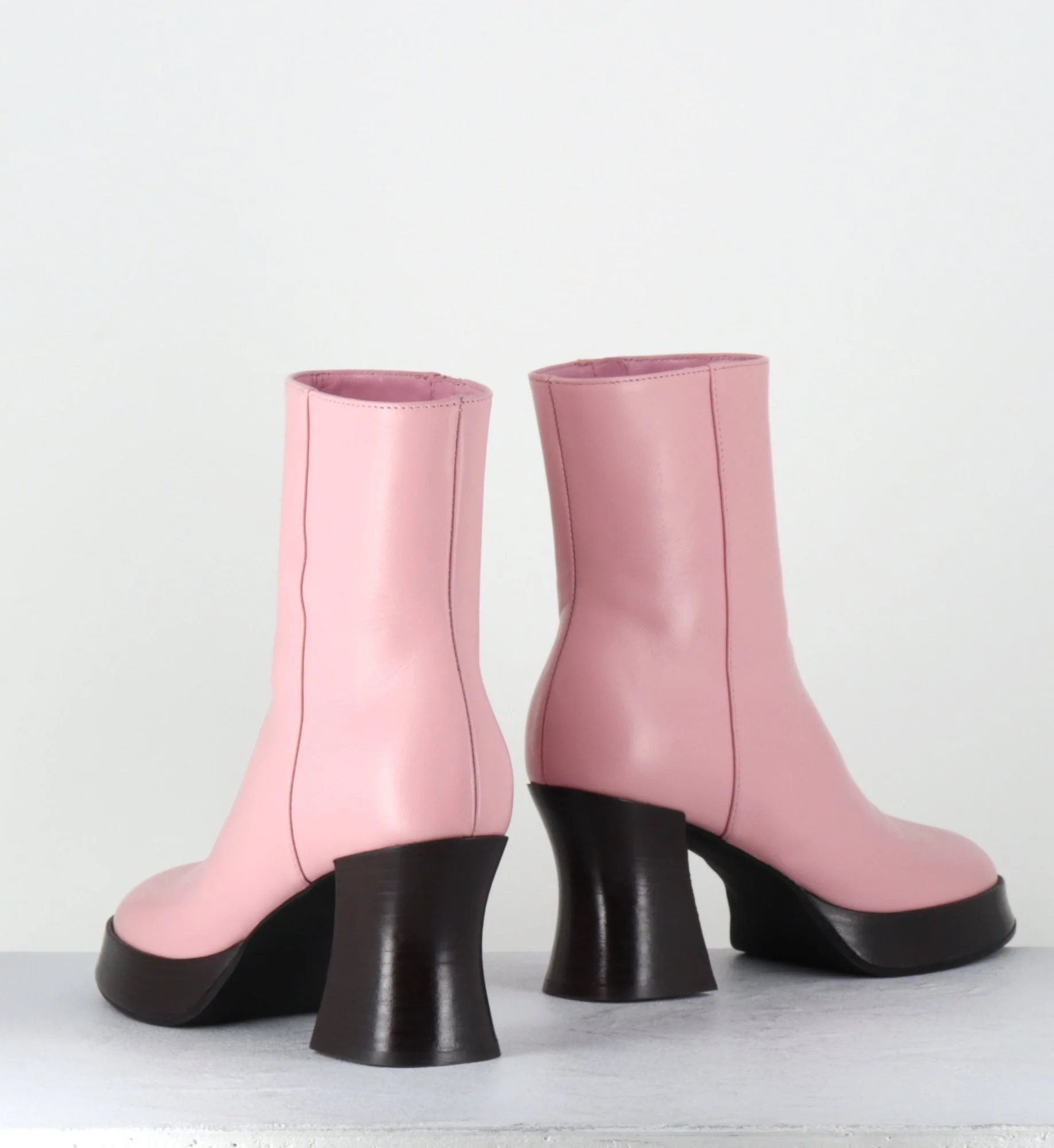 Boots en cuir rose poudré à fine plateforme, zip intérieur, bout arrondi, montées sur un talon esprit bobine rétro en cuir marron foncé Fabrication Artisanale Italienne – Ateliers GarriceLab Chausse normalement