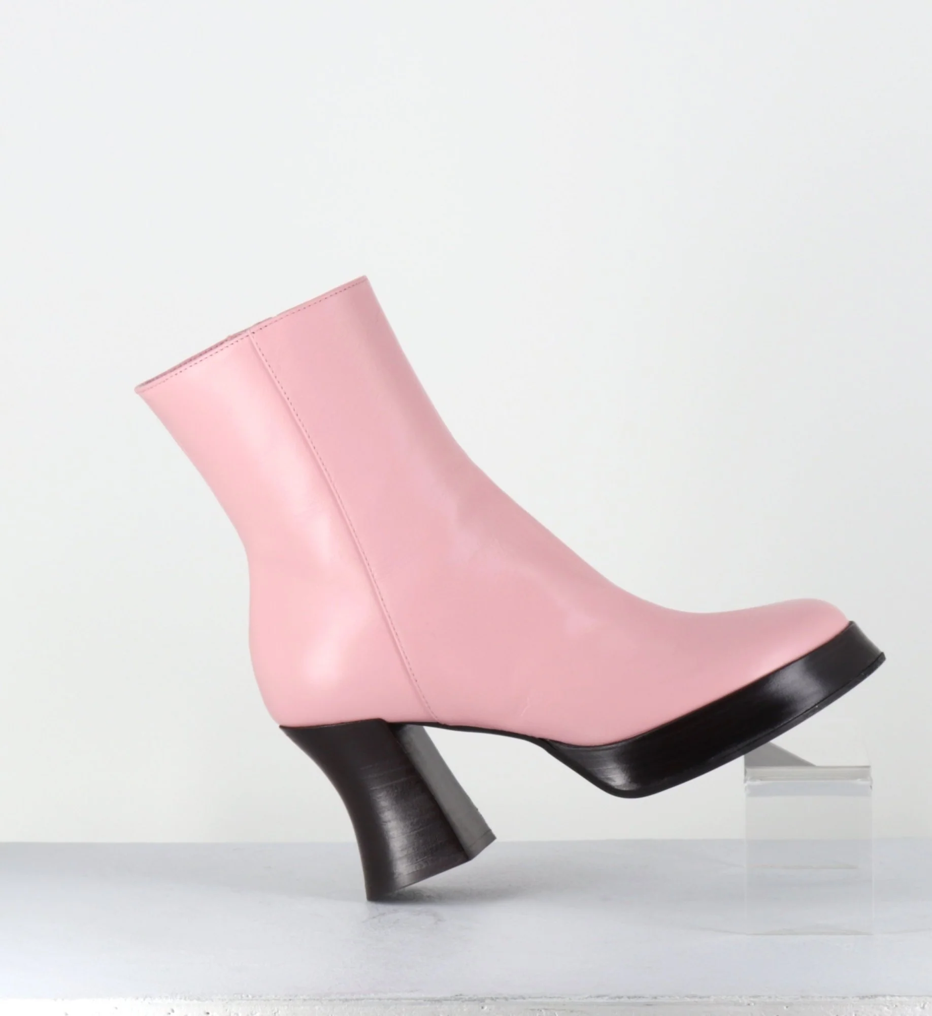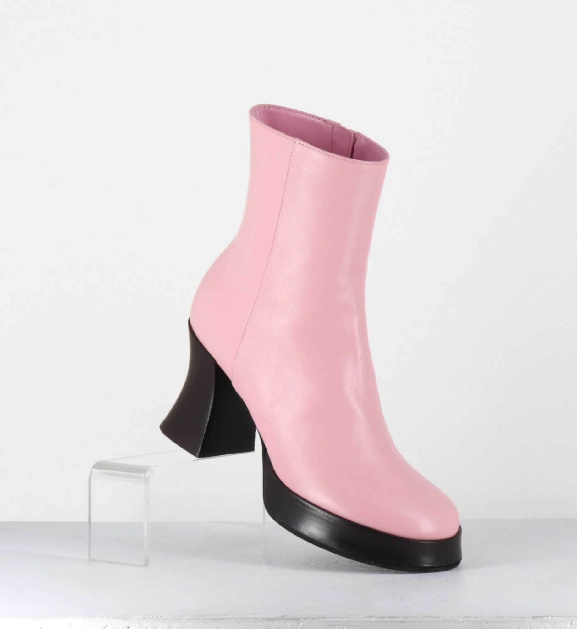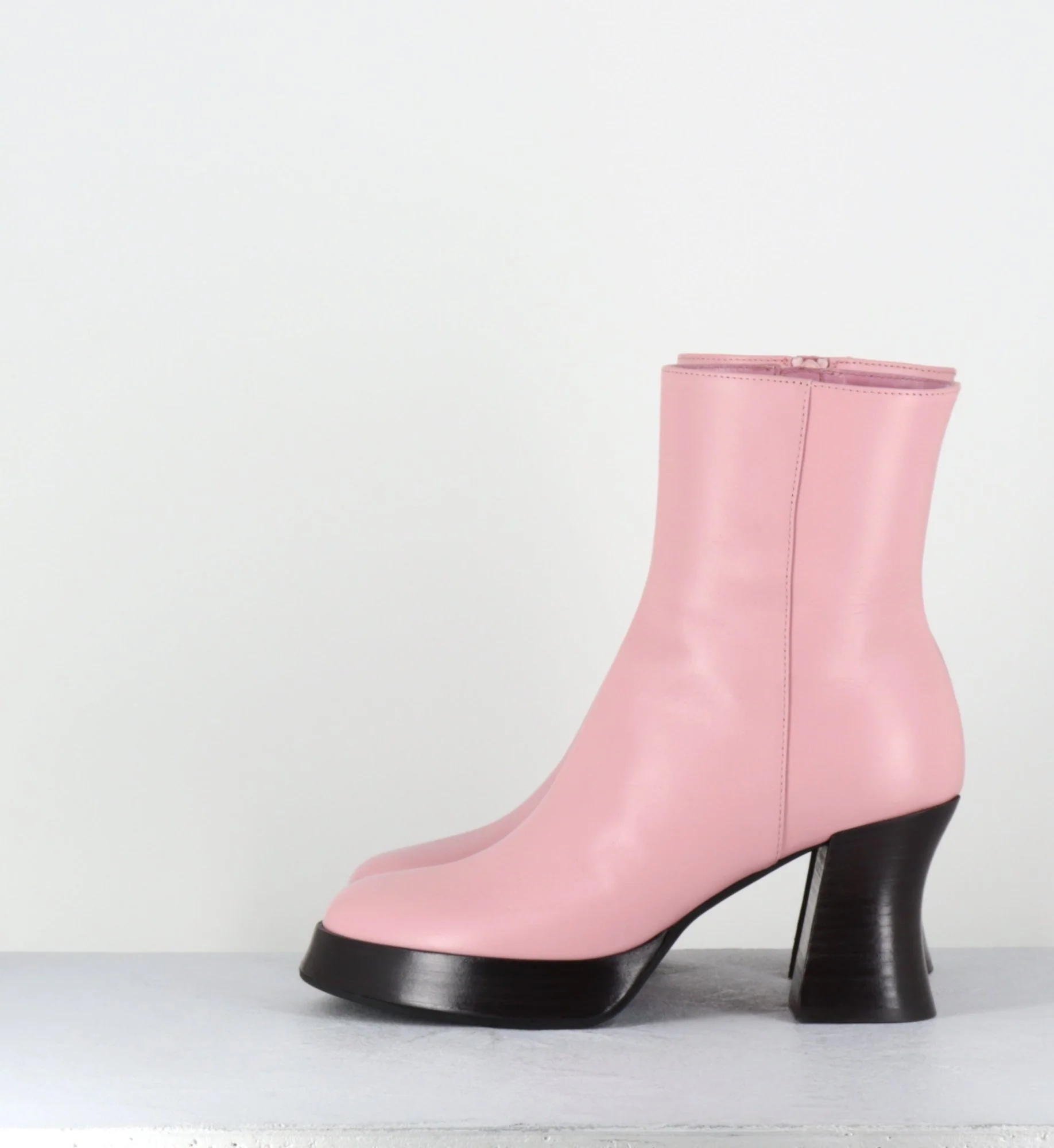Boots en cuir rose poudré à fine plateforme, zip intérieur, bout arrondi, montées sur un talon esprit bobine rétro en cuir marron foncé Fabrication Artisanale Italienne – Ateliers GarriceLab Chausse normalement
