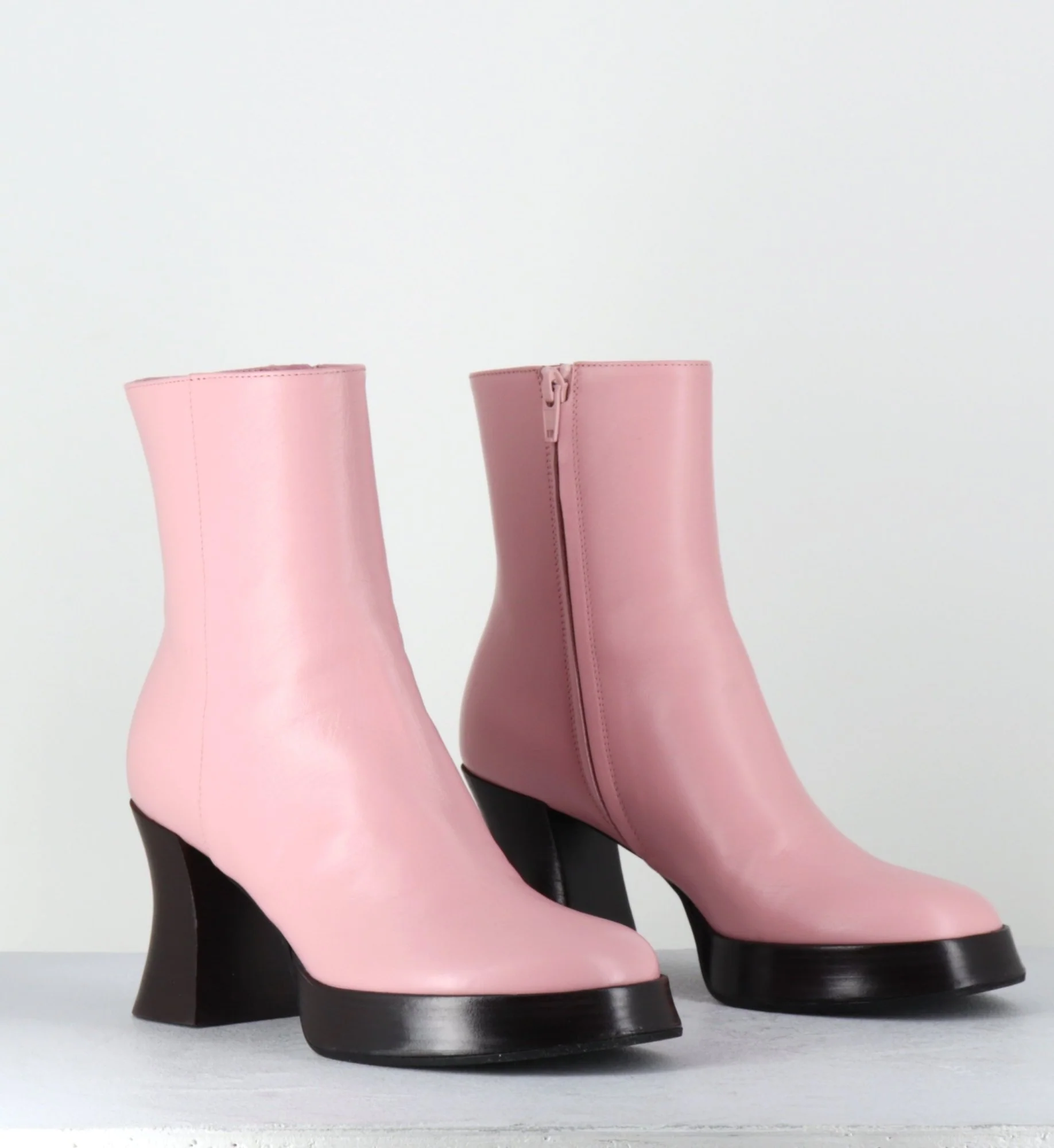 Boots en cuir rose poudré à fine plateforme, zip intérieur, bout arrondi, montées sur un talon esprit bobine rétro en cuir marron foncé