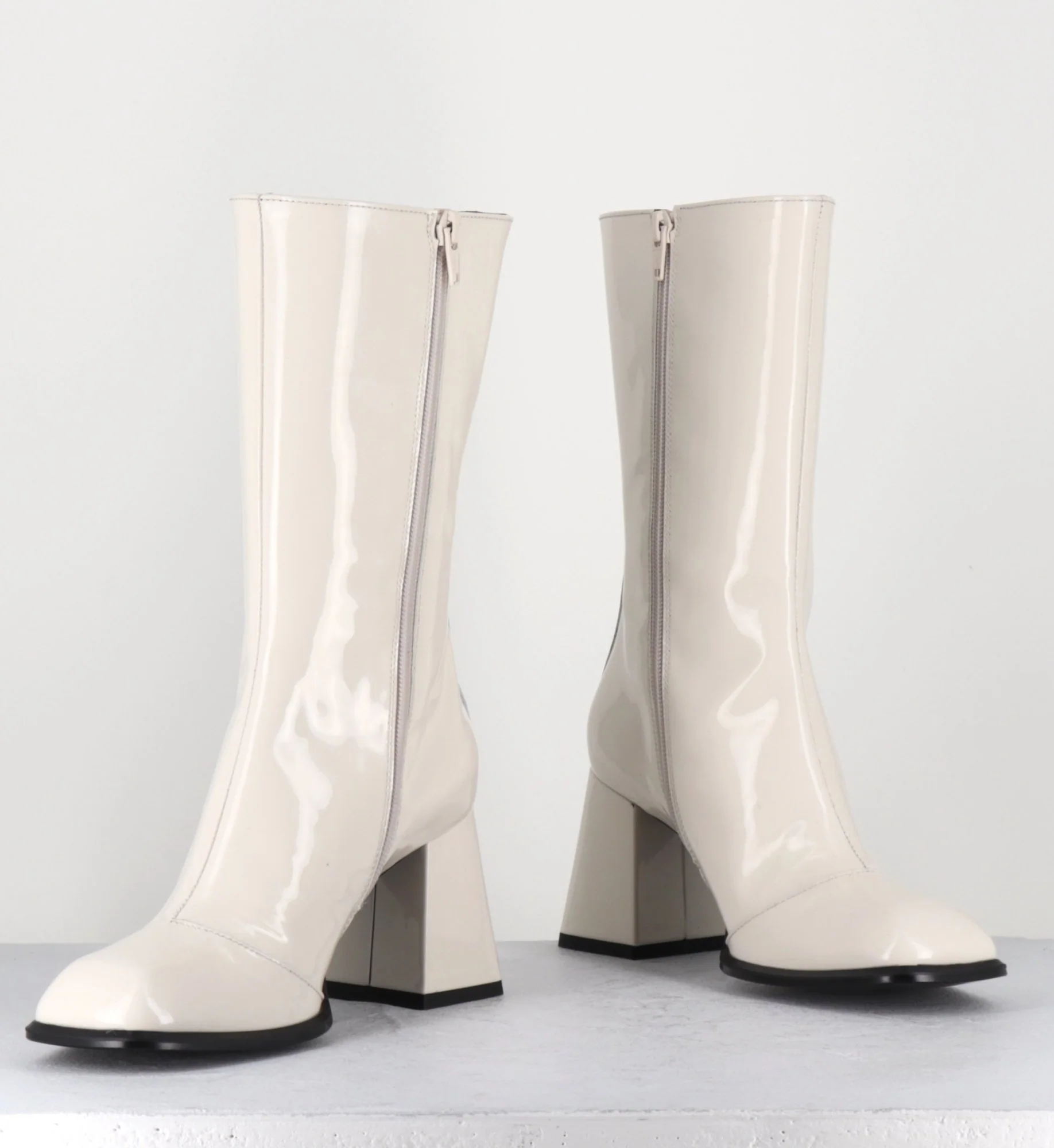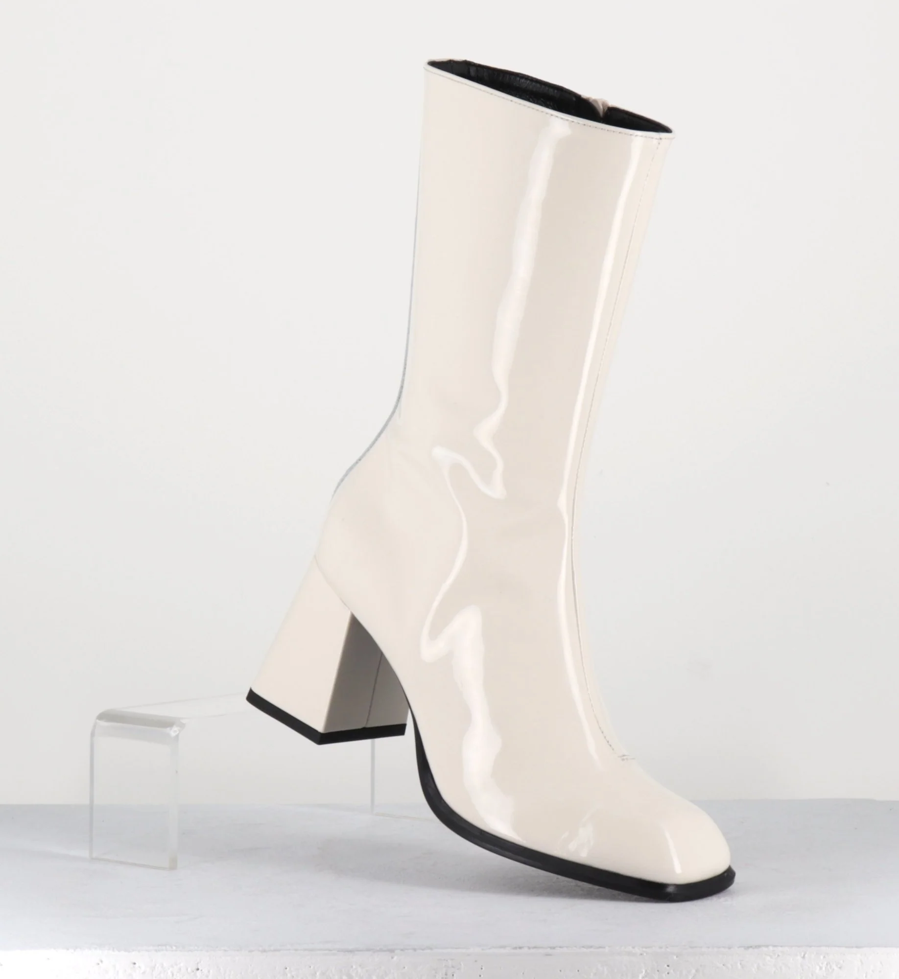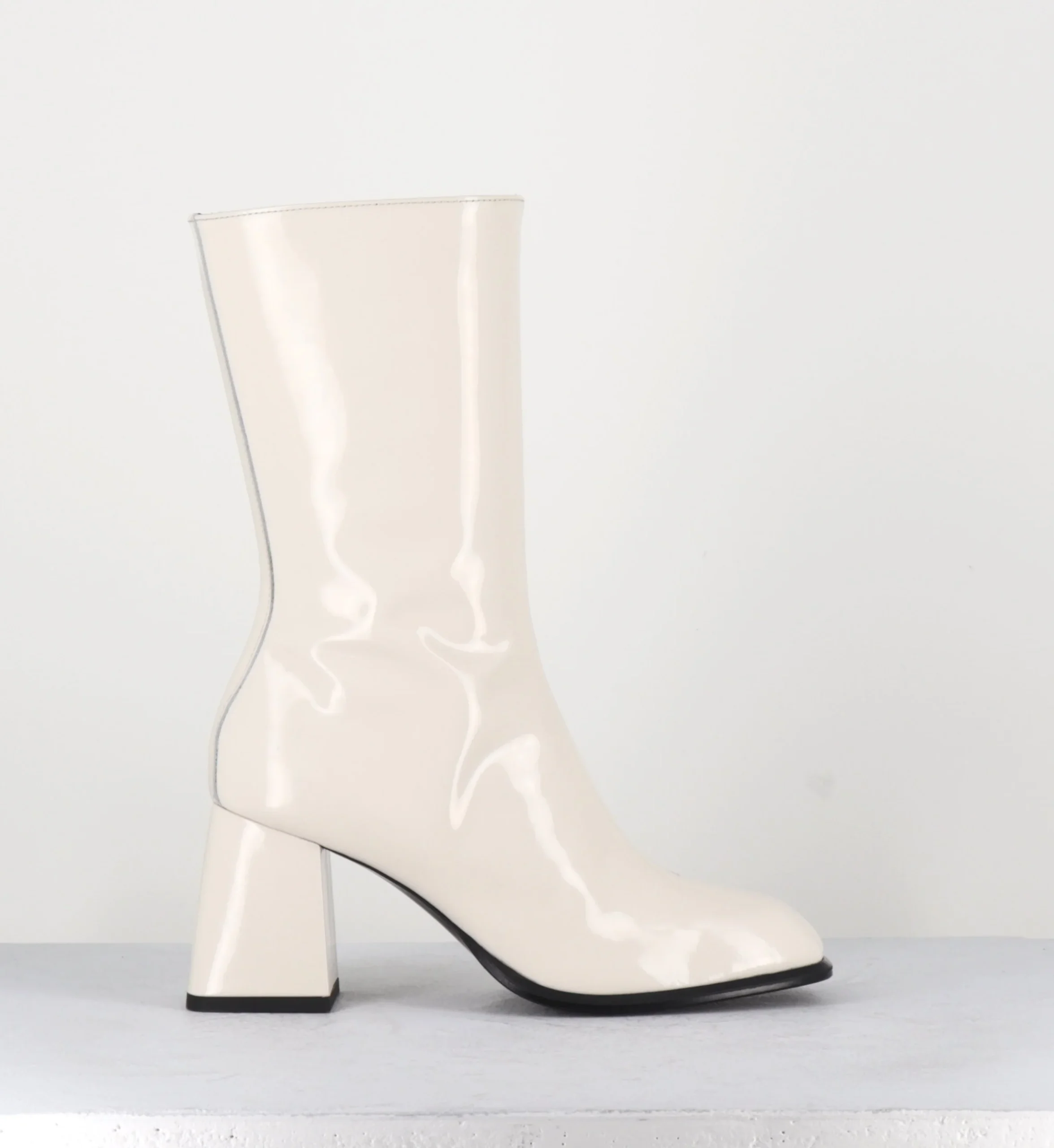 Boots tige haut en cuir vernis creme, bout carré arrondi, zip intérieur, montées sur un talon évasé esprit années 70 Chausse légèrement grand Fabrication Artisanale Italienne – Ateliers GarriceLab