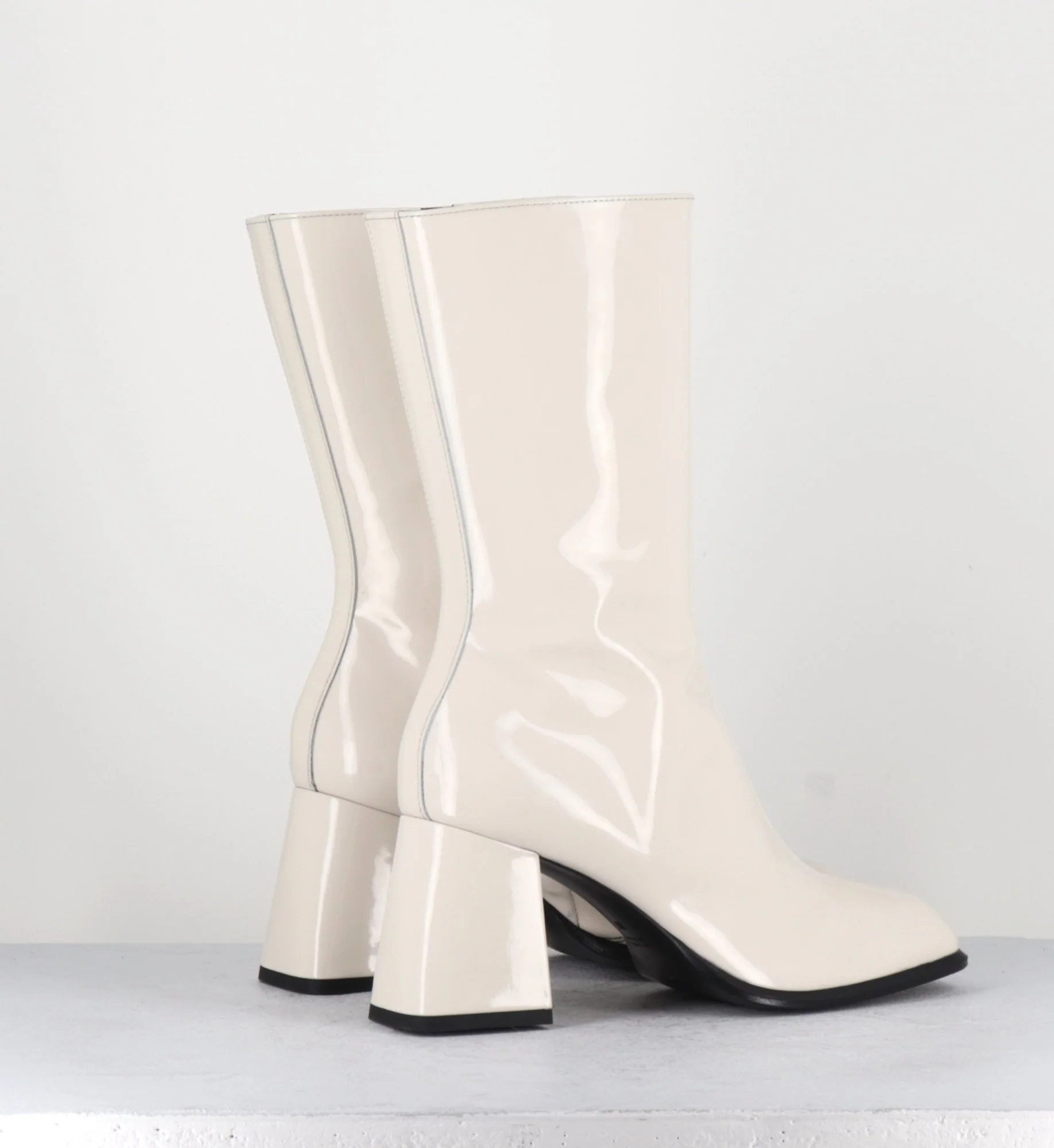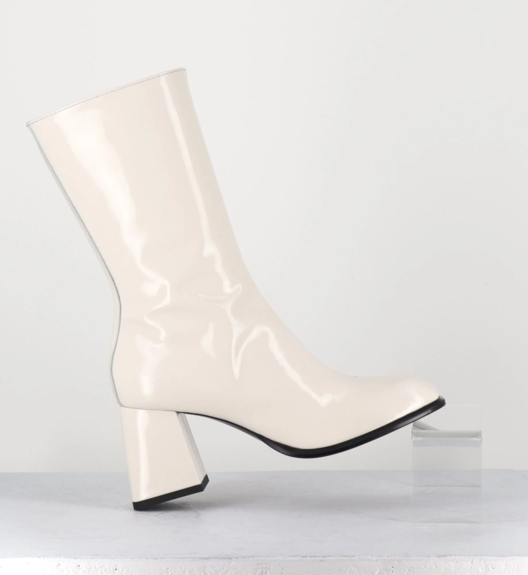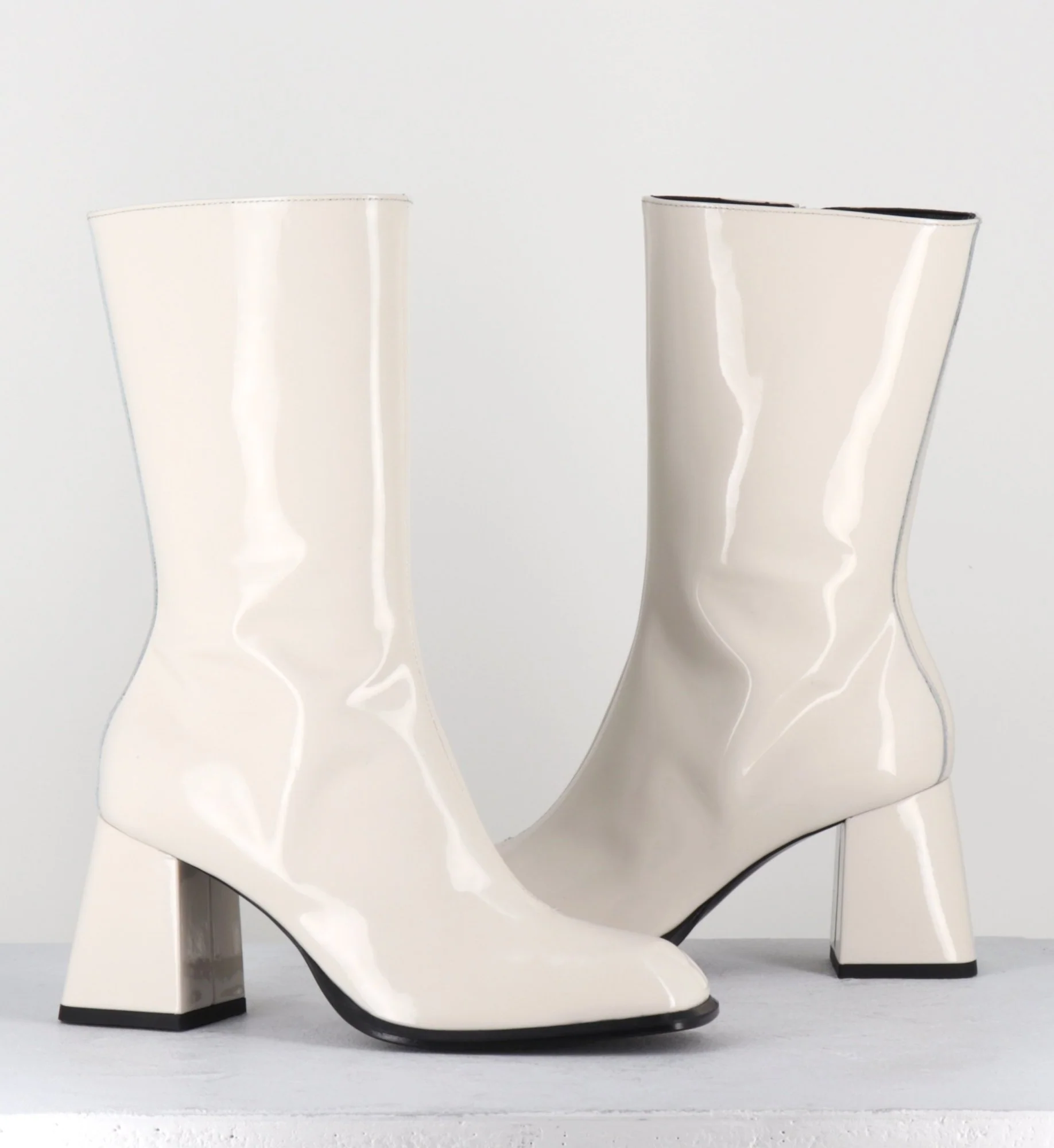 Boots tige haut en cuir vernis creme, bout carré arrondi, zip intérieur, montées sur un talon évasé esprit années 70 Chausse légèrement grand Fabrication Artisanale Italienne – Ateliers GarriceLab