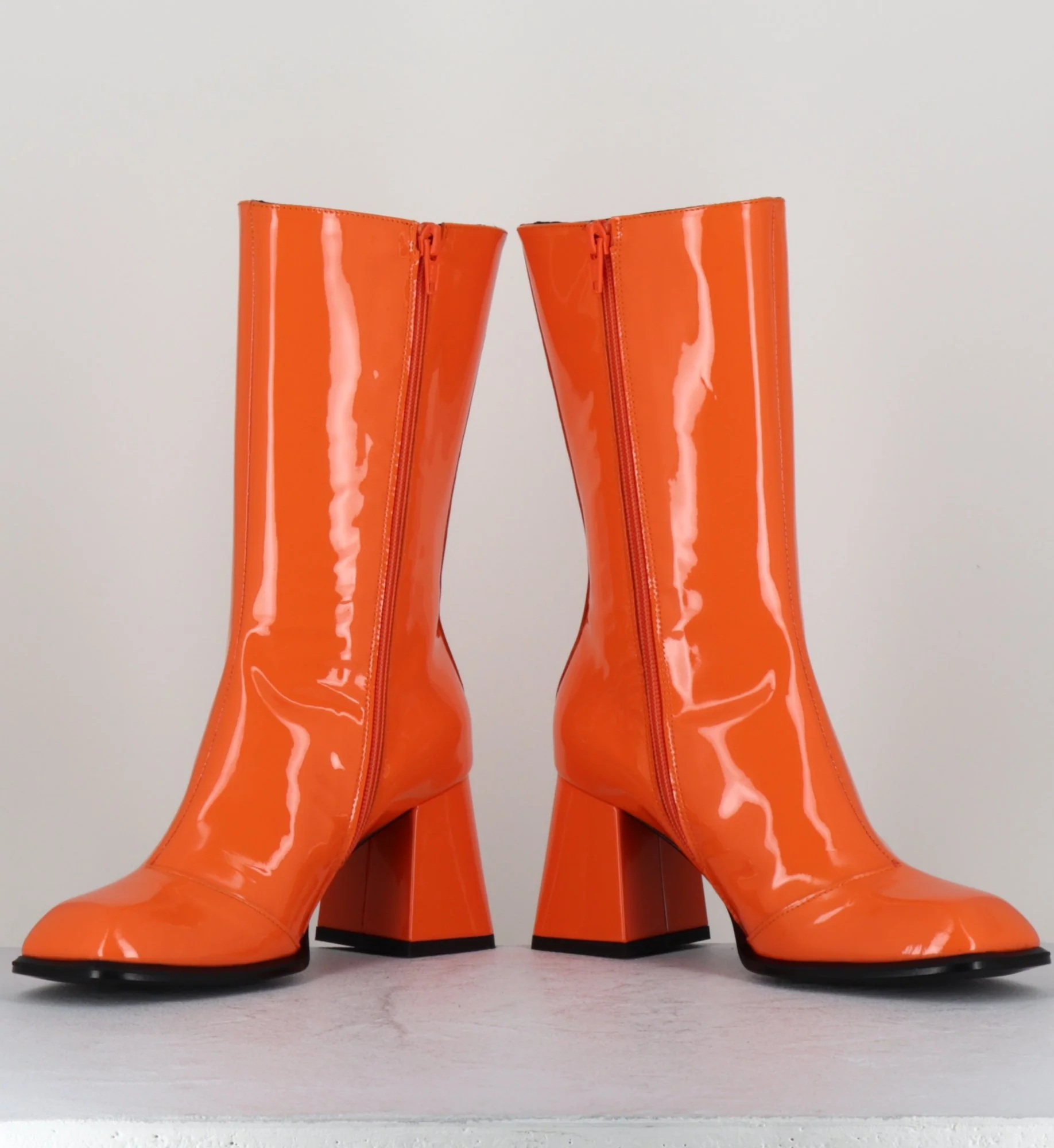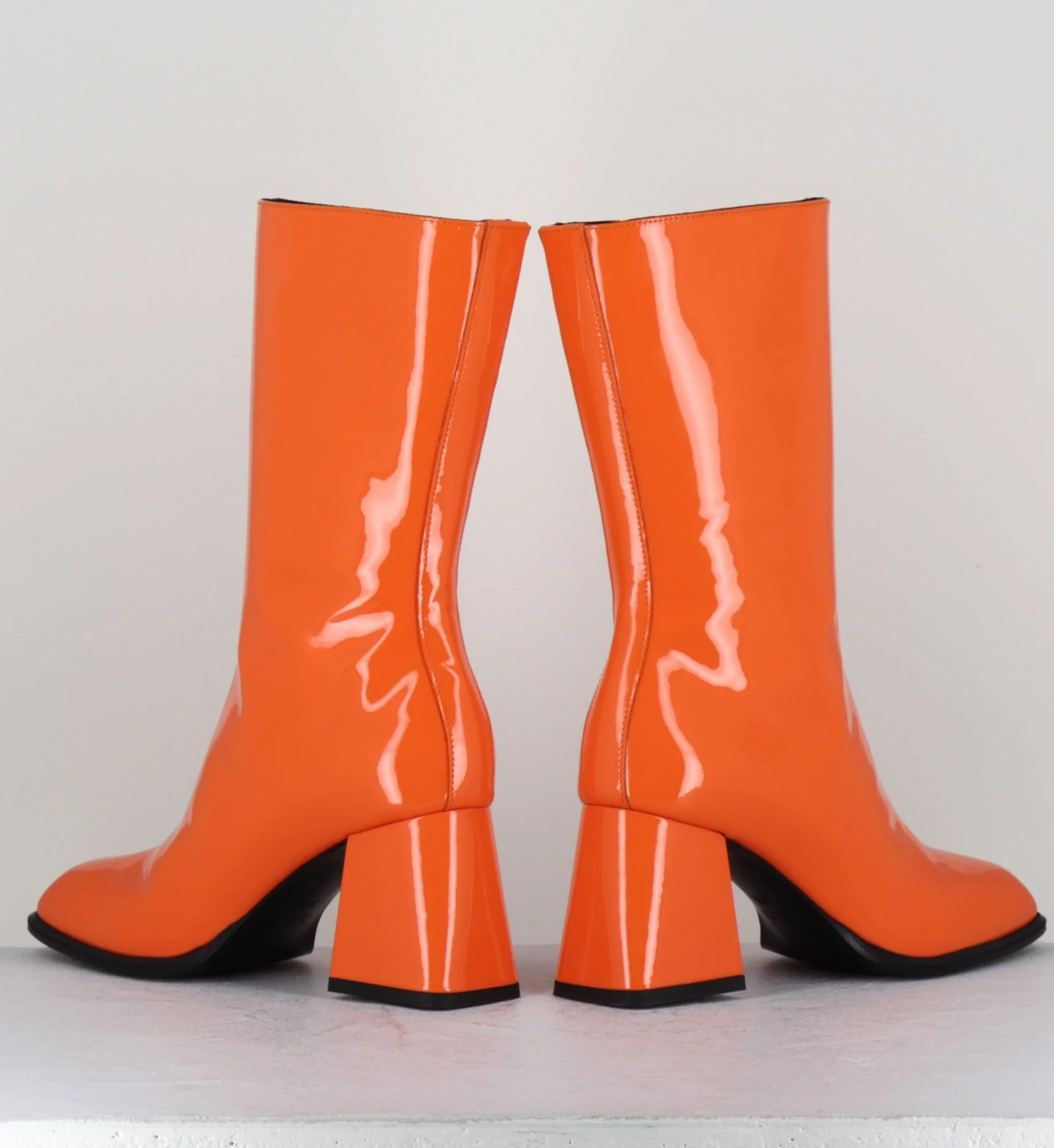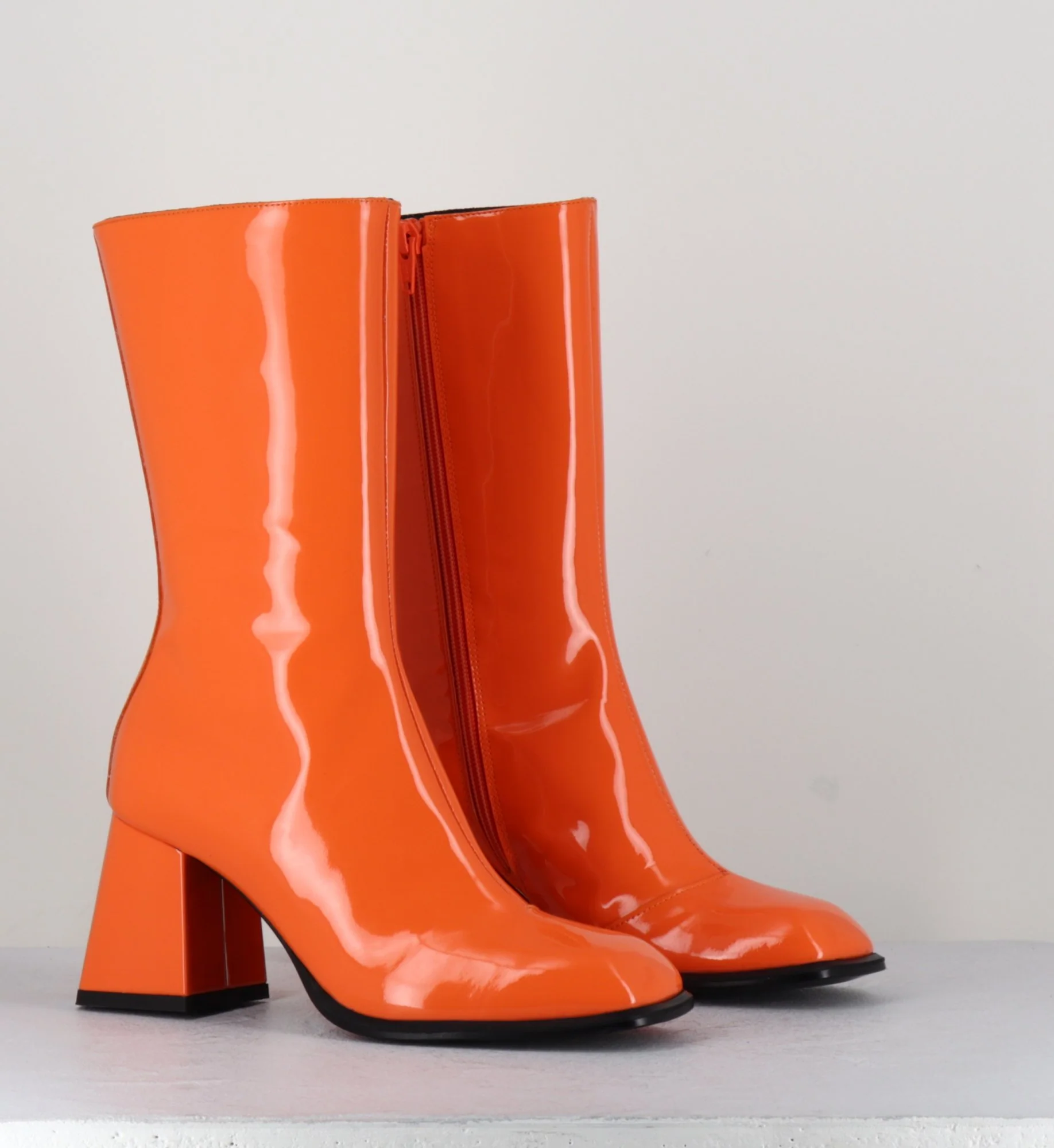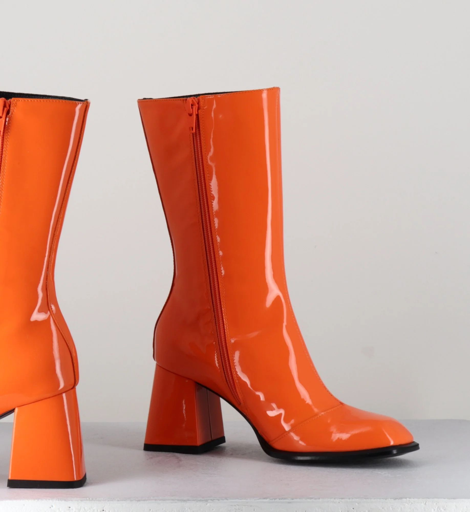 Boots tige haut en cuir vernis orange, bout carré arrondi, zip intérieur, montées sur un talon évasé esprit années 70