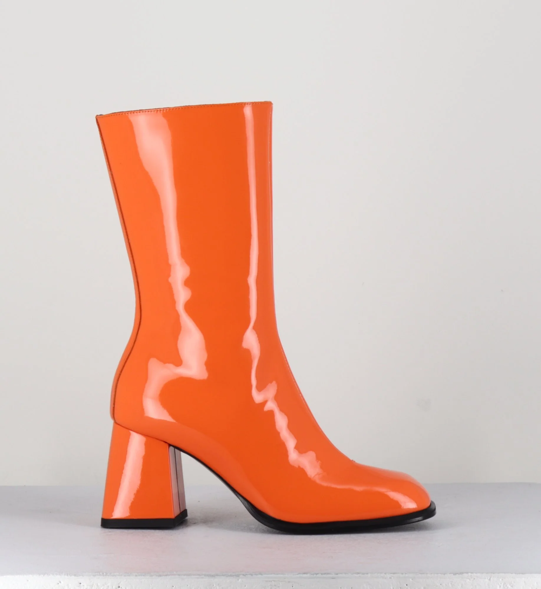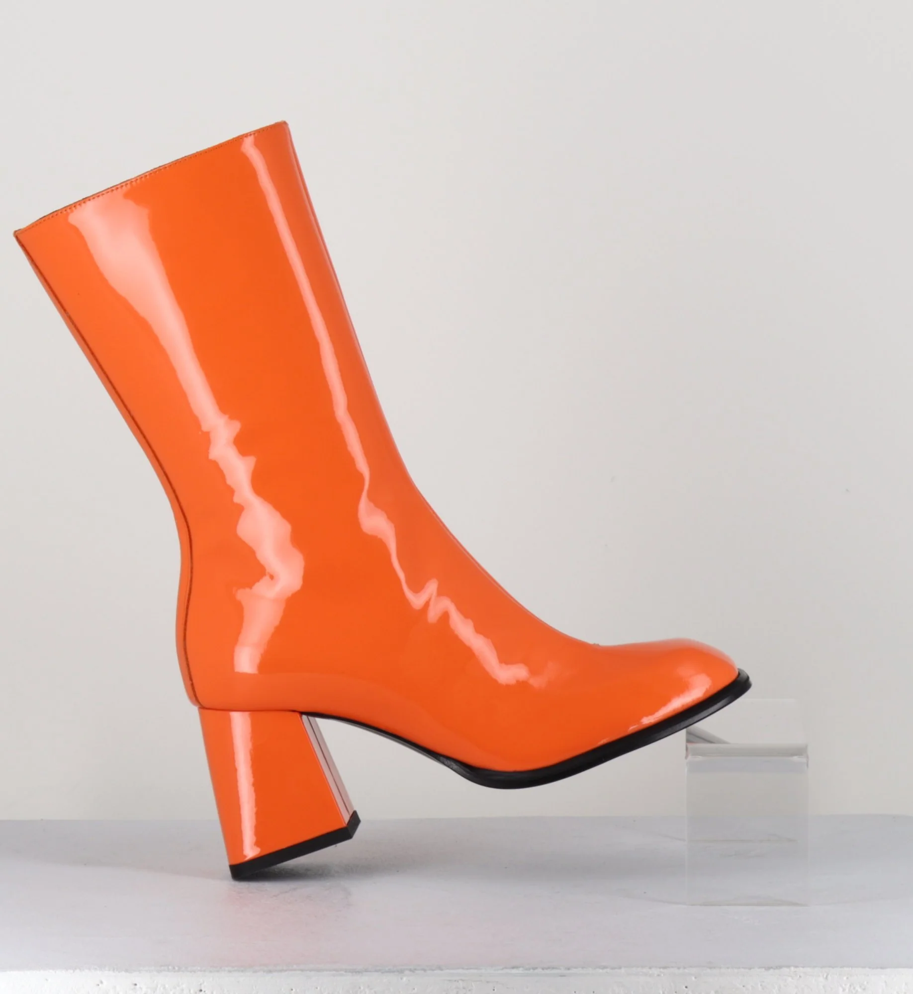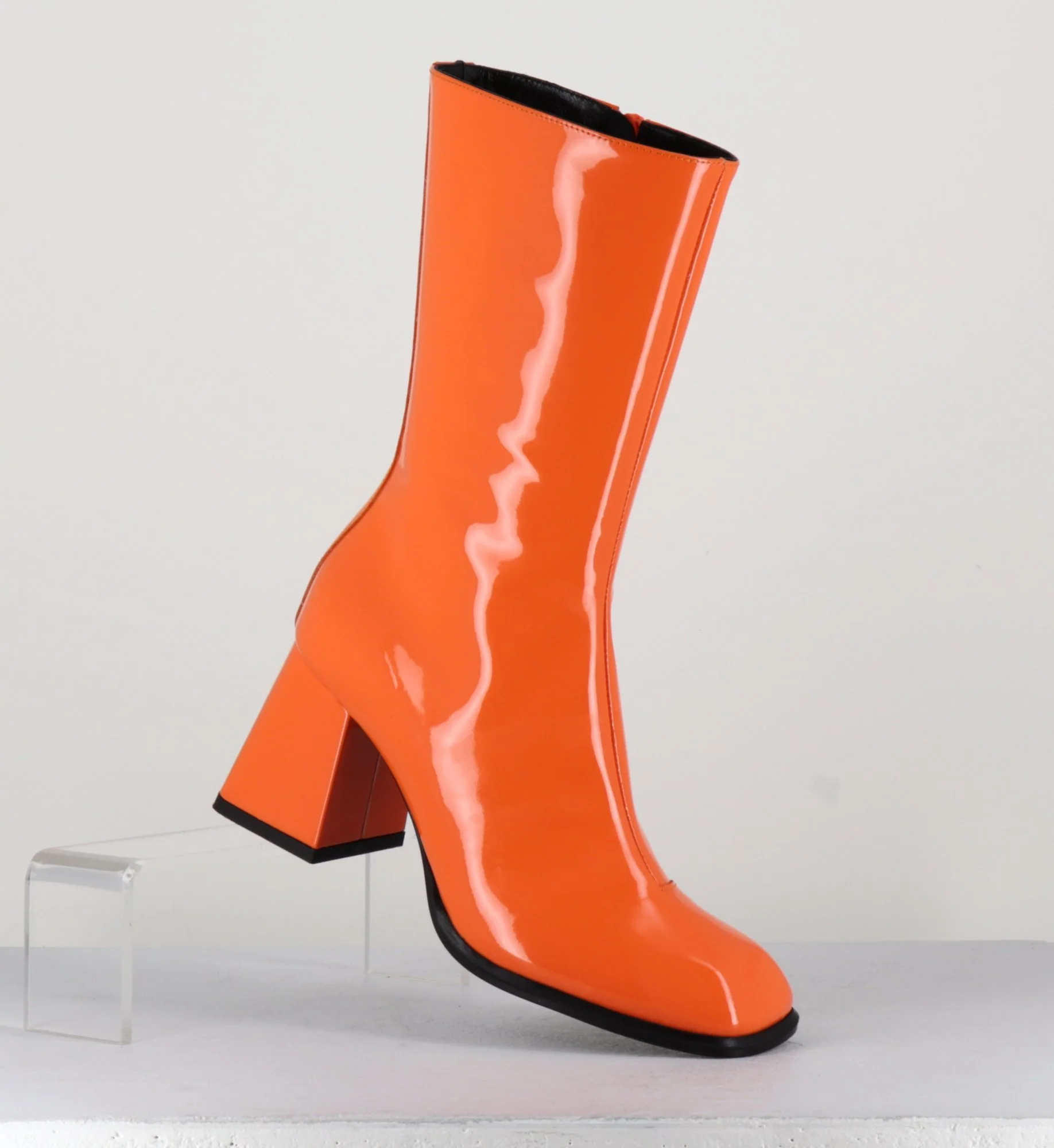 Boots tige haut en cuir vernis orange, bout carré arrondi, zip intérieur, montées sur un talon évasé esprit années 70 Chausse légèrement grand Fabrication Artisanale Italienne – Ateliers GarriceLab