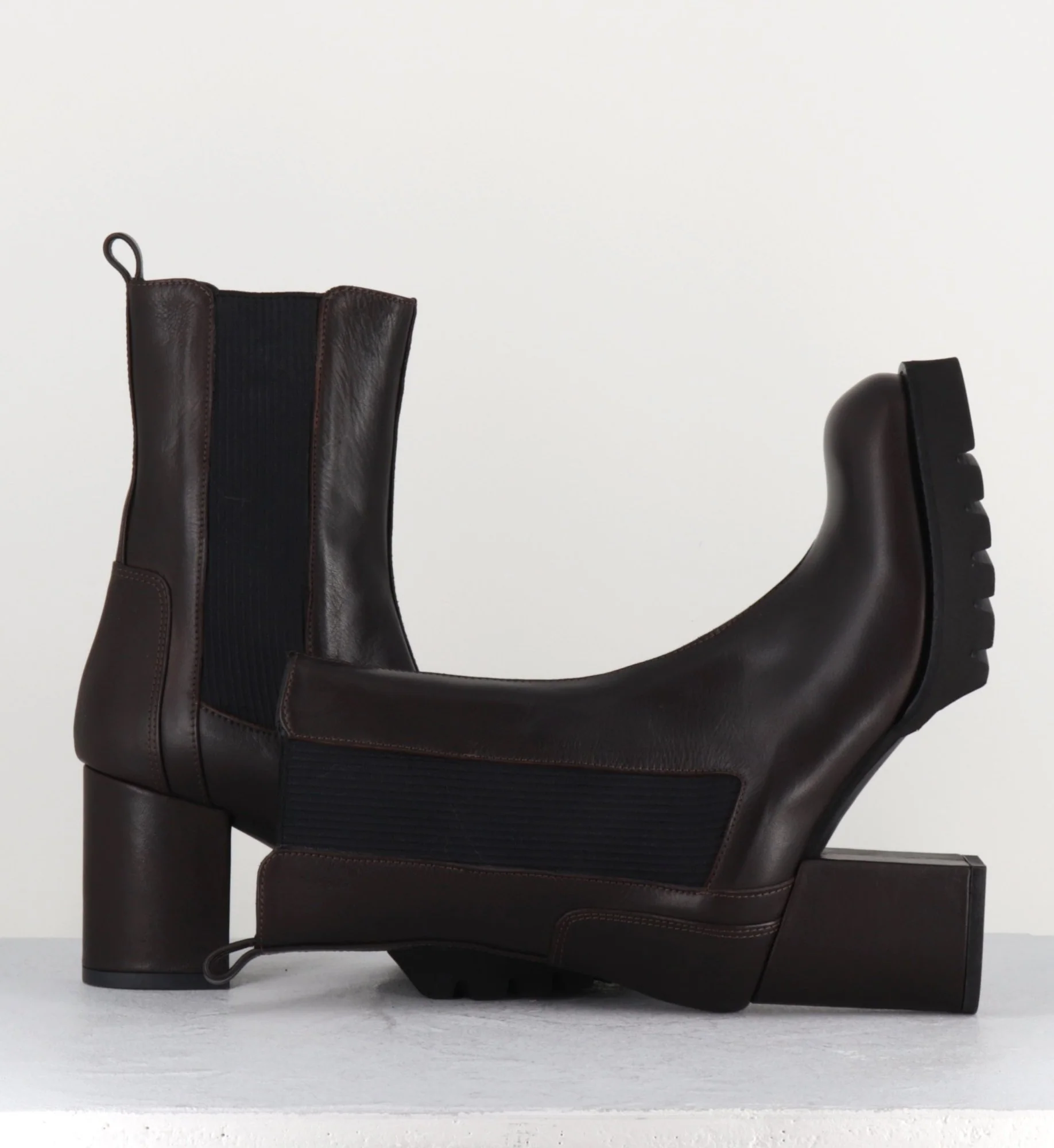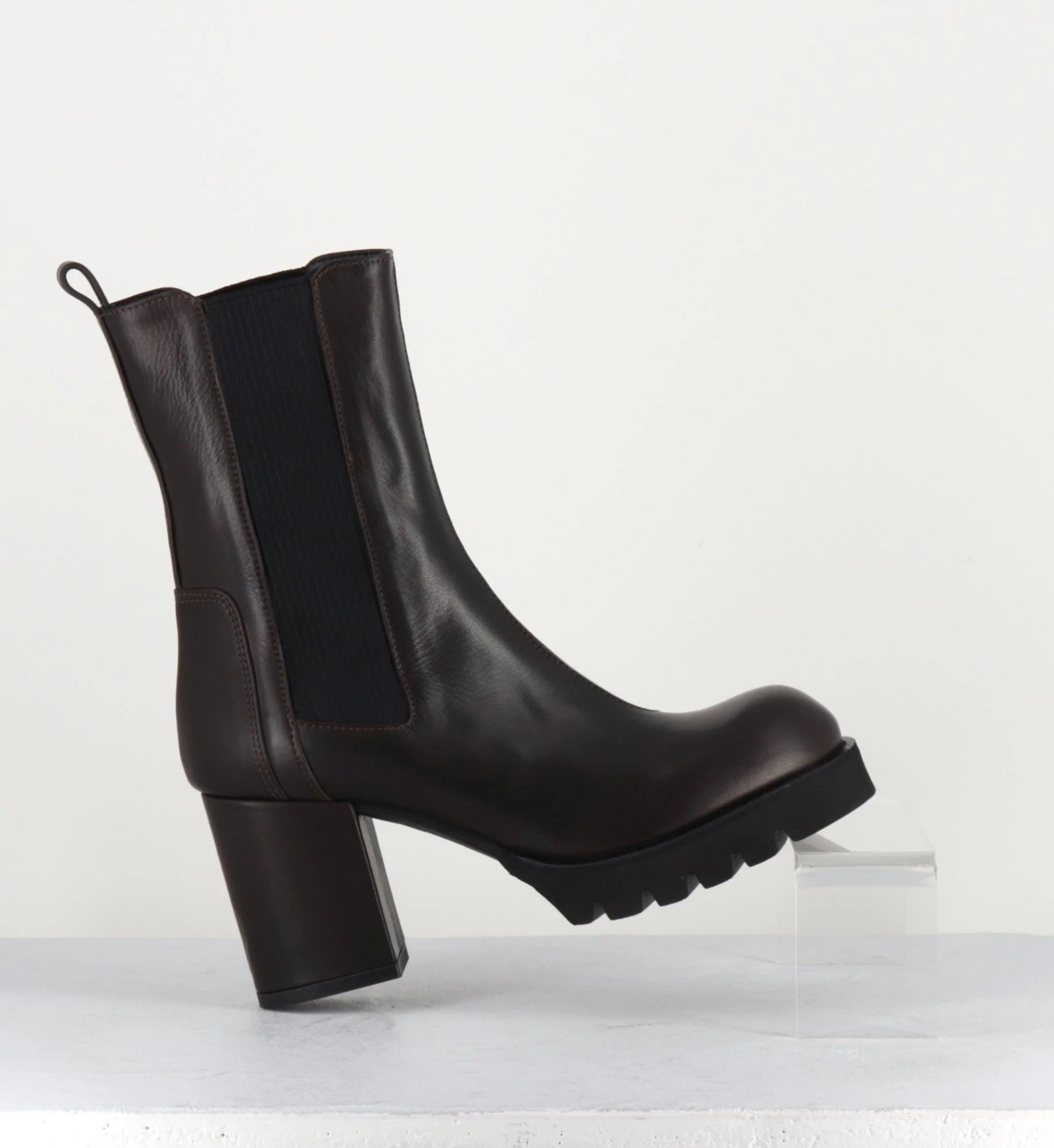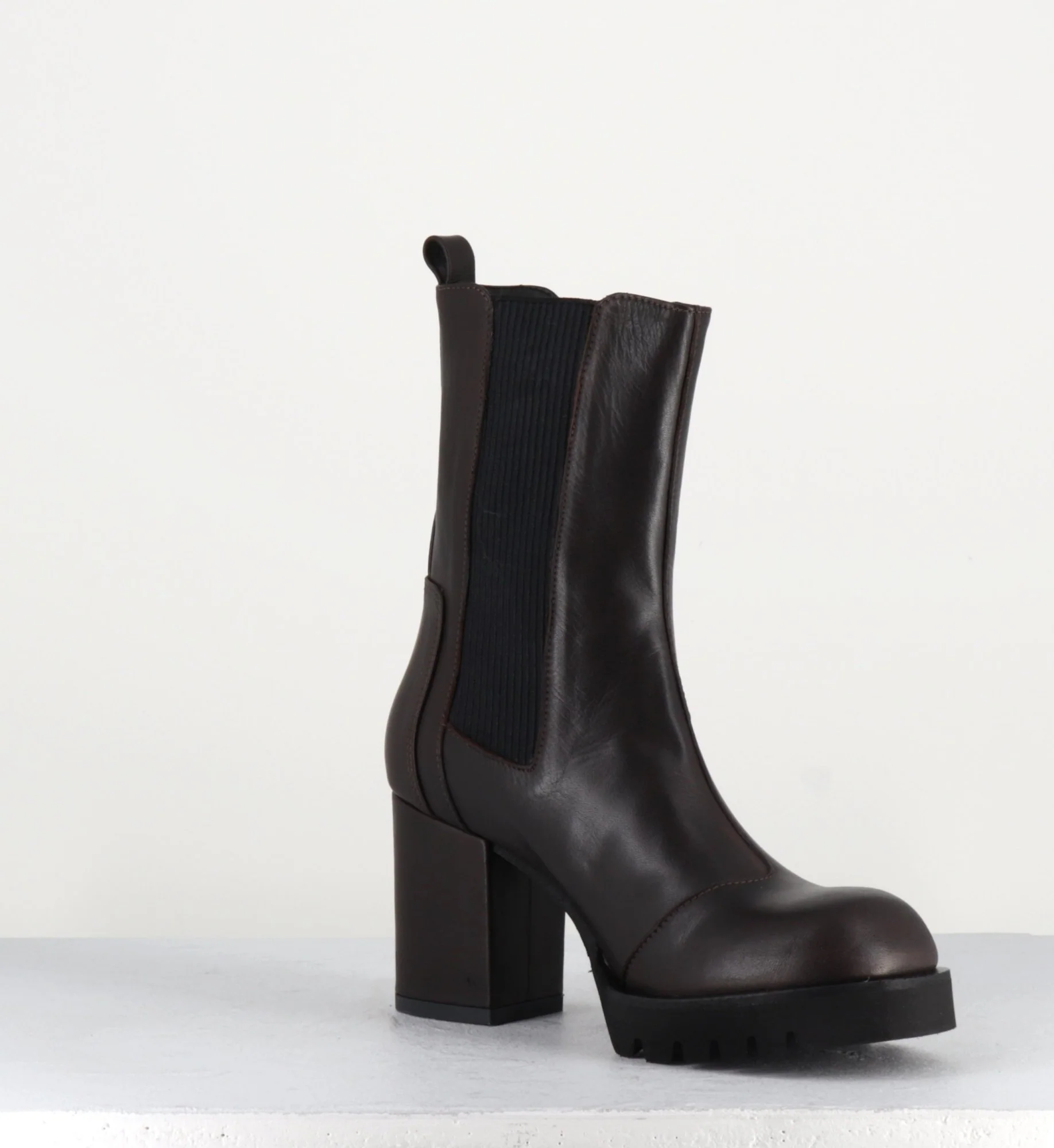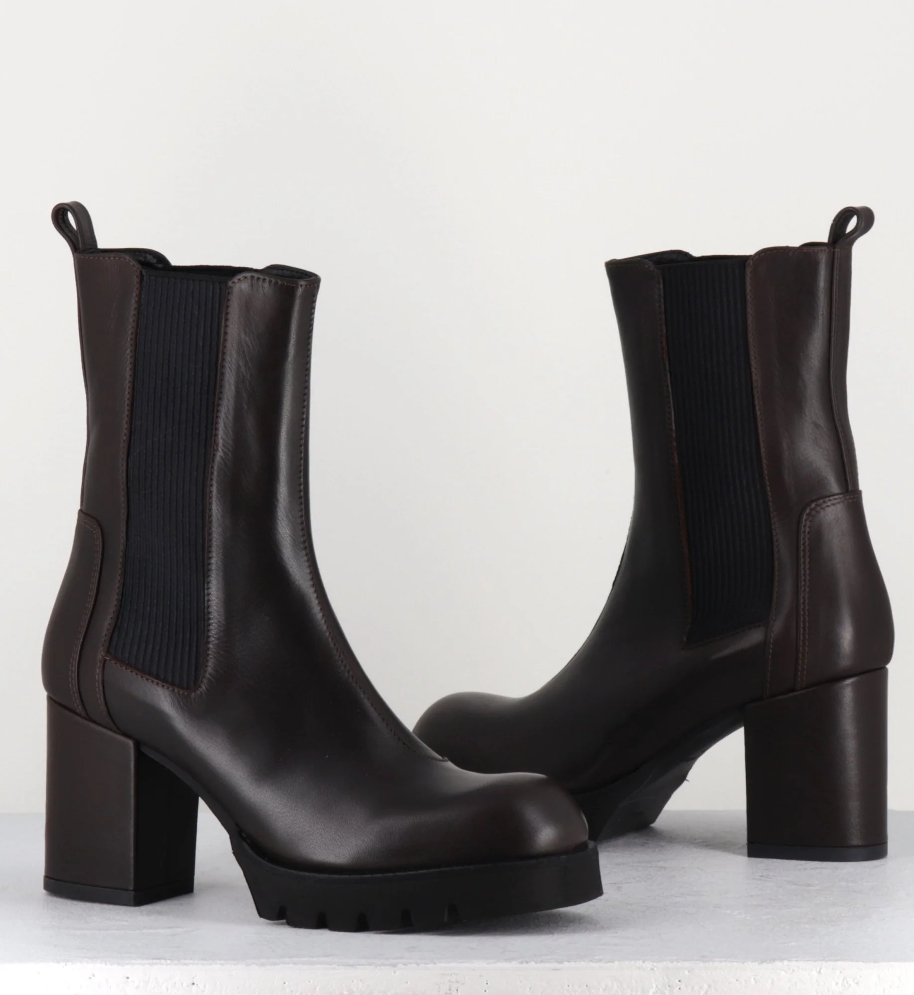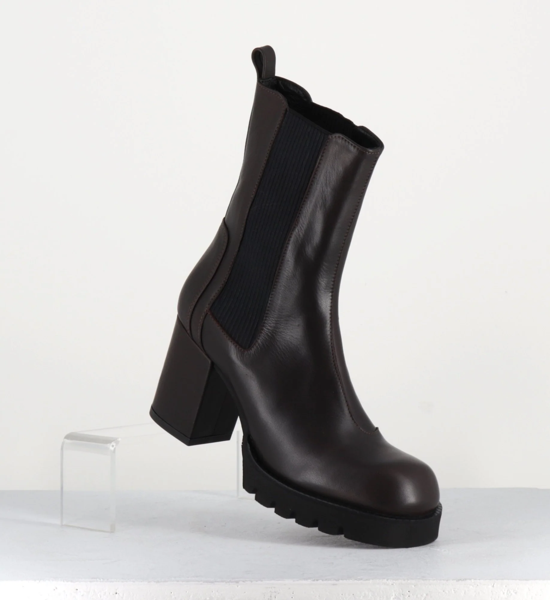 Boots en cuir souple marron chocolat à élastique noir, montées sur un talon bloc confortable et une plateforme en microfibre ultra légère Fabrication Artisanale Italienne Chausse grand