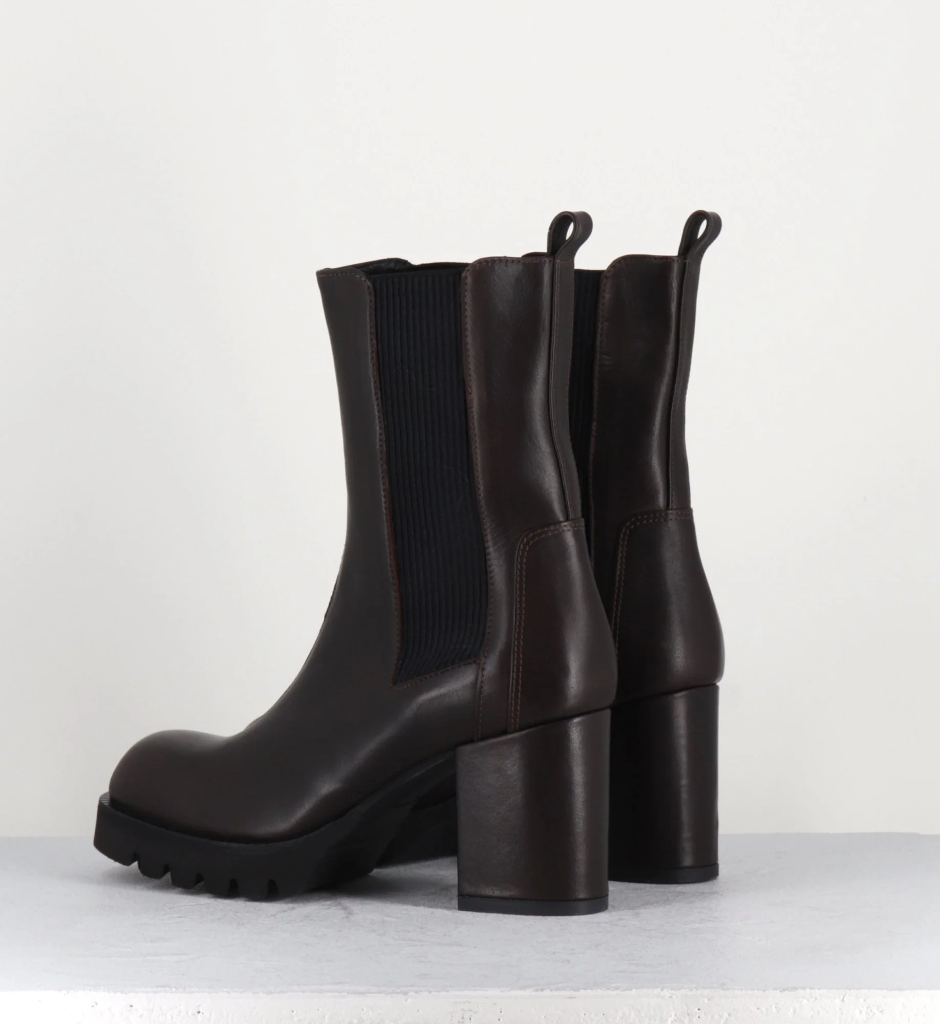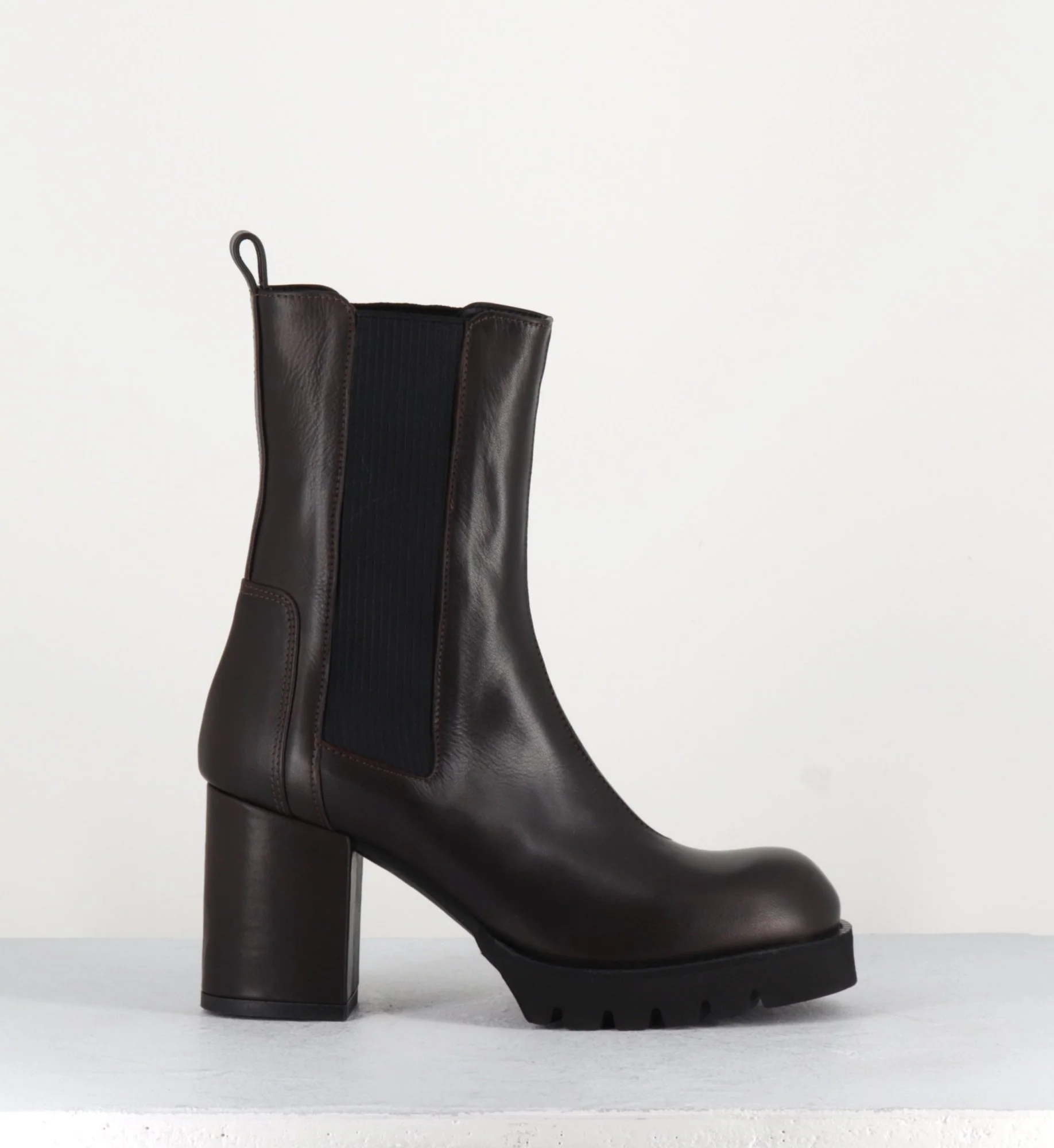 Boots en cuir souple marron chocolat à élastique noir, montées sur un talon bloc confortable et une plateforme en microfibre ultra légère