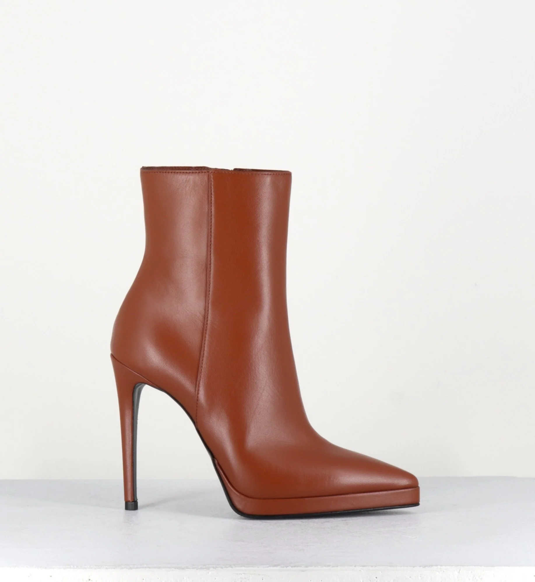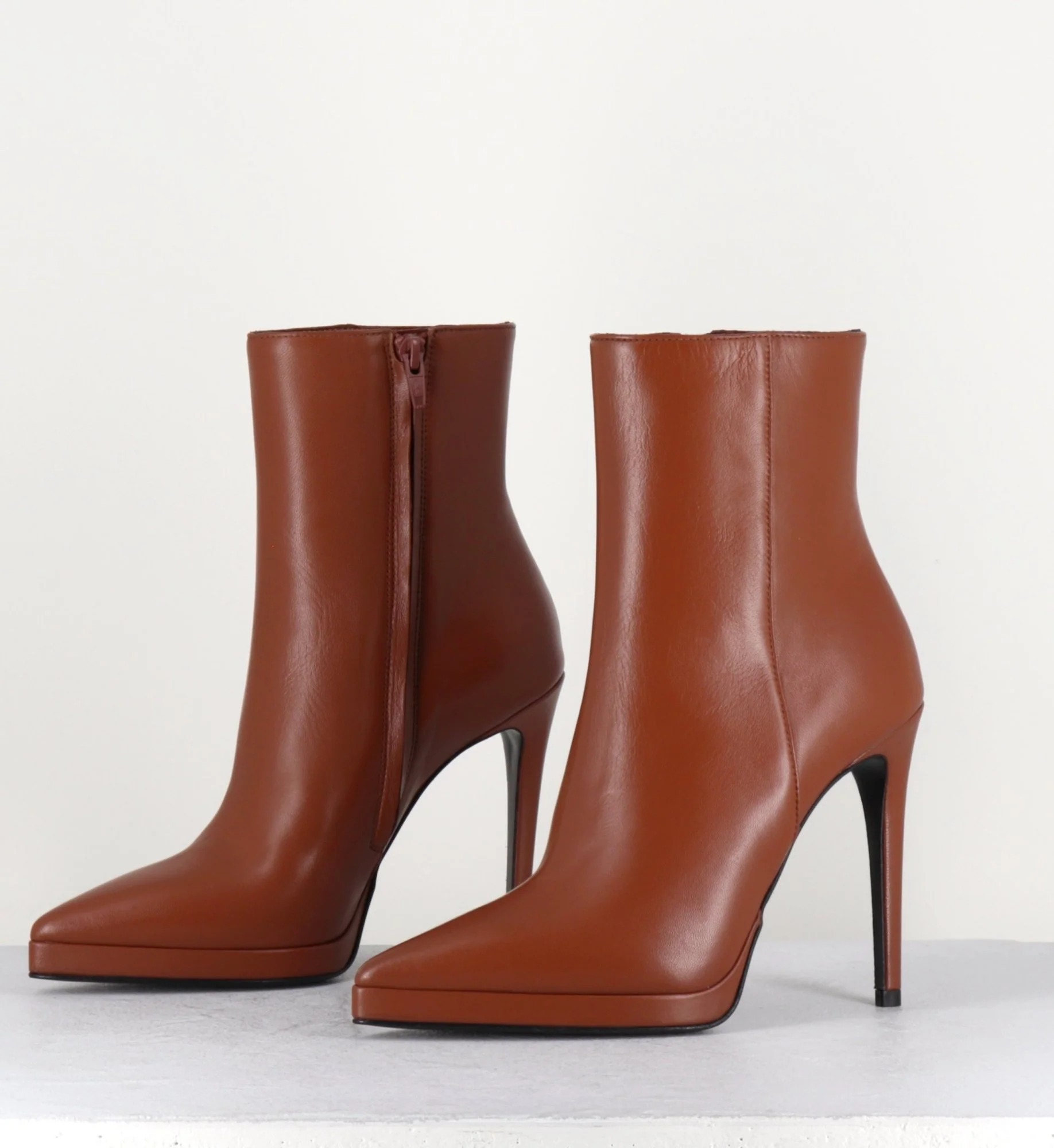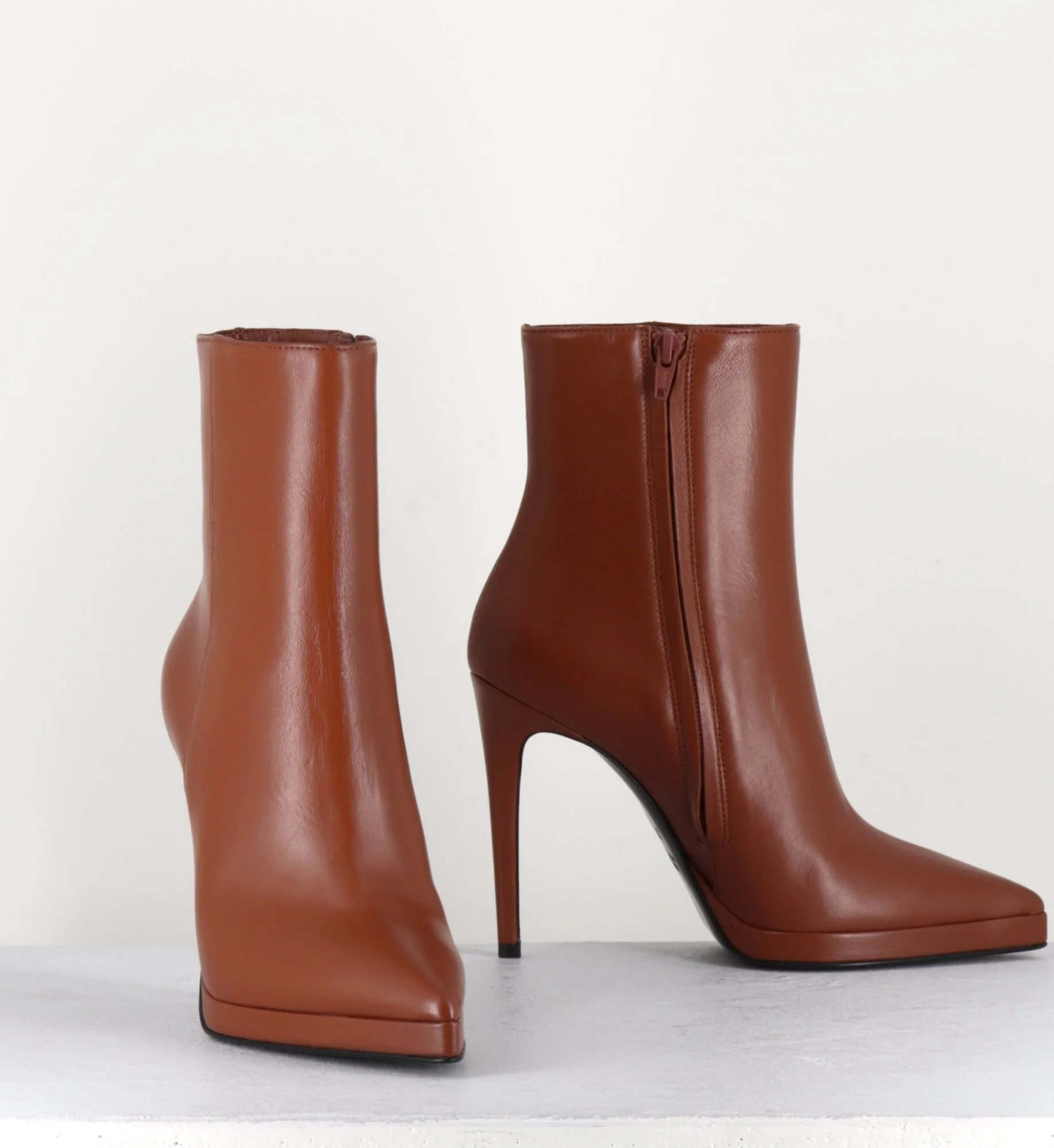 Boots bout pointu en cuir camel, montés sur un fin talon haut et une petite plateforme Fabrication Artisanale Italienne – GarriceLab Chausse grand