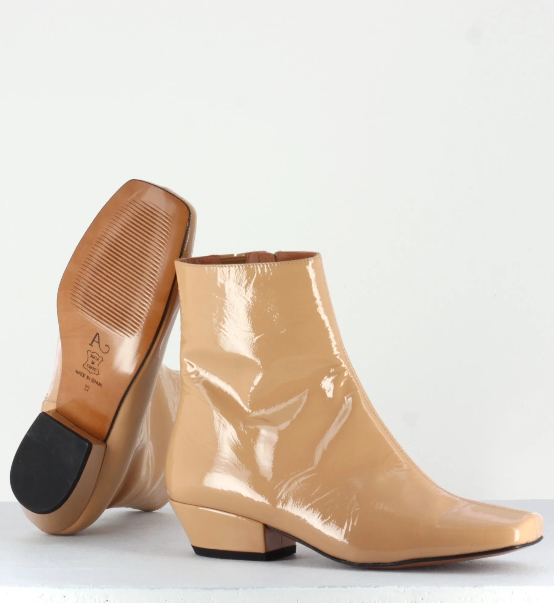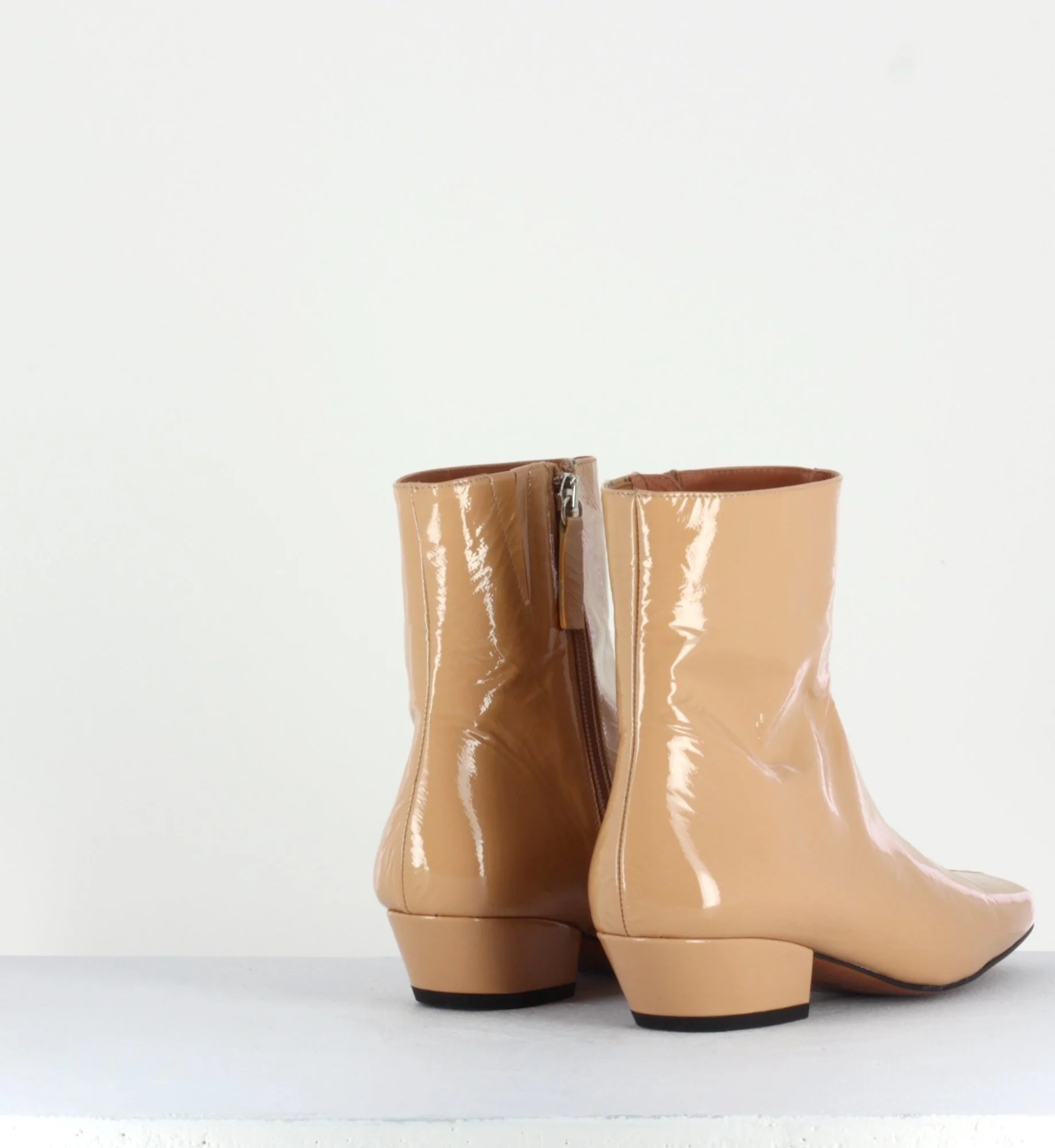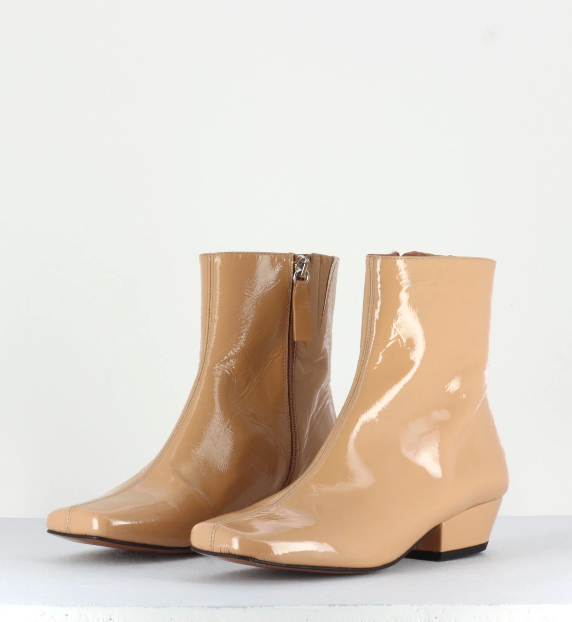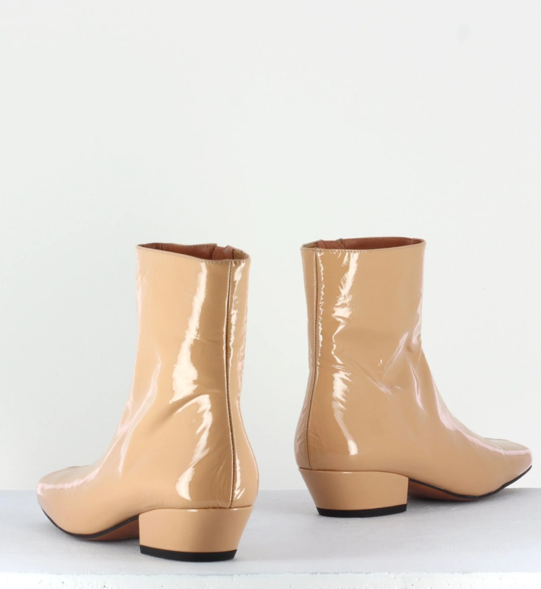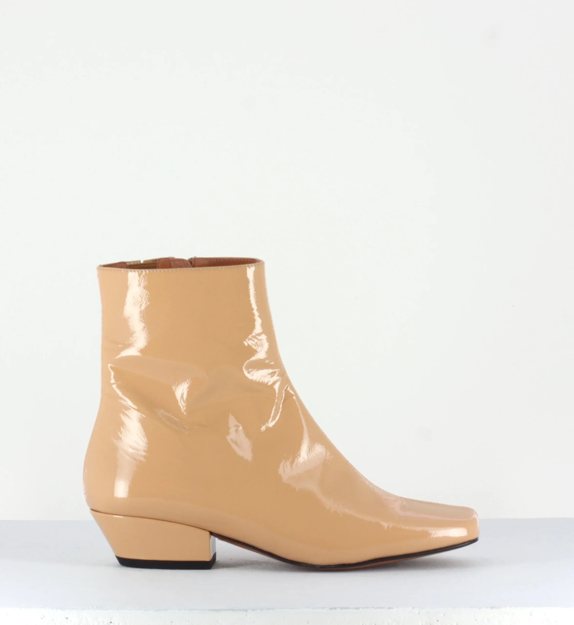 Boots courtes réalisées dans un cuir vernis souple beige avec bout carré et couture centrale, montées sur un petit talon recouvert légèrement biseauté.