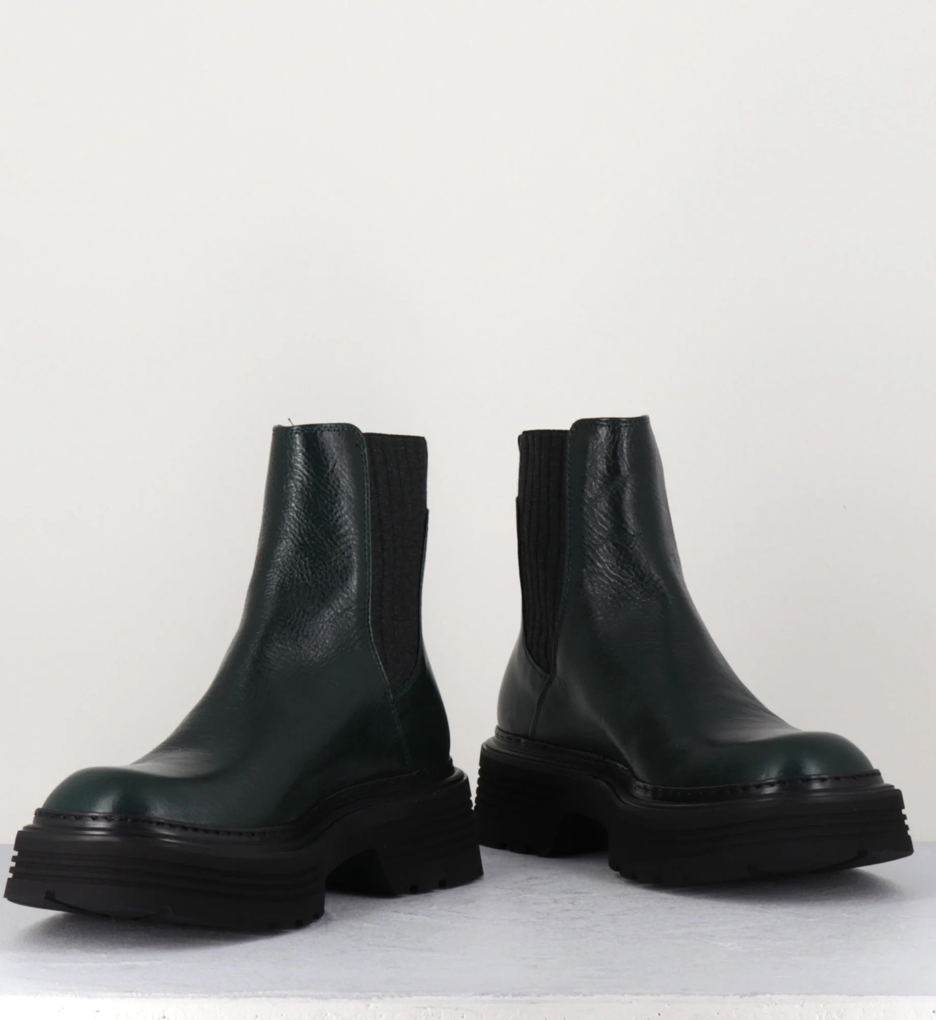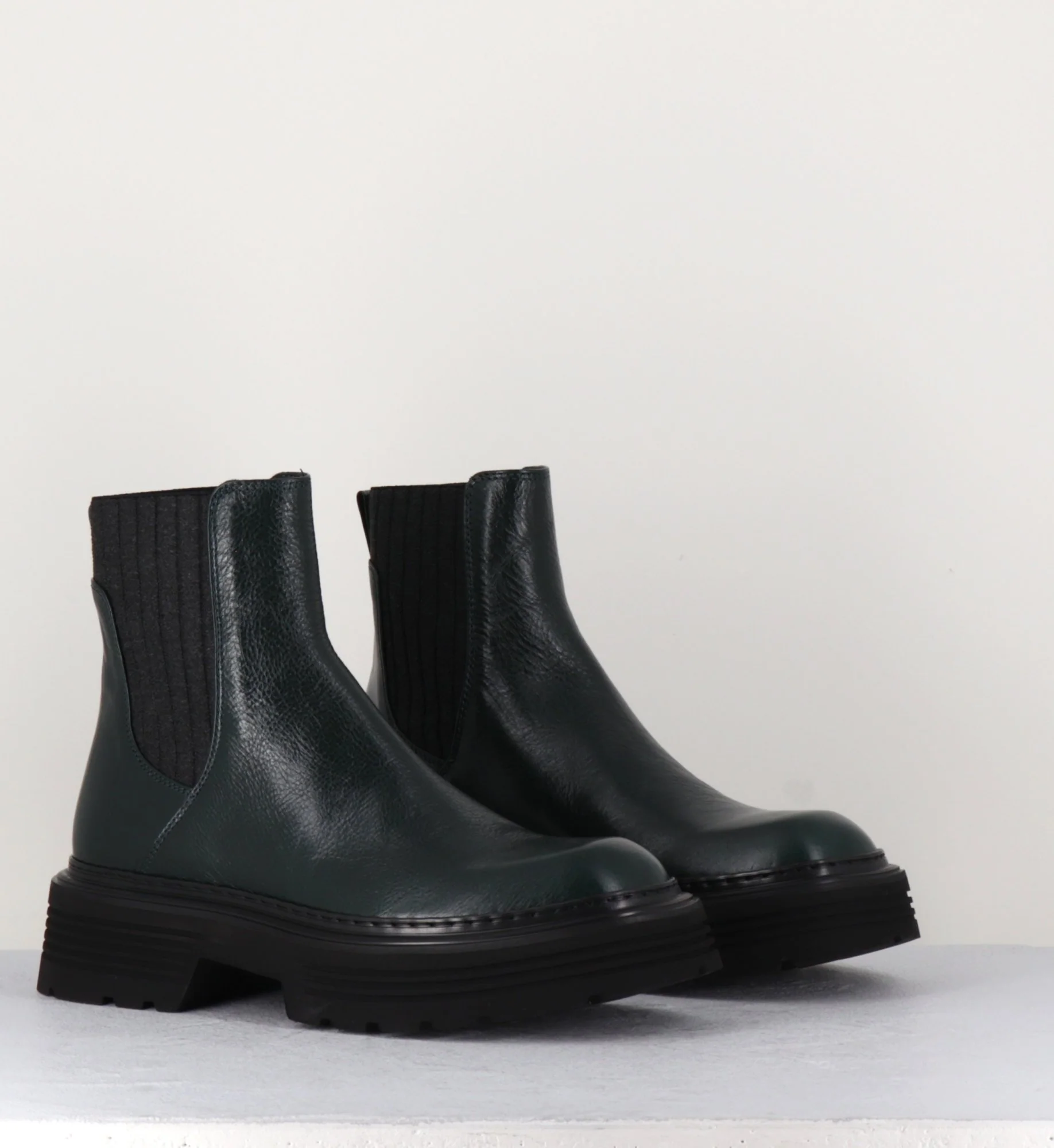 Boots chelsea en cuir bleu pétrole à élastiques côtelés gris, look, bout carré arrondi, montées sur une plateforme à deux blocs ultra légère en micro-fibre à semelle légèrement crantée. Fabrication Artisanale Italienne – Ateliers GarriceLab Chausse légèrement grand.