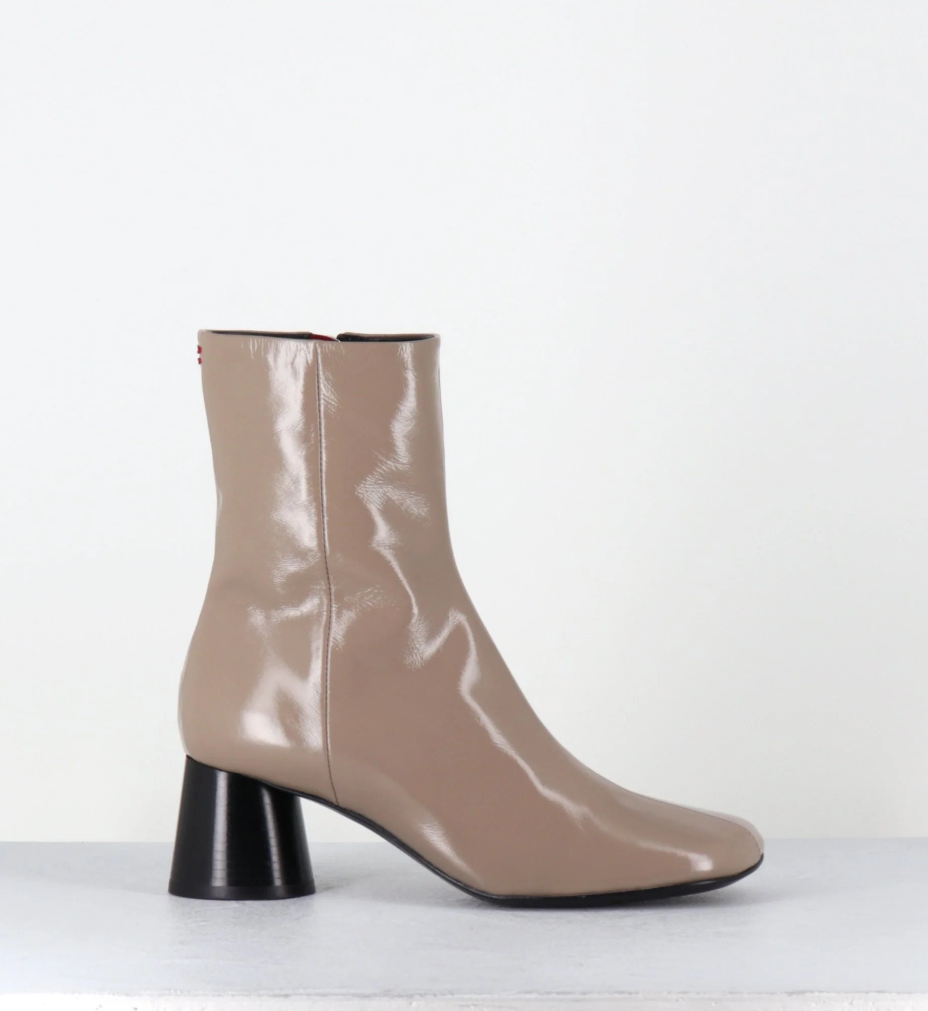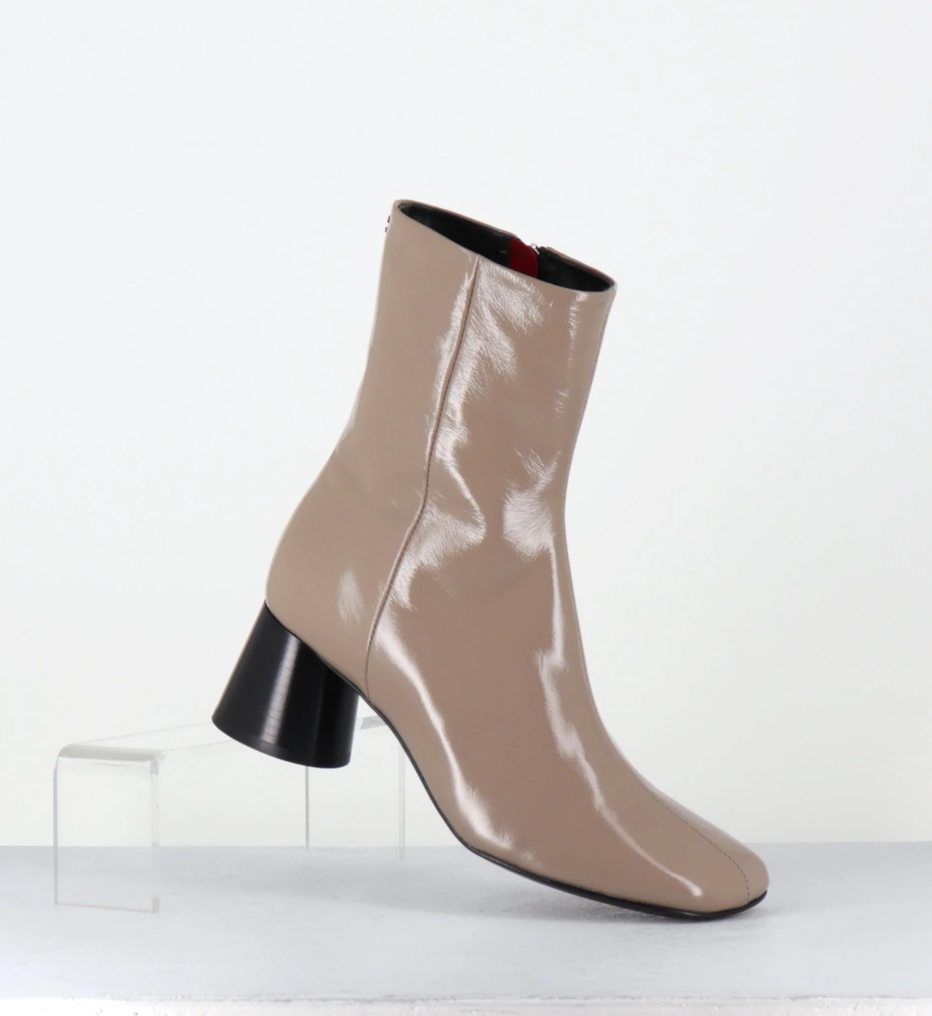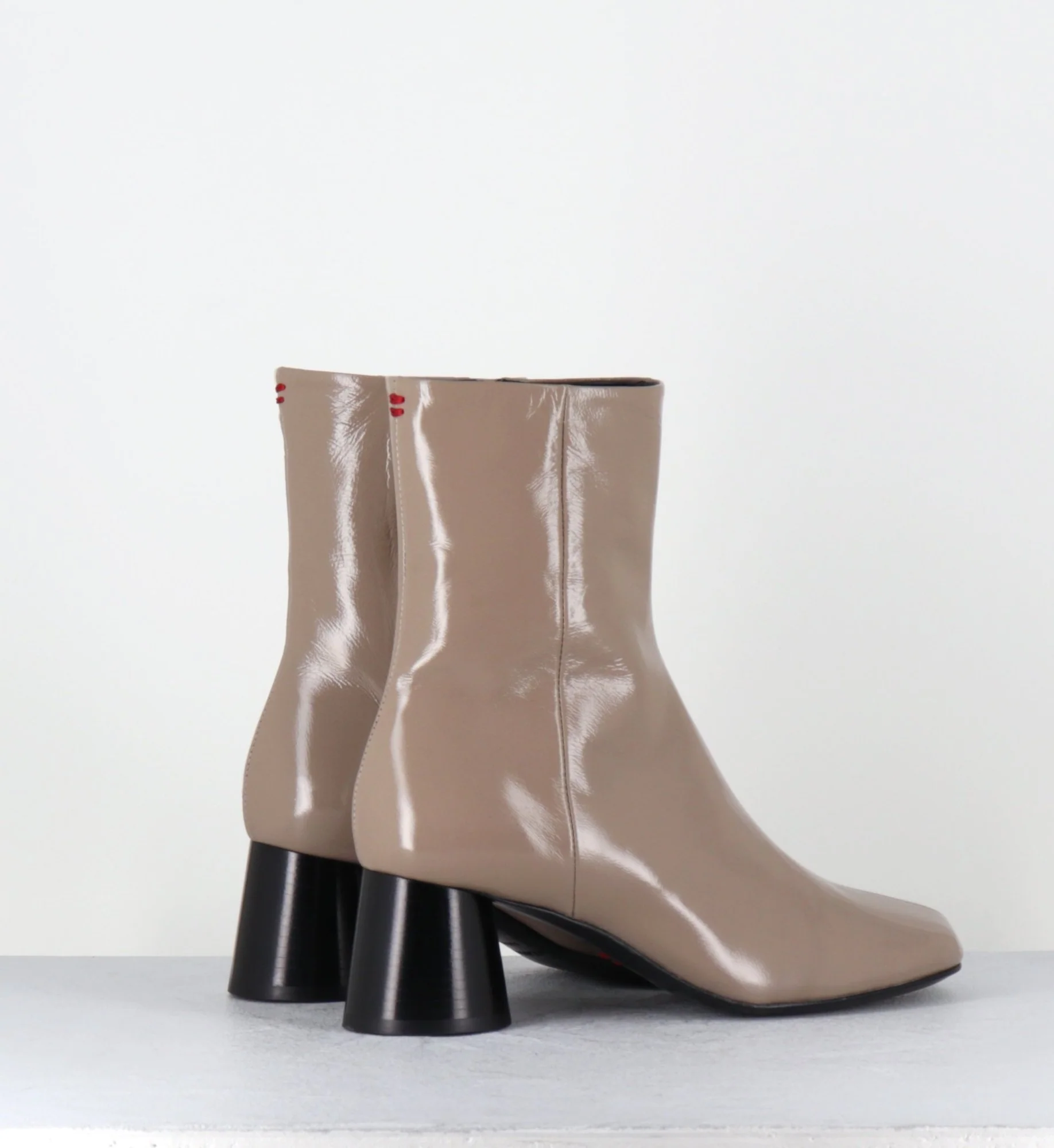 Boots en cuir taupe souple avec finition brillante, bout carré légèrement asymétrique, zip intérieur, couture signature de la maison sur le contrefort, montés sur un talon cylindrique évasé peint à la main en noir