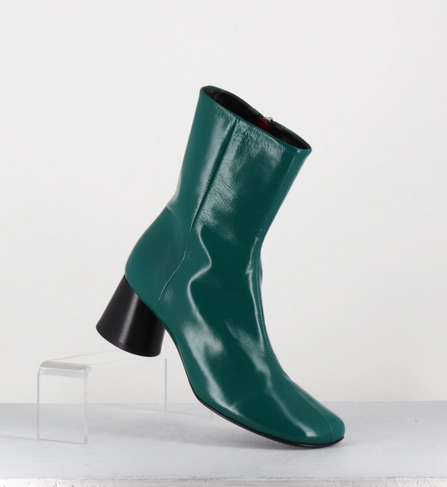 Boots en cuir souple effet brillant vert, bout carré légèrement asymétrique, zip intérieur, couture signature de la maison sur le contrefort, montés sur un talon cylindrique évasé peint à la main en noir