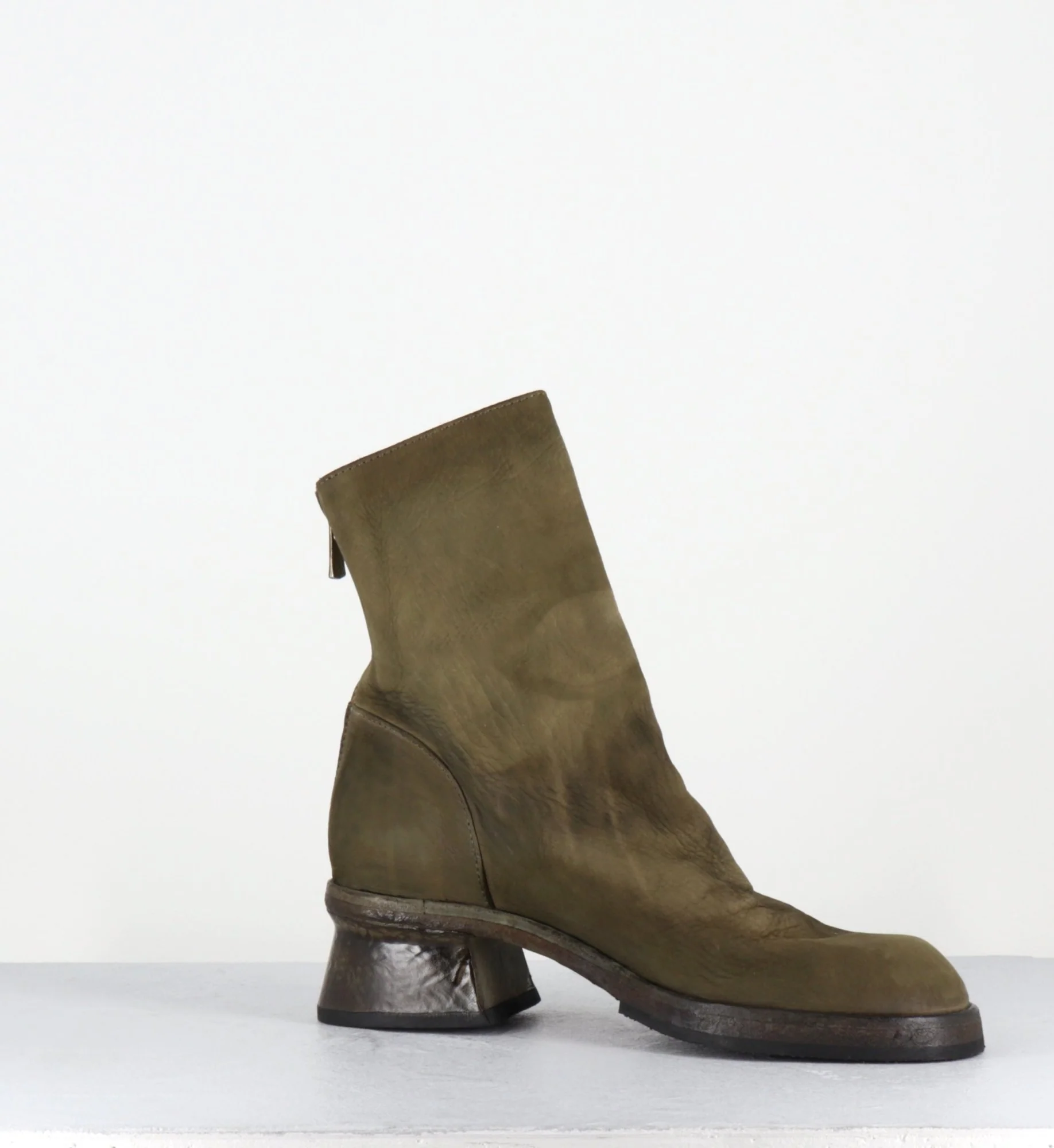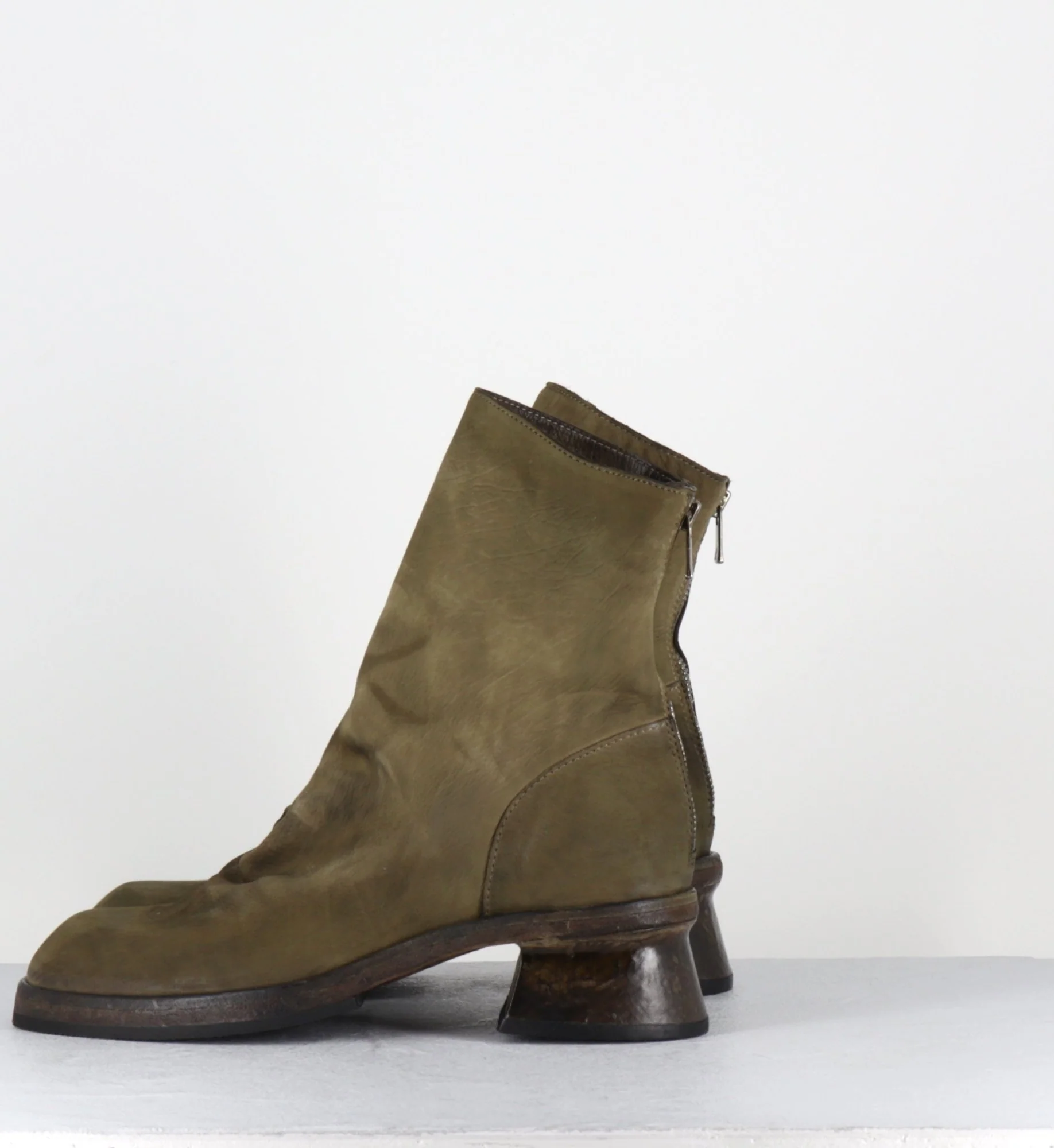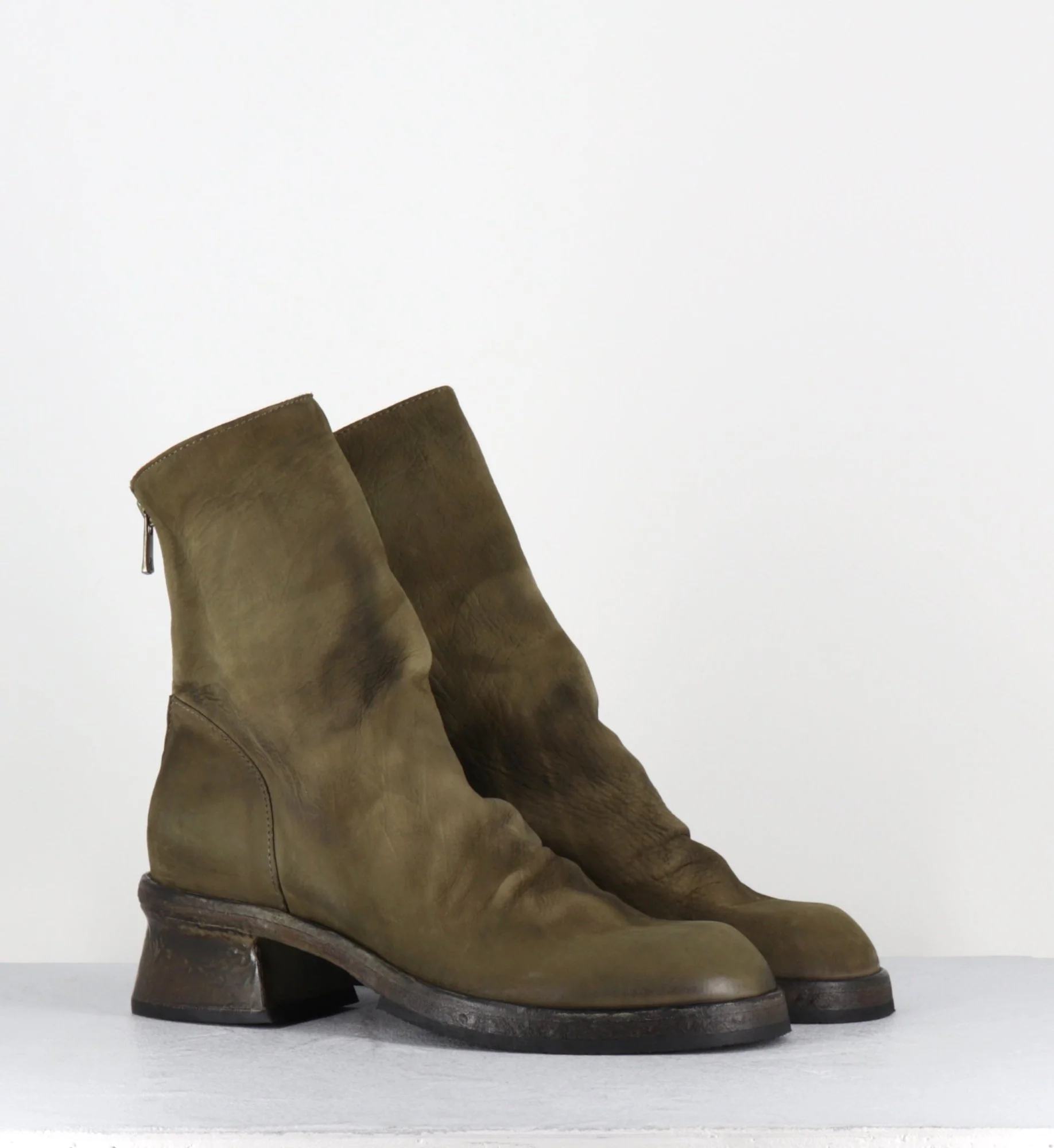 Boots en cuir gras lavé à la main pour un effet vintage, couleur vert kaki nuancé, zip arrière, montées sur une double semelle cousue intégral et un petit talon légèrement déstructuré