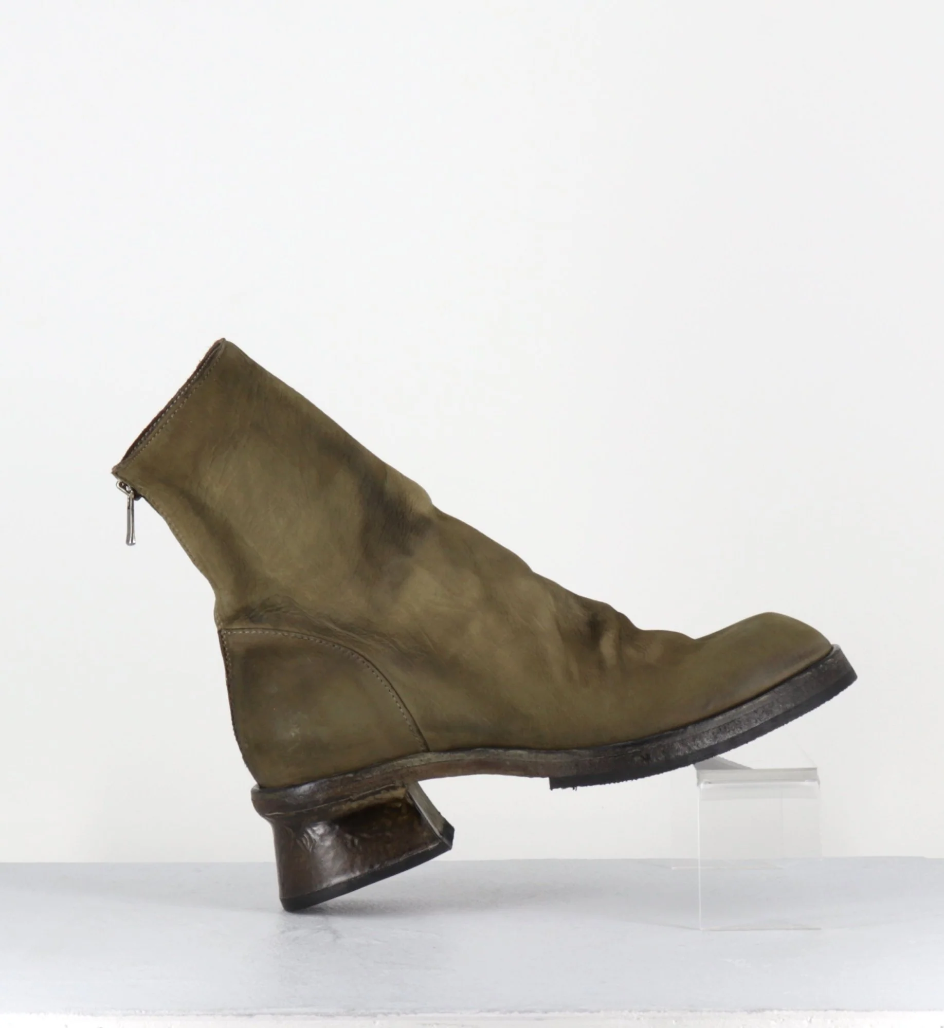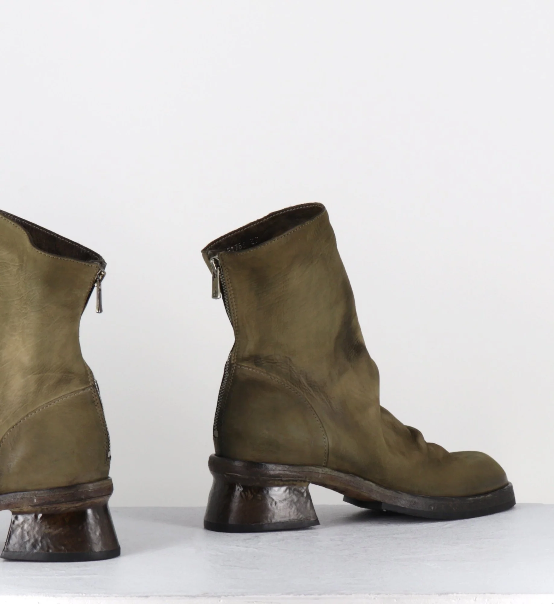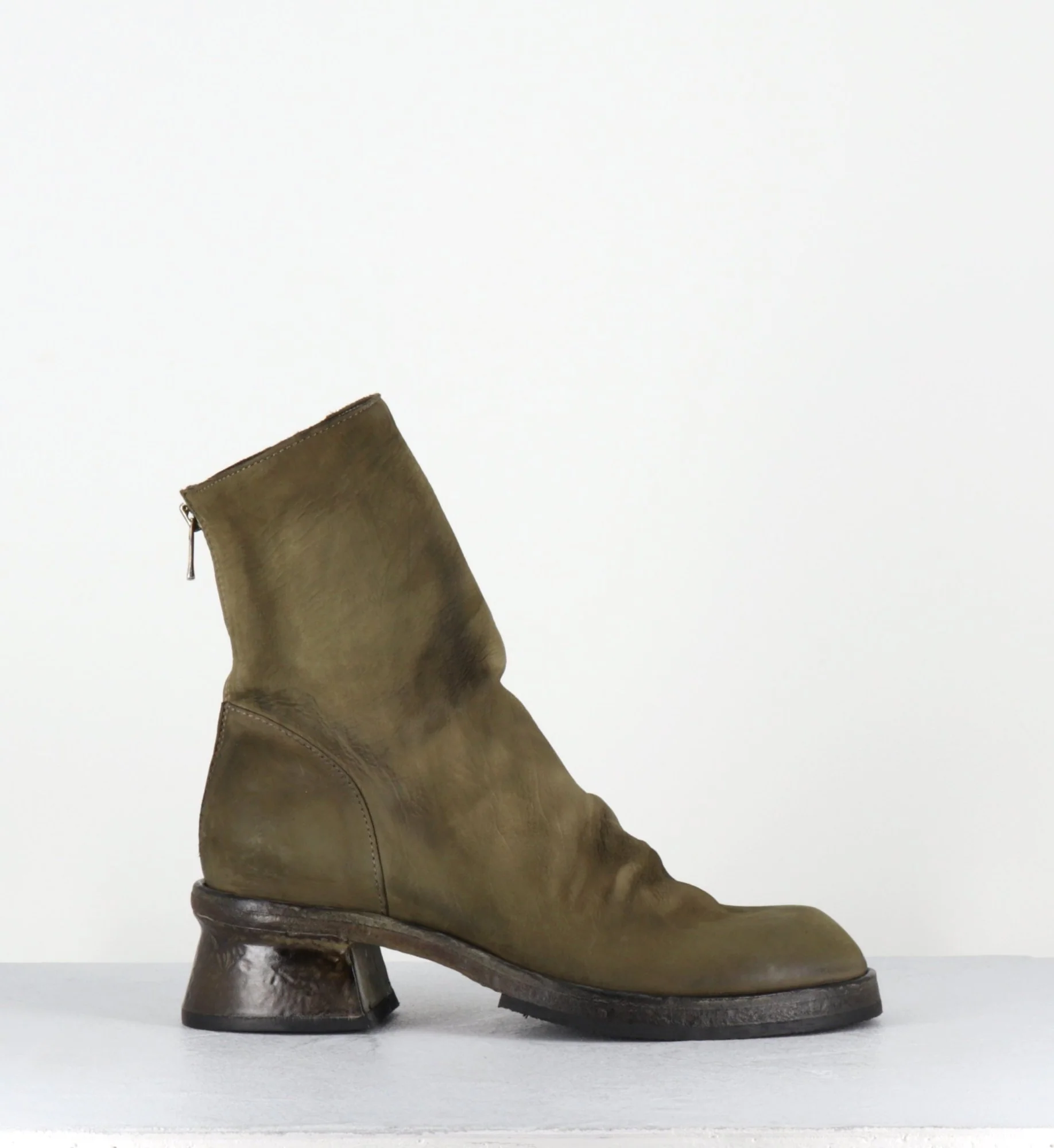 Boots en cuir gras lavé à la main pour un effet vintage, couleur vert kaki nuancé, zip arrière, montées sur une double semelle cousue intégral et un petit talon légèrement déstructuré