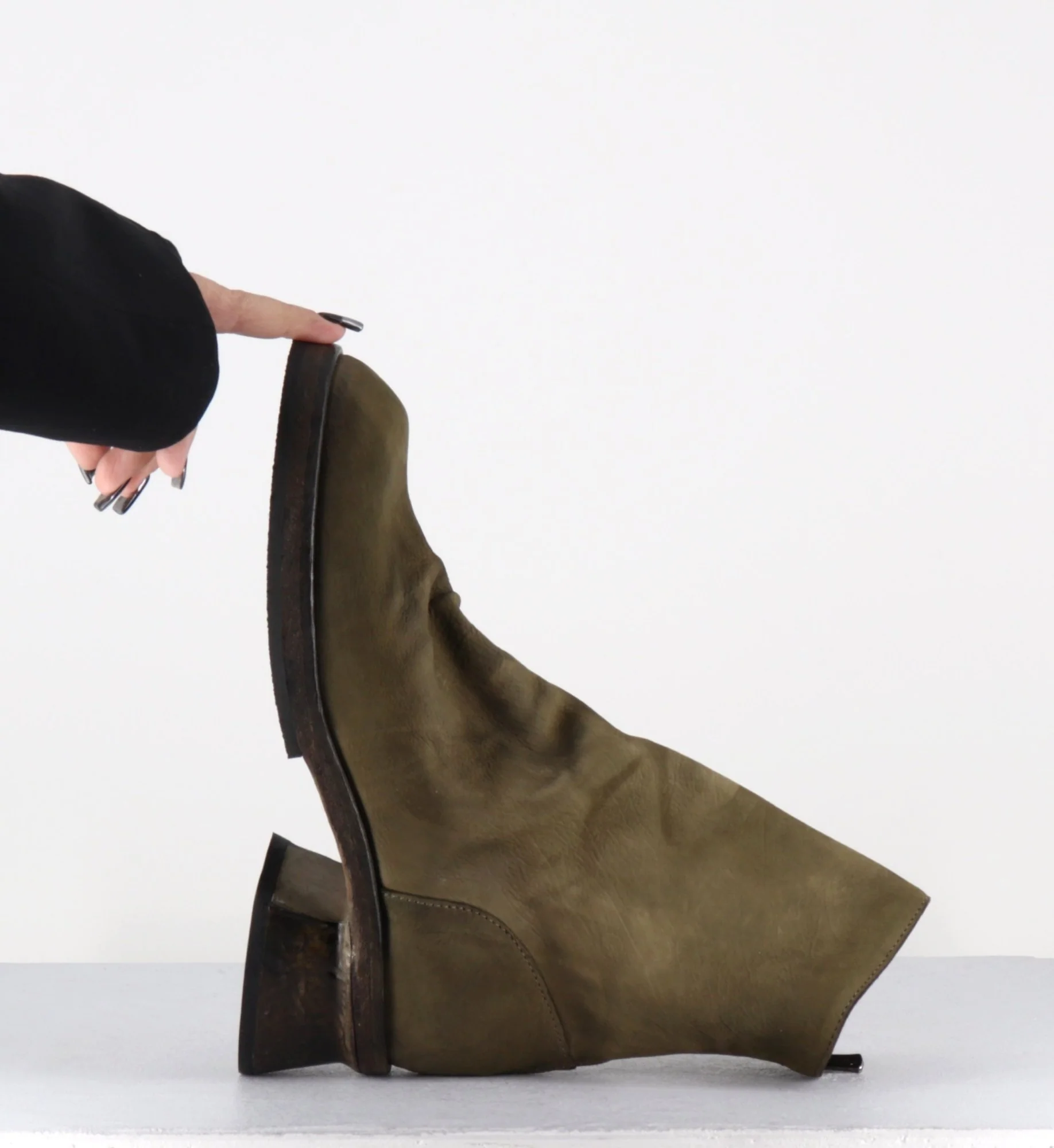 Boots en cuir gras lavé à la main pour un effet vintage, couleur vert kaki nuancé, zip arrière, montées sur une double semelle cousue intégral et un petit talon légèrement déstructuré | Dip-dyed & stone-washed process Fabrication Artisanale Italienne – Ateliers Shoto Chausse grand – Préférez une pointure en dessous Se présente dans la boite […]