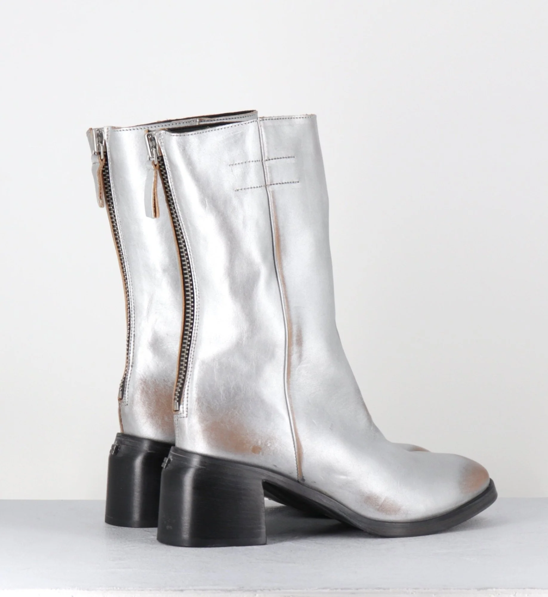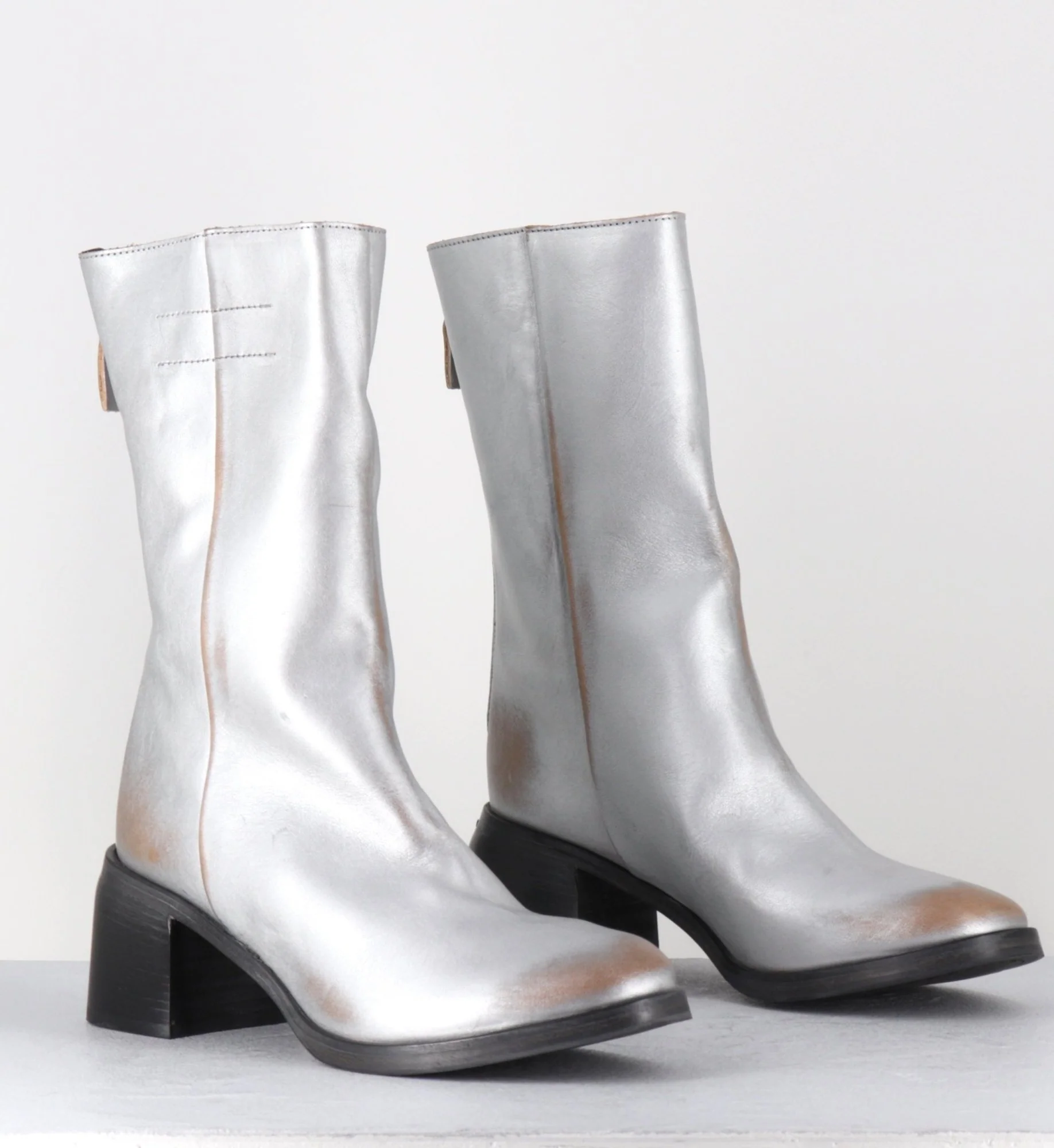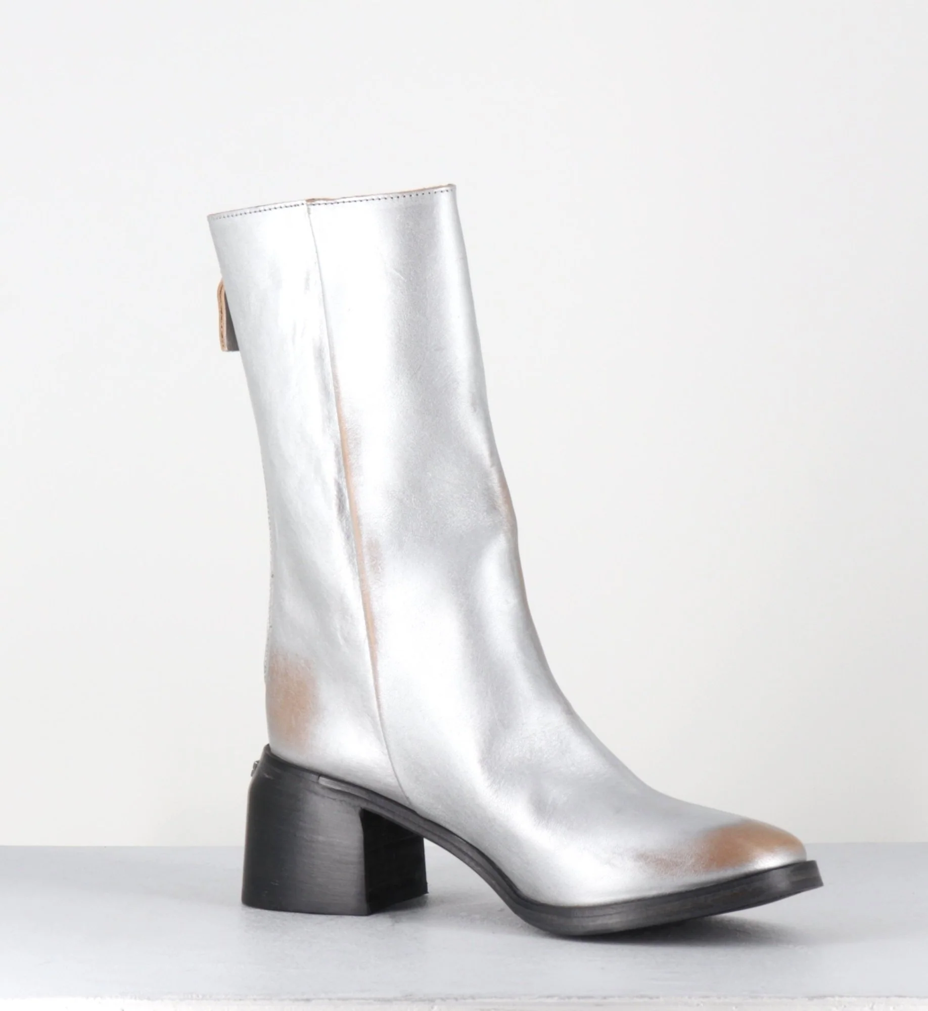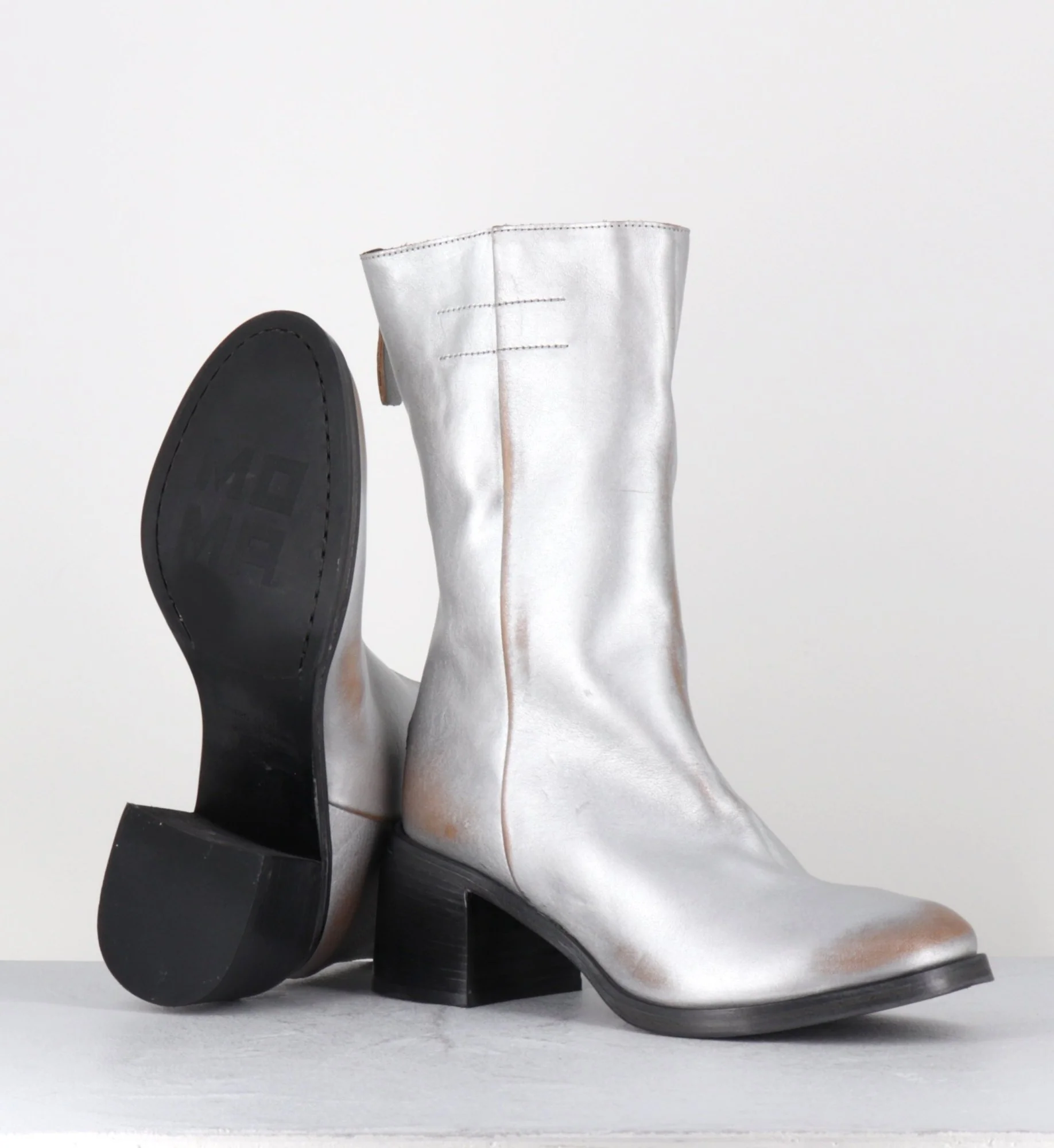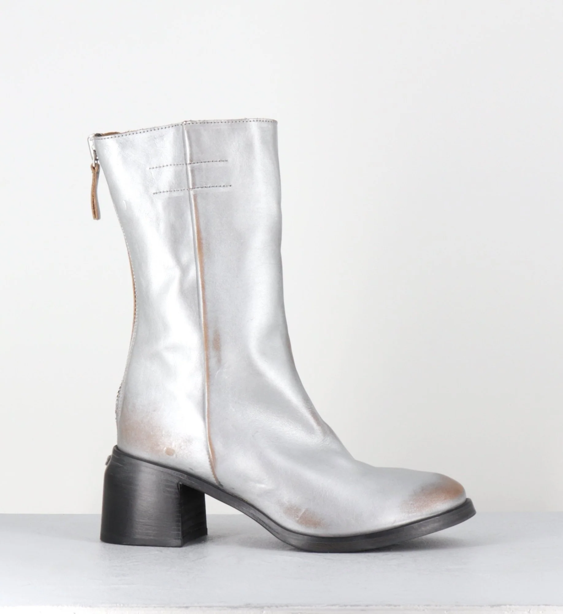 Boots en cuir métallisé argent brossé laissant apparaitre des nuances de marron, tige mi-haute avec zip arrière, montées sur un talon bloc confortable et une semelle cousue Fabrication Artisanale Italienne – Ateliers Moma Chausse grand