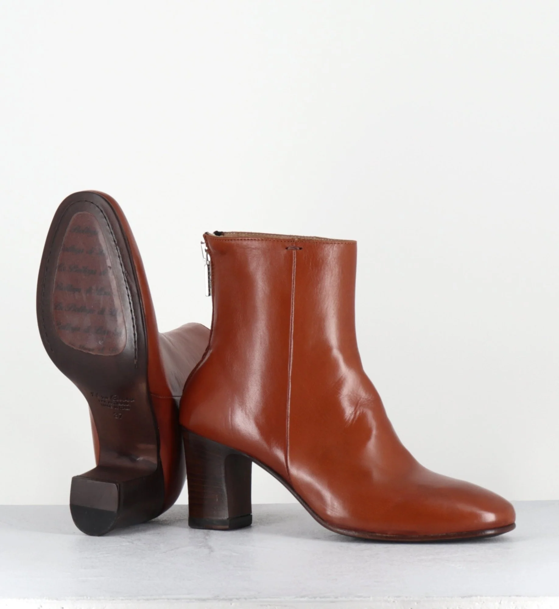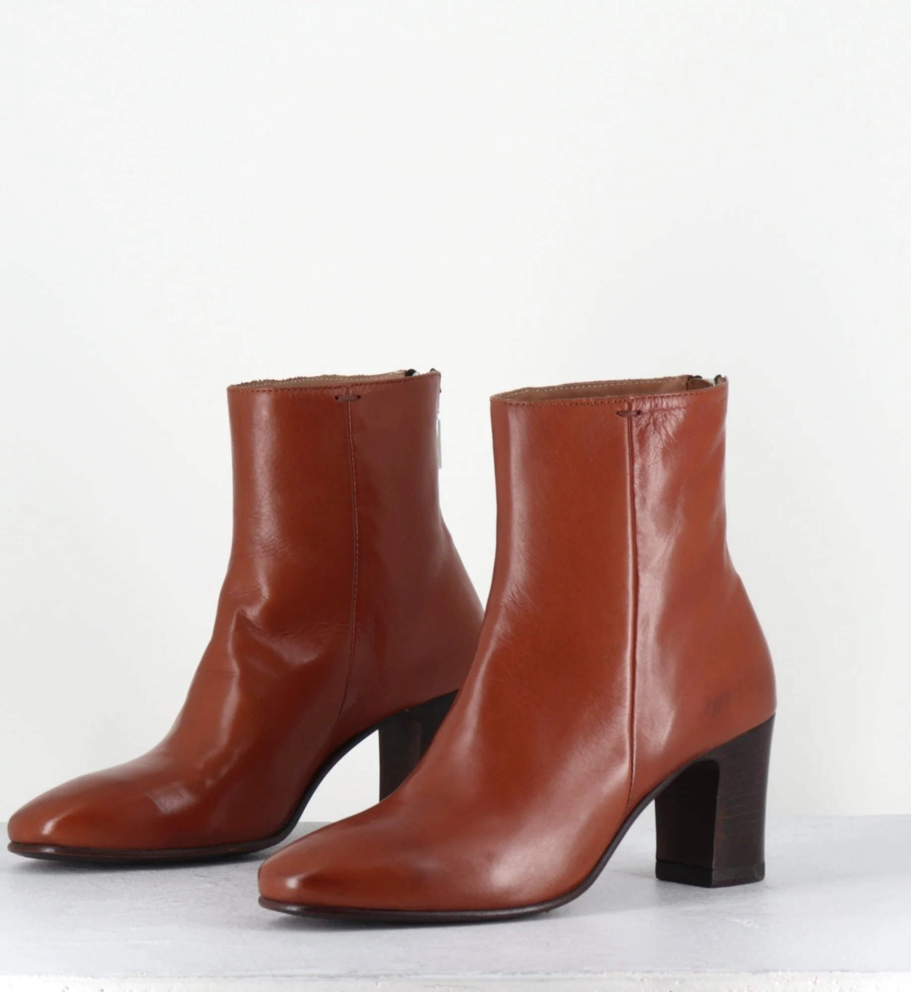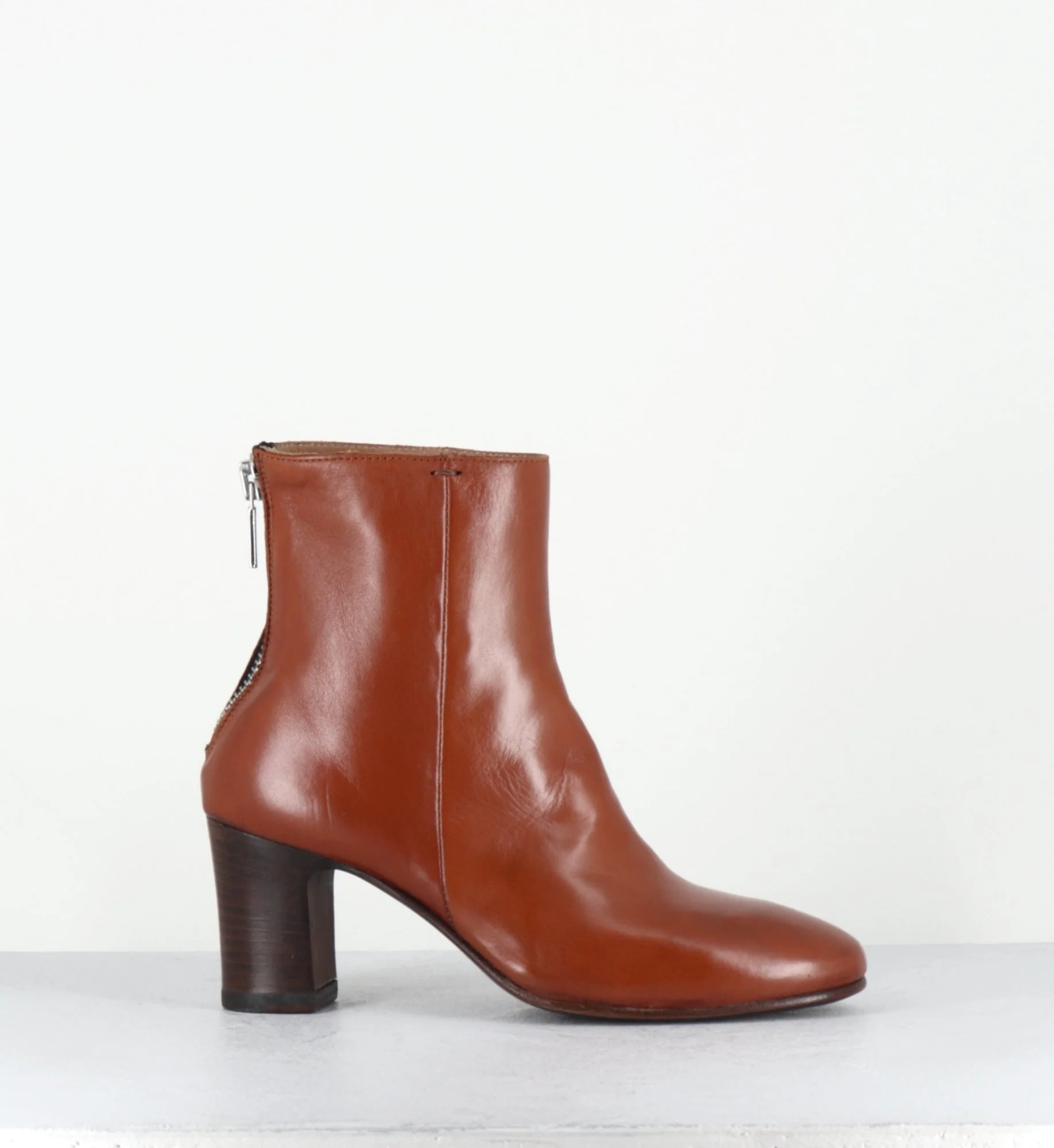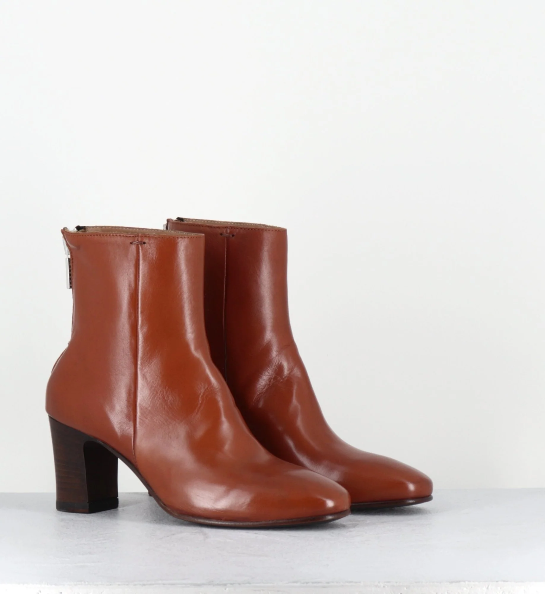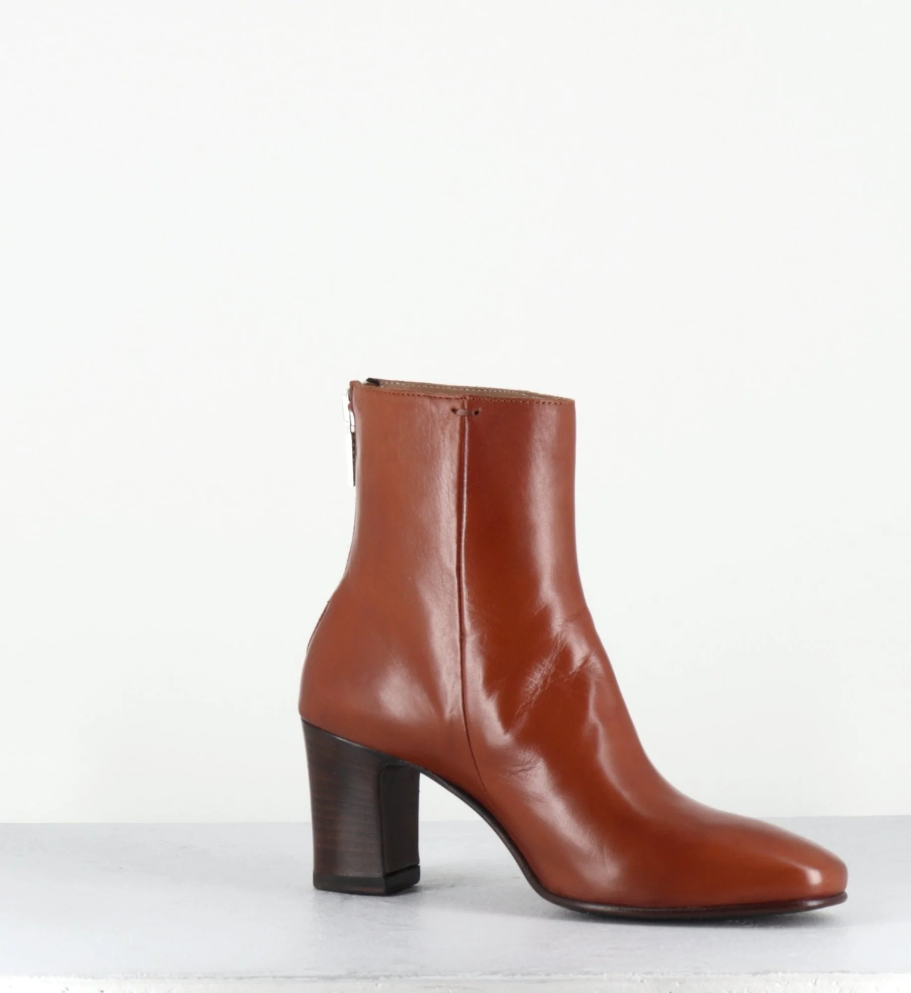 Boots en cuir souple camel, bout arrondi, zip extérieur, montées sur un talon droit. confortable