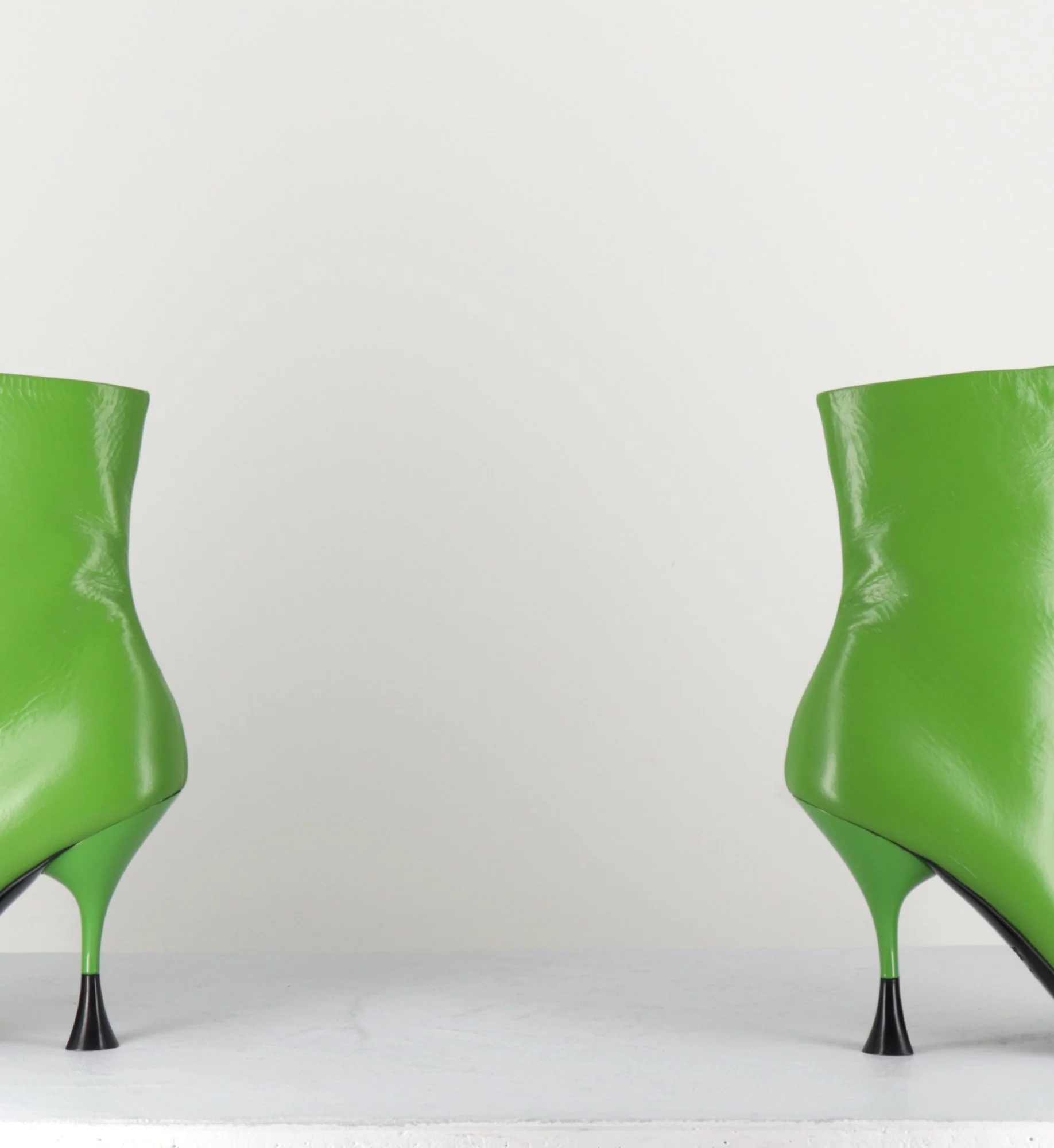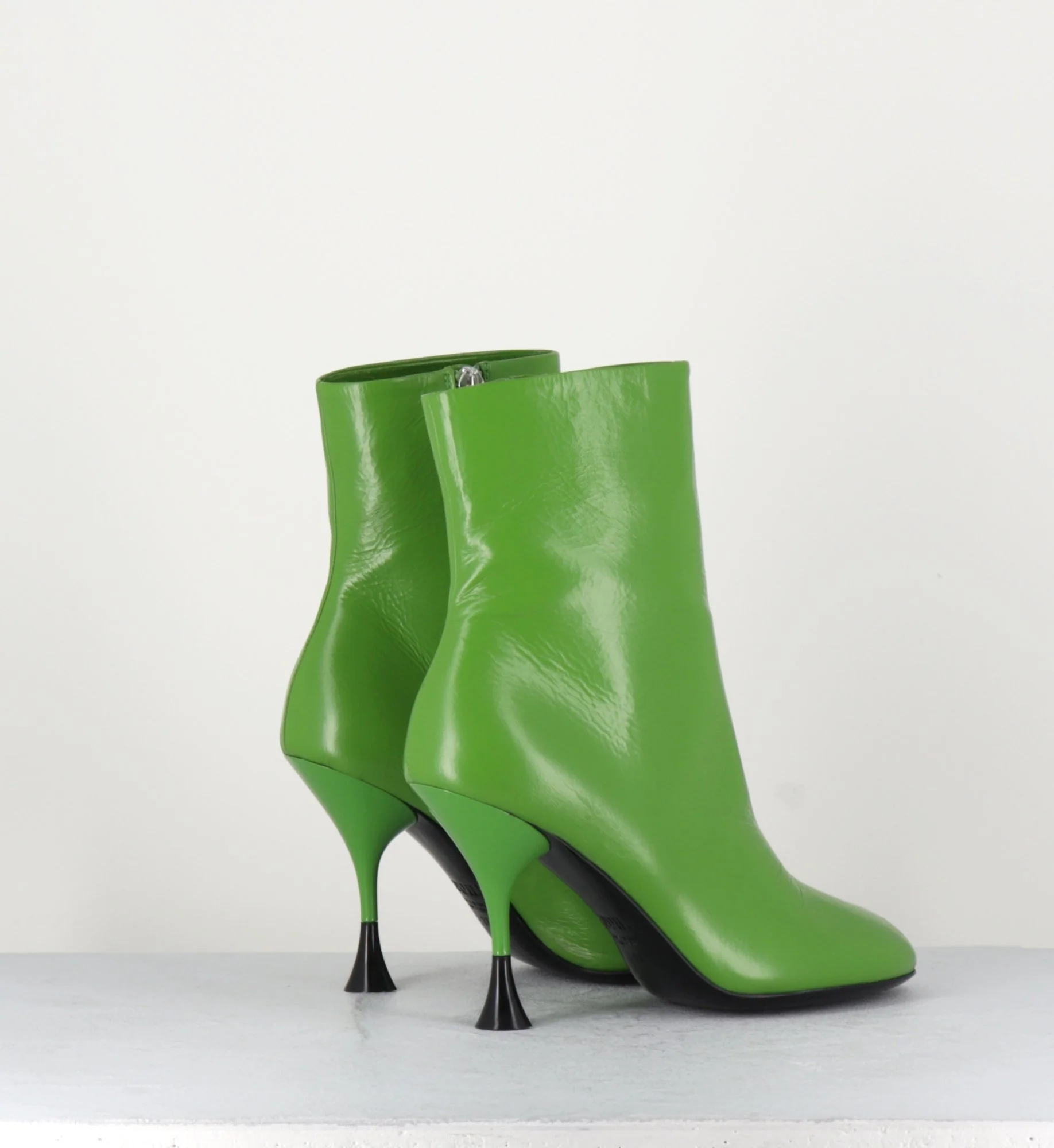 Boots ligne minimaliste en cuir vert, bout rond, zip intérieur, montées sur un talon haut fin avec détail noir.