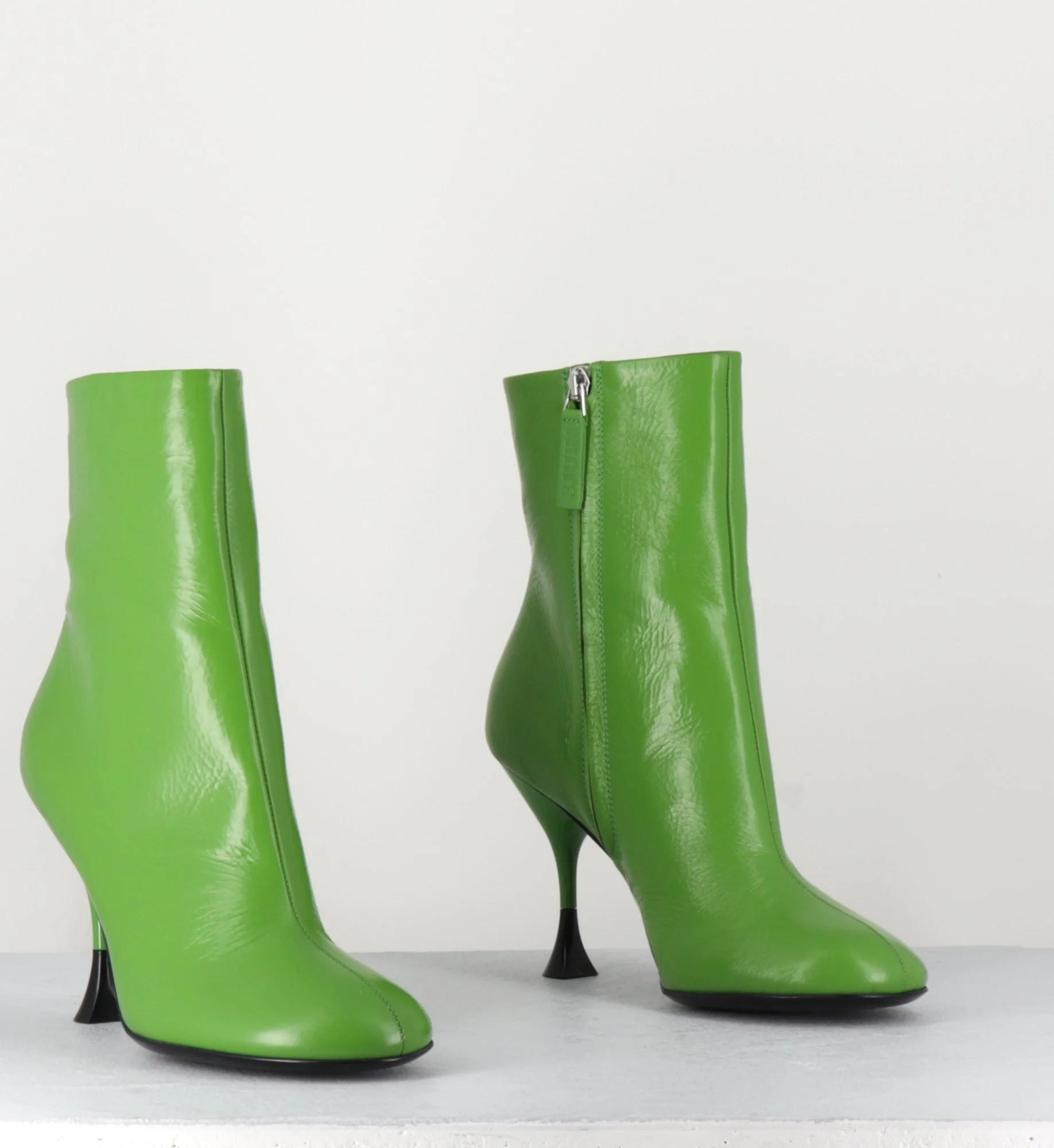 Boots ligne minimaliste en cuir vert, bout rond, zip intérieur, montées sur un talon haut fin avec détail noir. Fabrication Artisanale Italienne – Ateliers 3JUIN Chausse légèrement grand