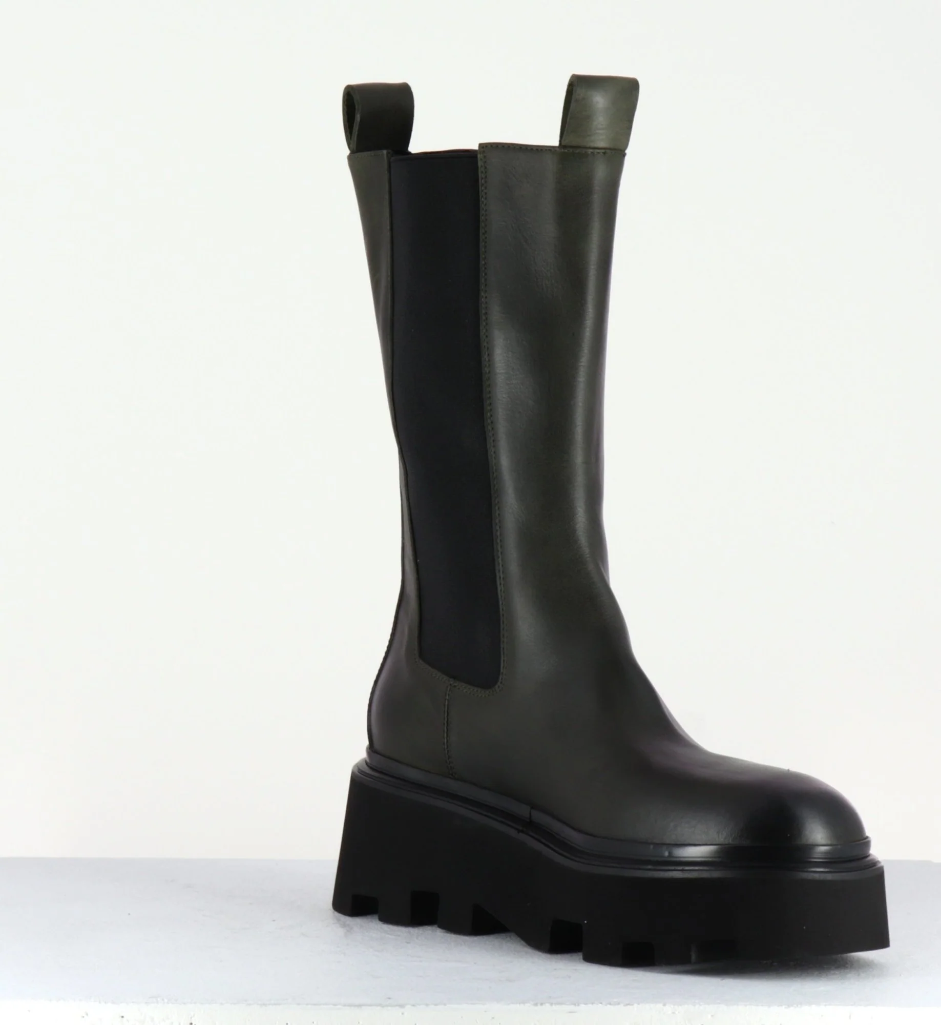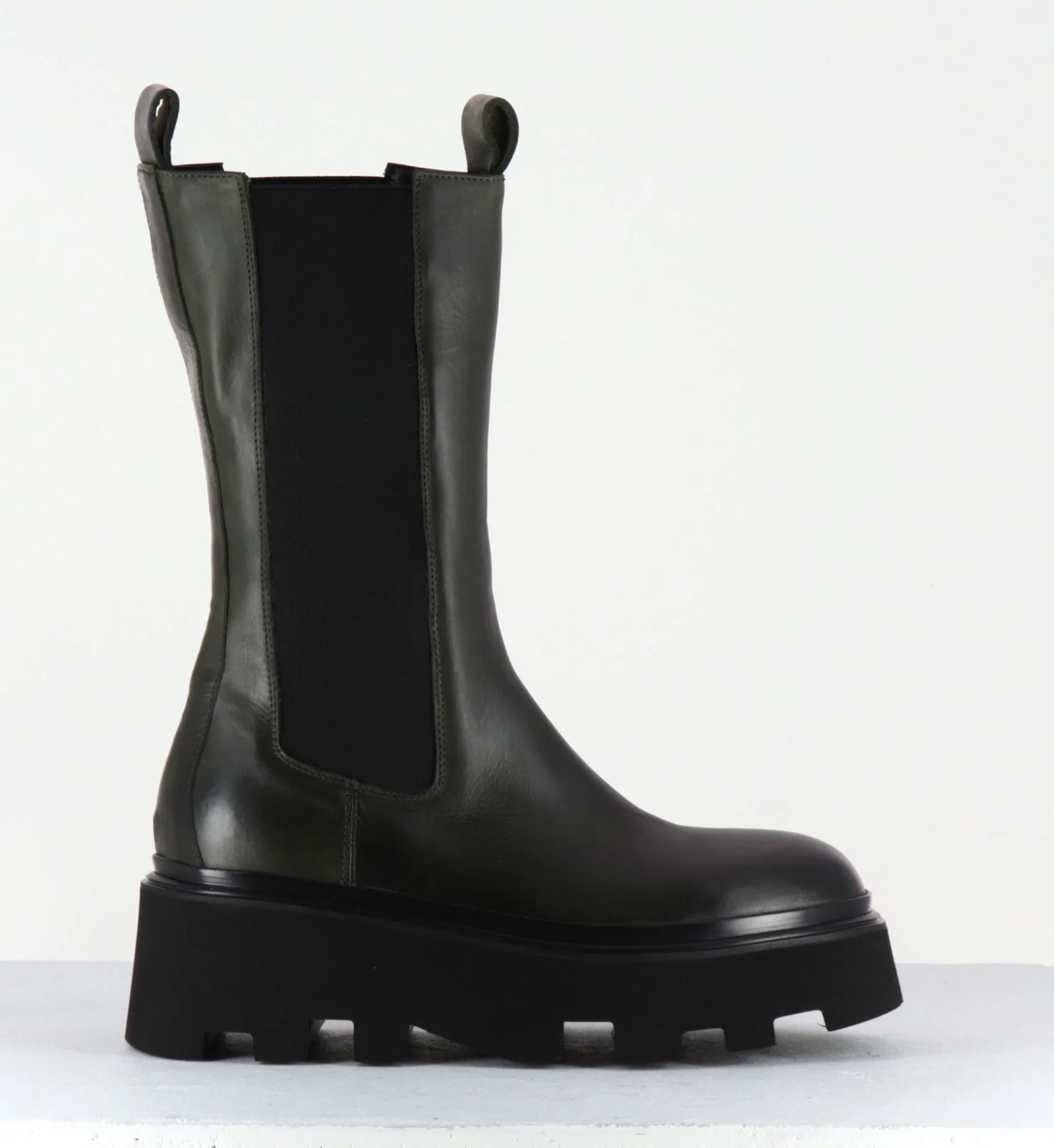 Boots en cuir vert kaki à élastique chelsea tige mi-hauteE2721K Elena Iachi Boots en cuir vert kaki brossé au noir, à élastique chelsea tige mi-haute, montées sur une semelle épaisse ultra-légère. Chausse légèrement grand