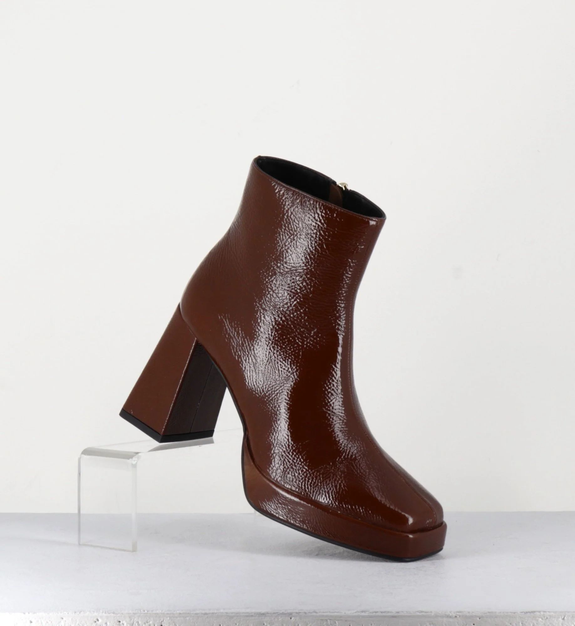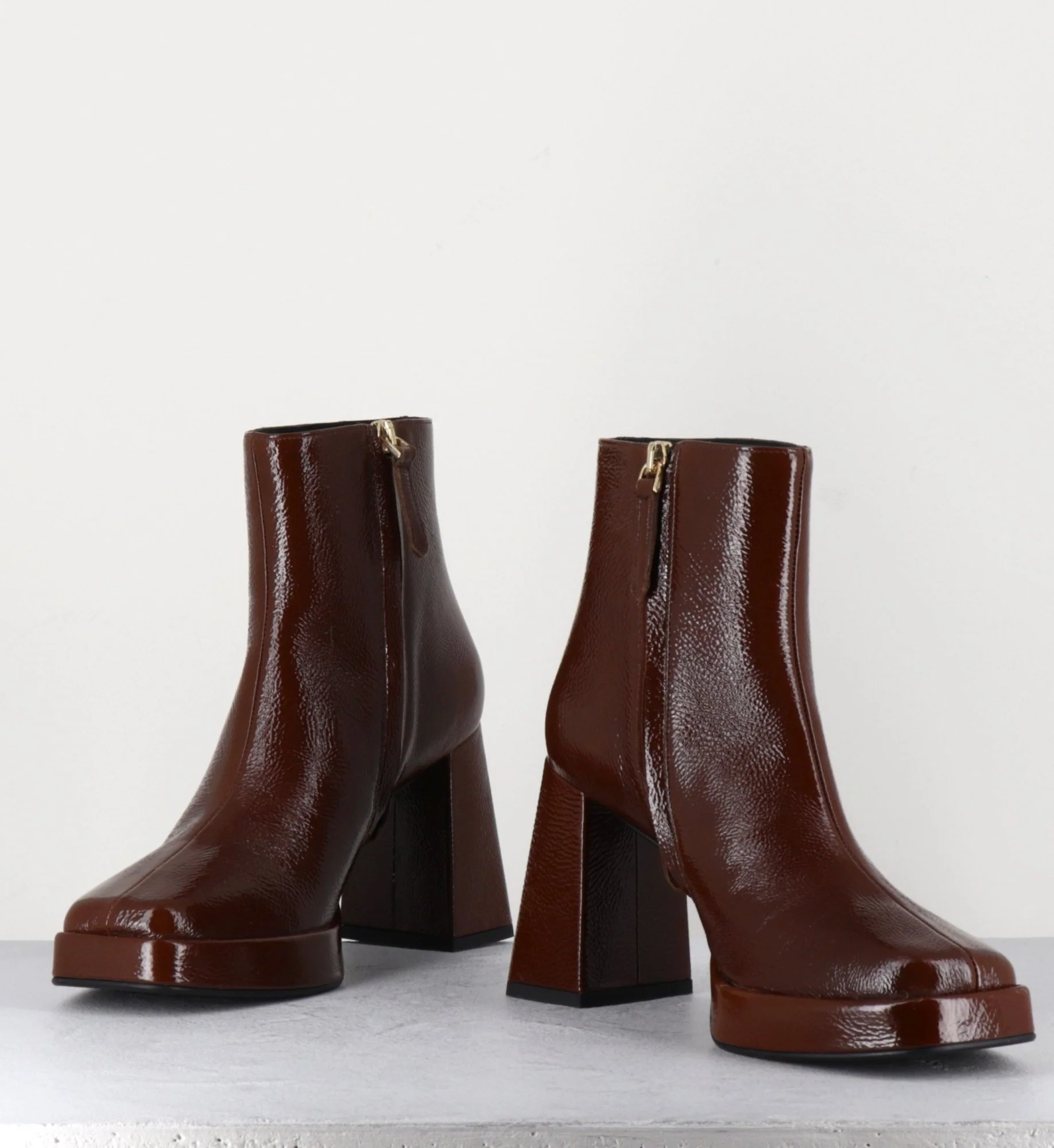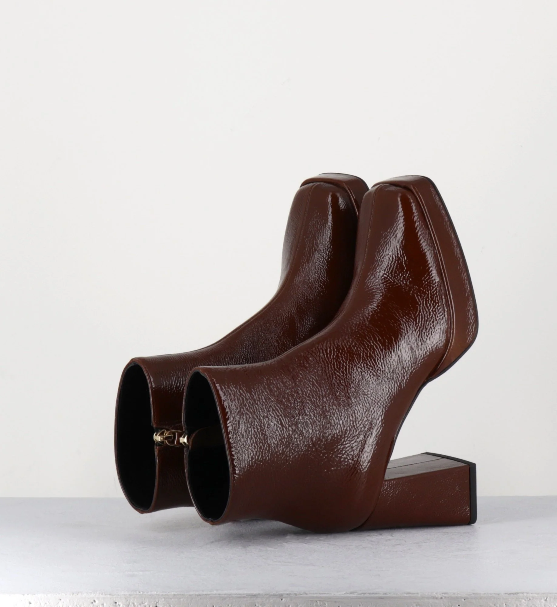 Boots en cuir naplak marron, tige courte, bout carré, montées sur un talon haut légèrement évasé et une fine plateforme esprit 70s Fabrication Artisanale Italienne – Ateliers GarriceLab