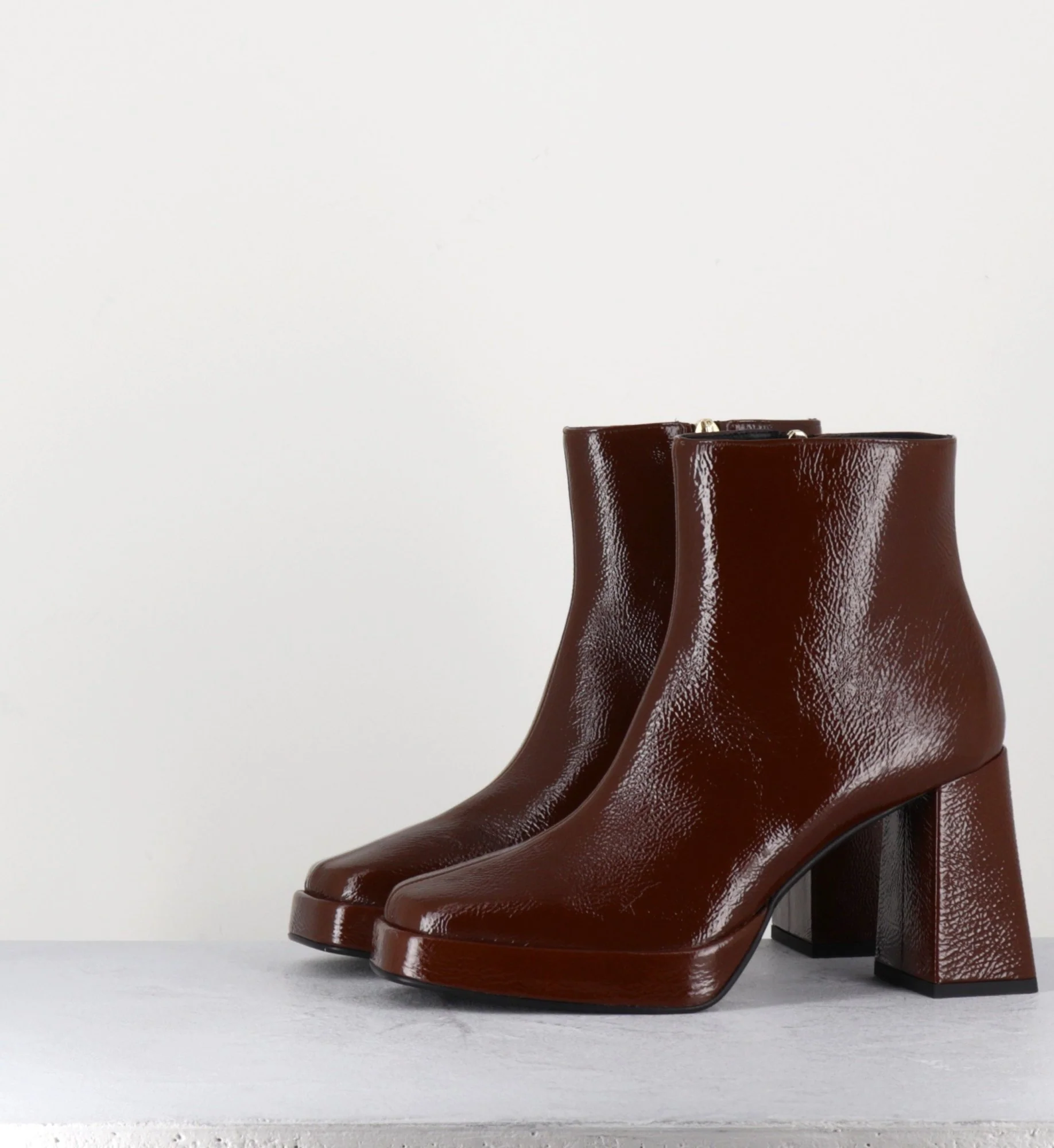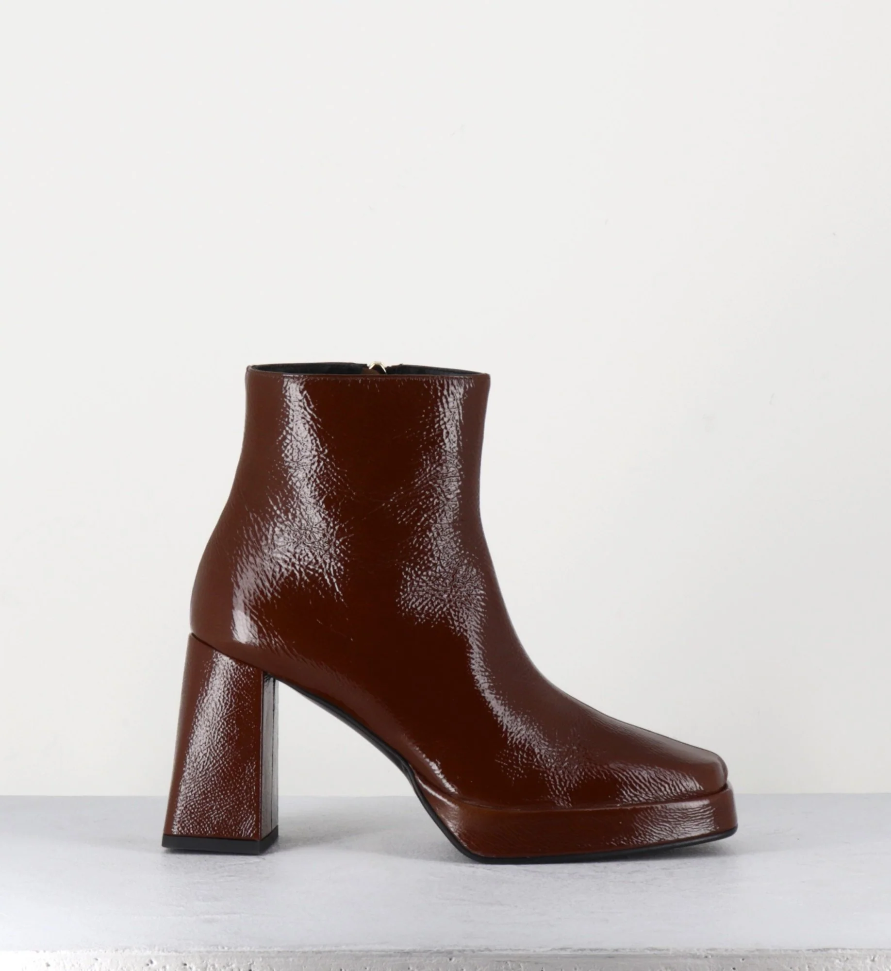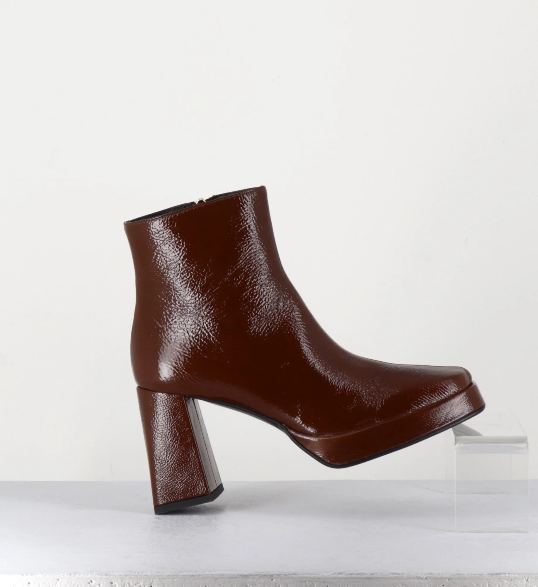 Boots en cuir naplak marron, tige courte, bout carré, montées sur un talon haut légèrement évasé et une fine plateforme esprit 70s Fabrication Artisanale Italienne – Ateliers GarriceLab