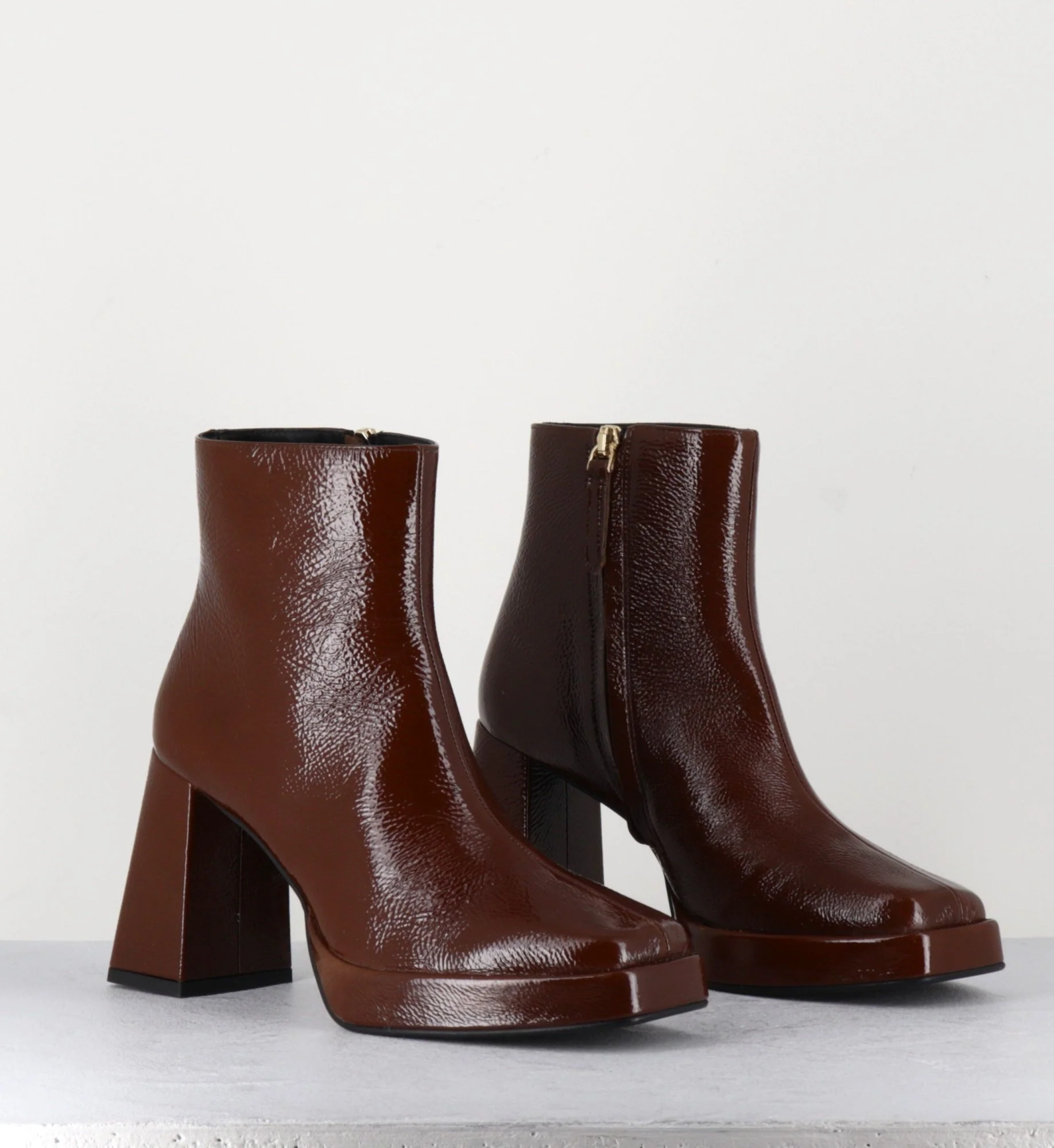 Boots en cuir naplak marron, tige courte, bout carré, montées sur un talon haut légèrement évasé et une fine plateforme esprit 70s