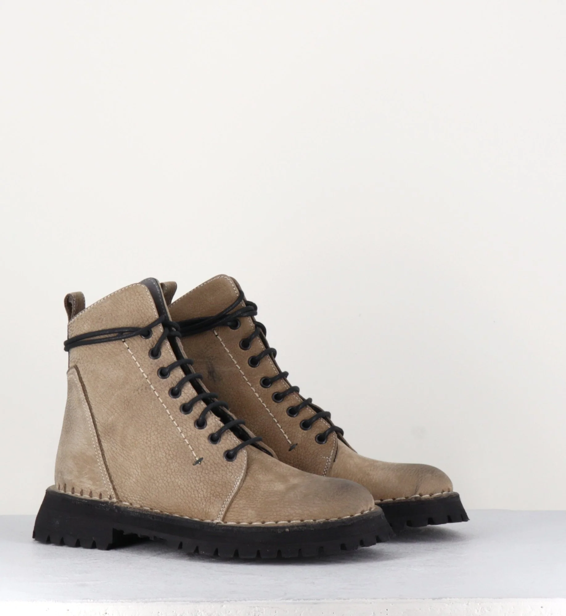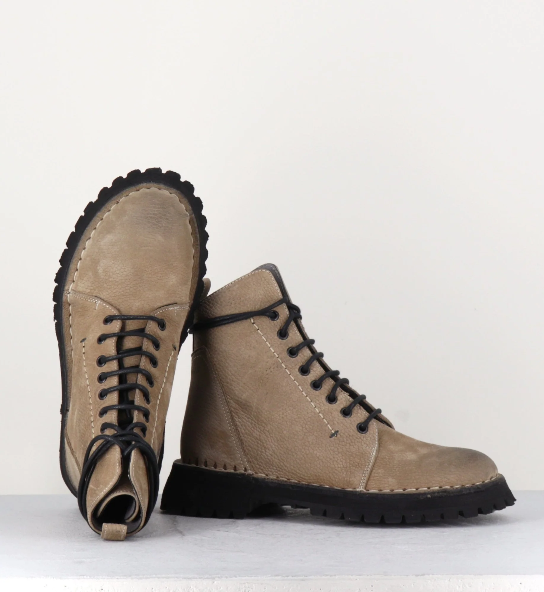 Boots à lacents en cuir nubuck patiné couleur taupe, montées sur une semelle microfibre légère Fabrication Artisanale Italienne Chausse légèrement grand