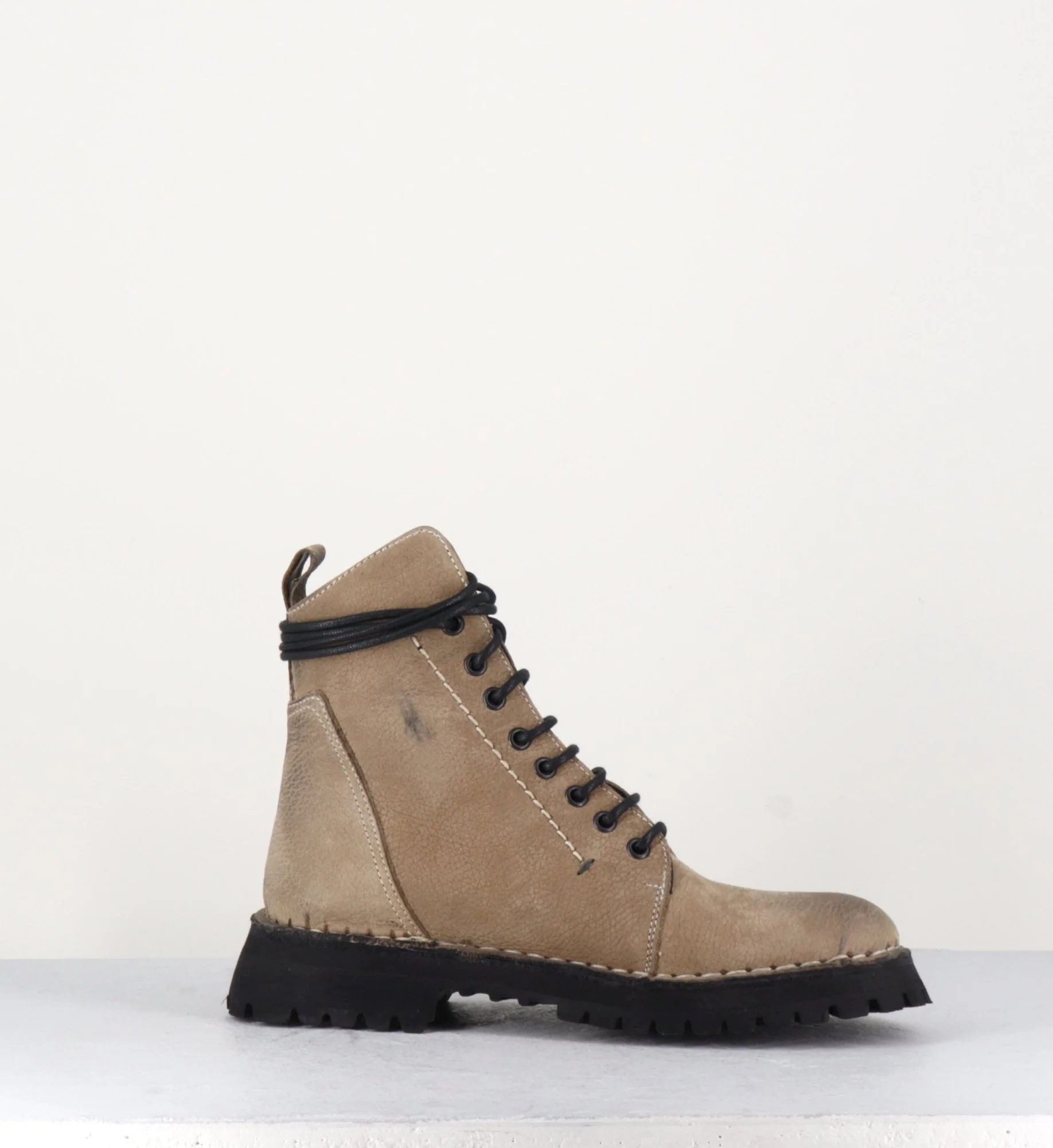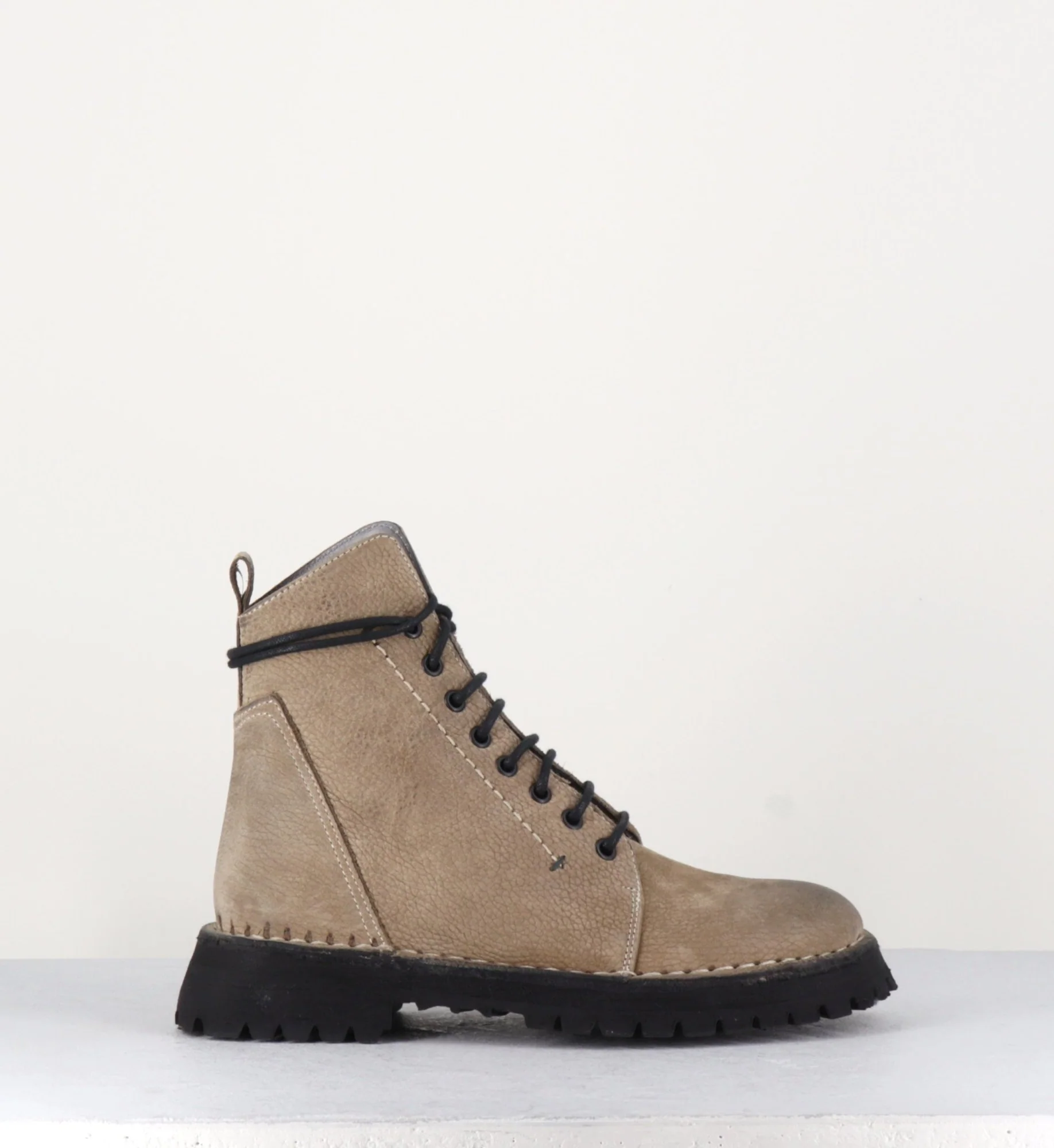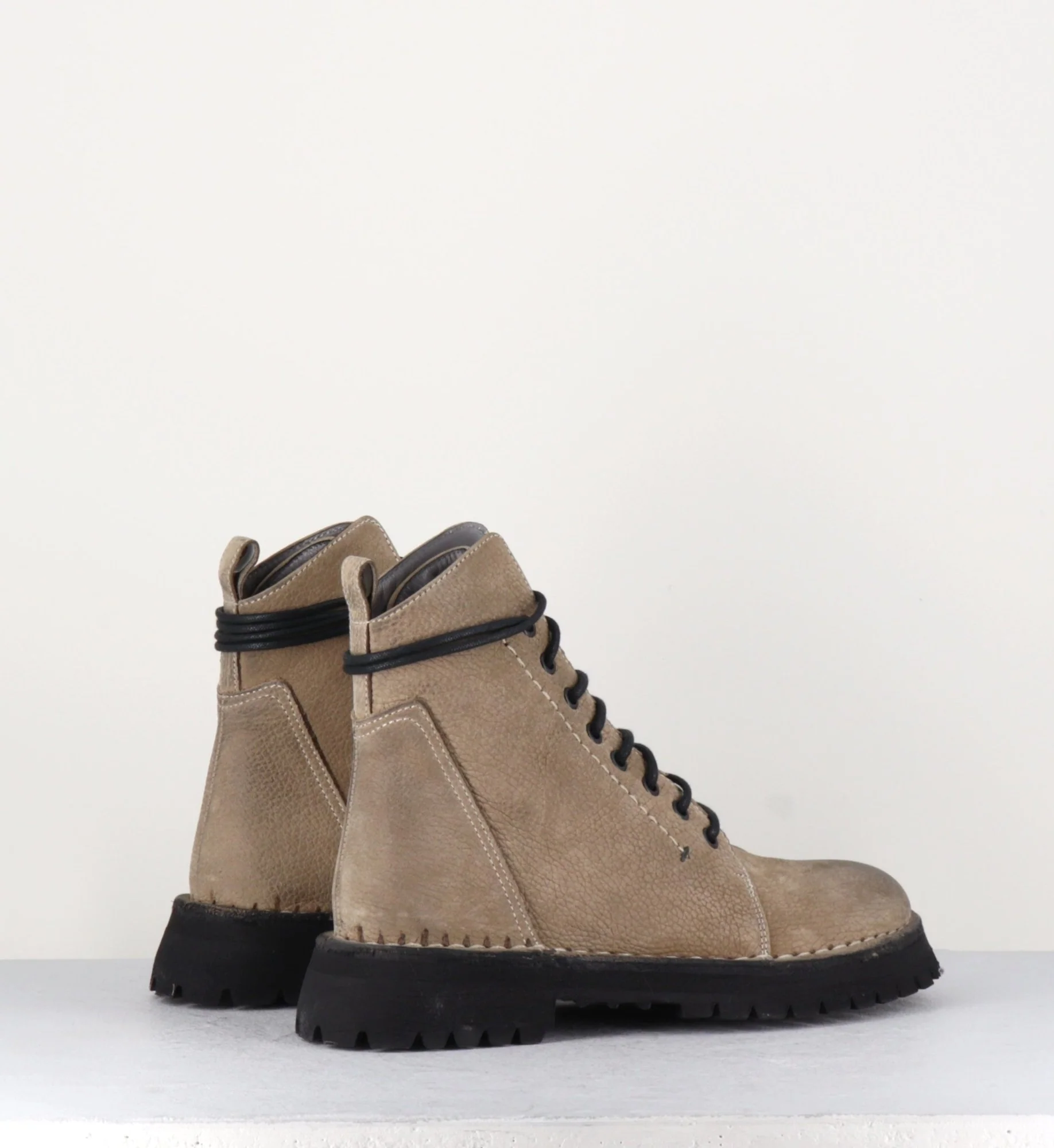 Boots à lacents en cuir nubuck patiné couleur taupe, montées sur une semelle microfibre légère