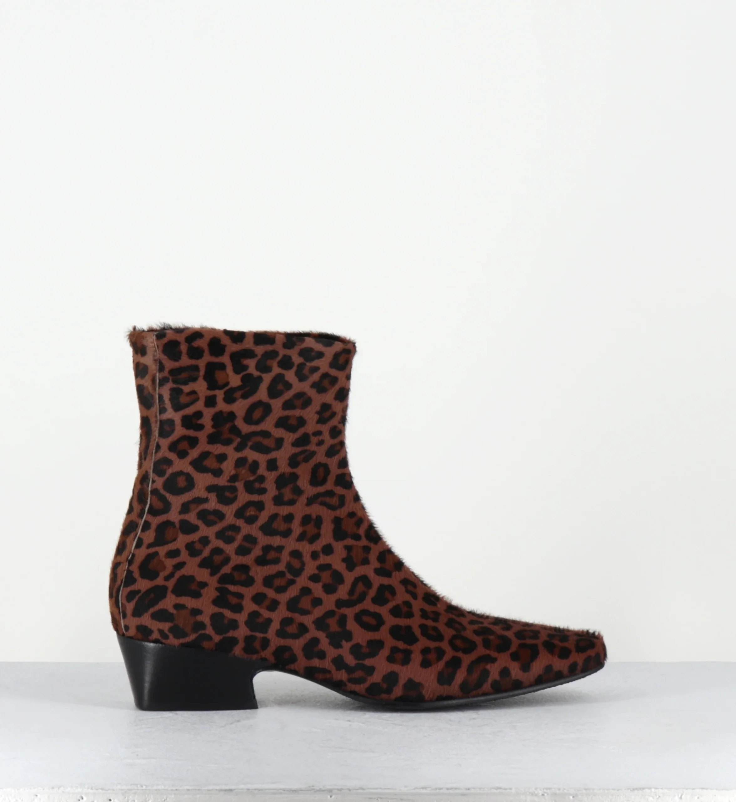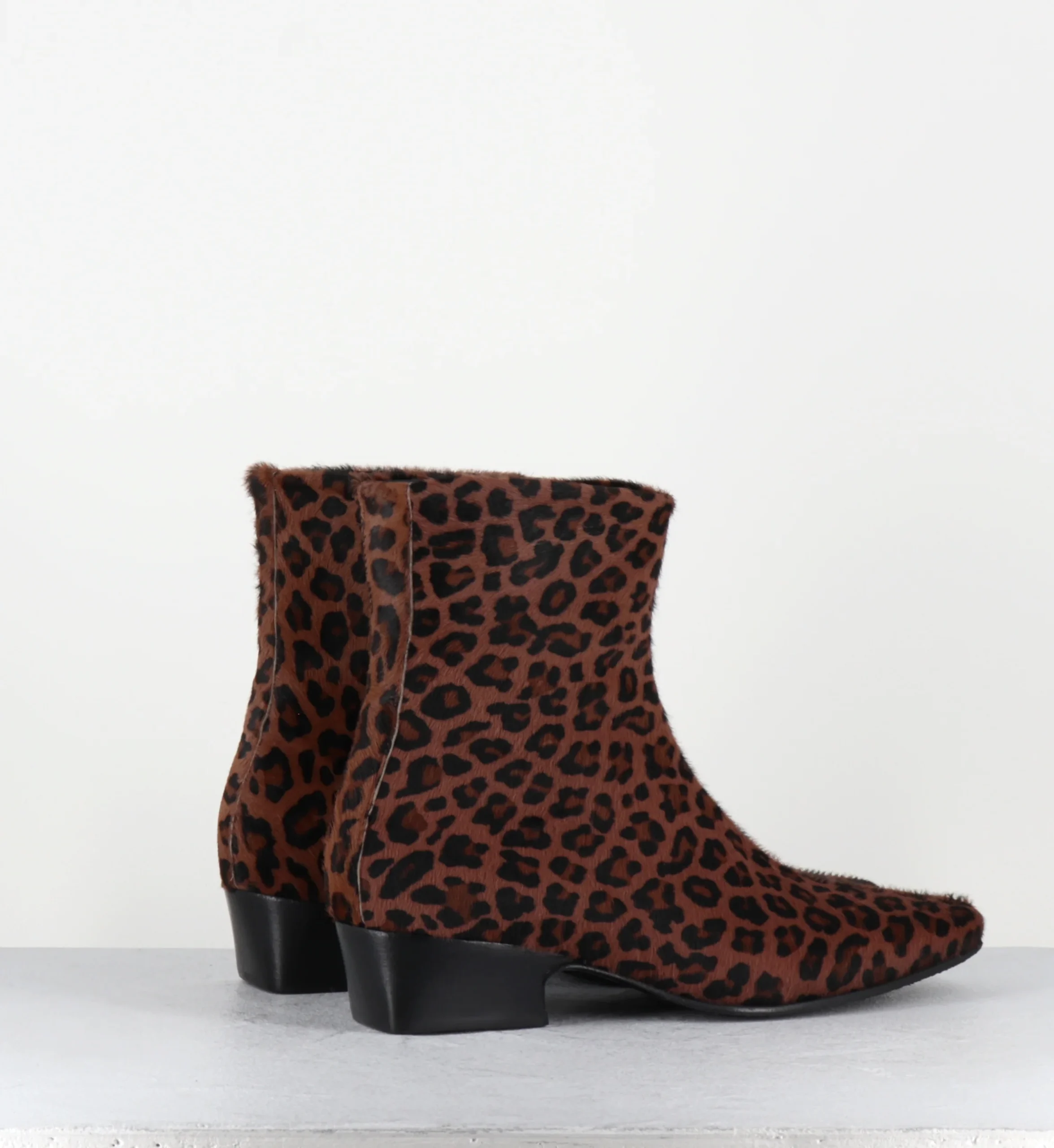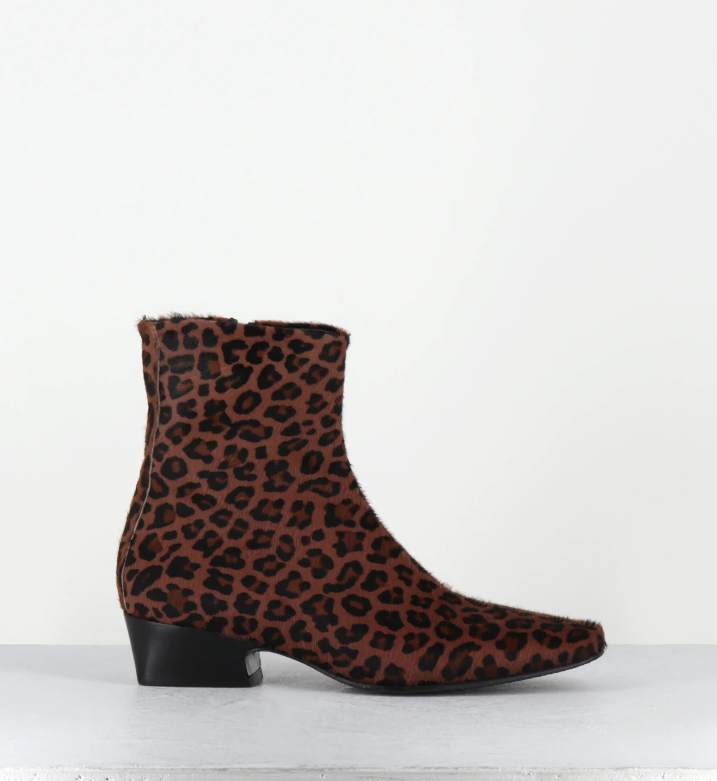 Boots en « poulain » imprimé léopard, ligne effilée à pointe carrée, montées sur un petit talon structuré très légèrement biseauté