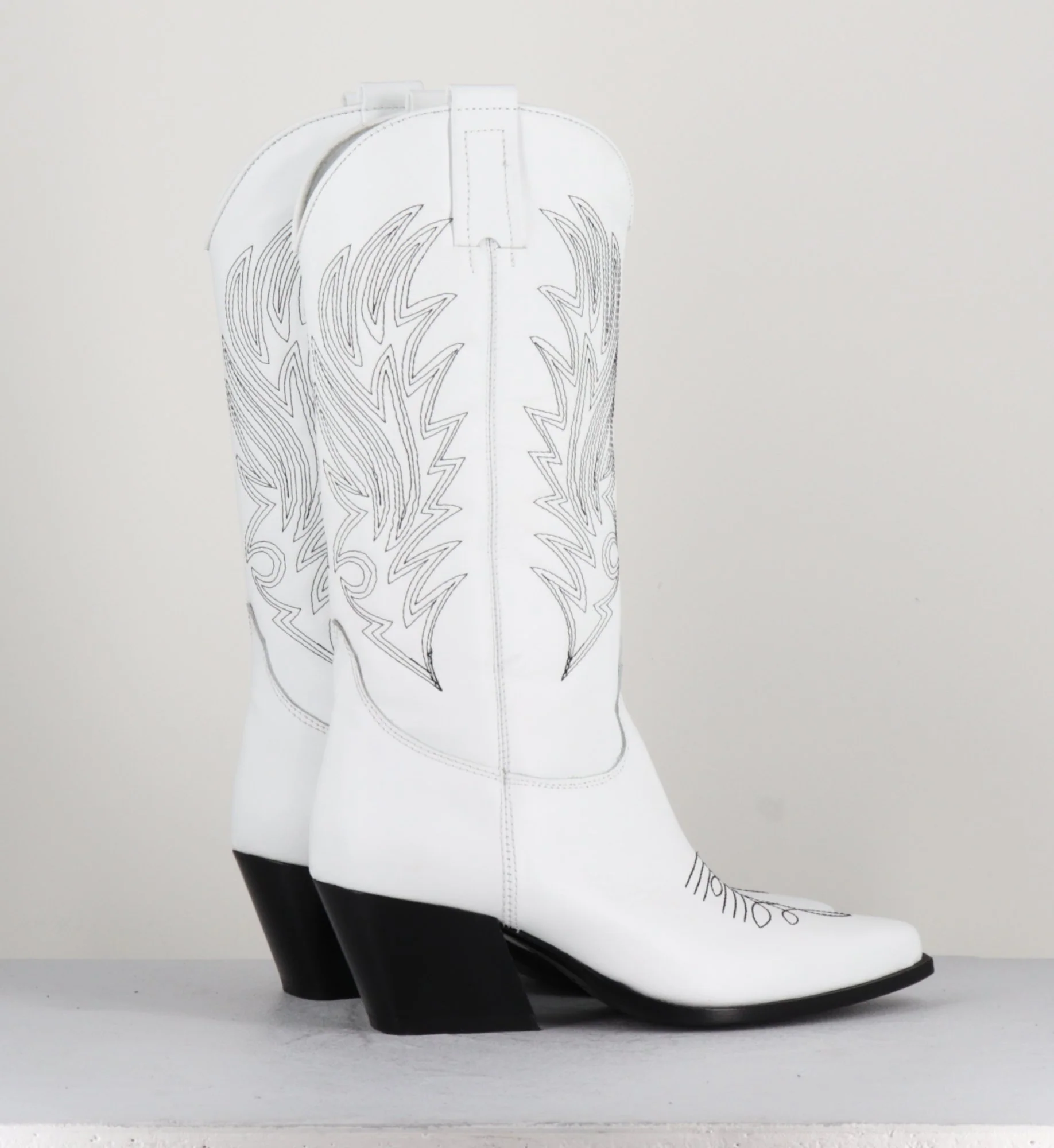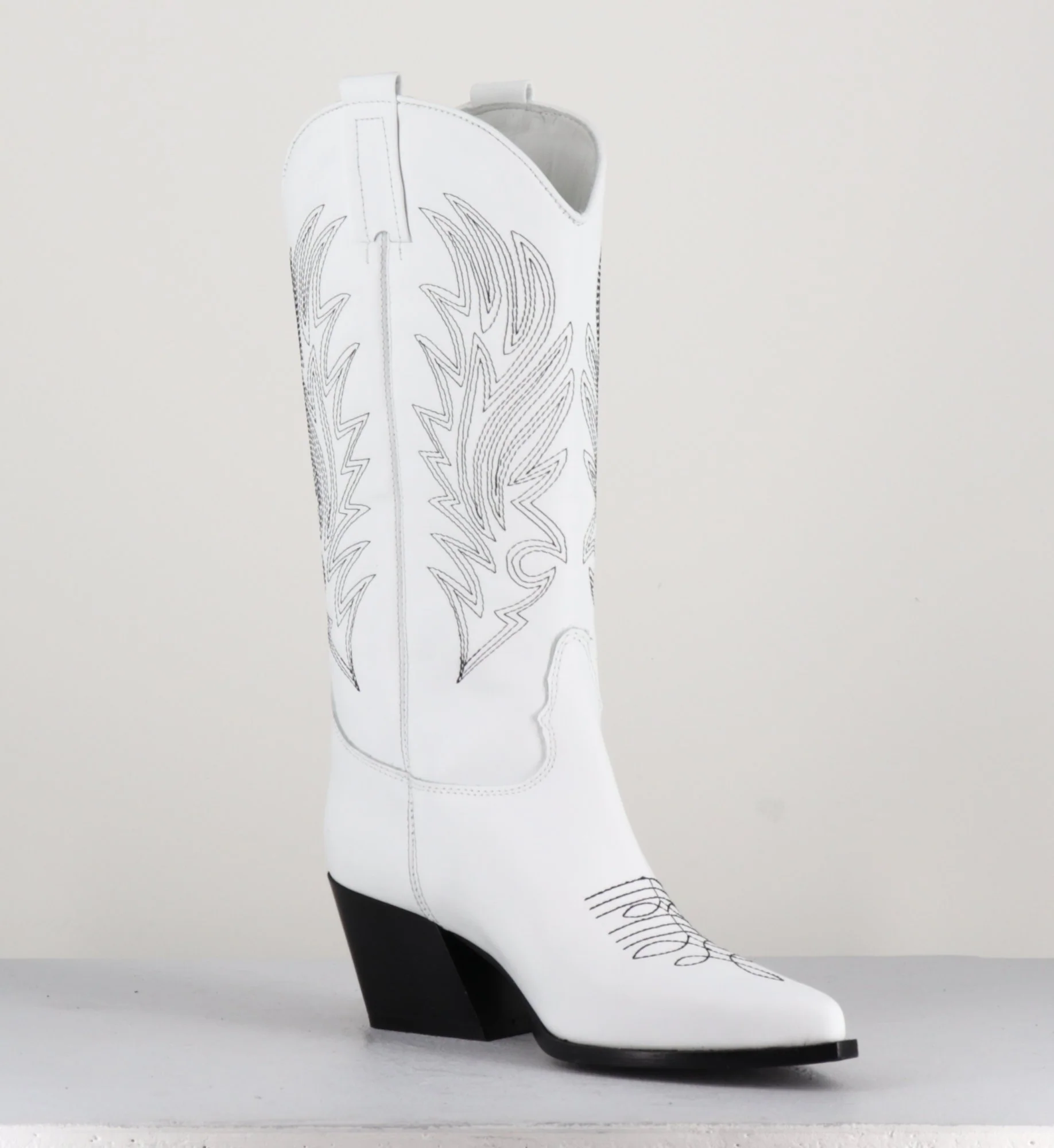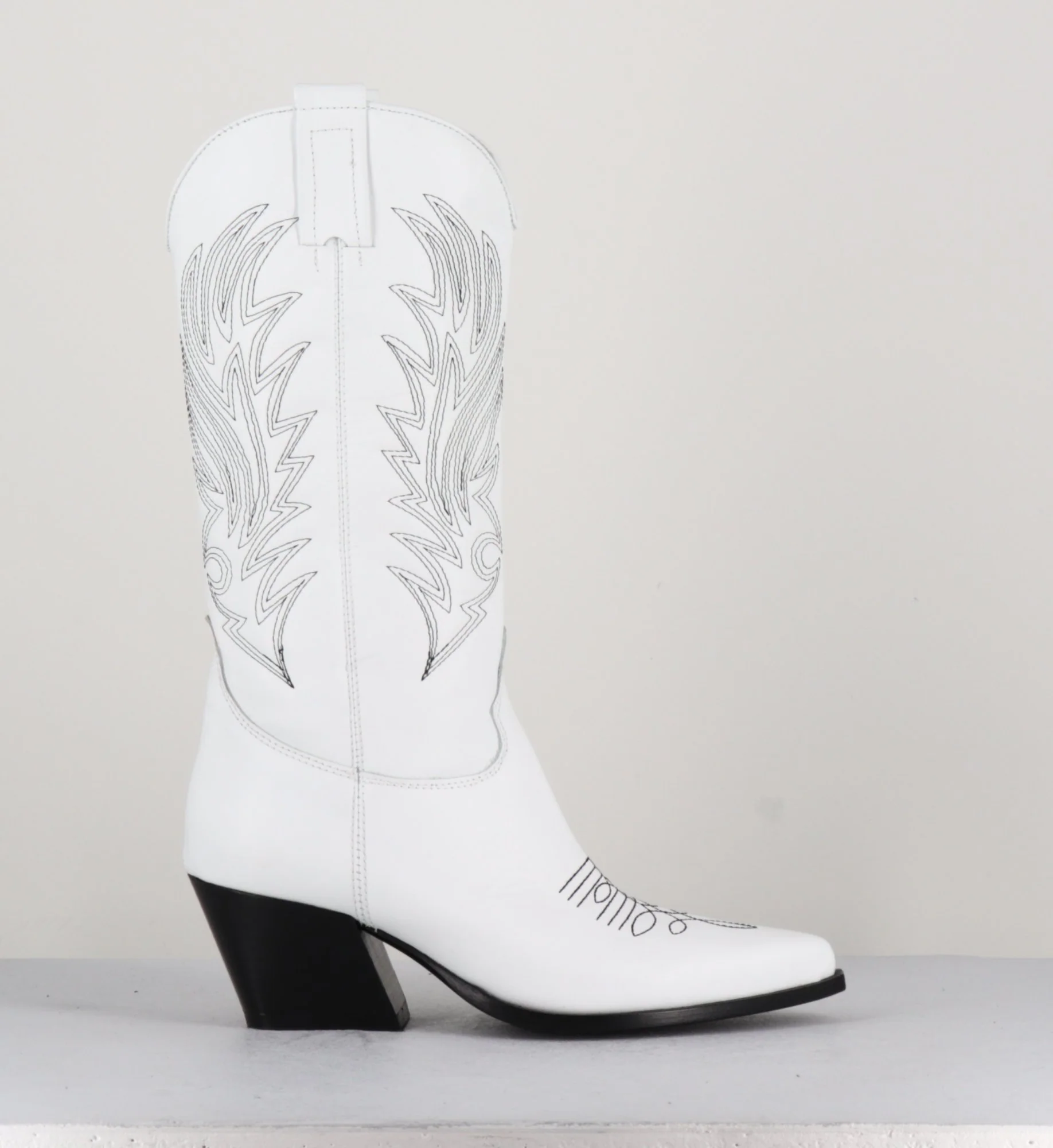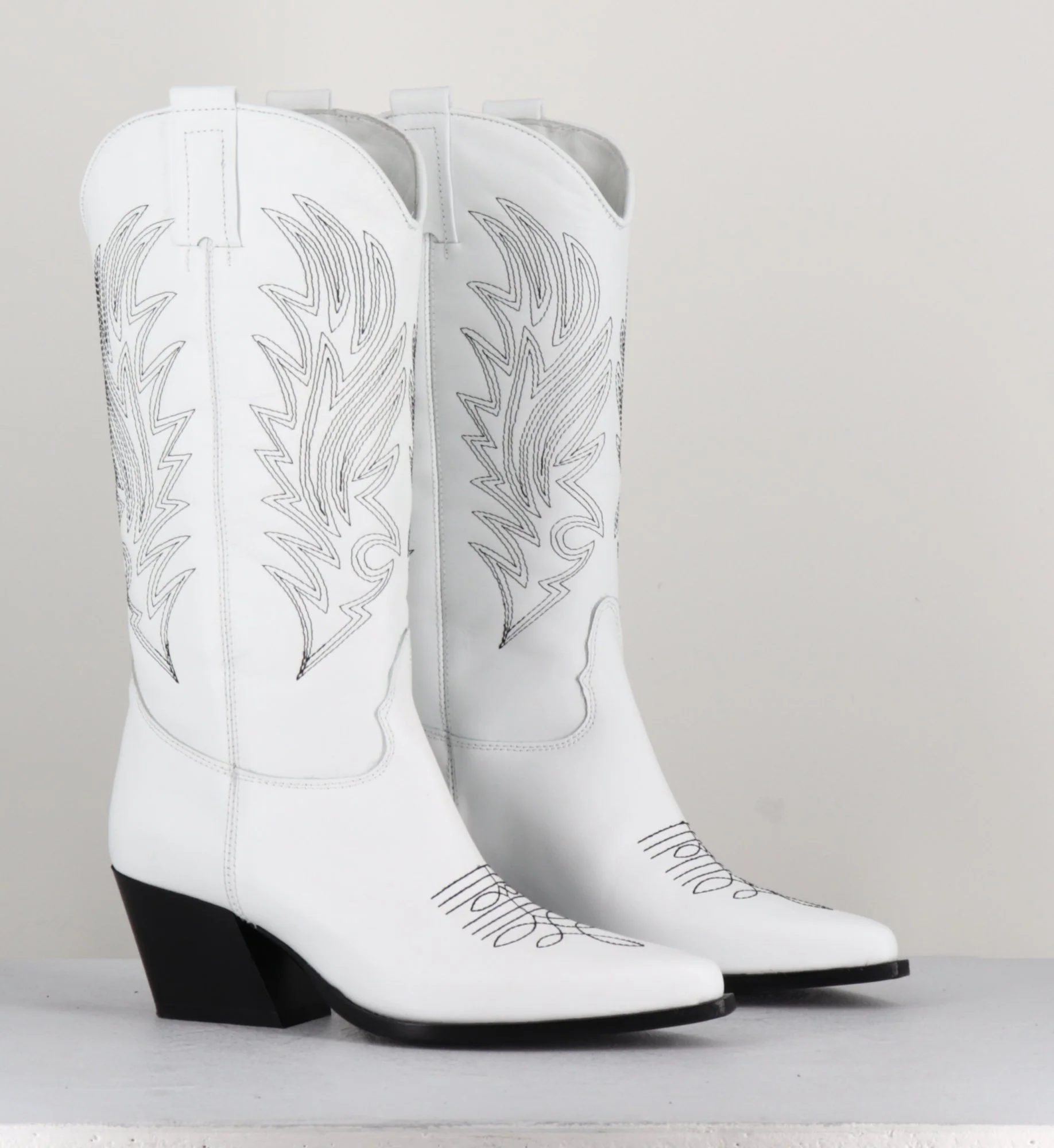 Boots santiags tige haute en cuir blanc souple avec broderies traditionnelles noires, bout effilé et talon biseauté en cuir.