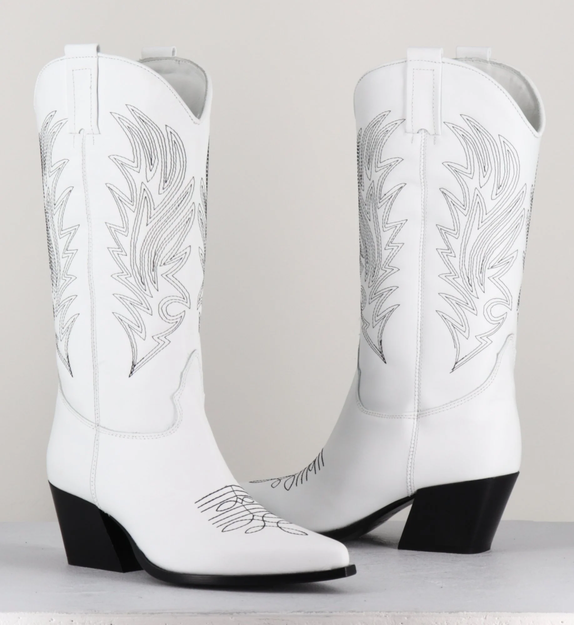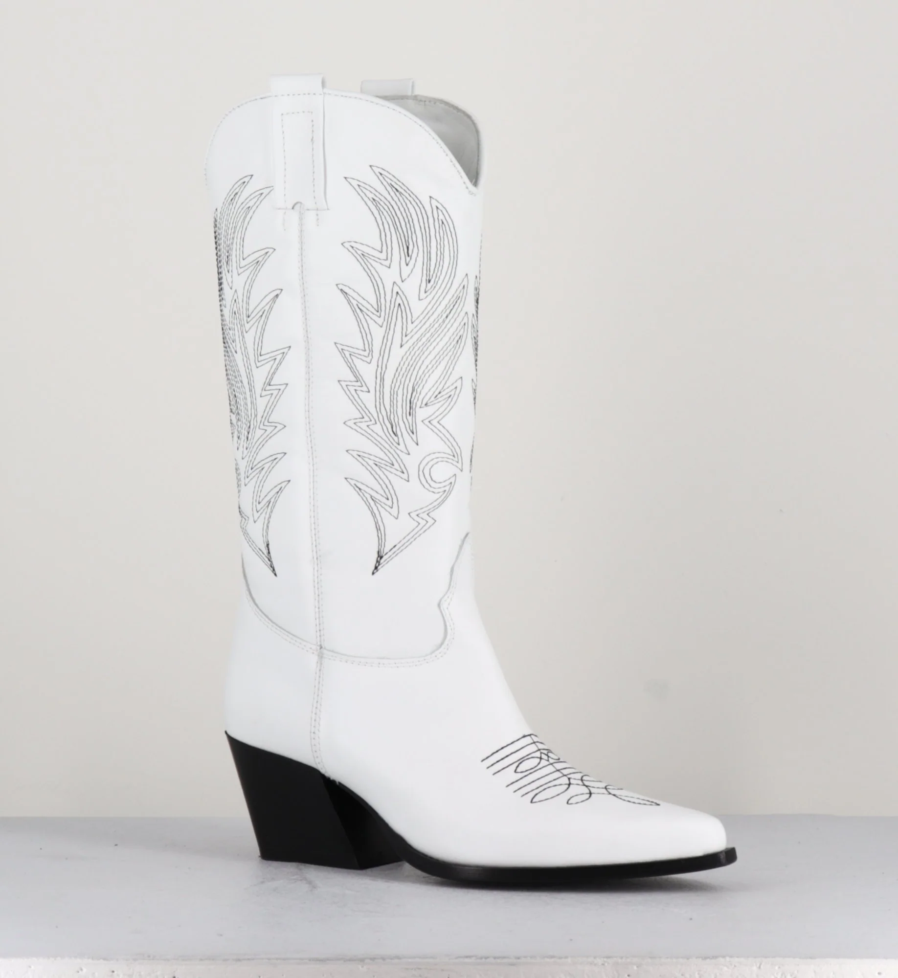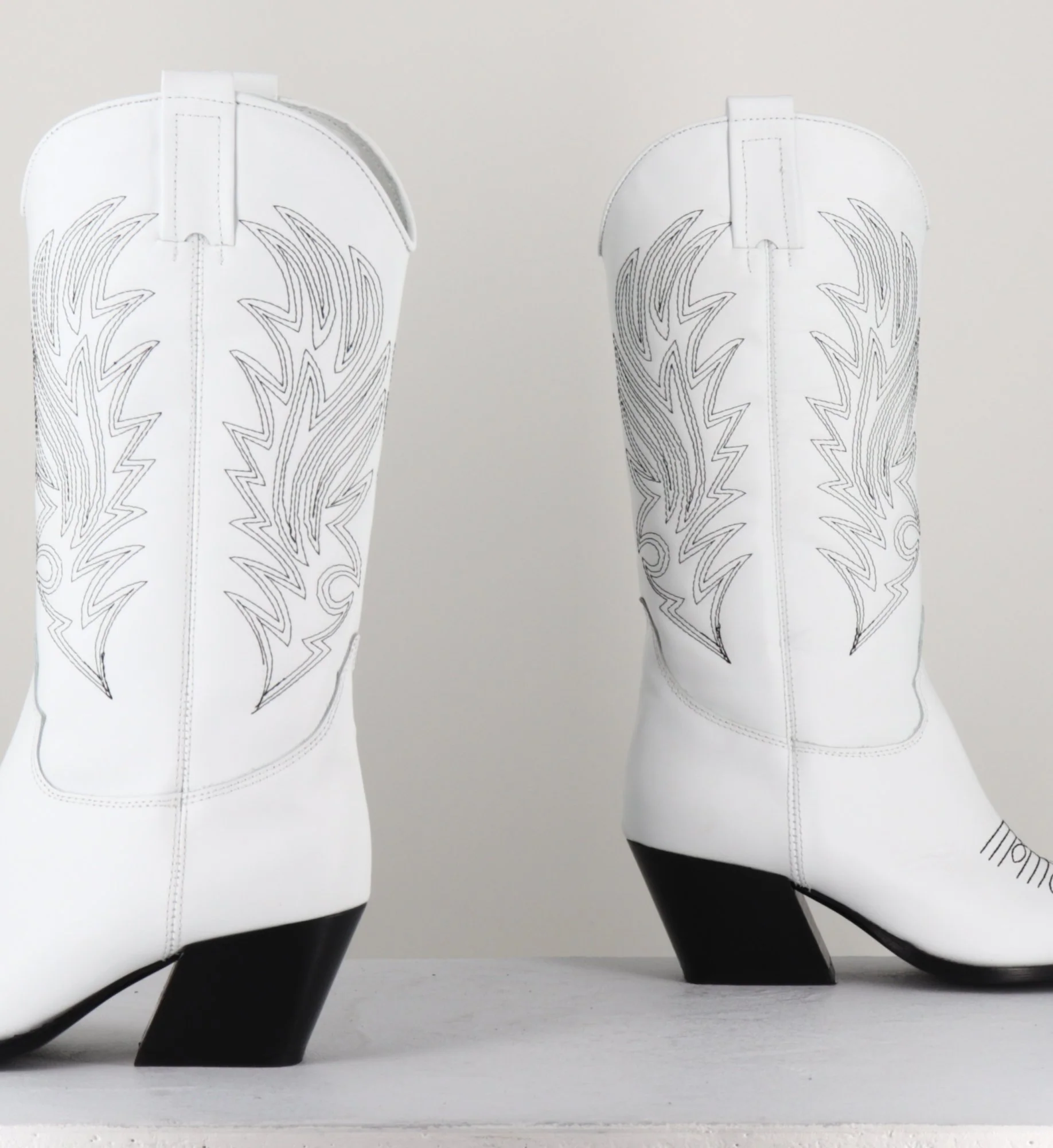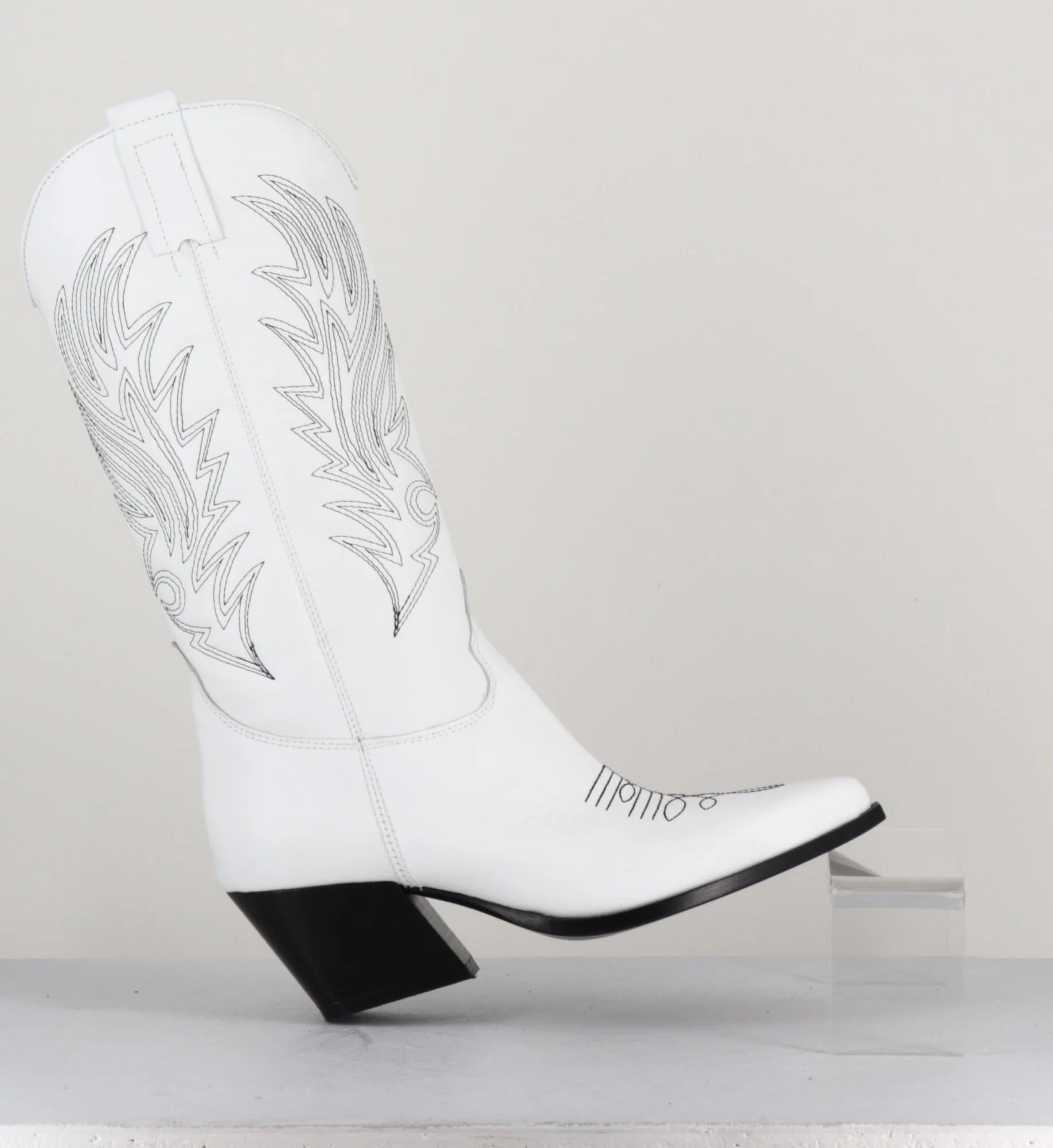 Boots santiags tige haute en cuir blanc souple avec broderies traditionnelles noires, bout effilé et talon biseauté en cuir.