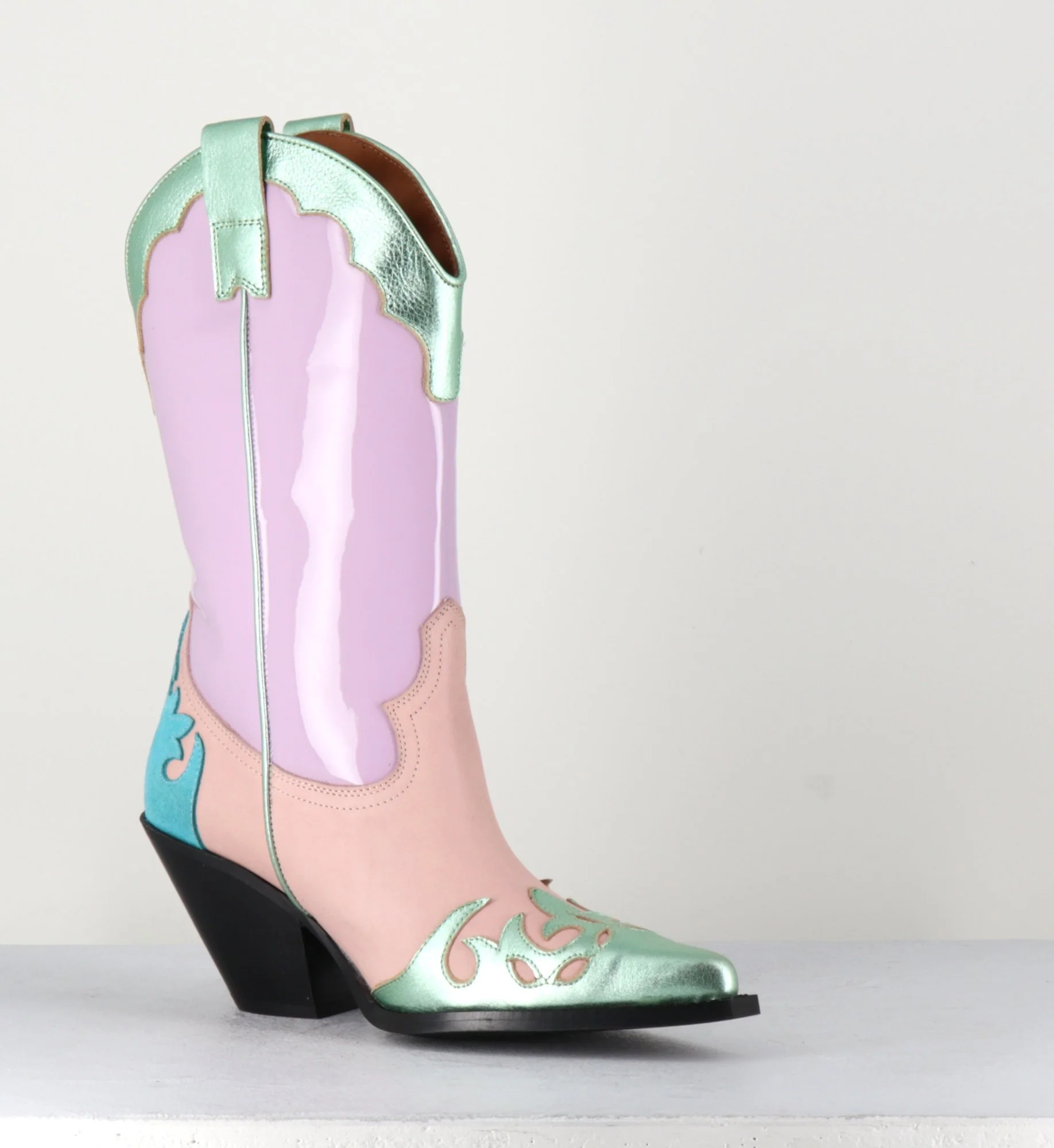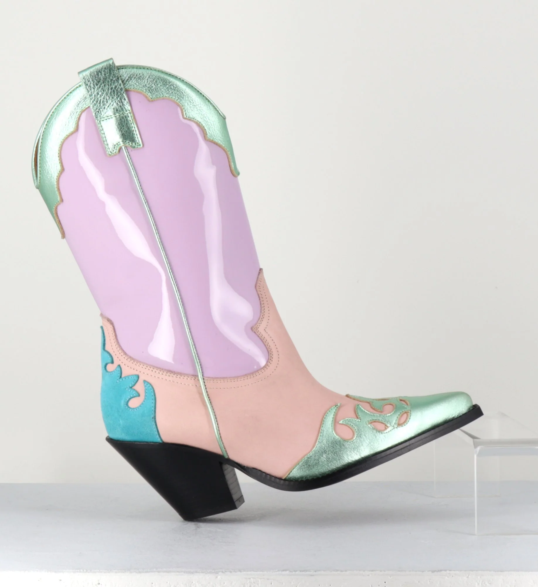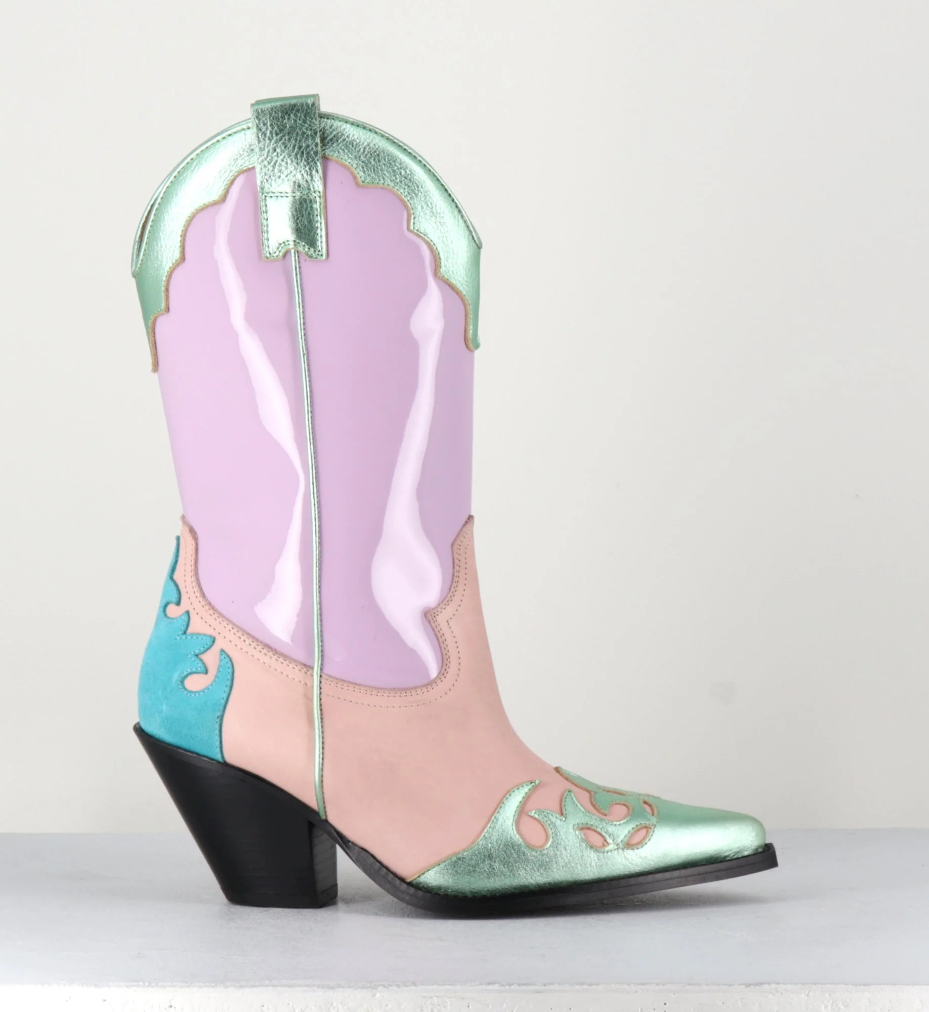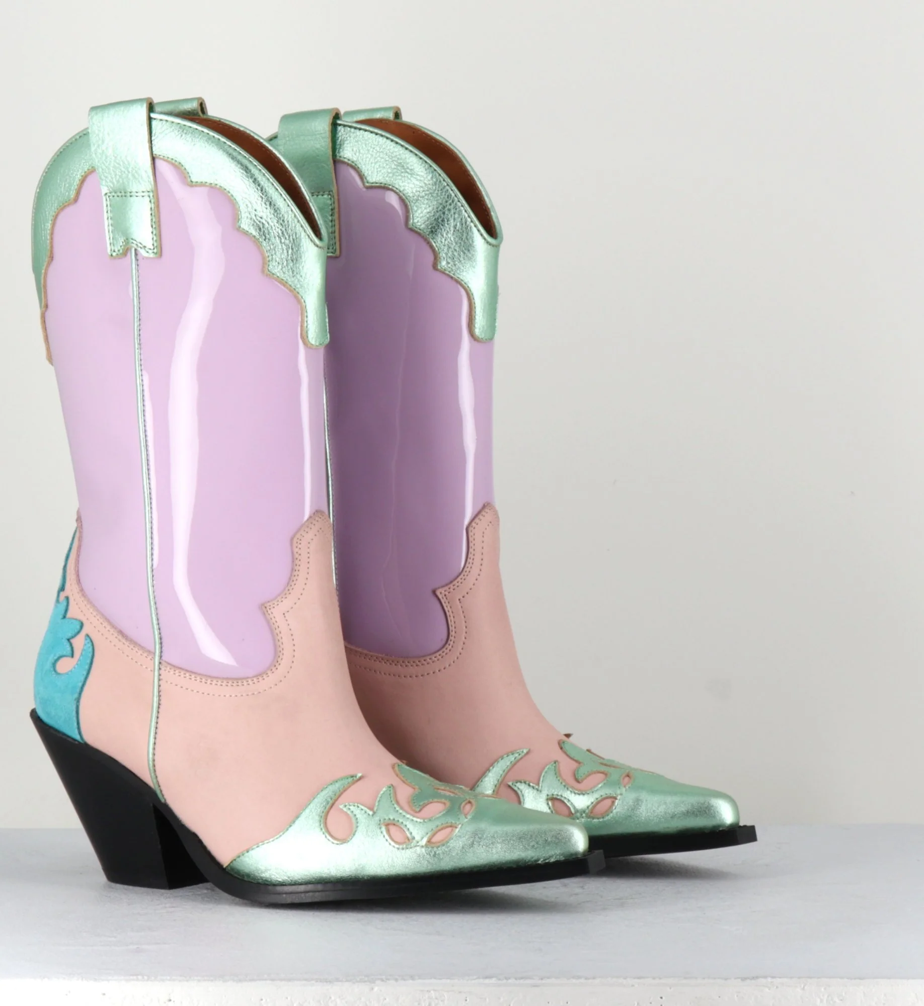 Boots Santiags tige haute en cuir vernis lilas, daim saumon&turquoise, et détails métallisés verts, bout pointu avec petite pointe carré, montées sur un talon biseauté.
