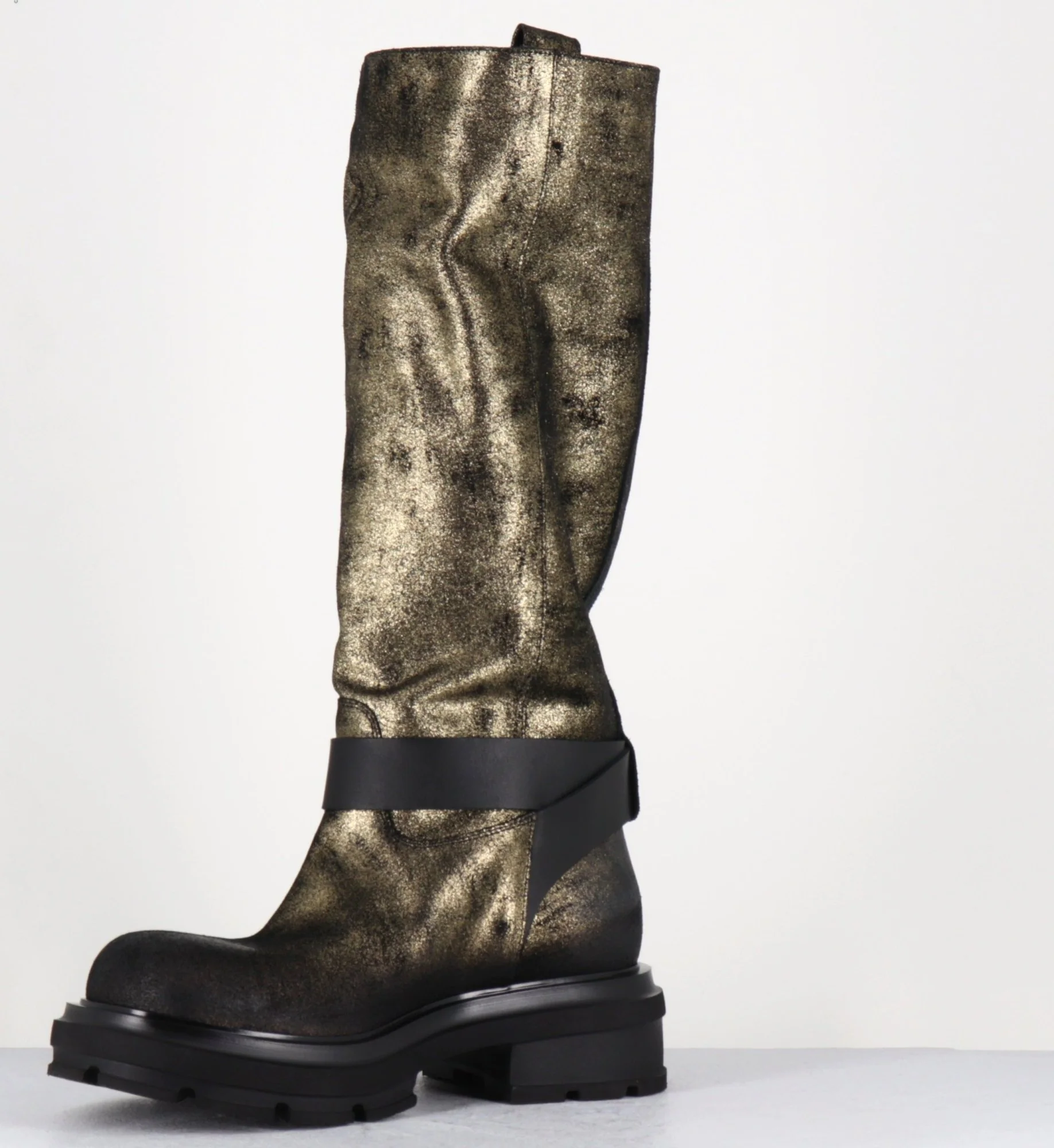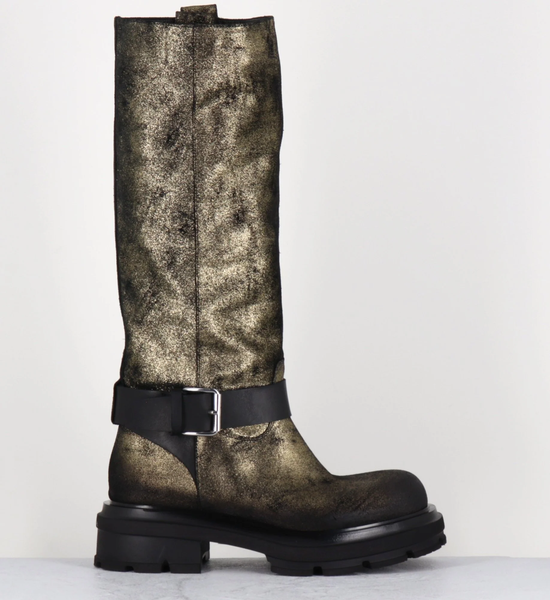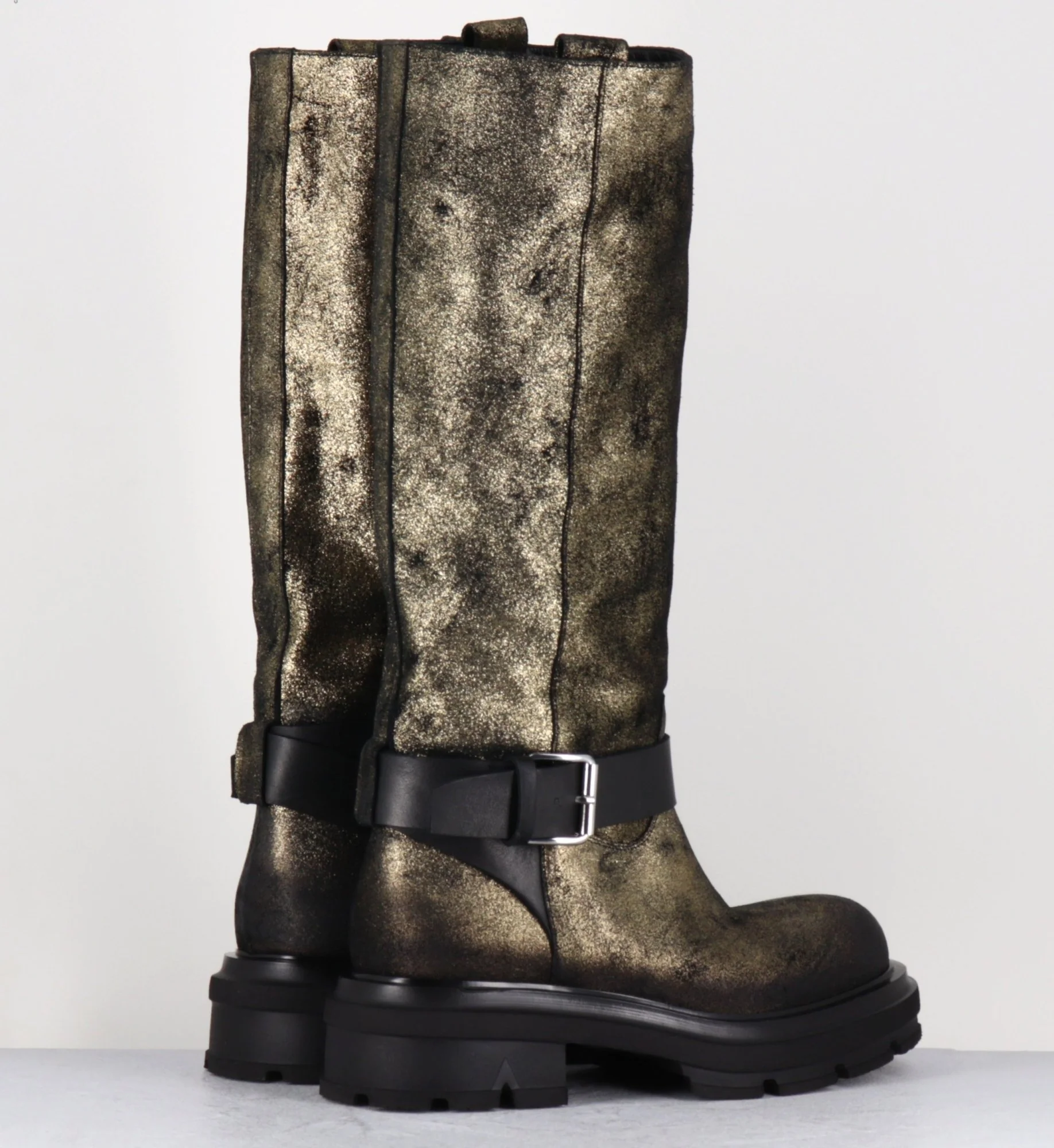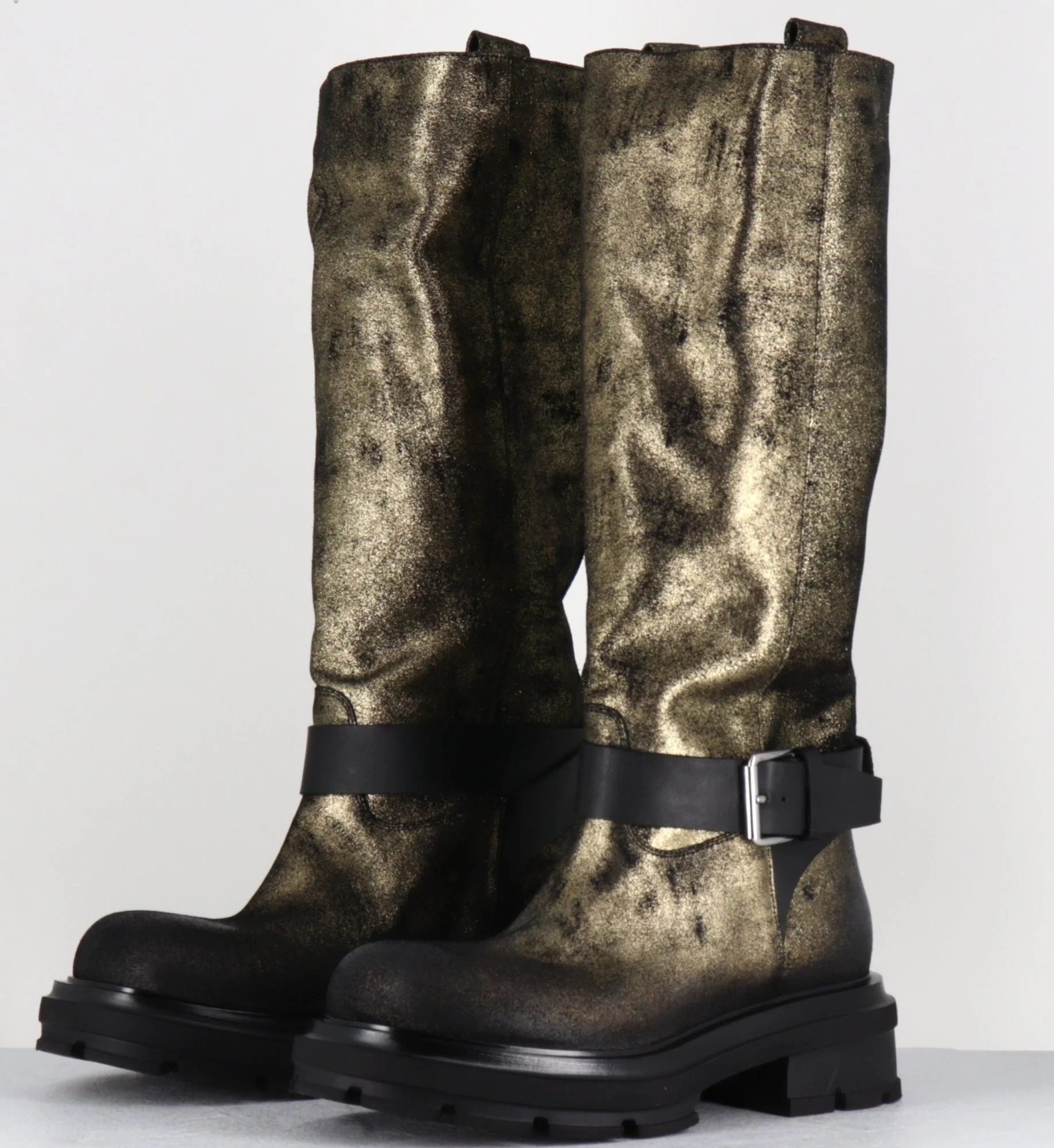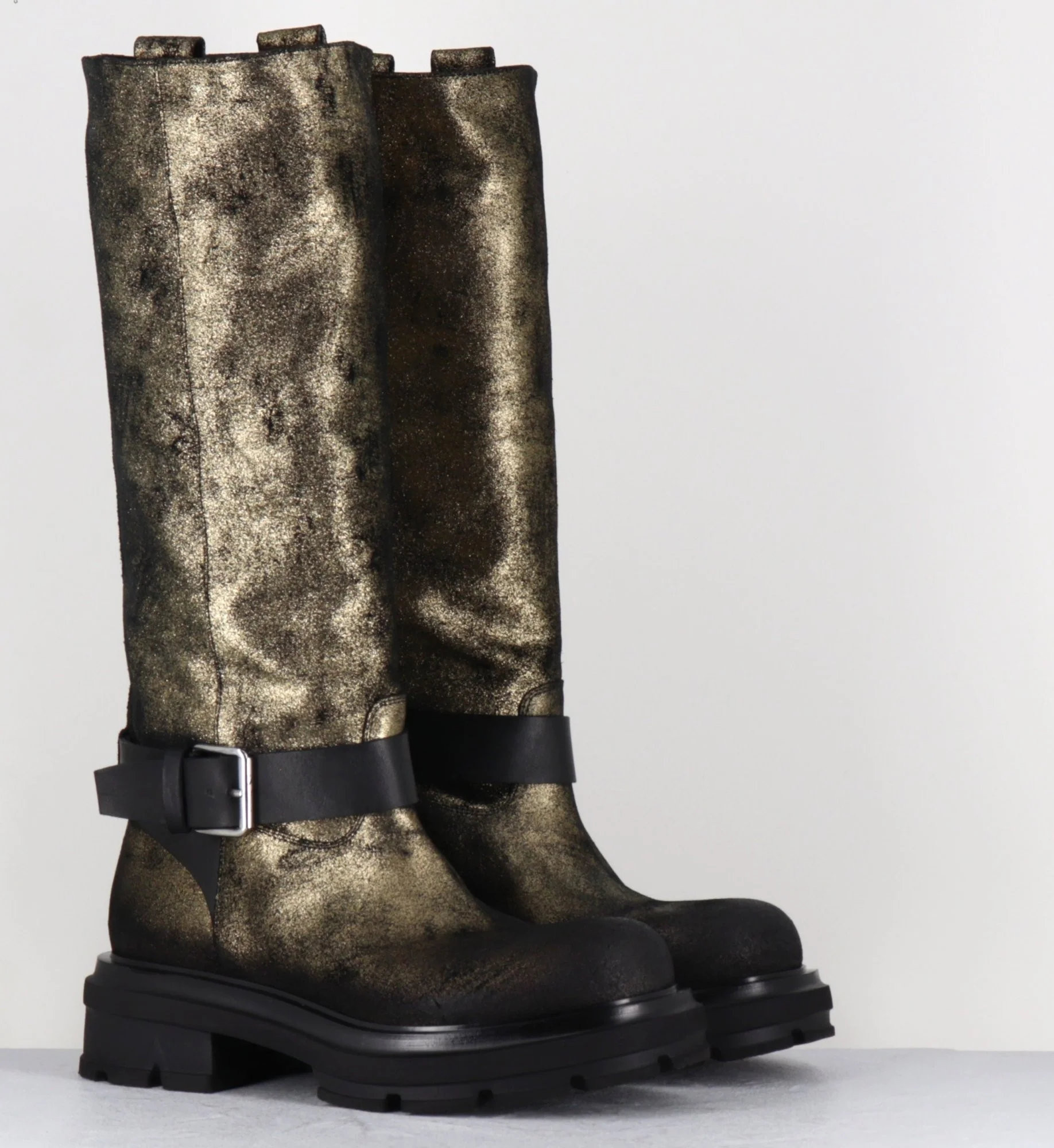 Bottes à tige tubulaire large avec cinturon et boucle , bout arrondi & semelle épaisse Fabrication Artisanale Italienne – Ateliers Elena Iachi Chausse légèrement grand
