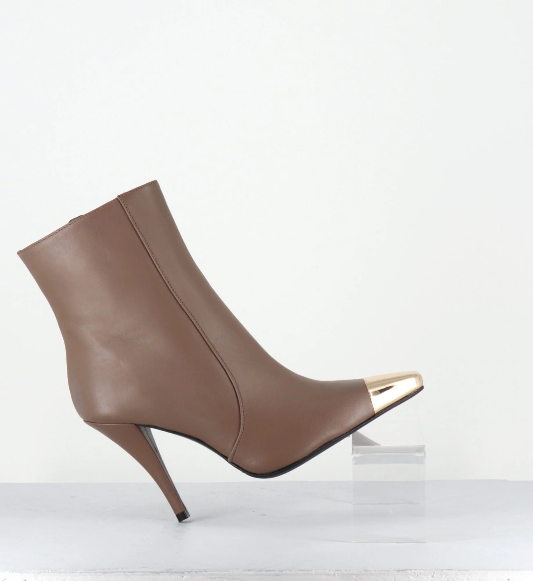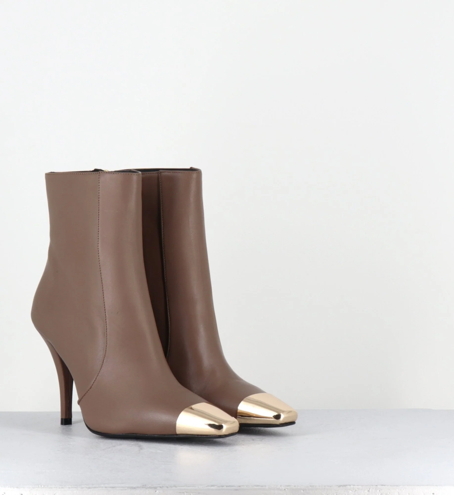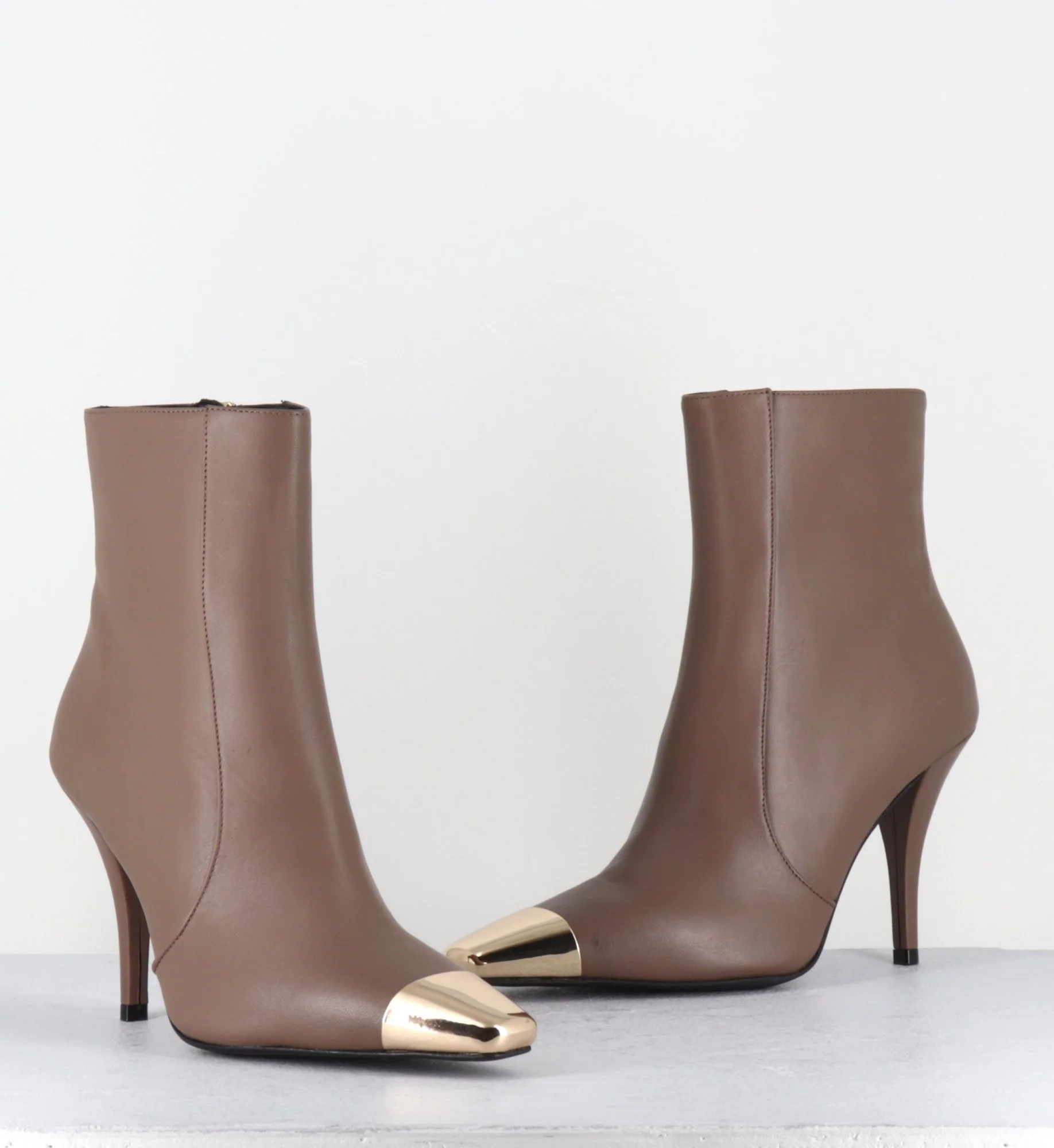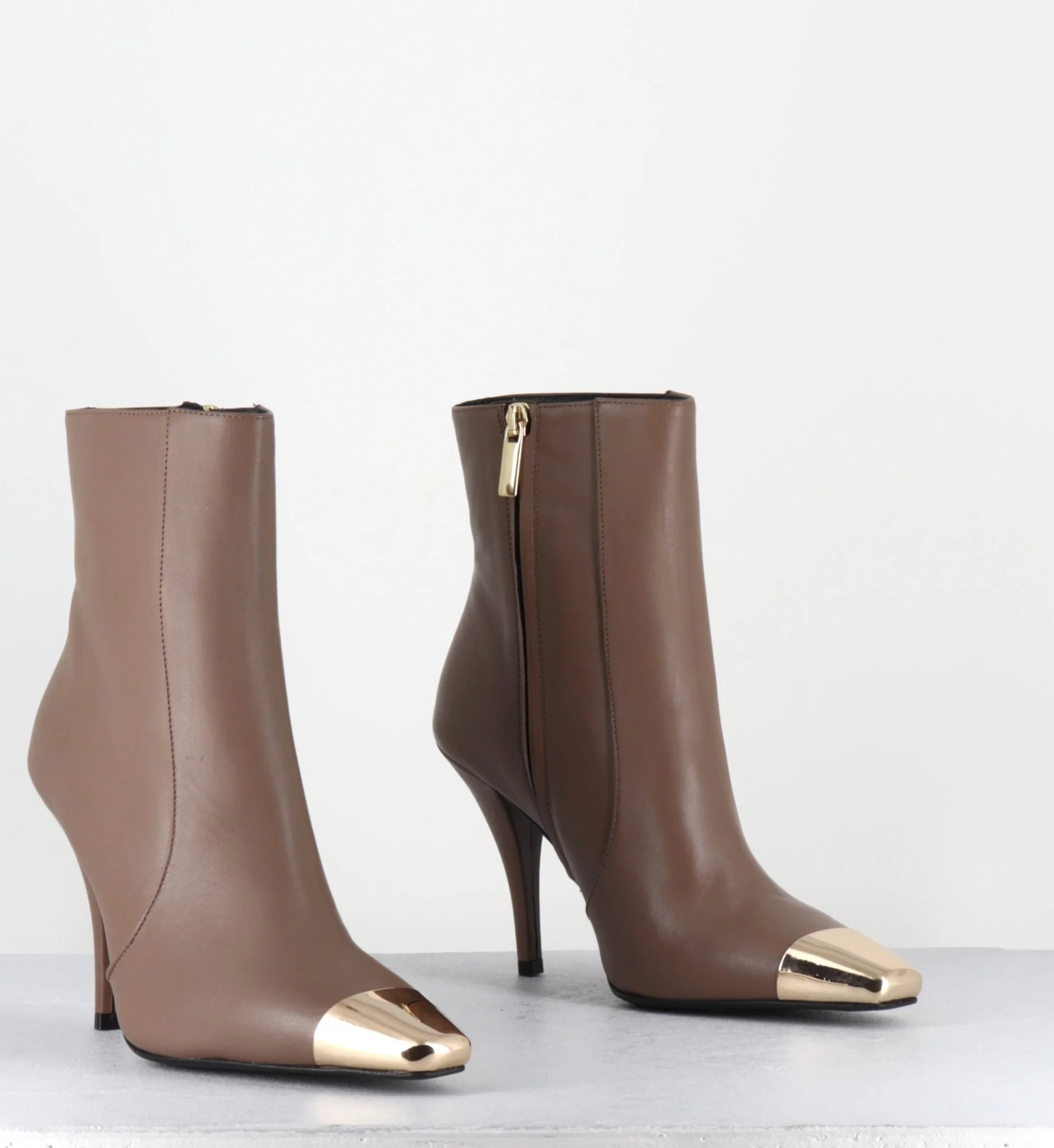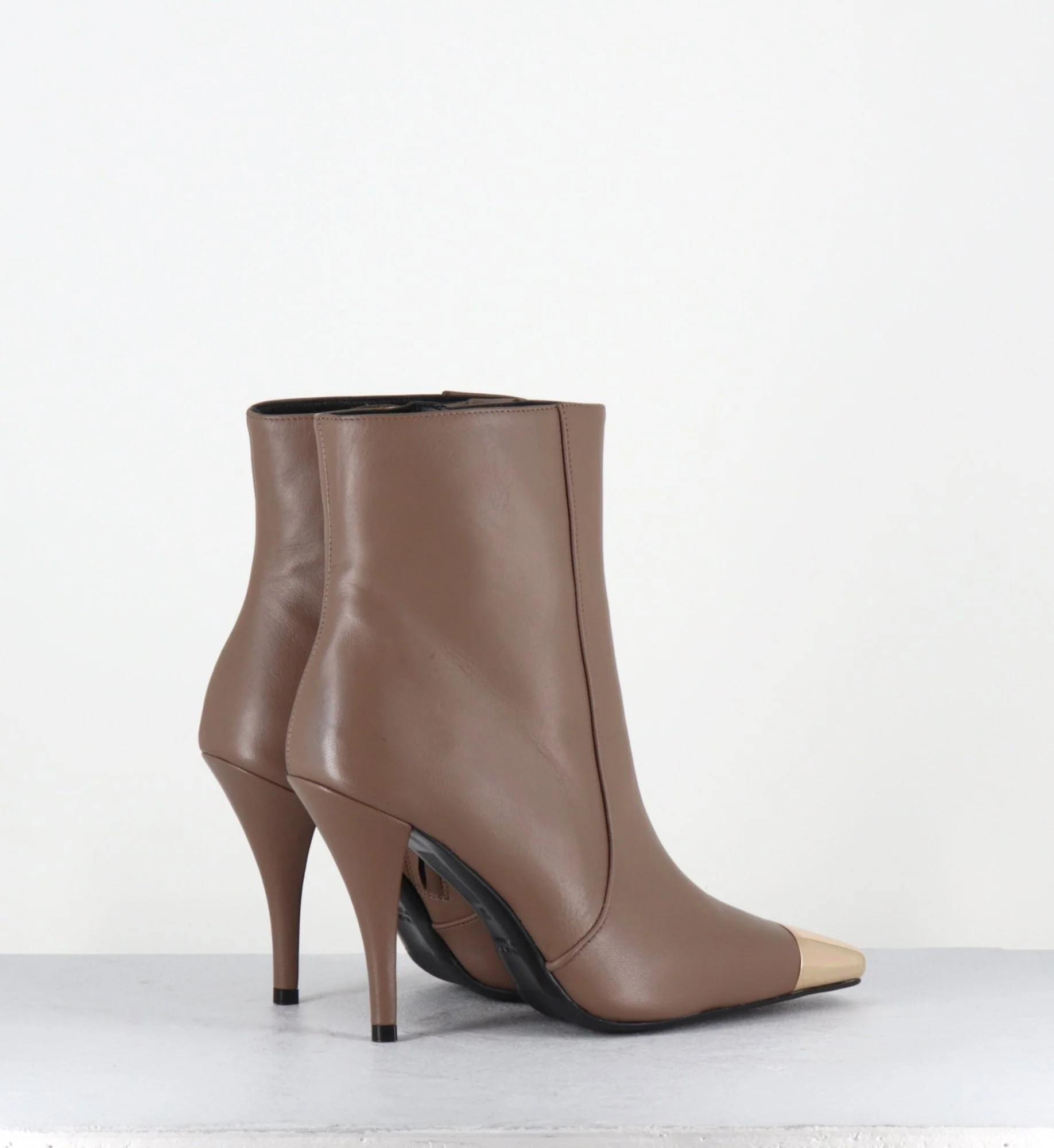 Boots en cuir couleur grège, zip intérieur, bout effilé avec empiècement de métal or à l’avant & pointe carrée, montées sur un haut talon légèrement incurvé Fabrication Artisanale Italienne – Ateliers GarriceLab Chausse normalement