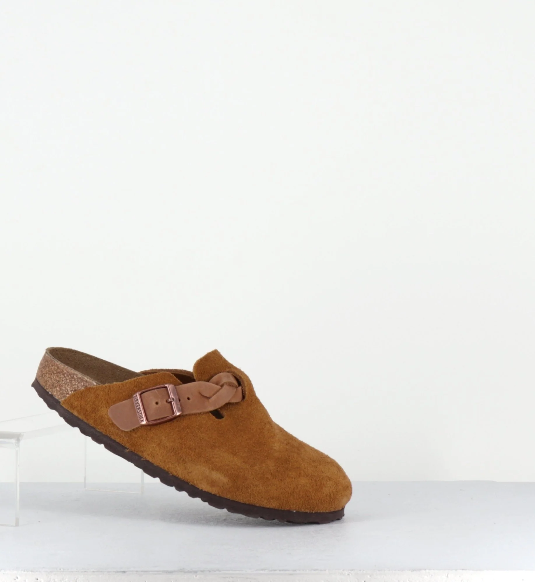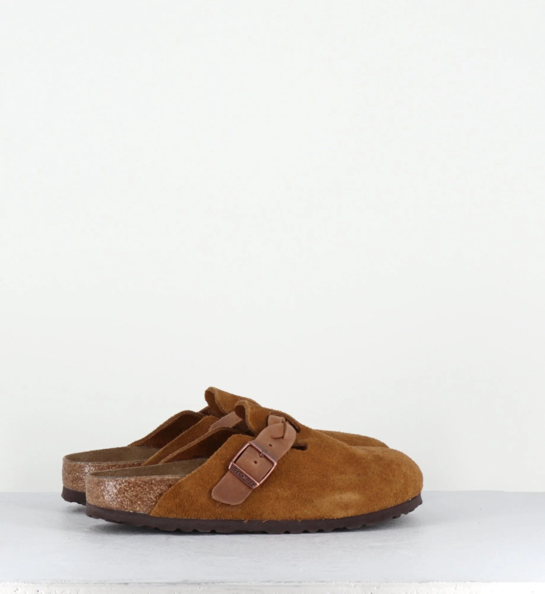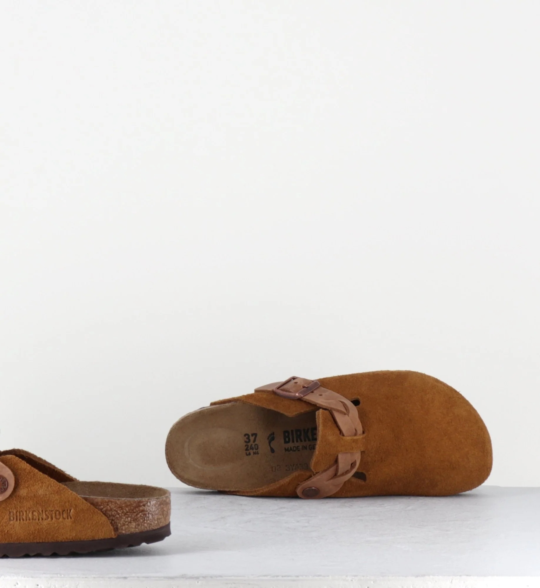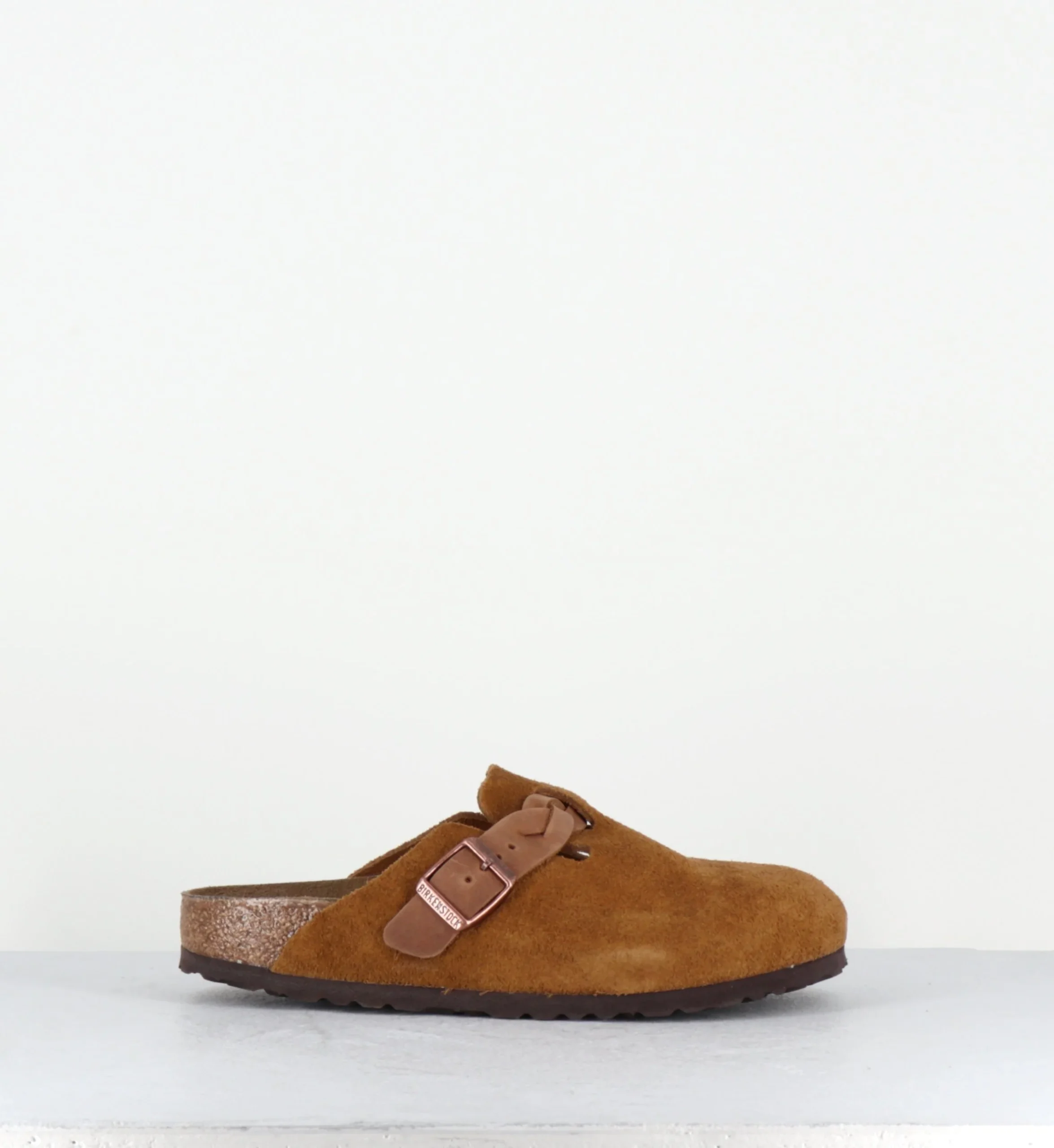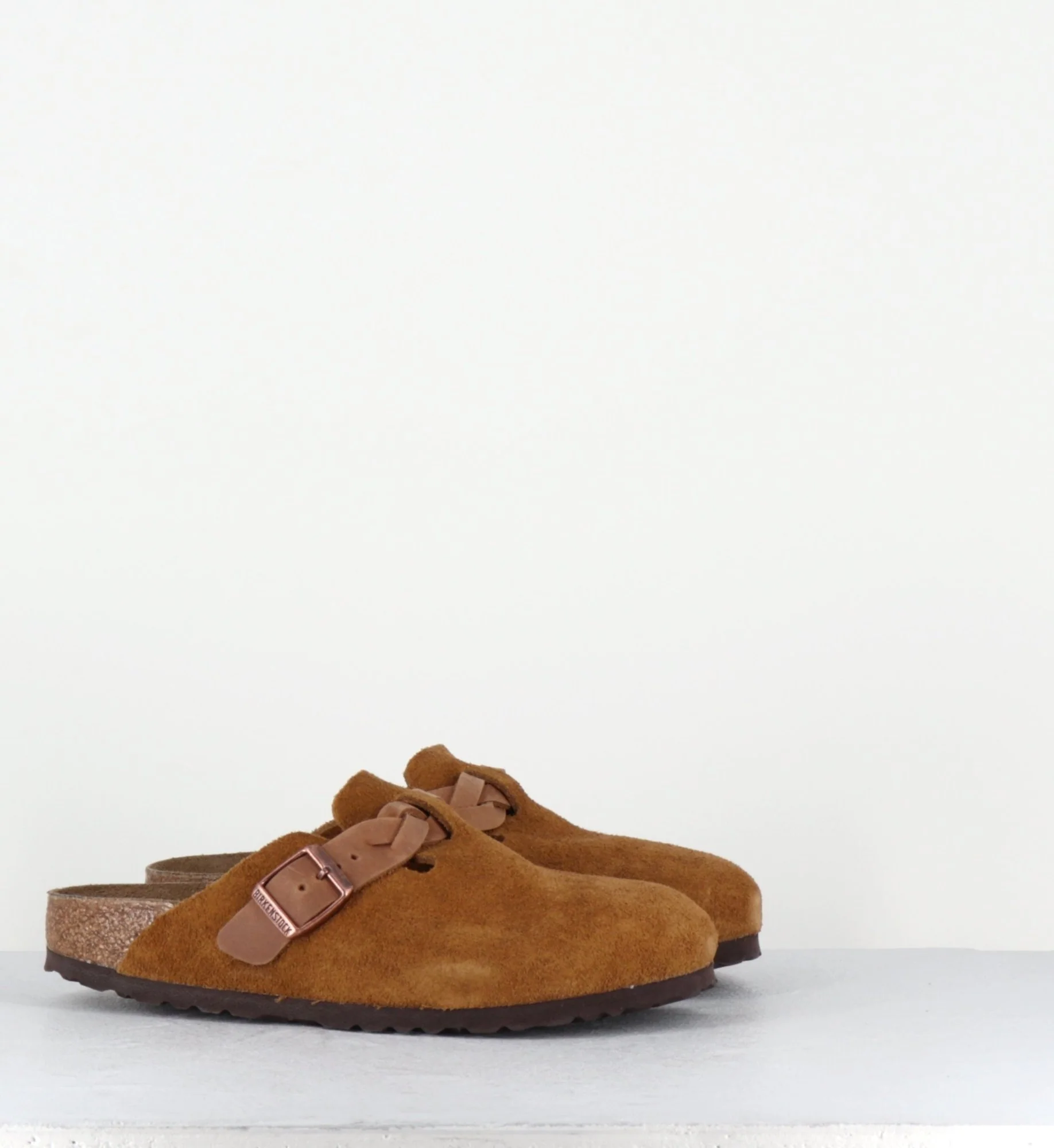 Sabots emblématiques de la marque Birkenstock, le modèle Boston se décline ici dans une version spéciale entièrement réalisée en daim camel ‘Mink’ avec brides tressées en cuir huilé. Design minimal pratique et confortable, se porte sans problème tout au long de l’année.