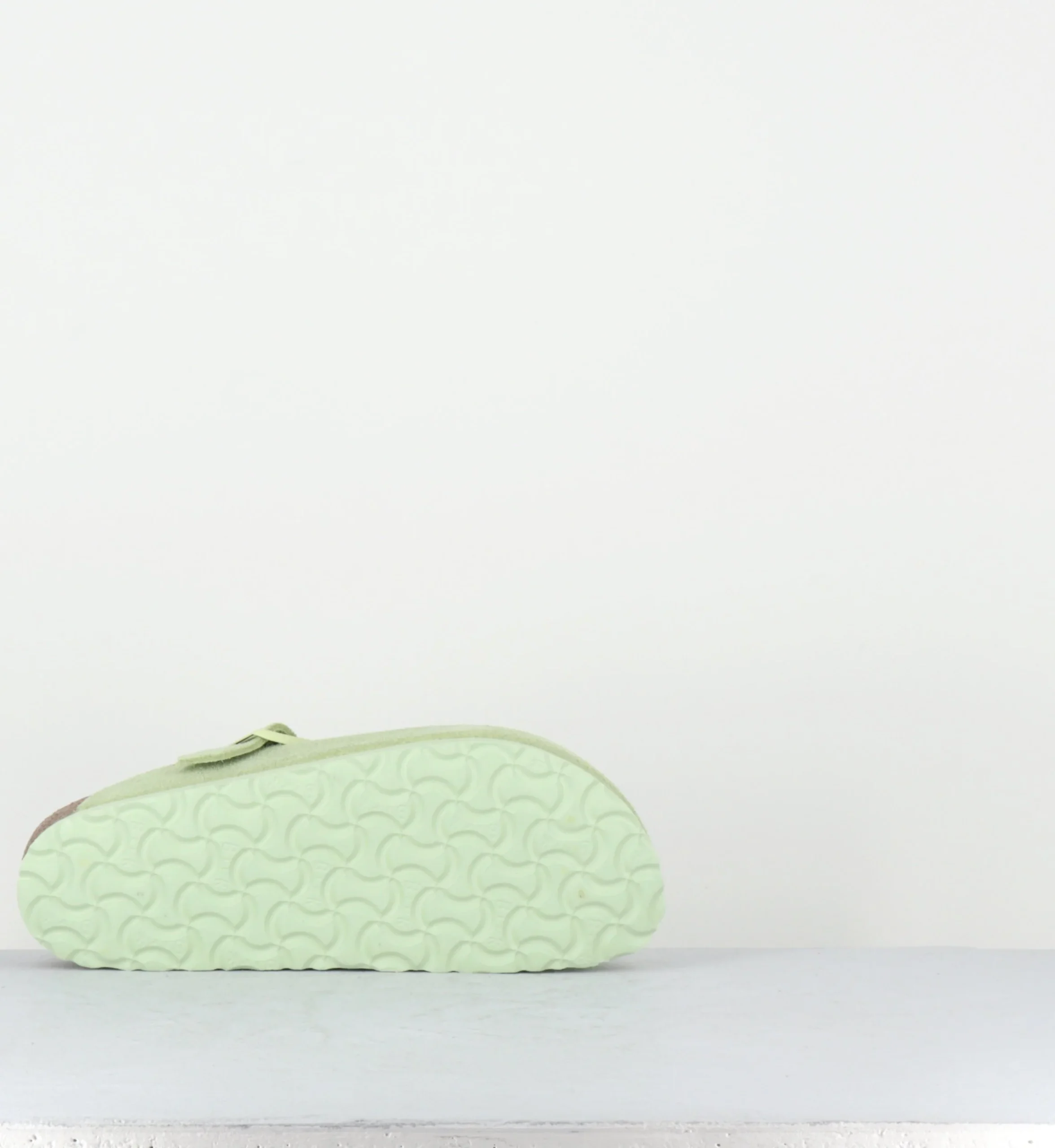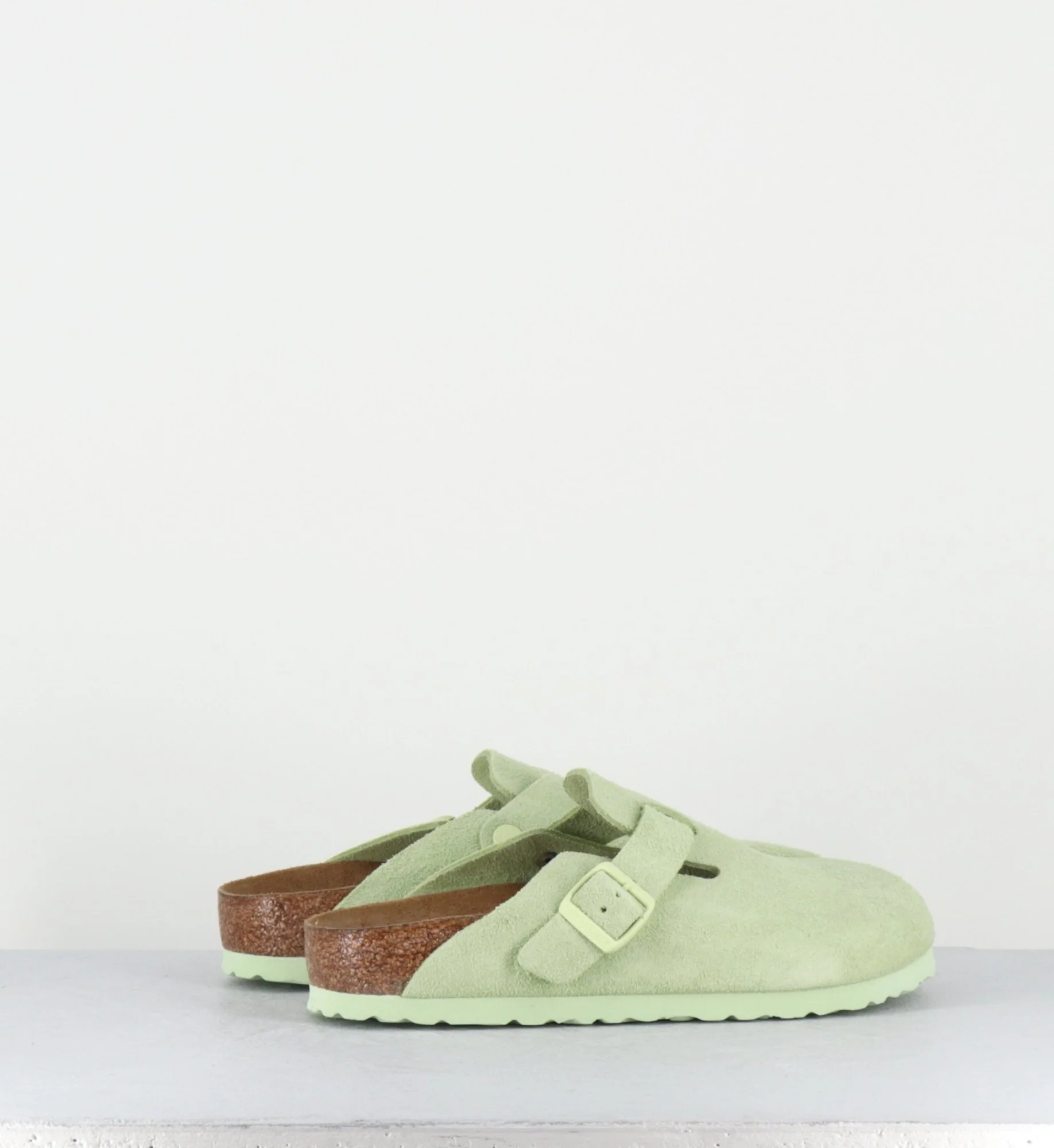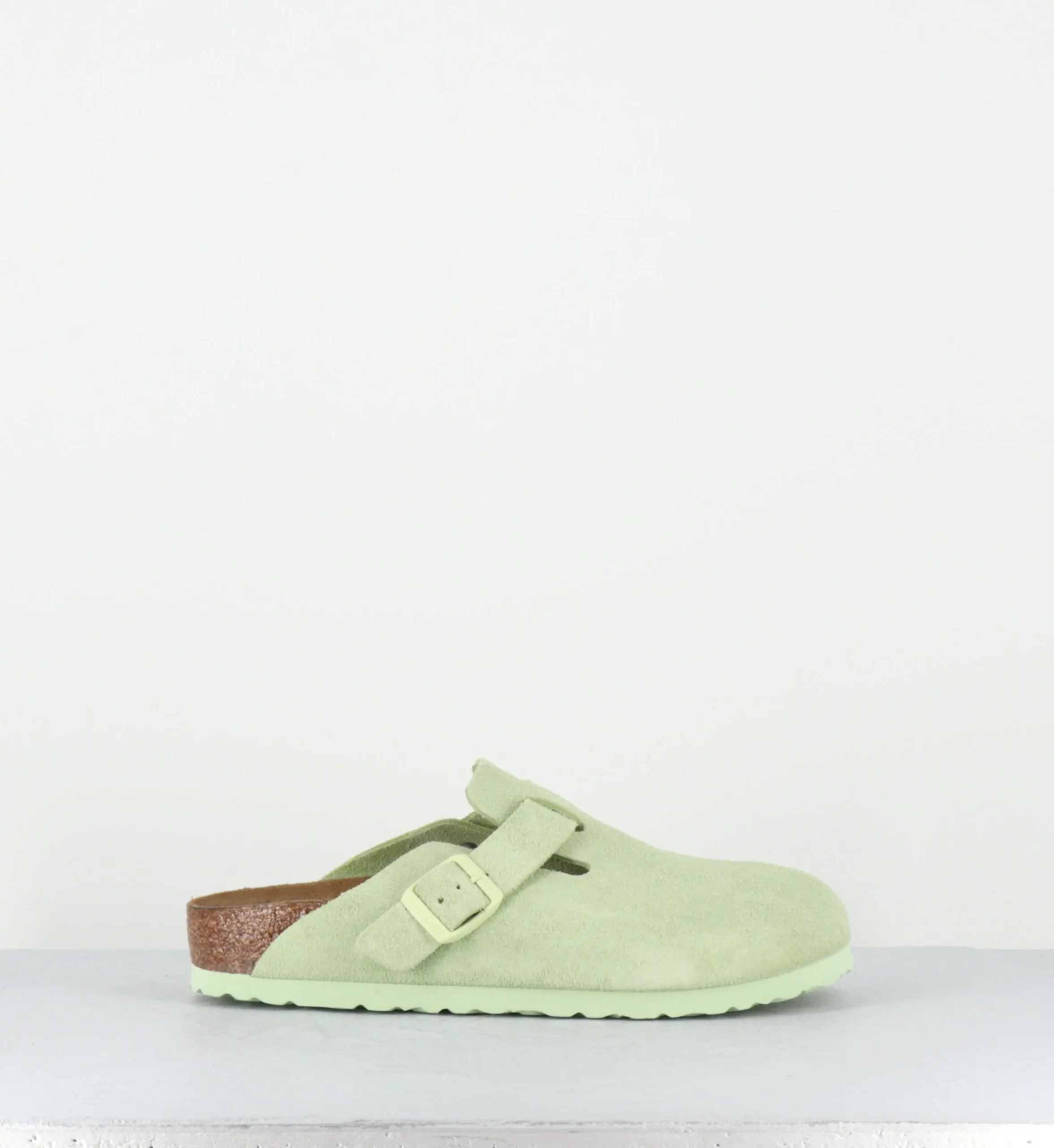 Sabots emblématiques de la marque Birkenstock, le modèle Boston se décline ici en daim vert anis. Design minimal pratique et confortable, se porte sans problème tout au long de l’année.