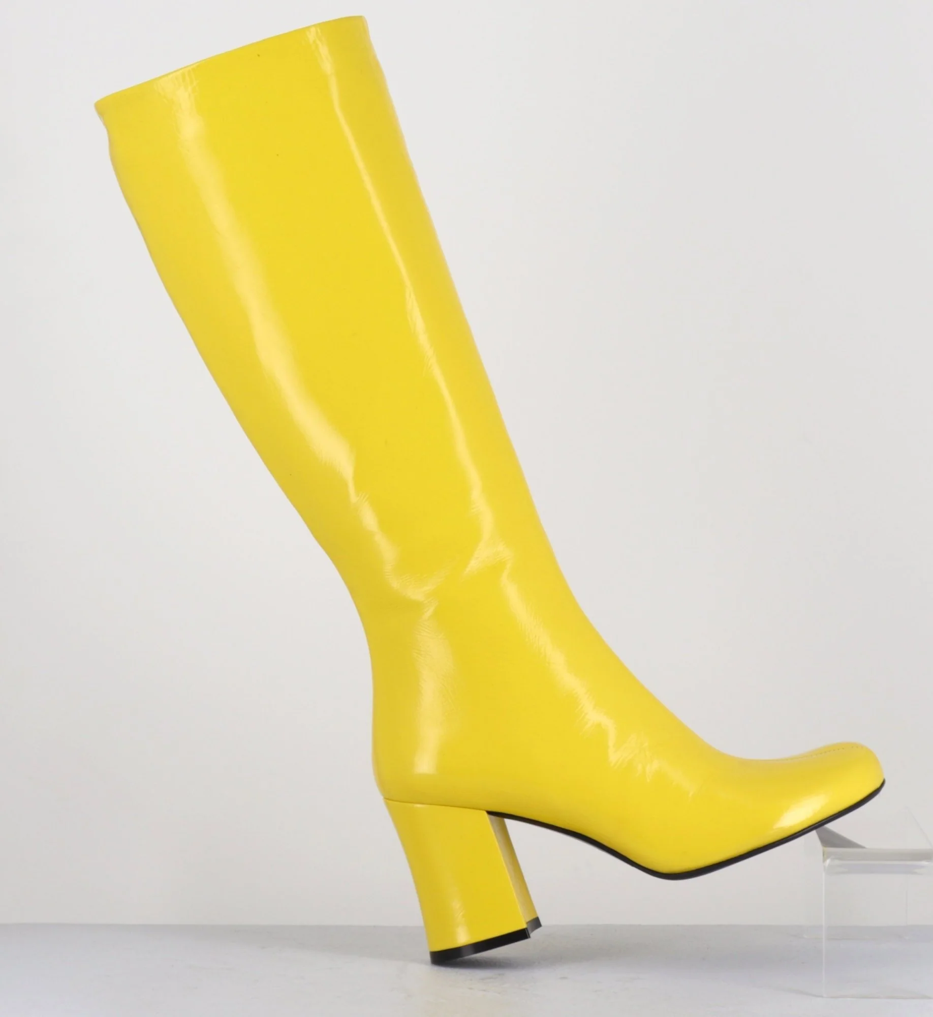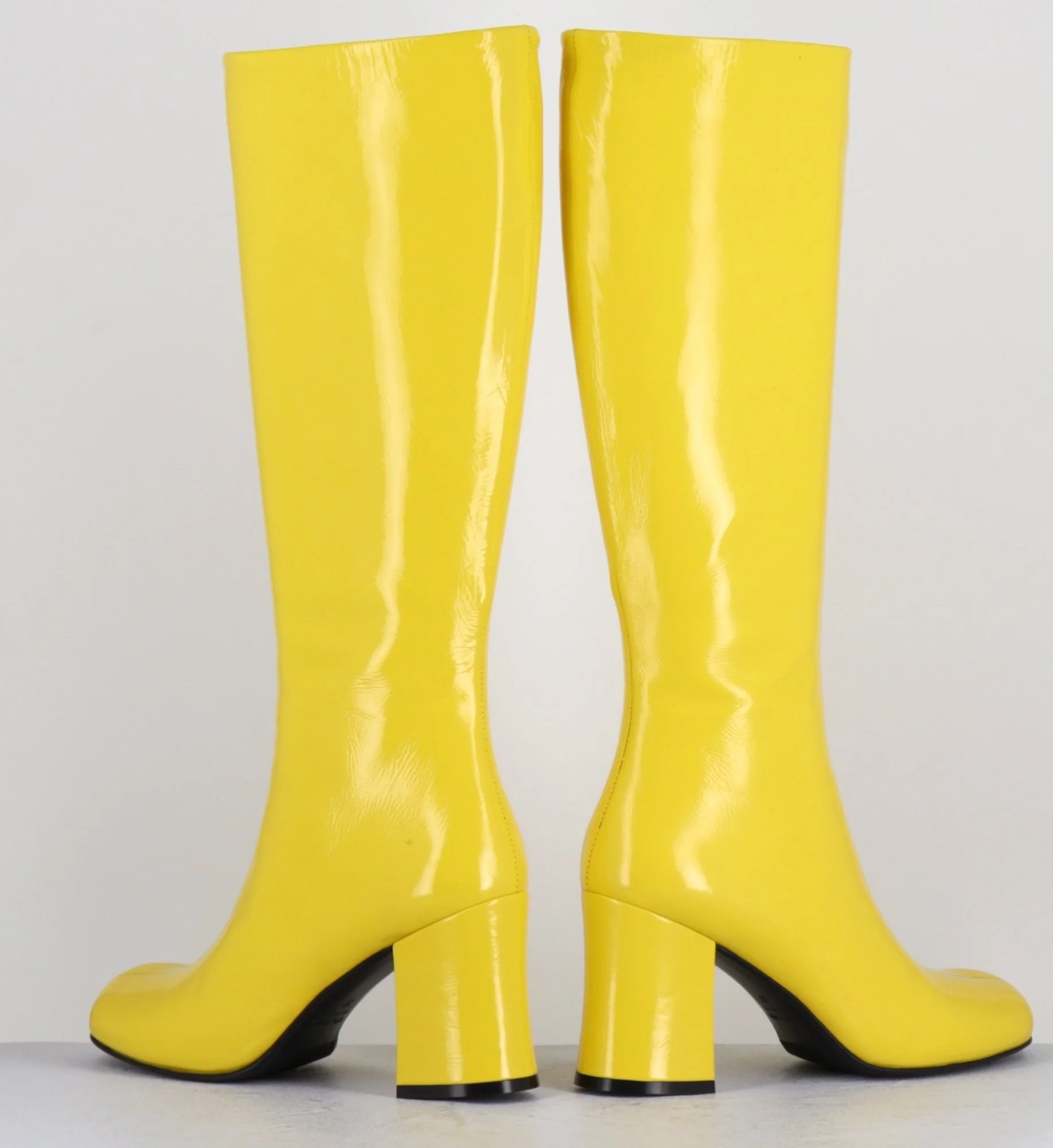 Bottes en cuir souple brillant effet naplak jaune, bout carré arrondi légèrement asymétrique, zip intérieur, montées sur un talon bloc évasé au look rétro Fabrication Artisanale Italienne – Ateliers GarriceLab Chausse légèrement grand