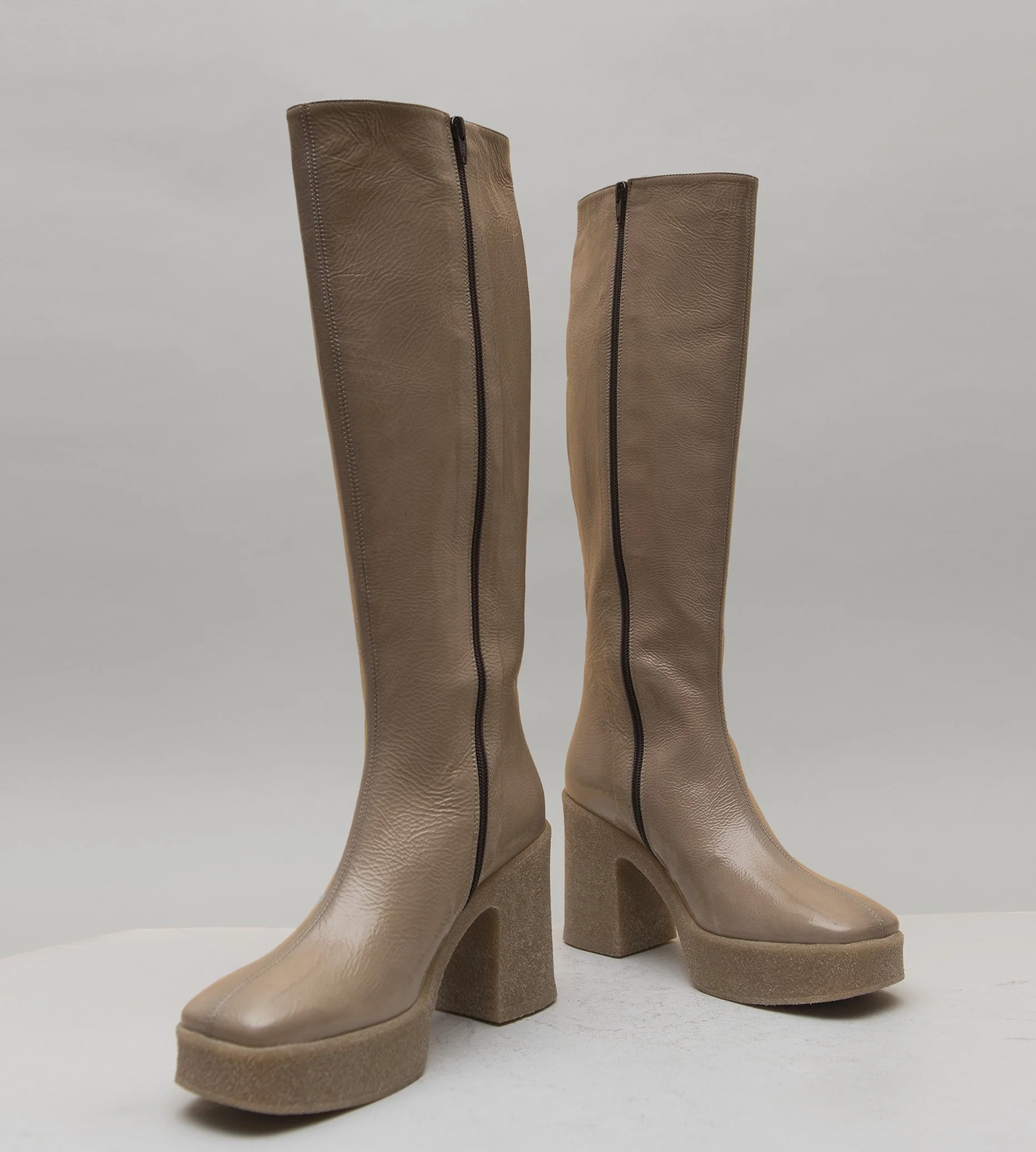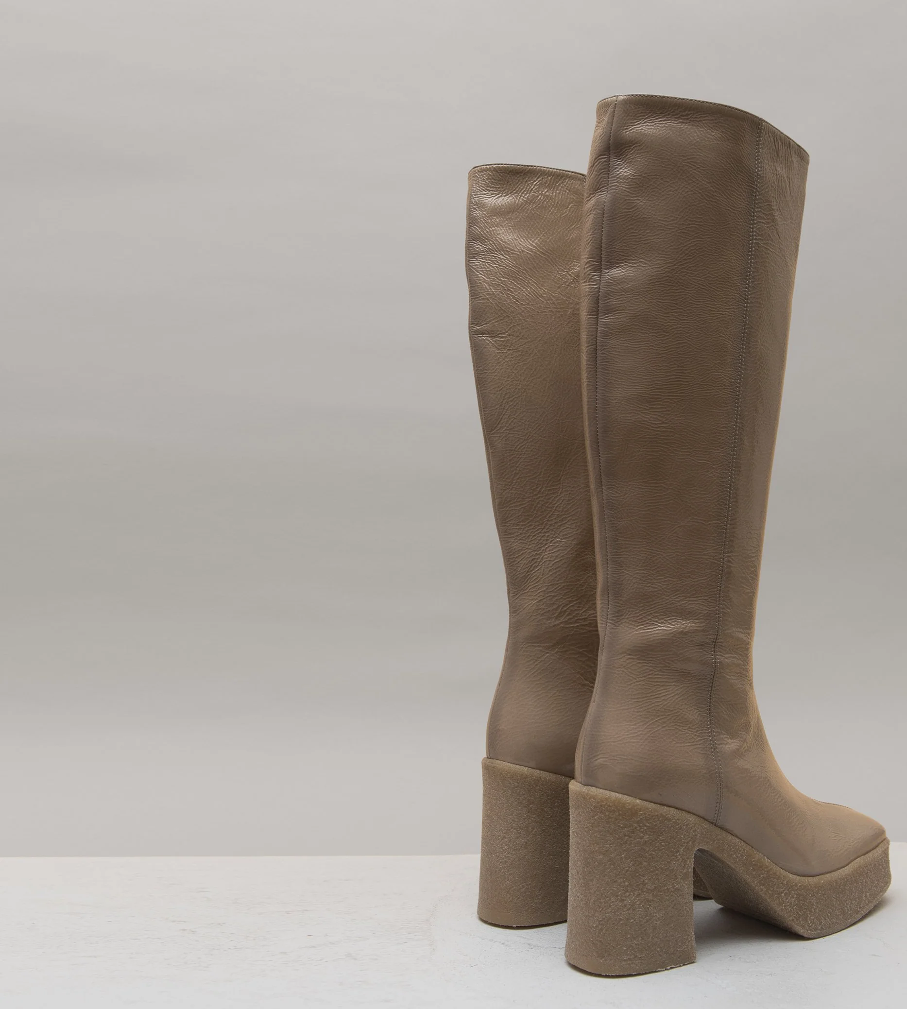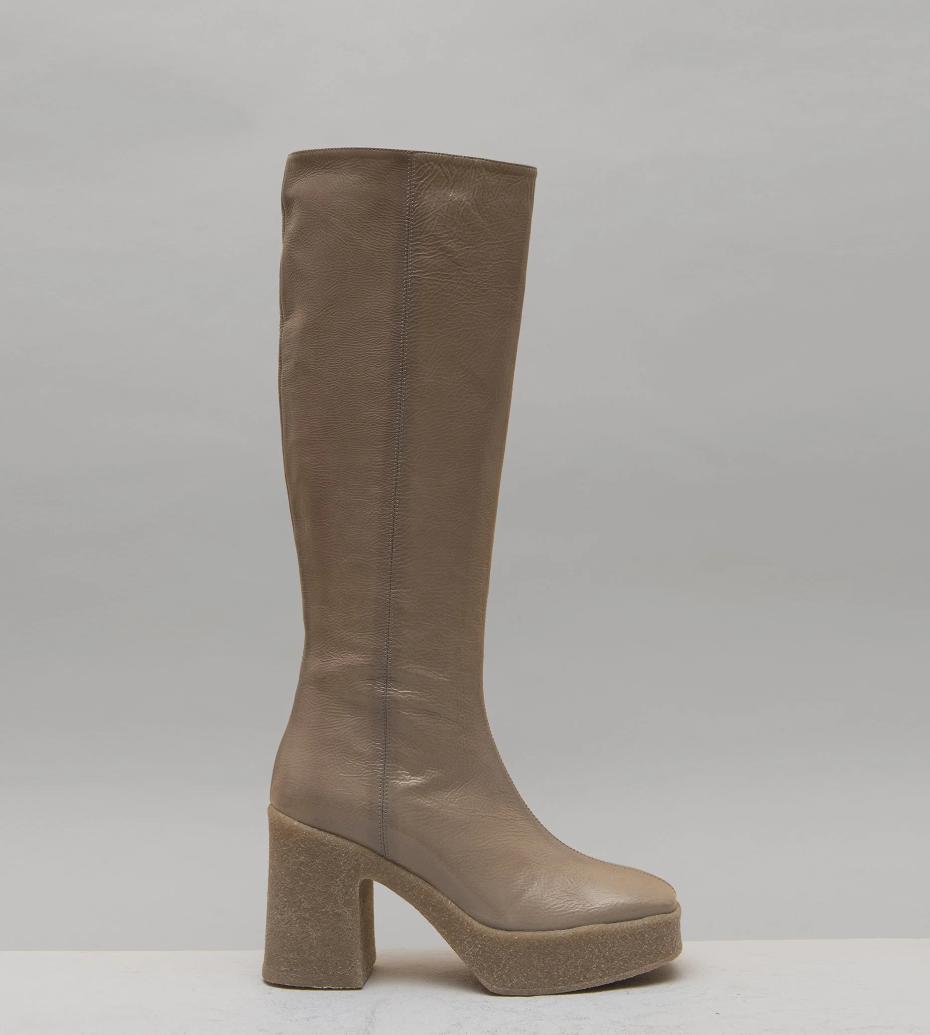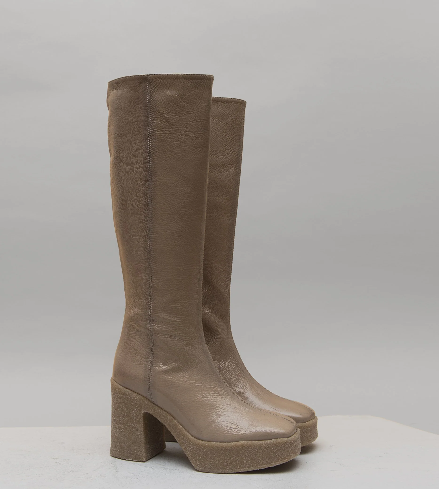 Bottes tige tubulaire en cuir souple effet vernis froissé rose poudré, bout carré et couture centrale rétro, montées sur un talon large & plateforme en crêpe couleur beige. Fabrication Artisanale Italienne Chausse légèrement grand