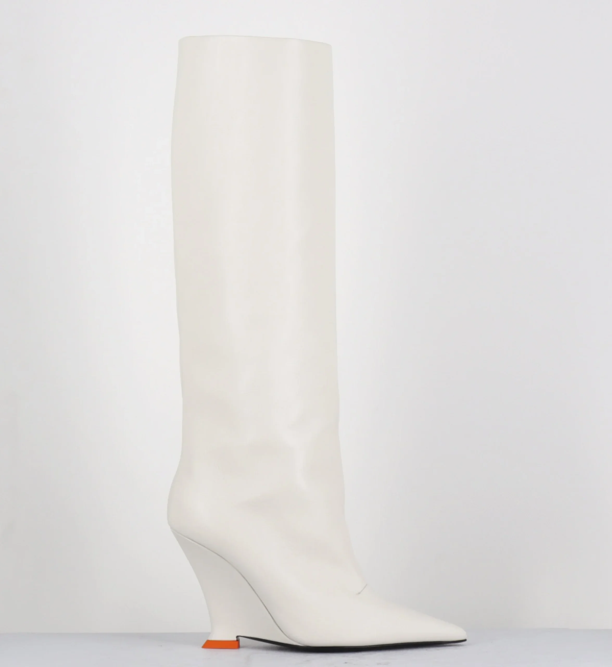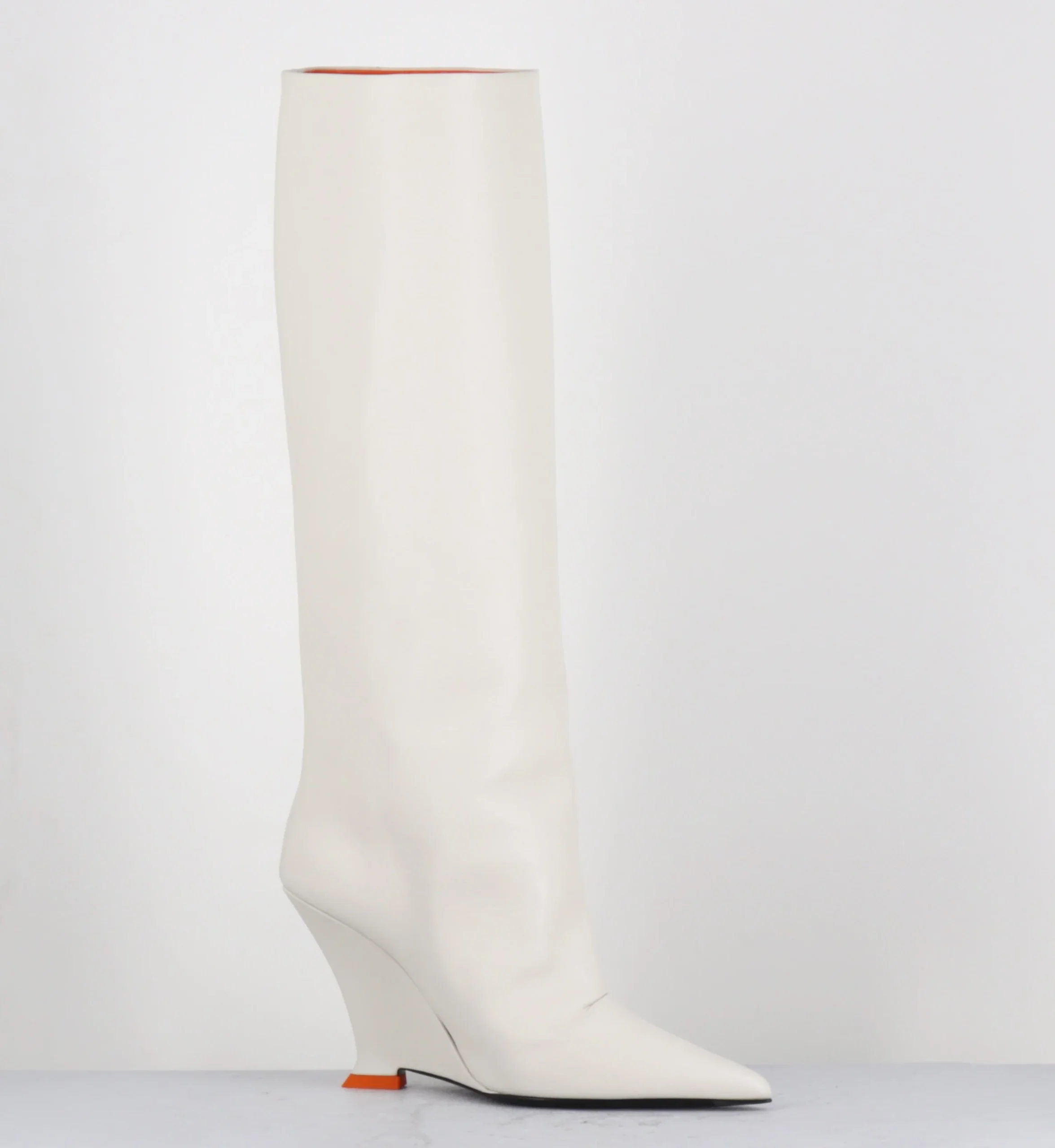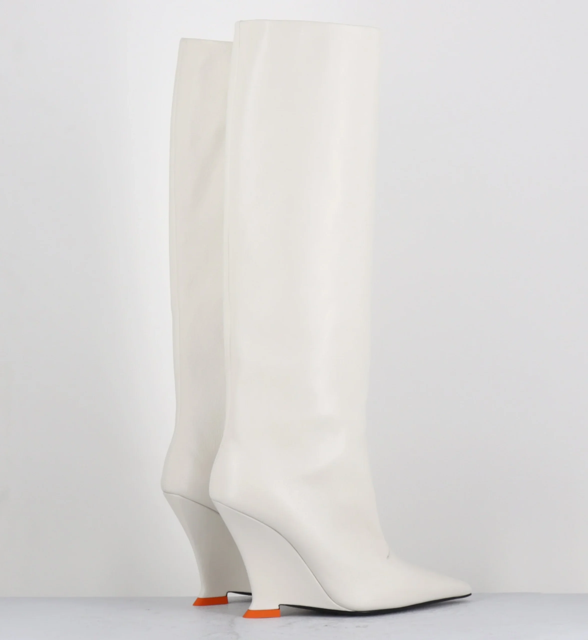Bottes hautes en cuir souple blanc cassé, bout pointu, montées sur un talon compensé stylisé avec détail orange esprit années 2000 Fabrication Artisanale Italienne – Ateliers 3JUIN