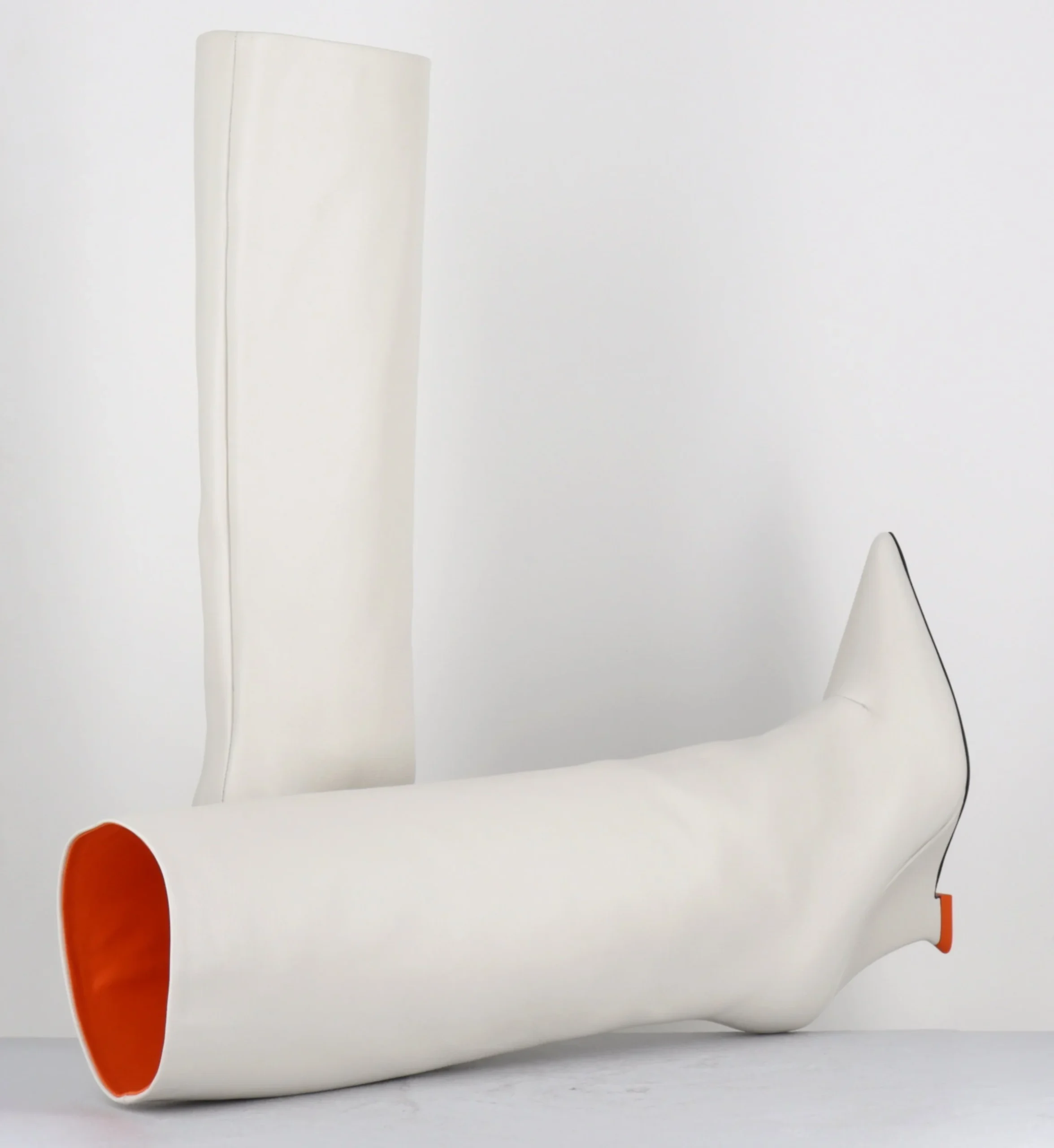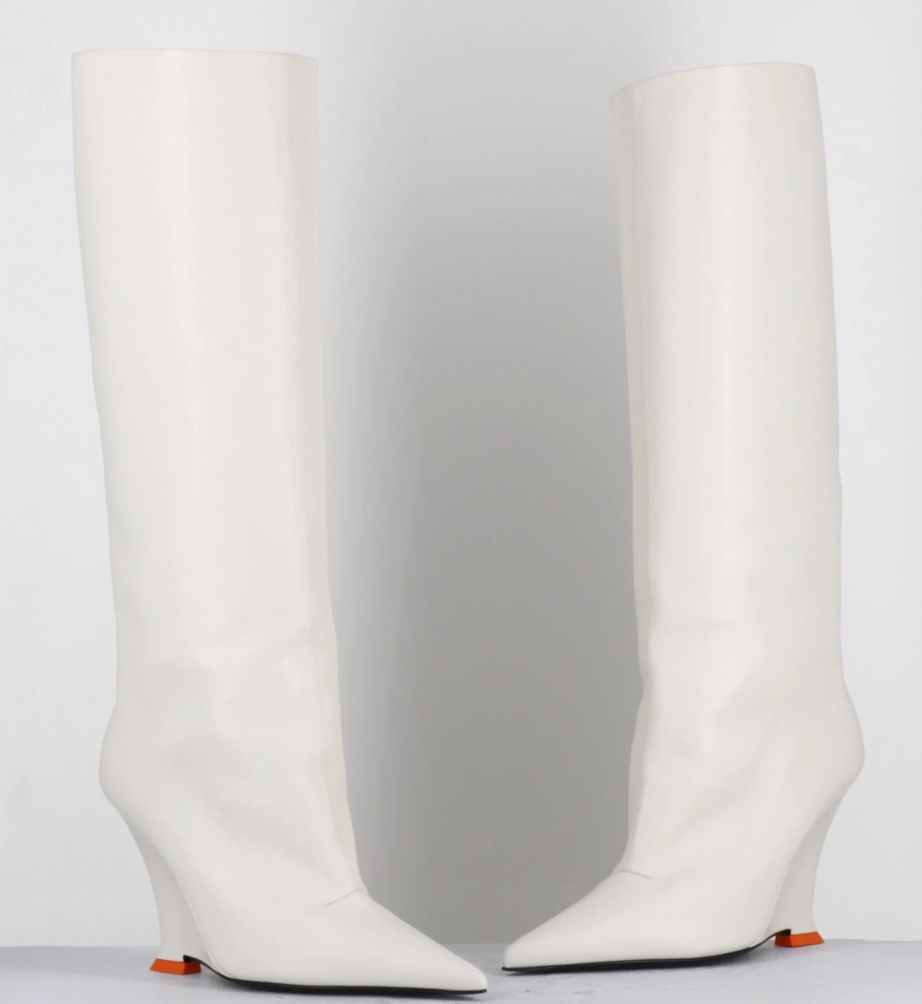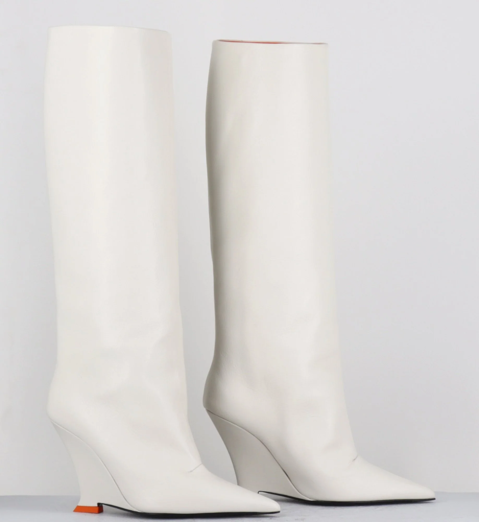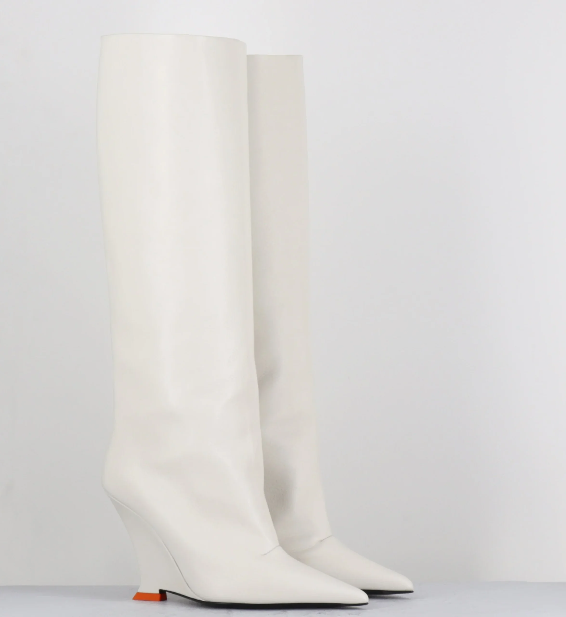 Bottes hautes en cuir souple blanc cassé, bout pointu, montées sur un talon compensé stylisé avec détail orange esprit années 2000 Fabrication Artisanale Italienne – Ateliers 3JUIN