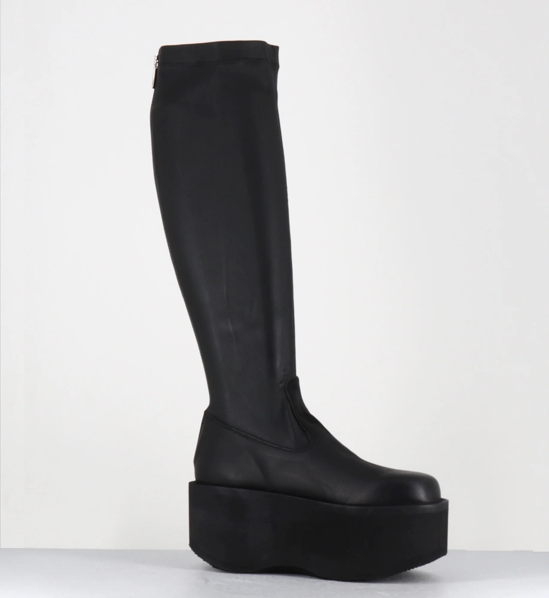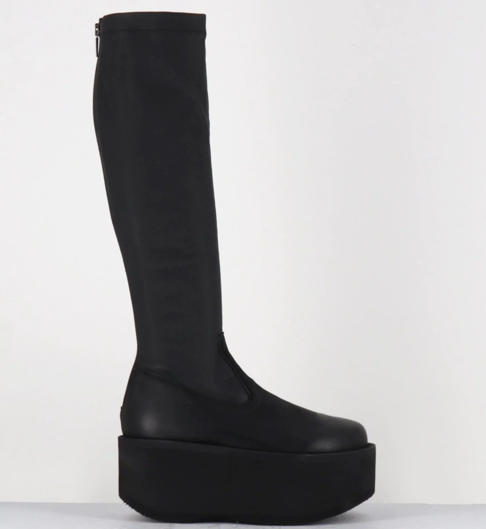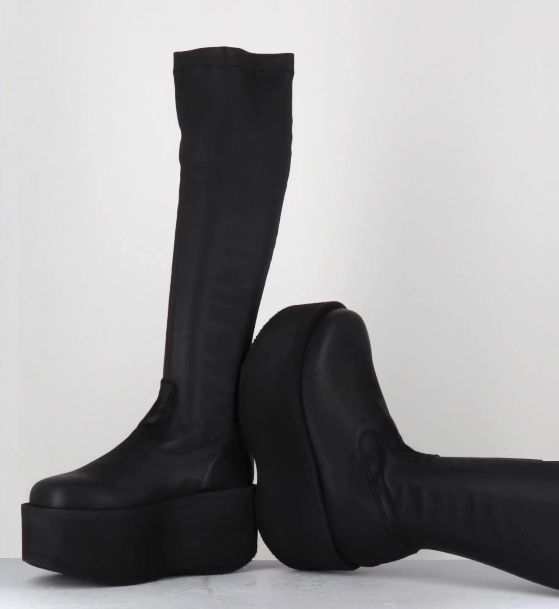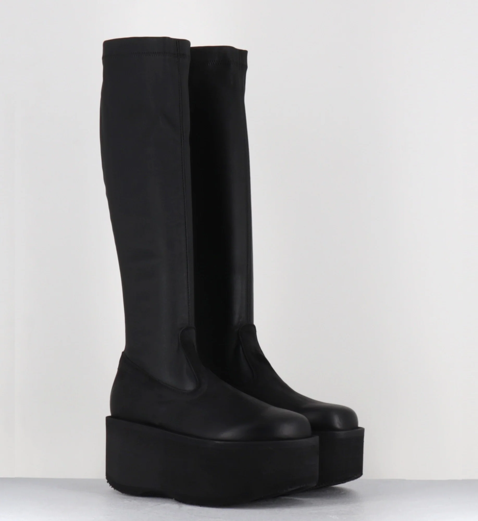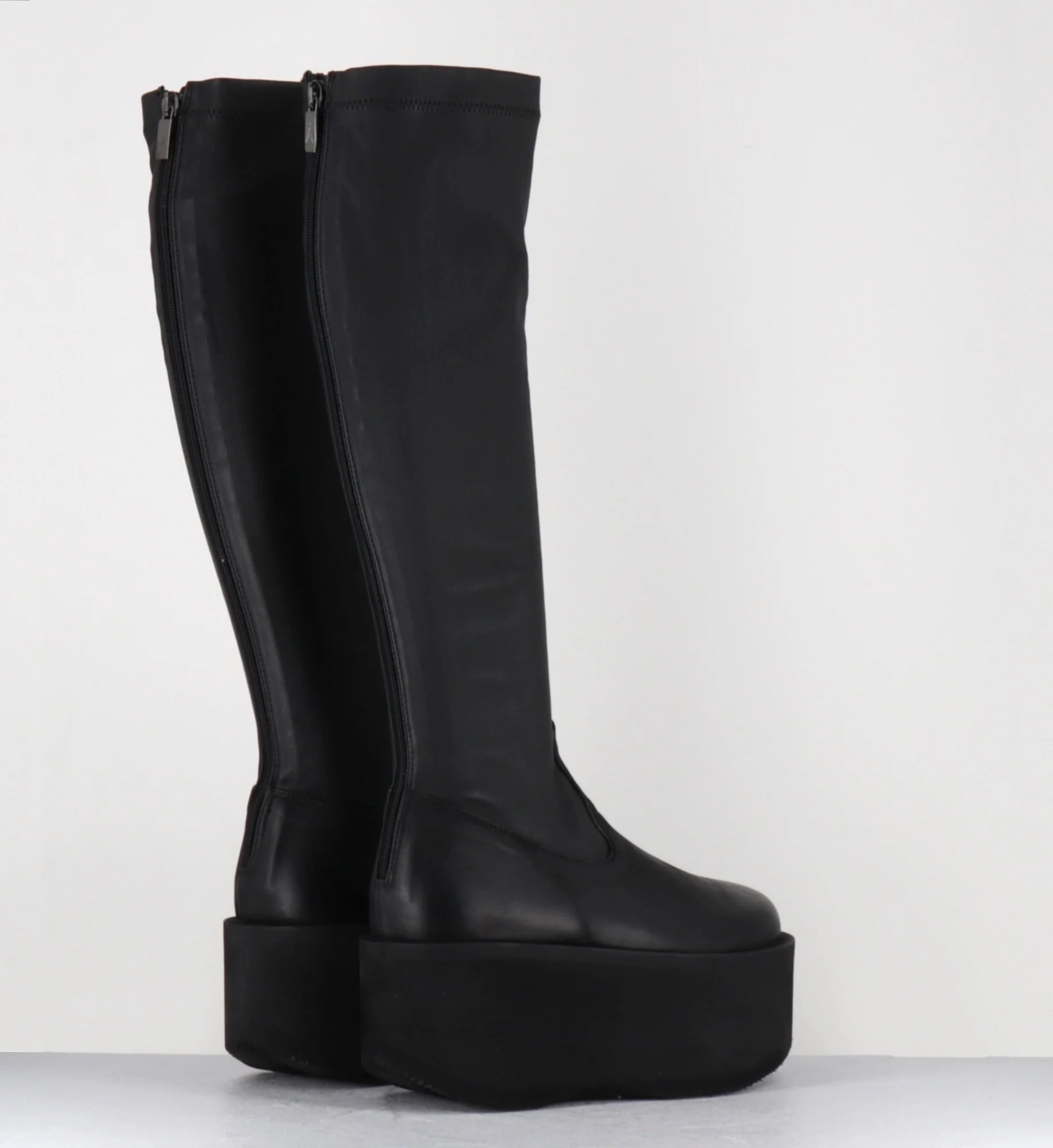 Bottes compensées en cuir gras noir avec tige en agneau stretch à zip arrière, forme à bout rond japonisante, montées sur une plateforme en microfibre légère Fabrication Artisanale Italienne – Ateliers Sort Aarhus Chausse légèrement grand