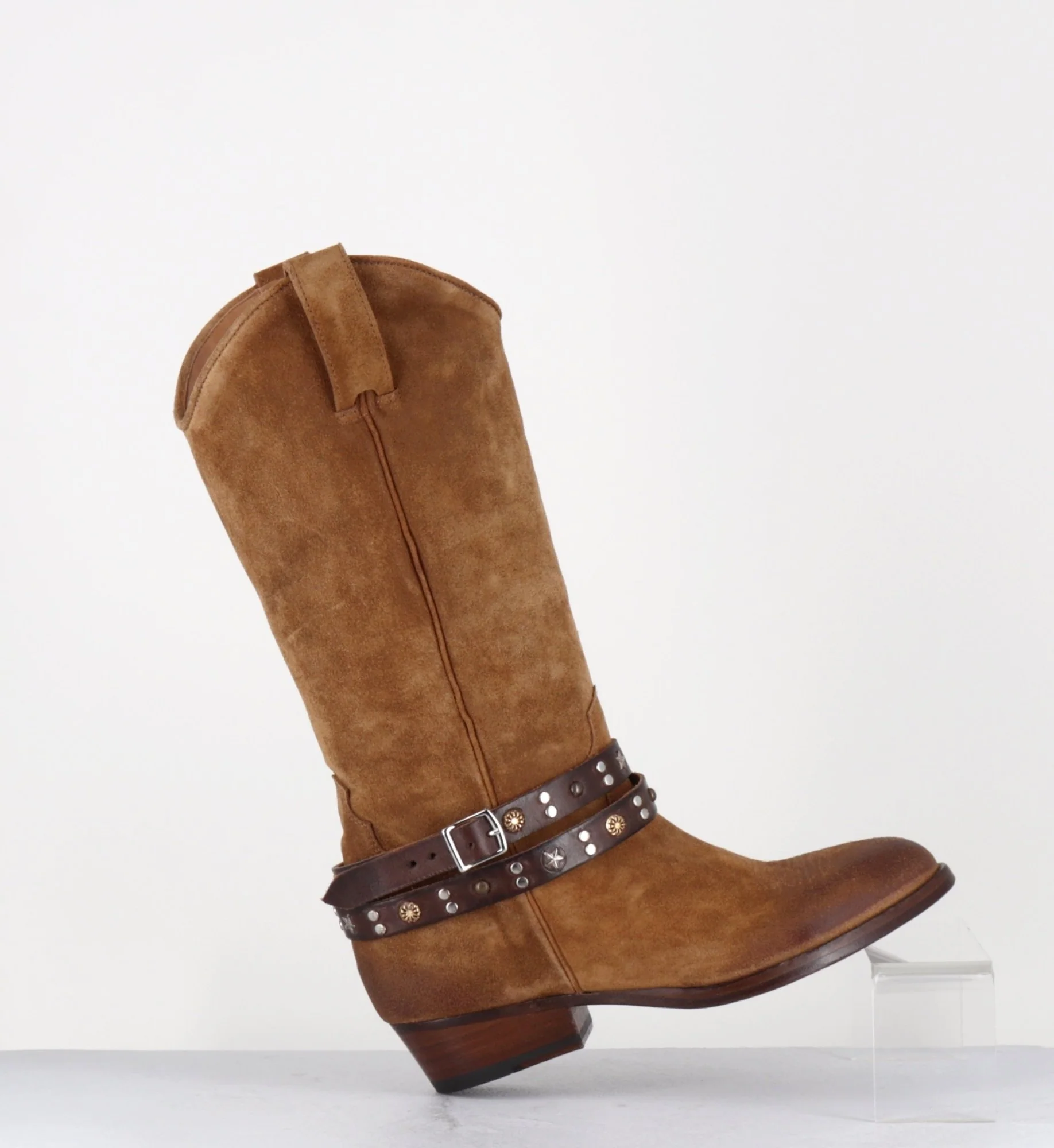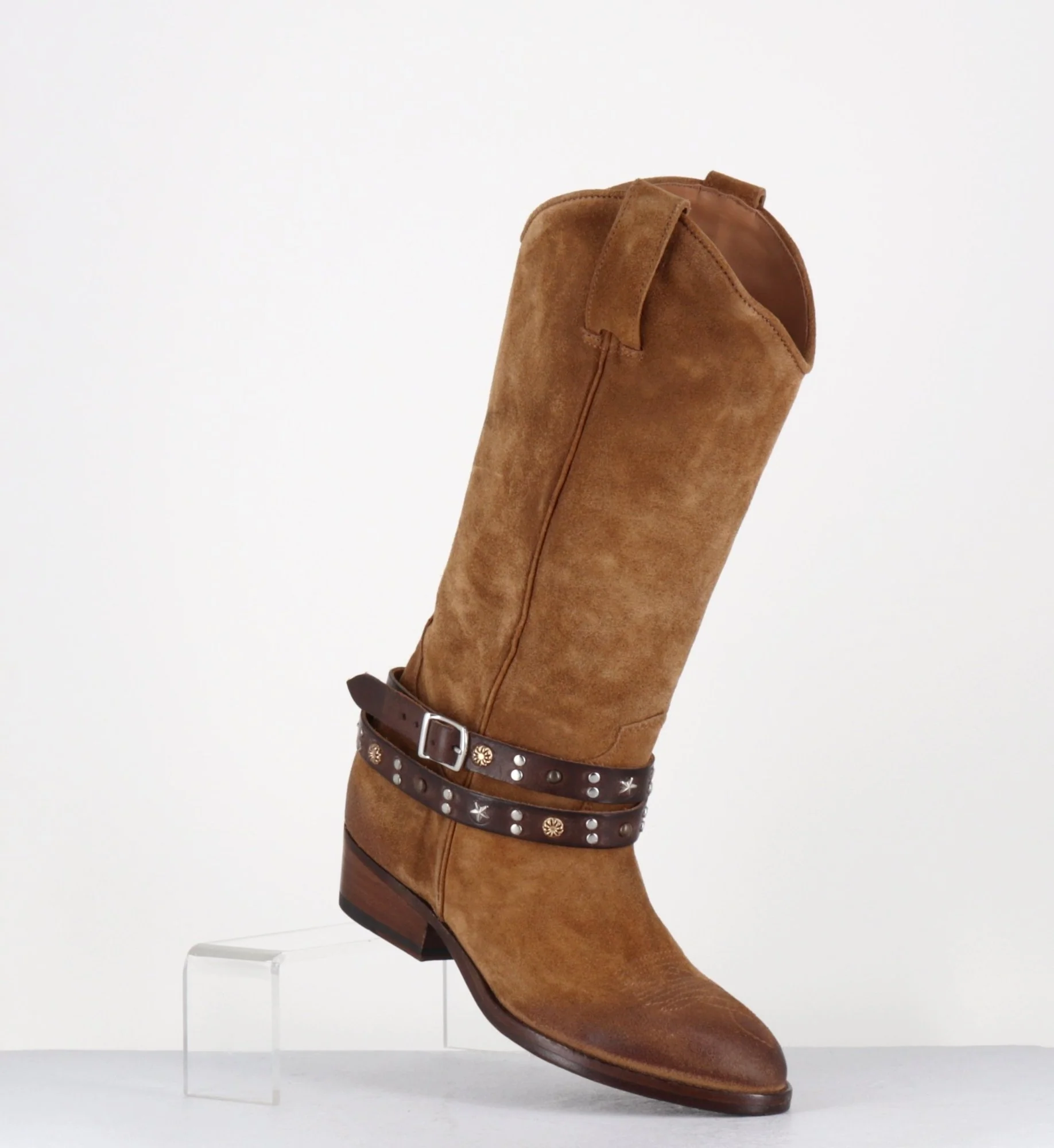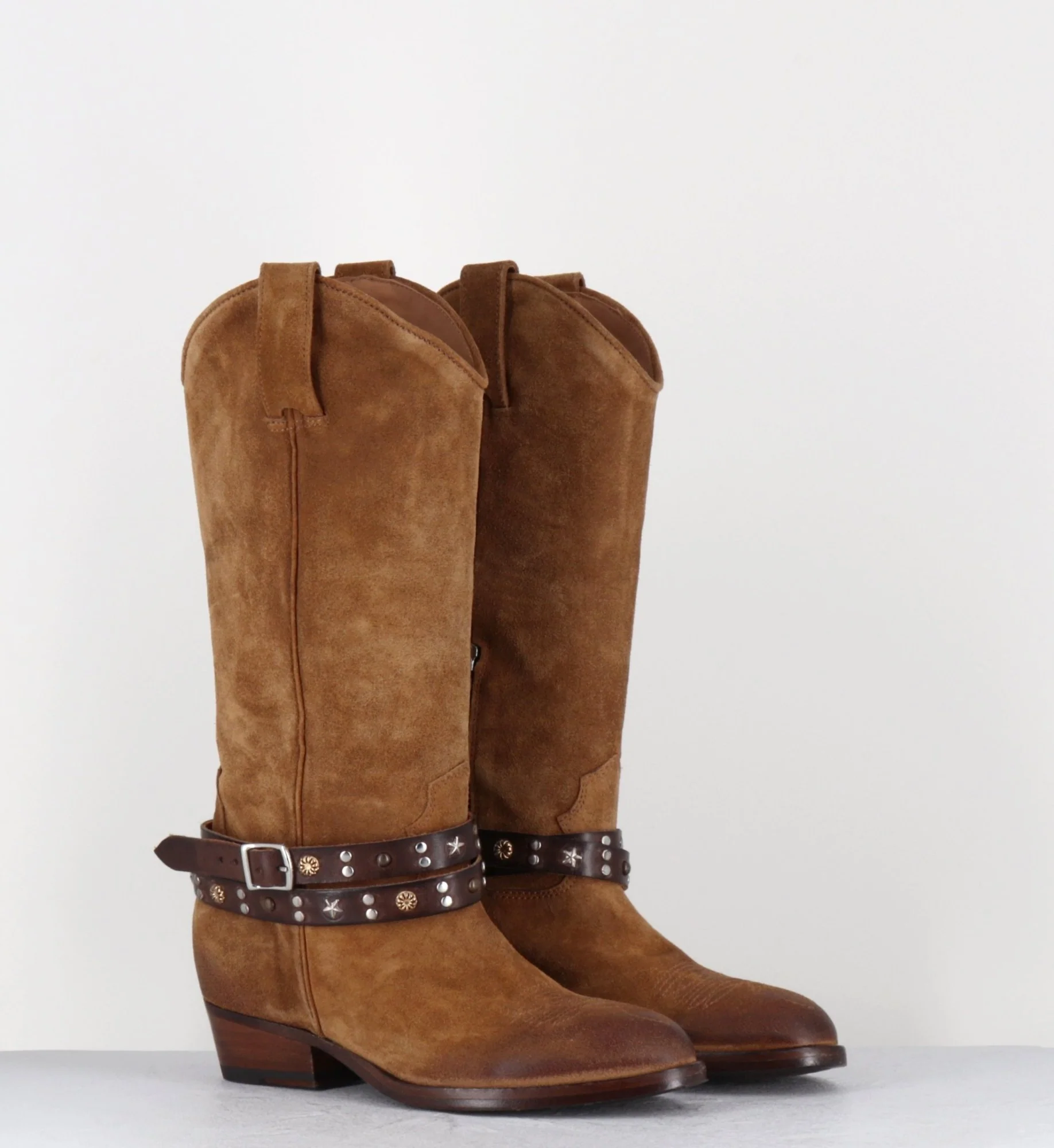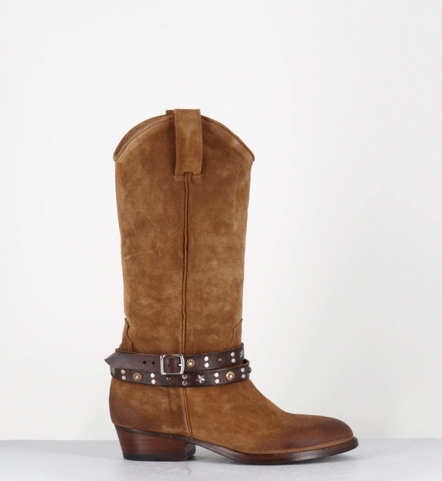Bottes esprit carmaguaise en daim camel, bout effilé en amande avec surpiqure à l’avant, bracelet en cuir décorations texanes amovible, zip intérieur, montées sur un petit talon légèrement biseauté.