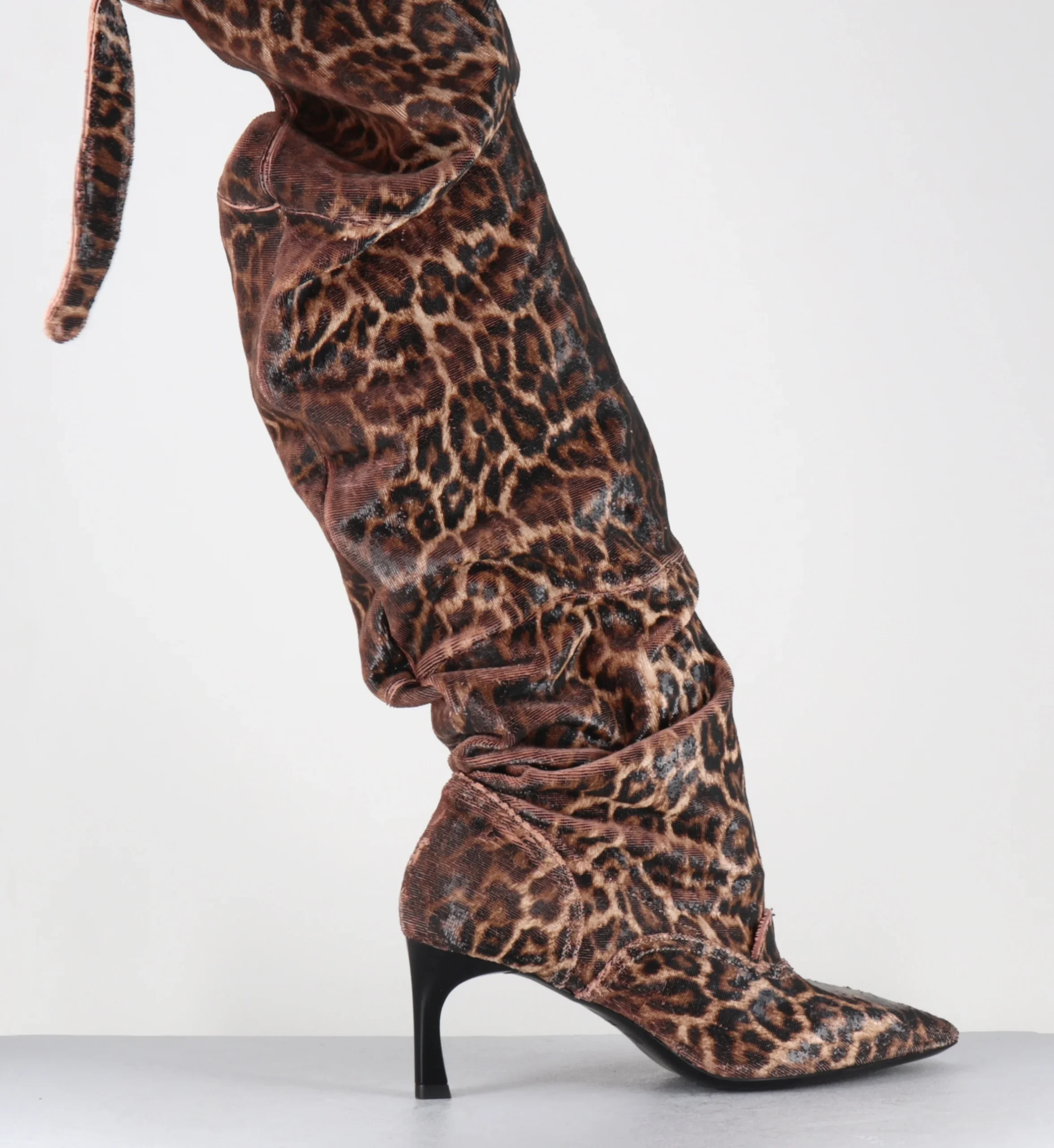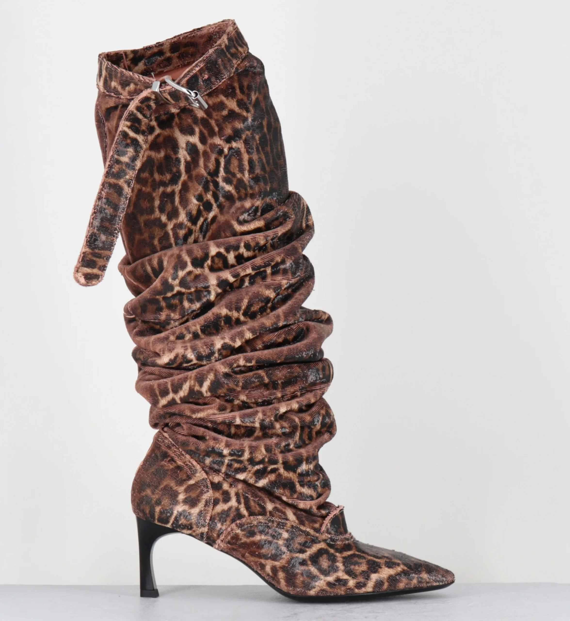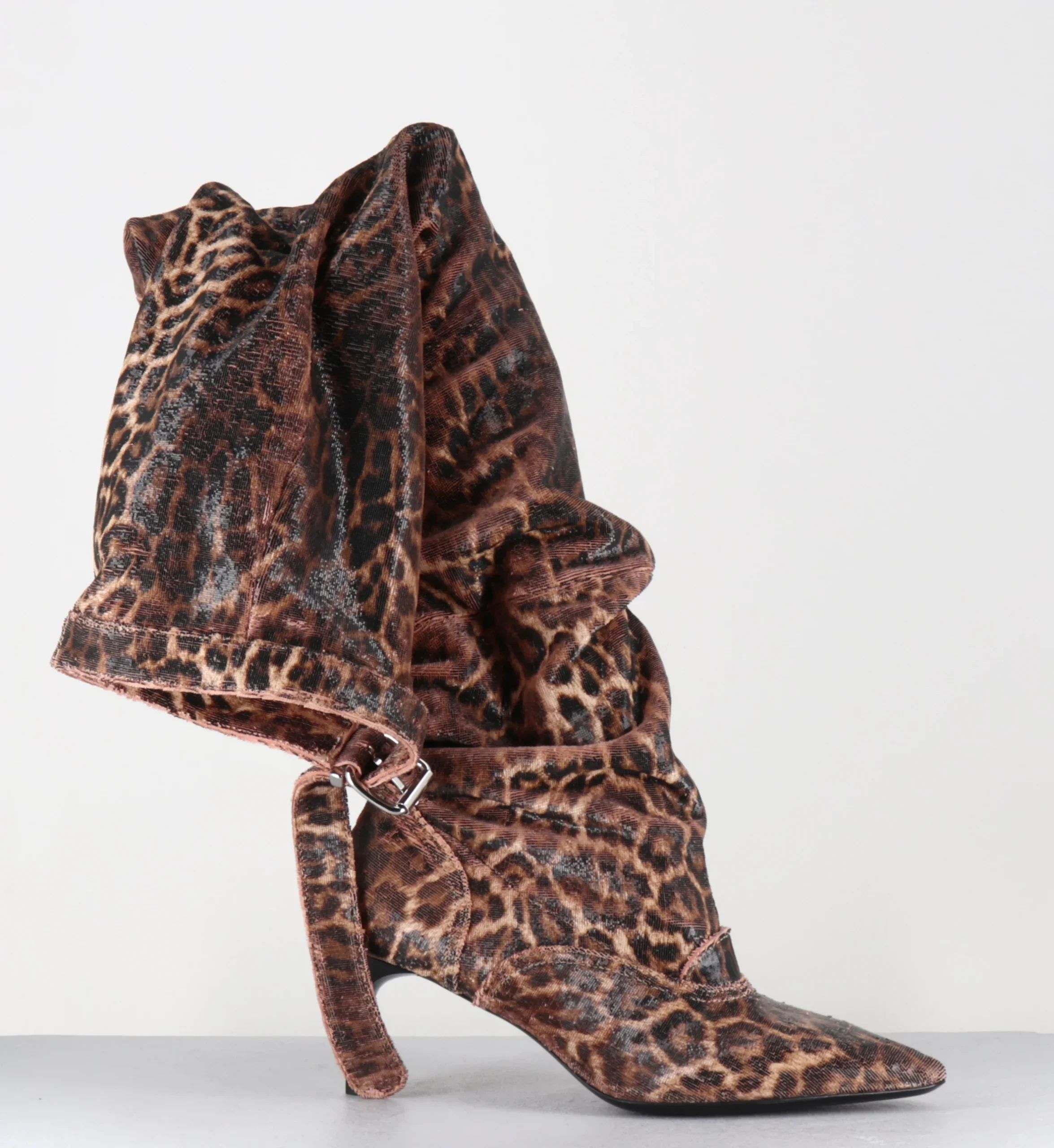 Bottes en cuir travaillé au laser pour créer un effet poudreux, presque velouté. Soft et flexibles, elles peuvent être portées de différentes manières : au genou, ou baissées jusqu’à la cheville. Imprimé léopard couleur marron, bout pointu et petit talon fin stylisé