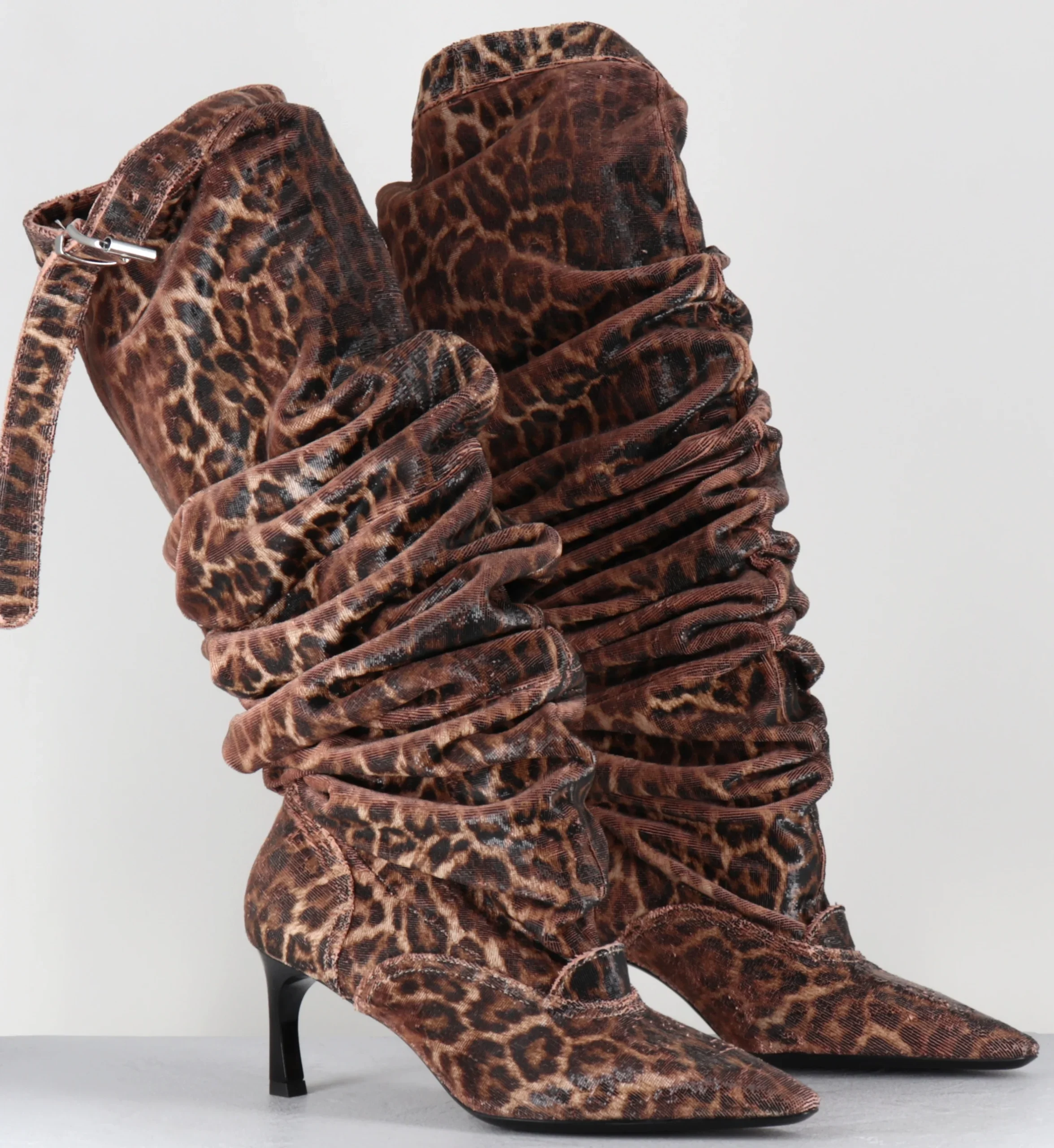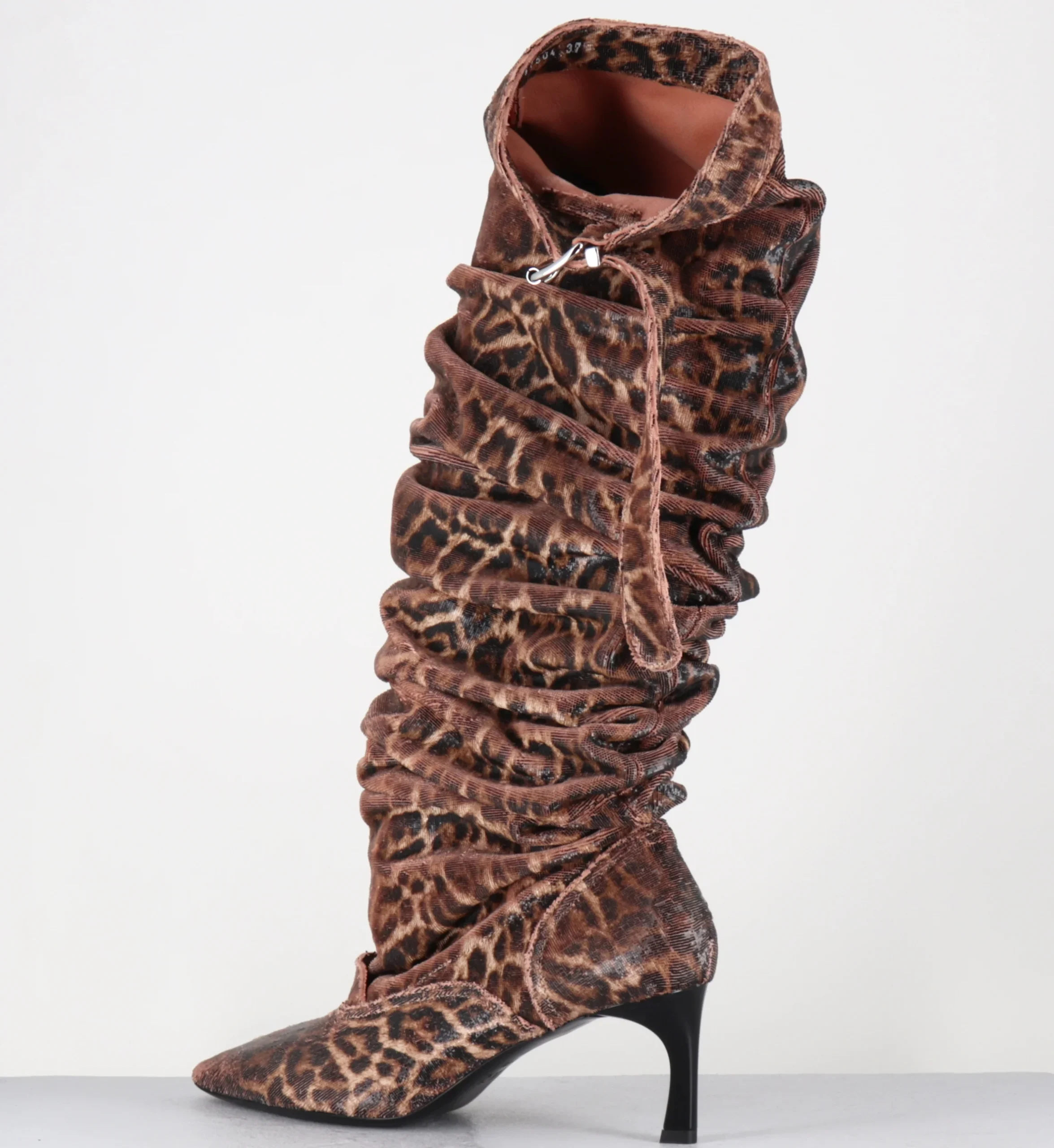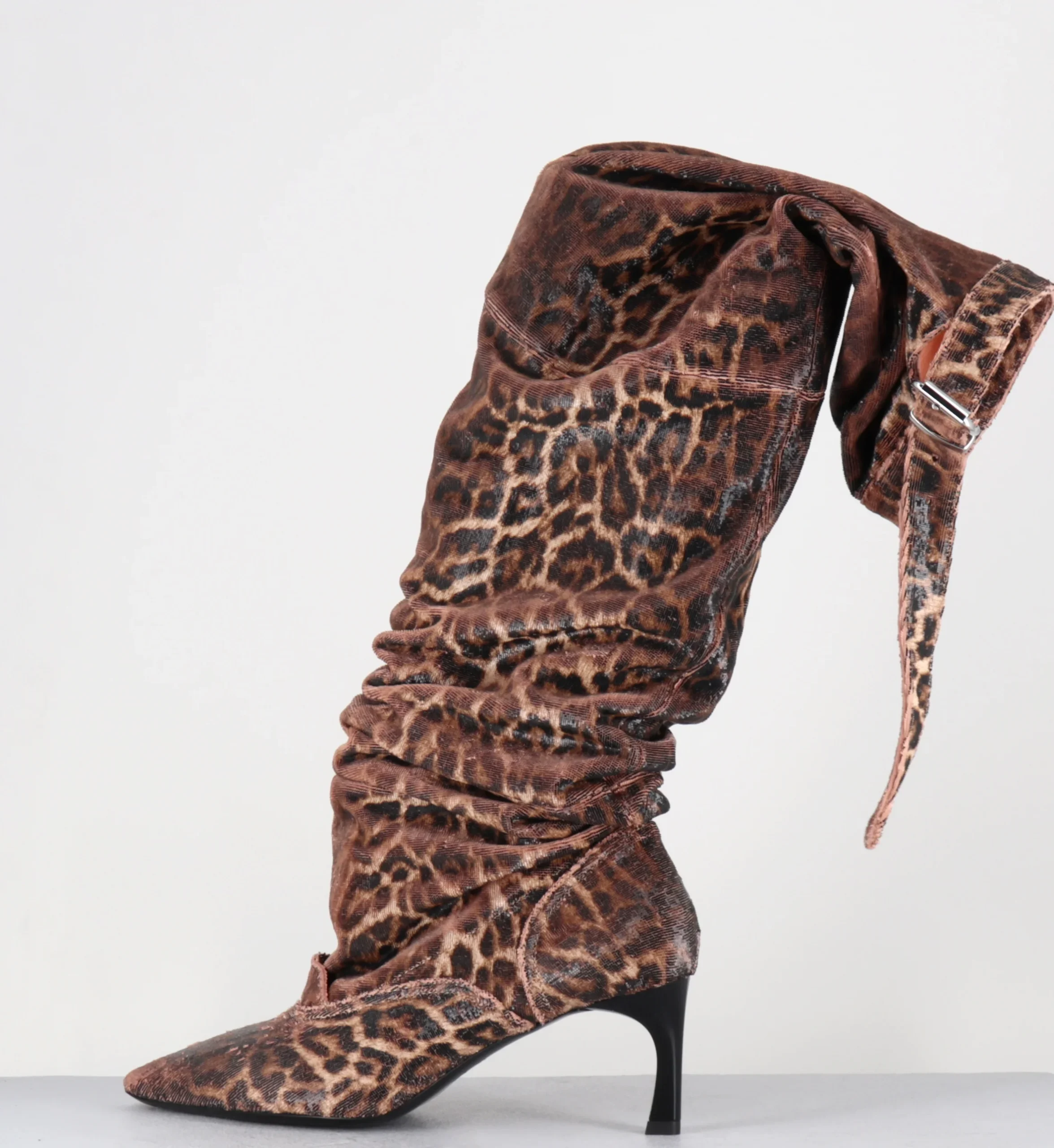 Bottes en cuir travaillé au laser pour créer un effet poudreux, presque velouté. Soft et flexibles, elles peuvent être portées de différentes manières : au genou, ou baissées jusqu’à la cheville. Imprimé léopard couleur marron, bout pointu et petit talon fin stylisé