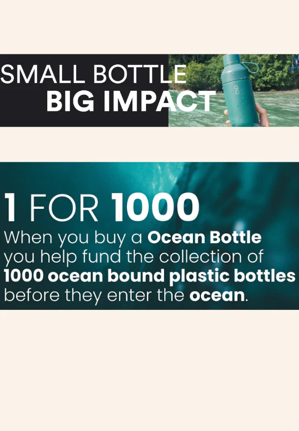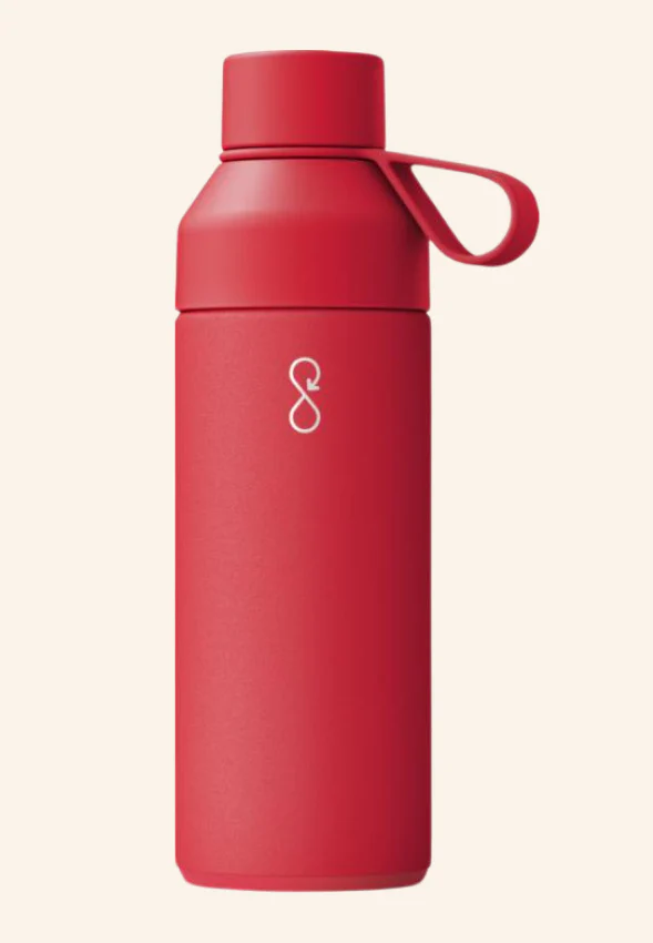 Je suis la bouteille Ocean Bottle 500 ml, conçue pour garder les boissons chaudes jusqu’à 8h et froides jusqu’à 18h grâce à mon isolation par le vide. Neutre en carbone, je soutiens activement la collecte de déchets plastiques et l’économie circulaire dans les communautés côtières.