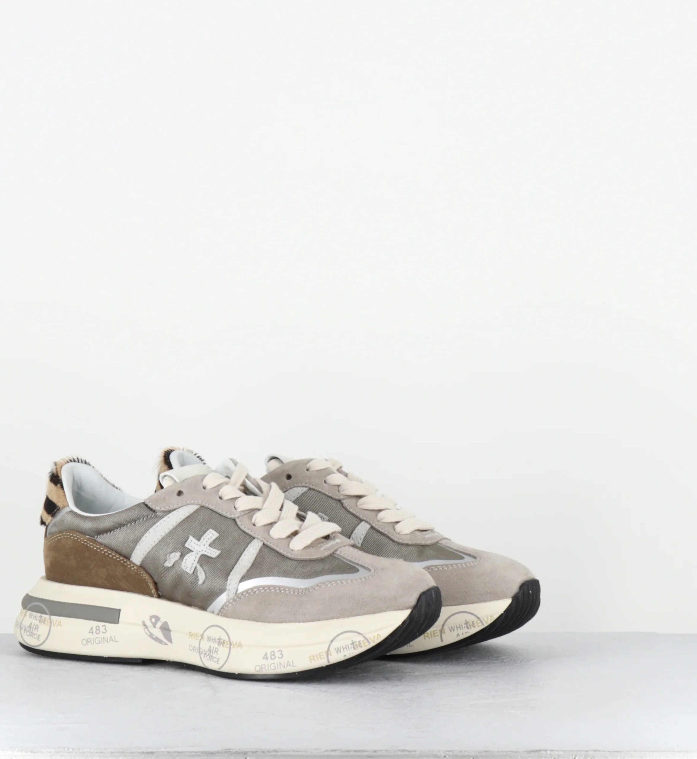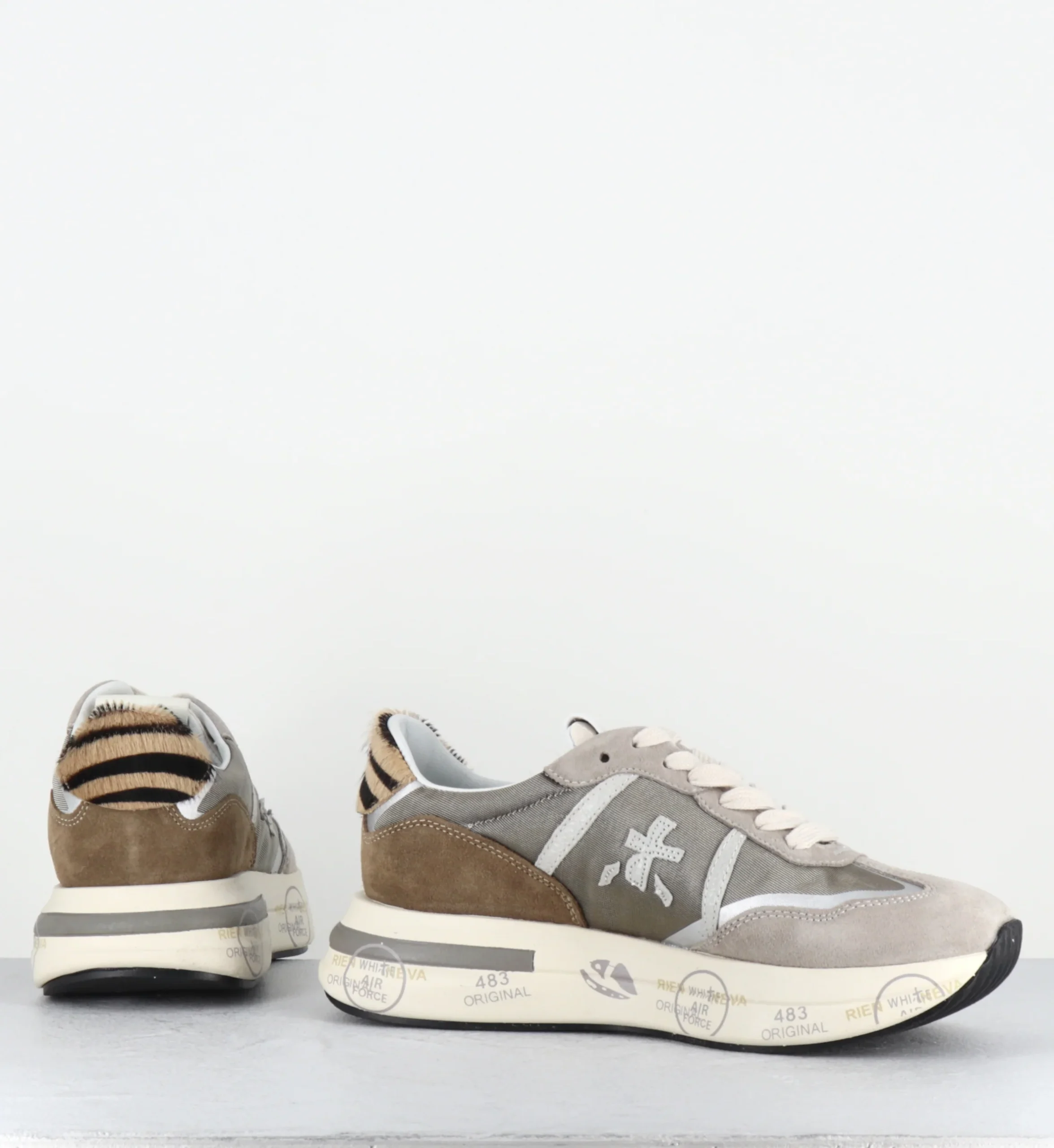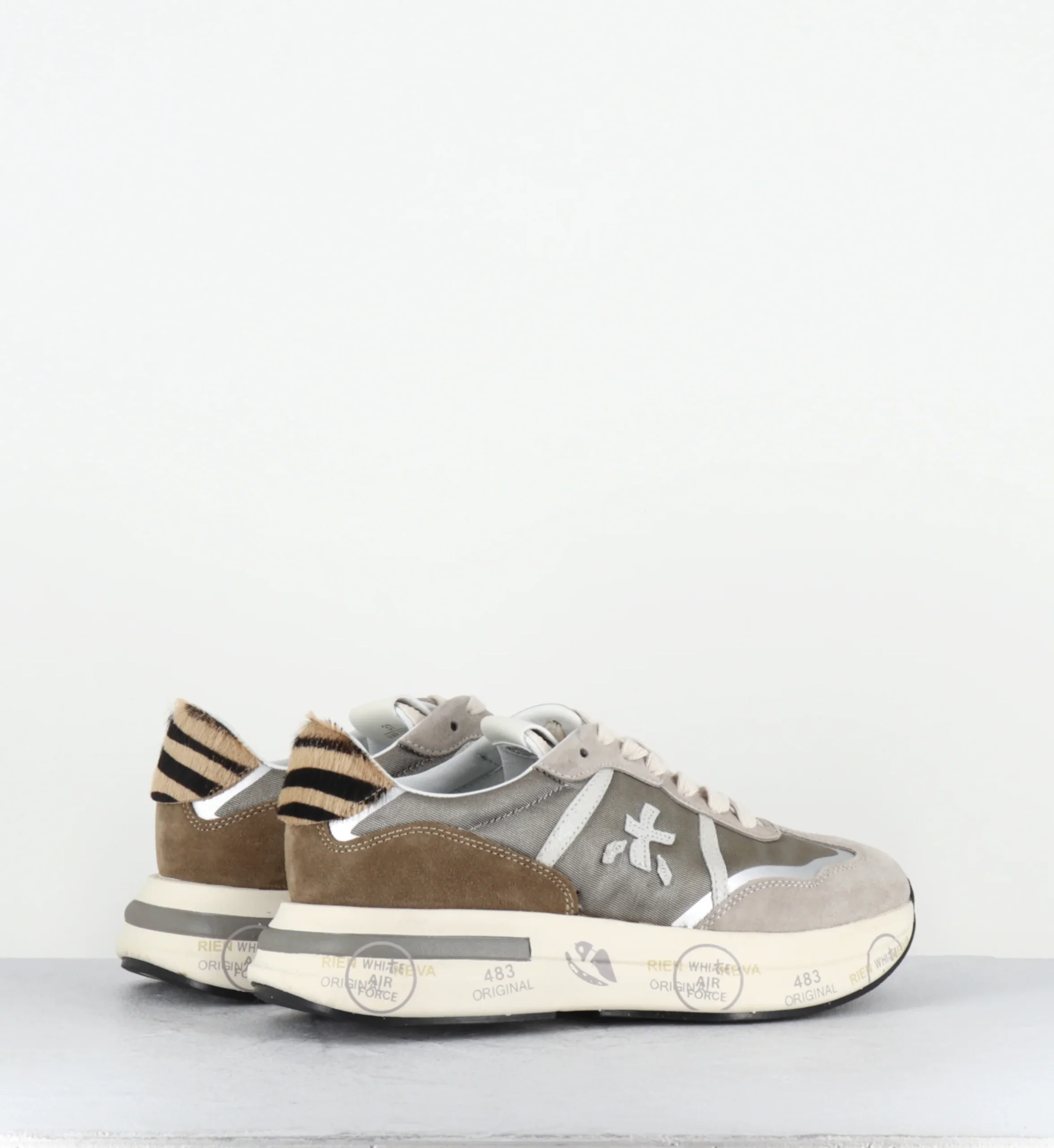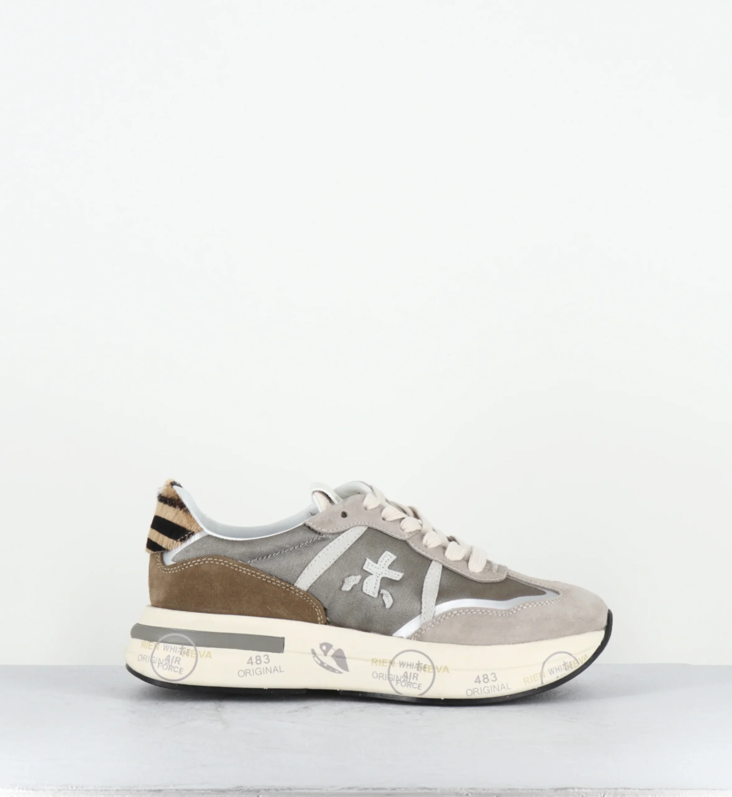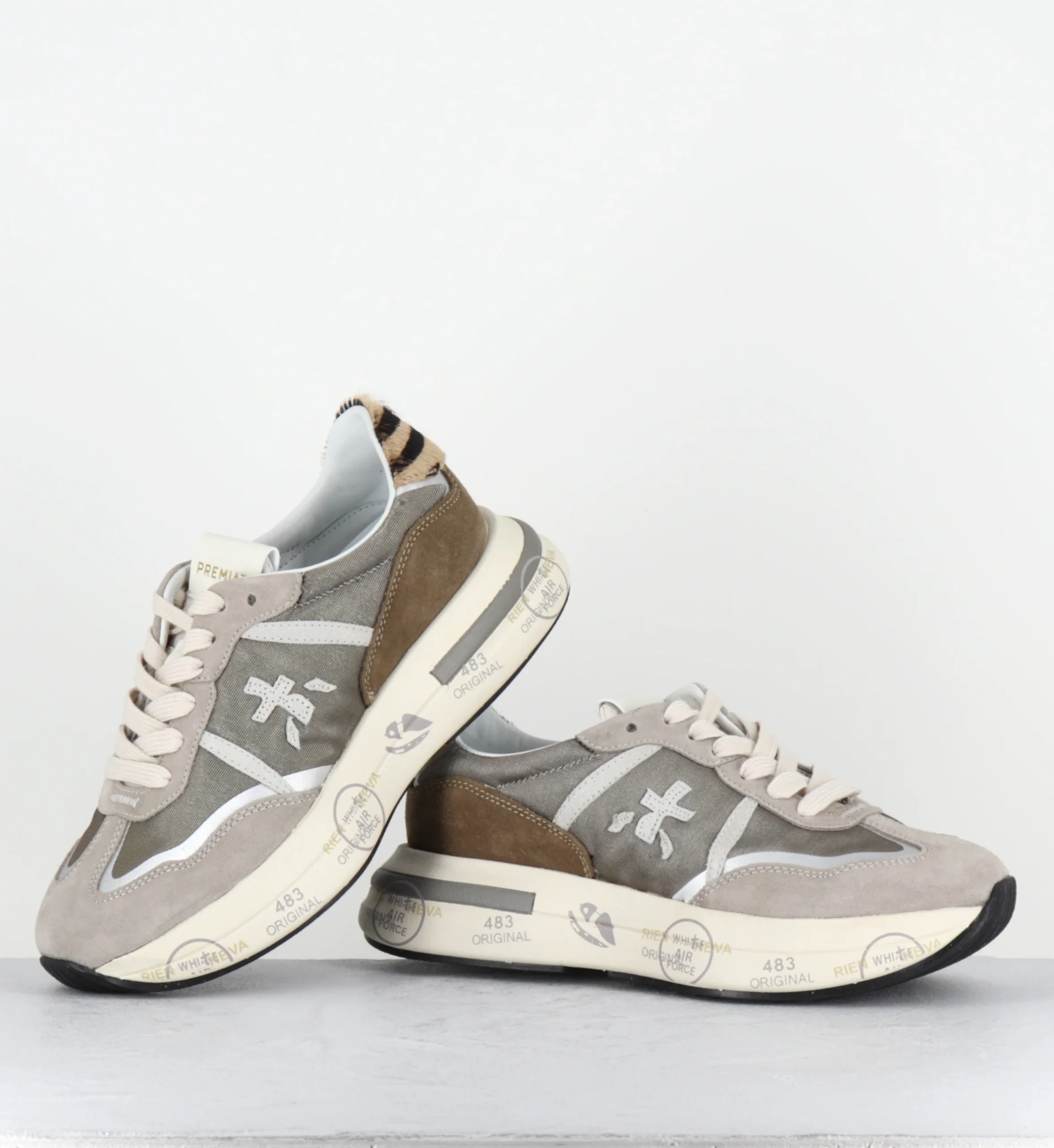 Sneakers semelle ultra light innovante chez Premiata, daim & toile nylon gris taupe, avec détails de poulain imprimé zèbre à l’arrière, montées sur une semelle épaisse blanc cassé en micro fibre, avec imprimé signature de la Maison Italienne Premiata. Chausse normalement Cambrure étudiée ultra confortable