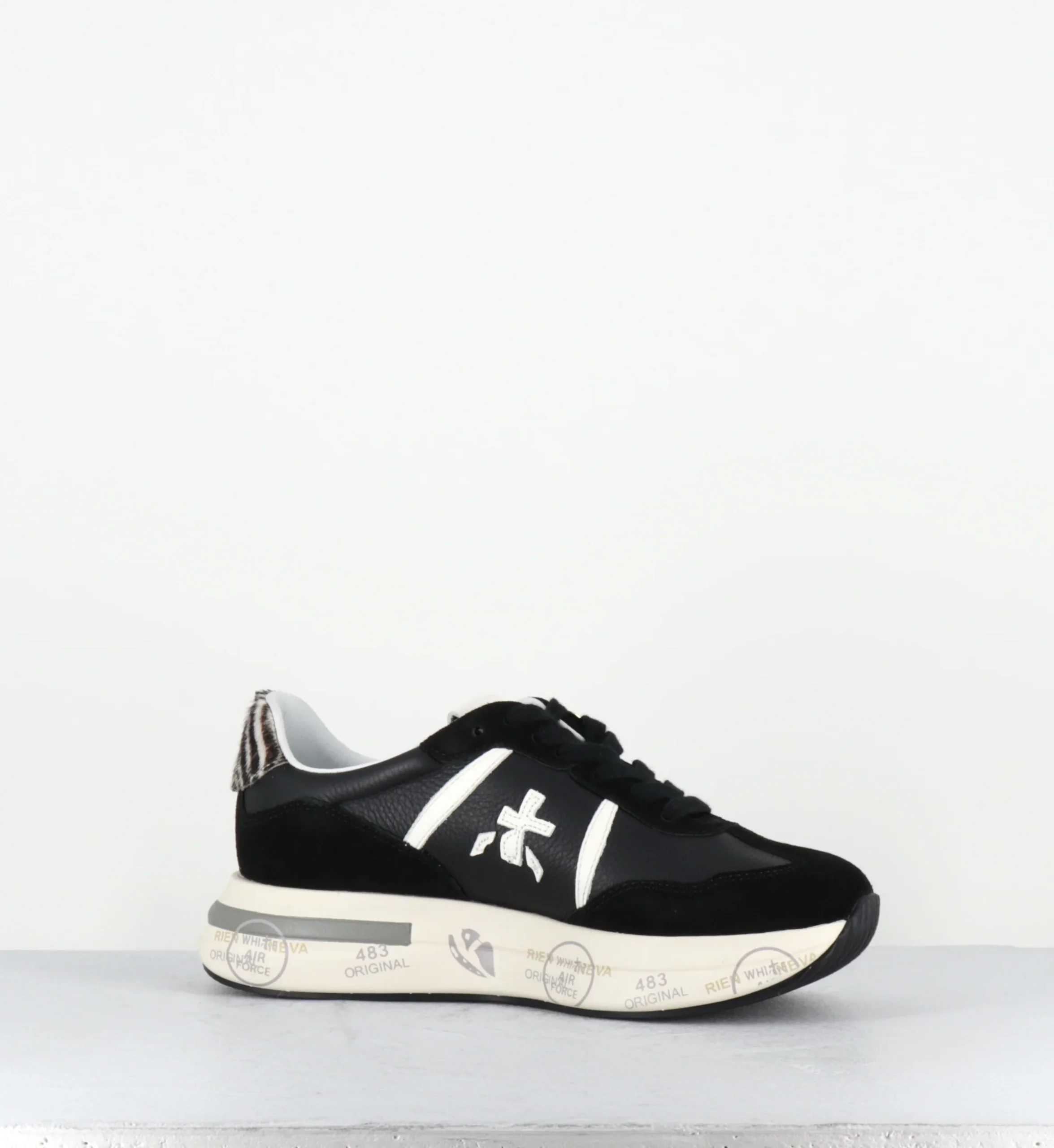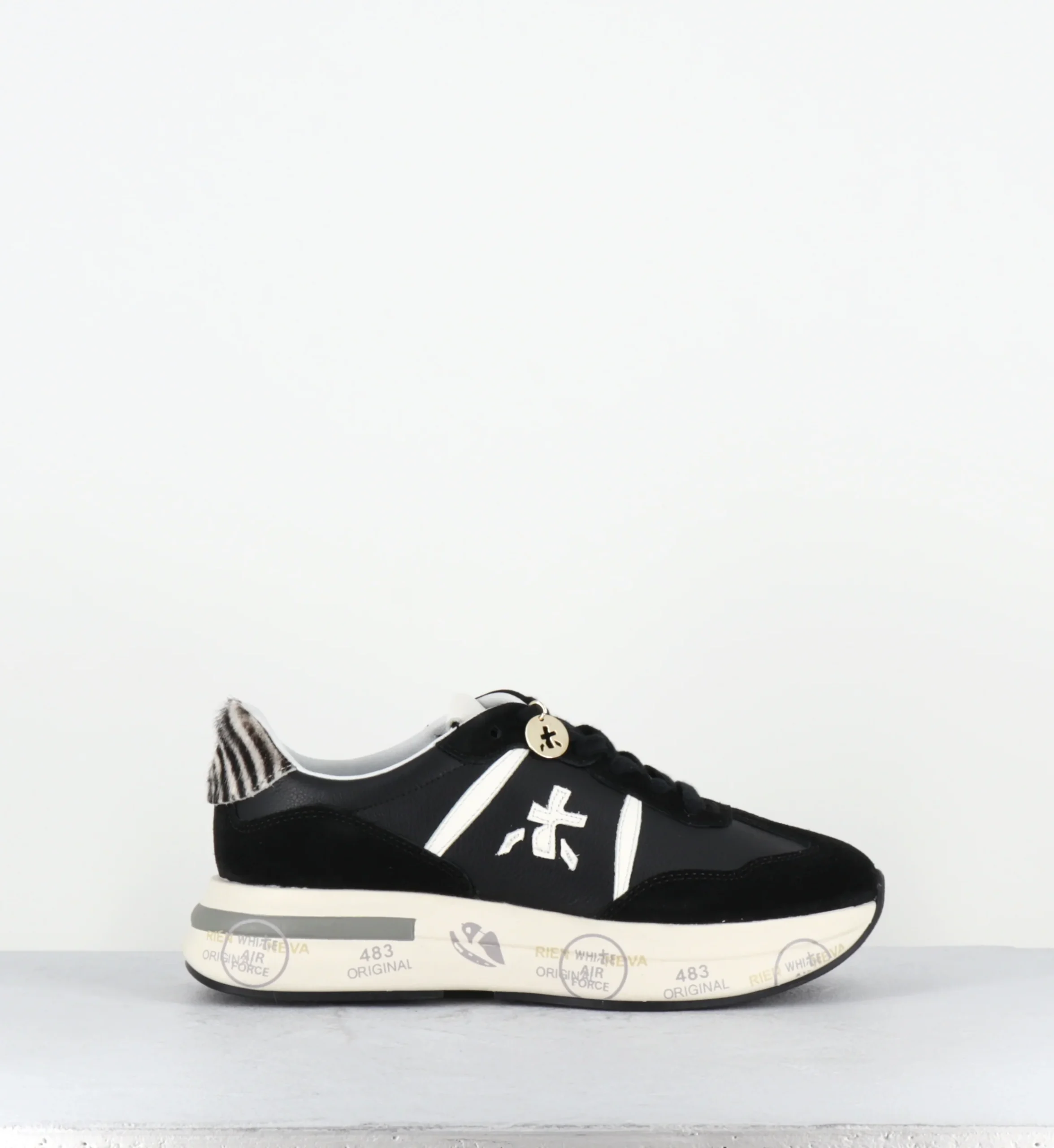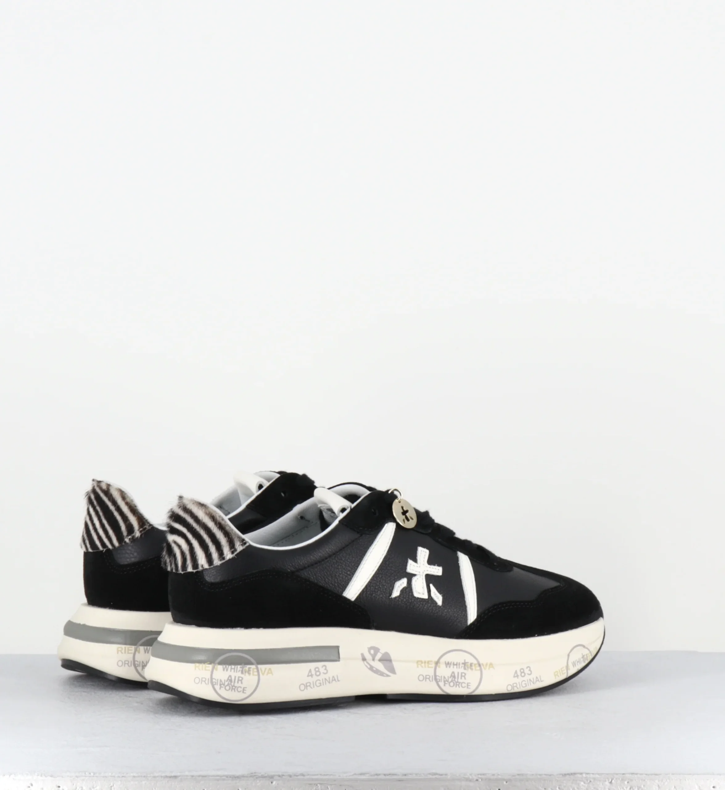 Sneakers semelle ultra light innovante chez Premiata, cuir et daim noir, avec détails de poulain imprimé zèbre à l’arrière, montées sur une semelle épaisse blanc cassé en micro fibre, avec imprimé signature de la Maison Italienne Premiata. Chausse normalement Cambrure étudiée ultra confortable