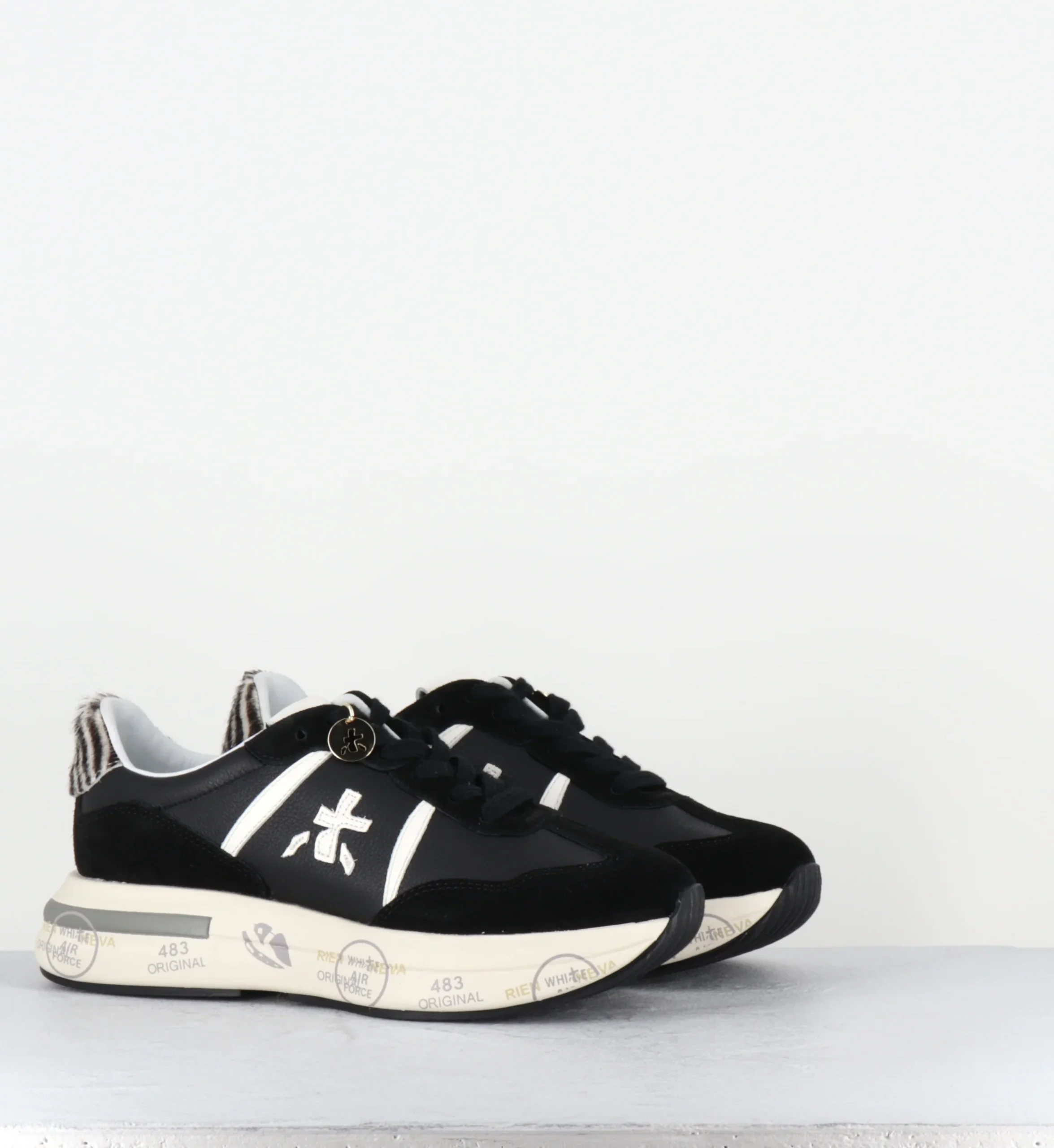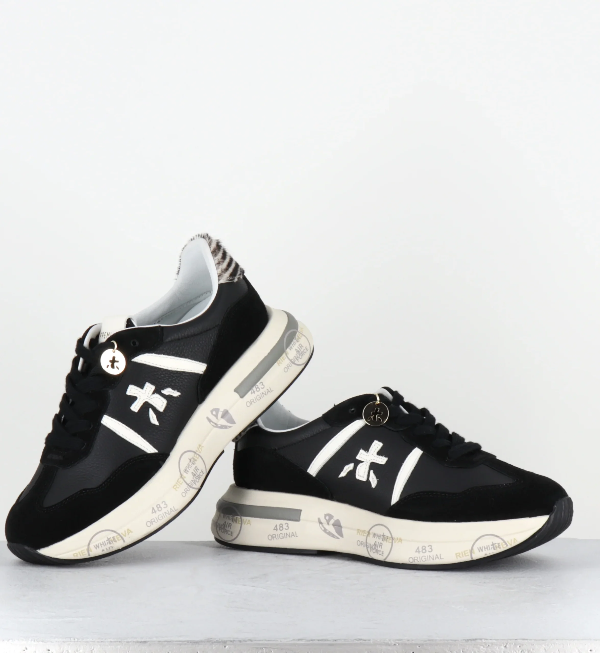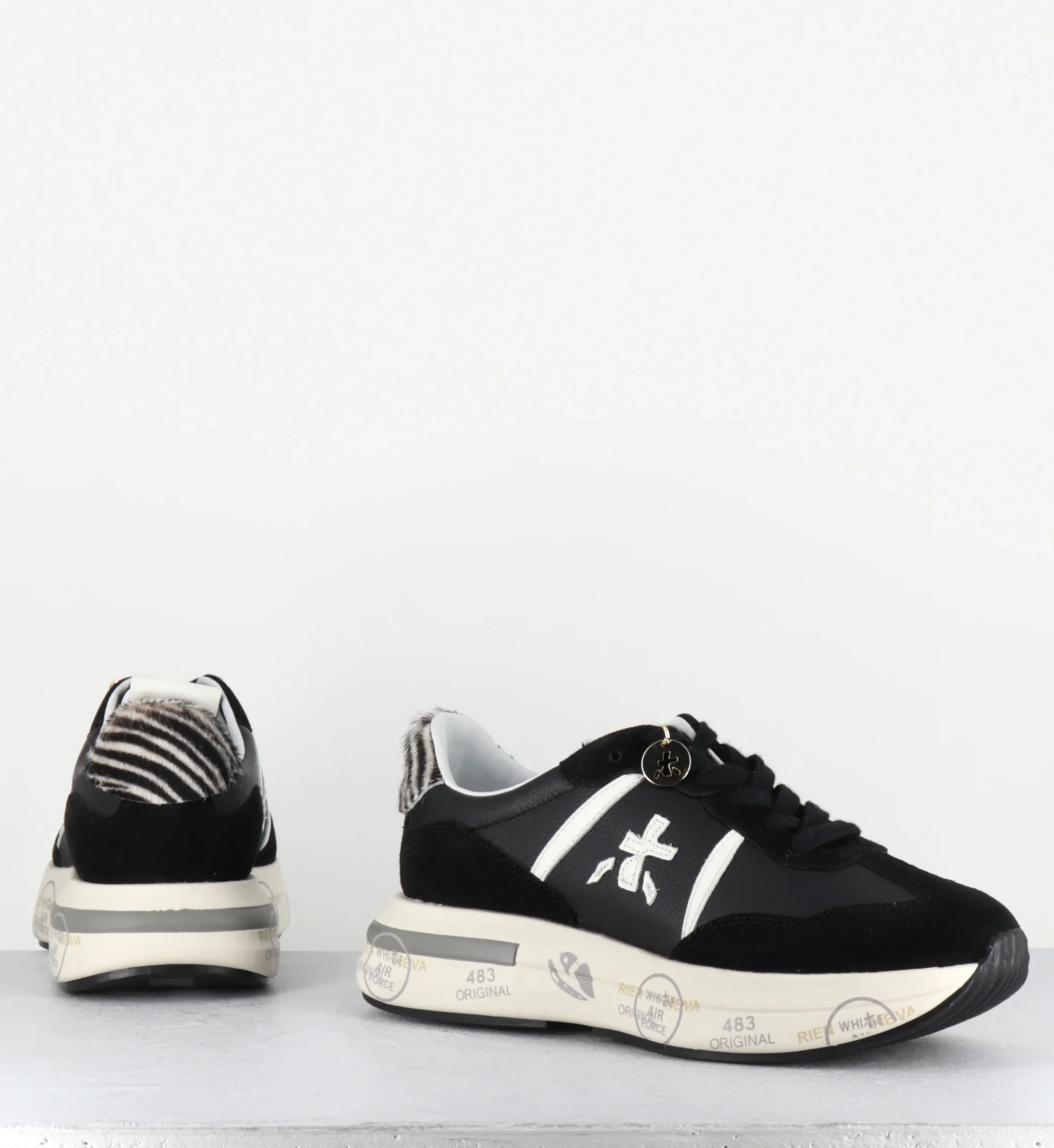 Sneakers semelle ultra light innovante chez Premiata, cuir et daim noir, avec détails de poulain imprimé zèbre à l’arrière, montées sur une semelle épaisse blanc cassé en micro fibre, avec imprimé signature de la Maison Italienne Premiata. Chausse normalement Cambrure étudiée ultra confortable